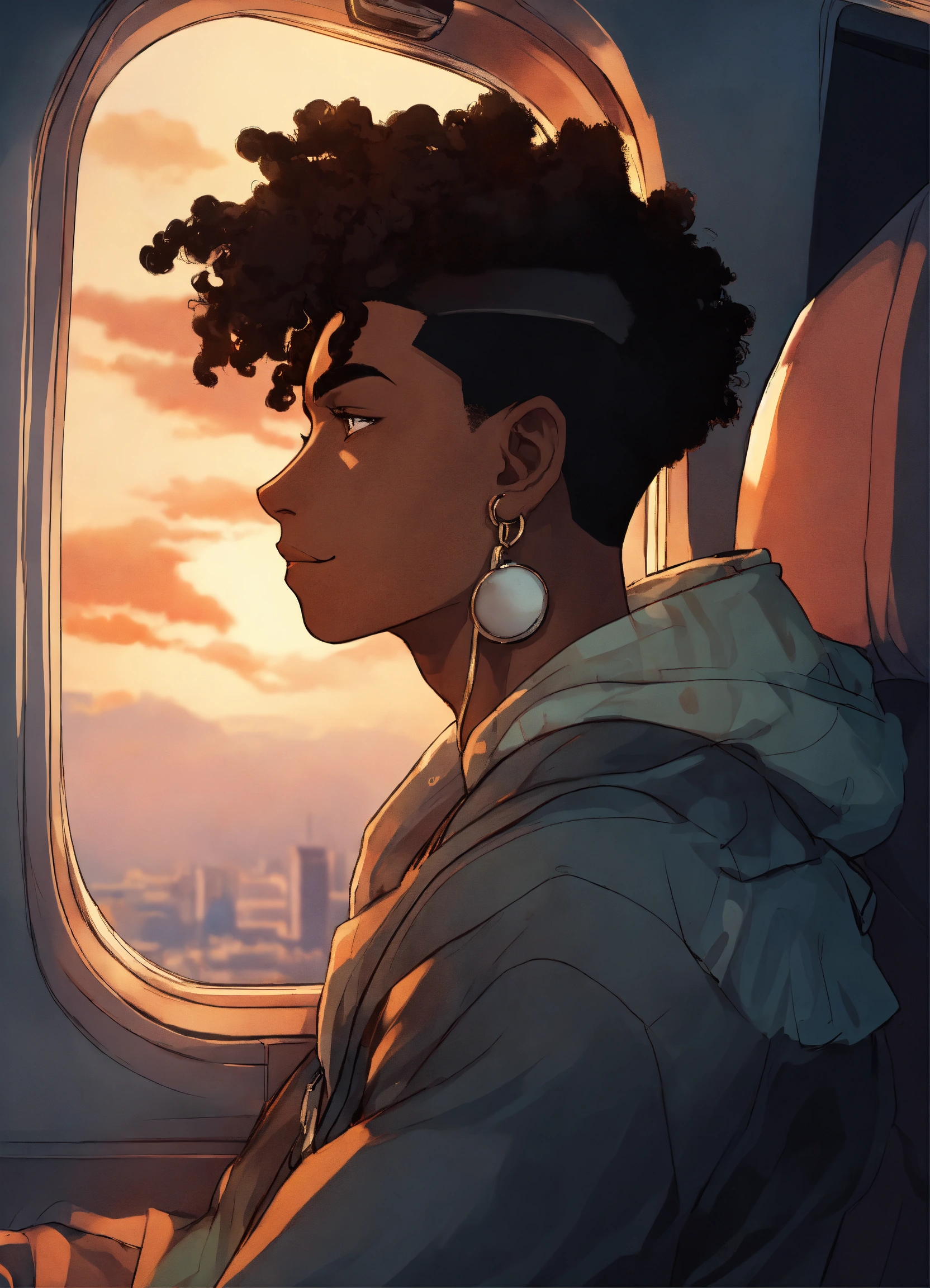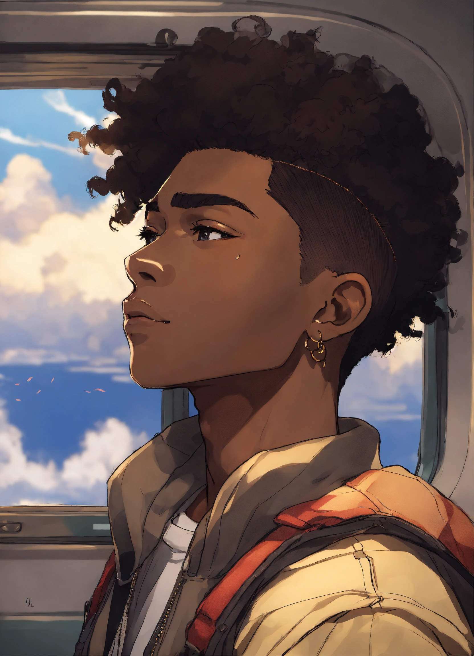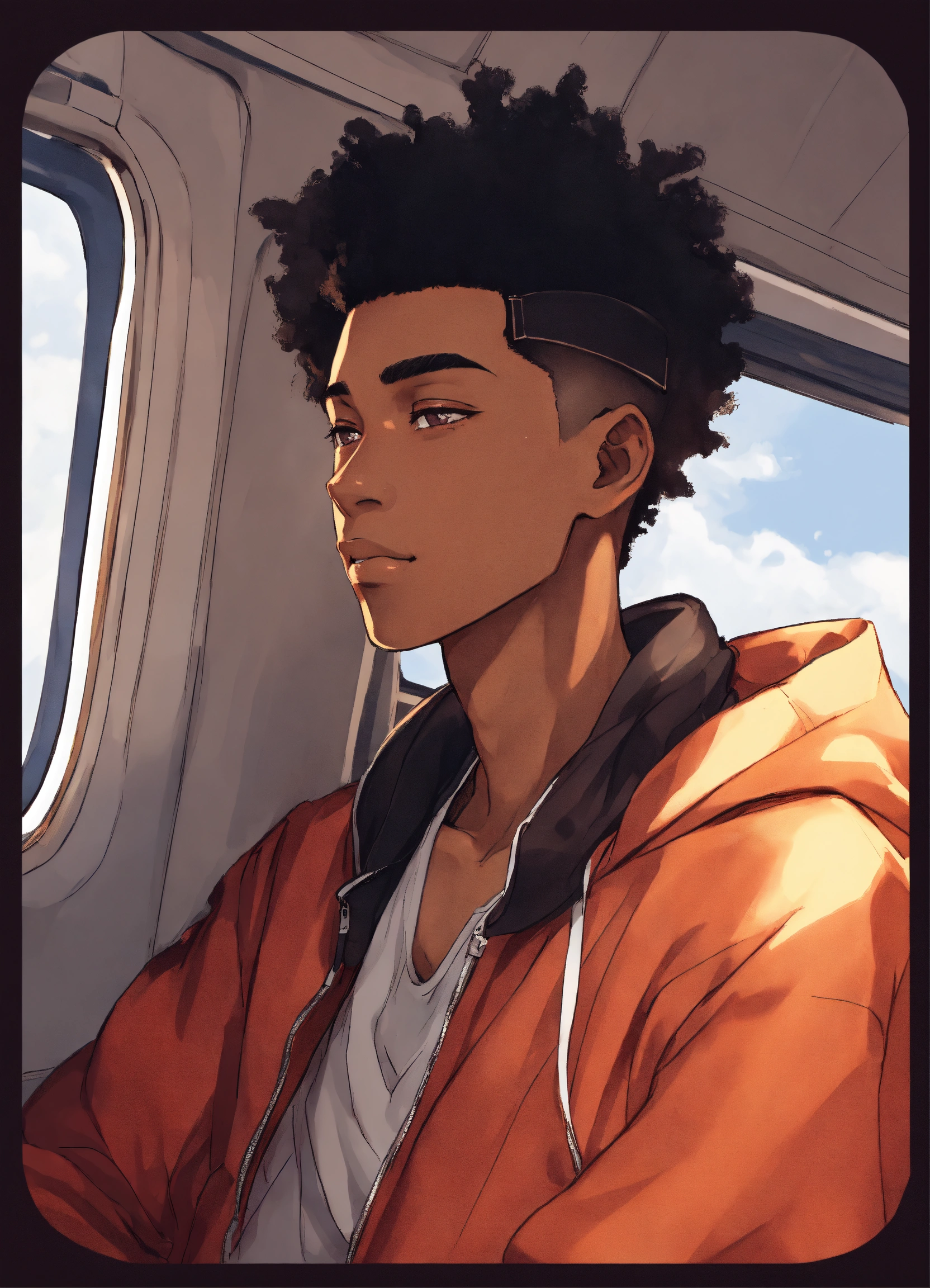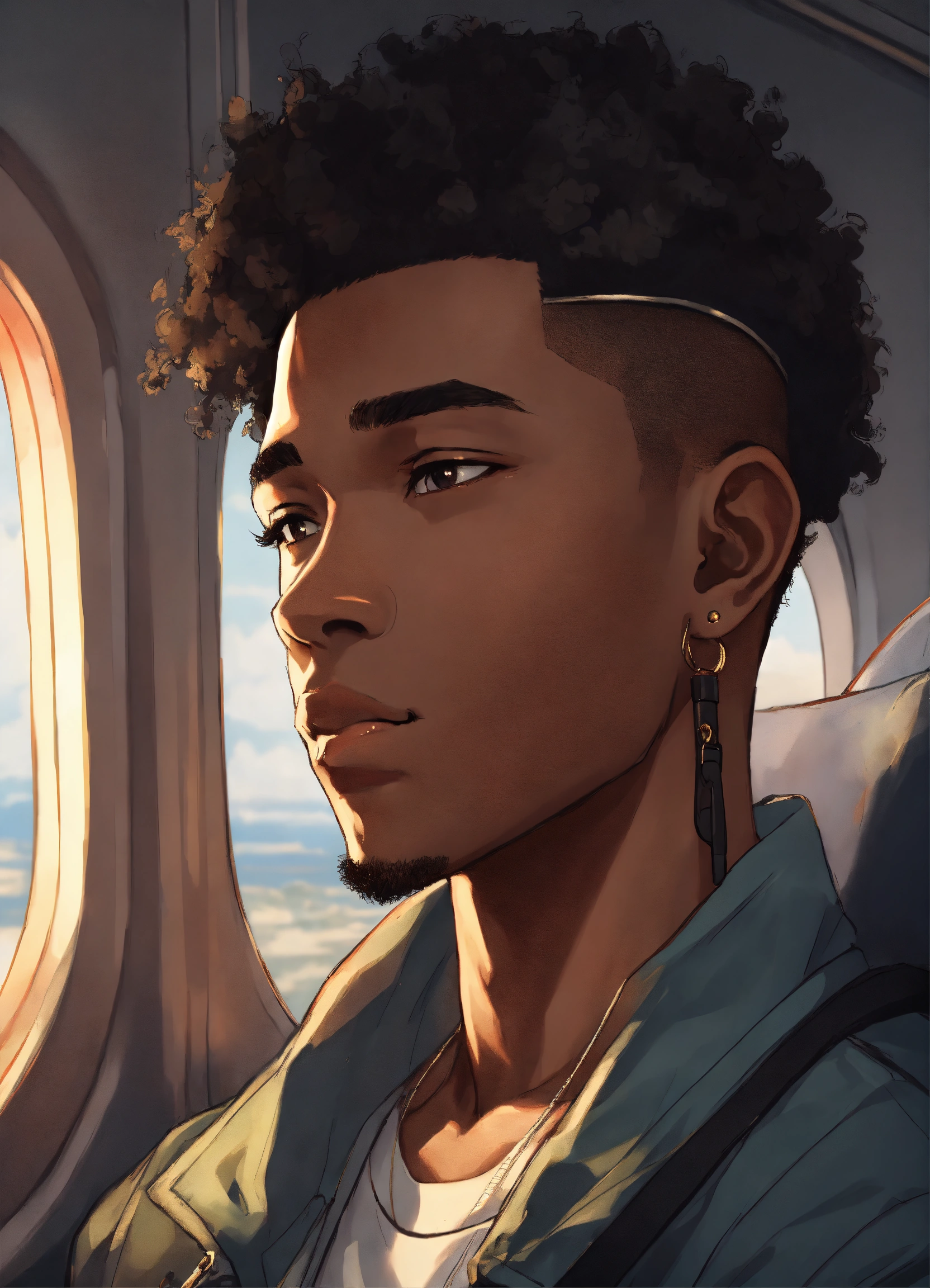 Captivating young black chinese male, mixed race, 20s, dark skin, with a sad smile, 4c kinky hair, high top fade, staring outside the window on a plane anime style