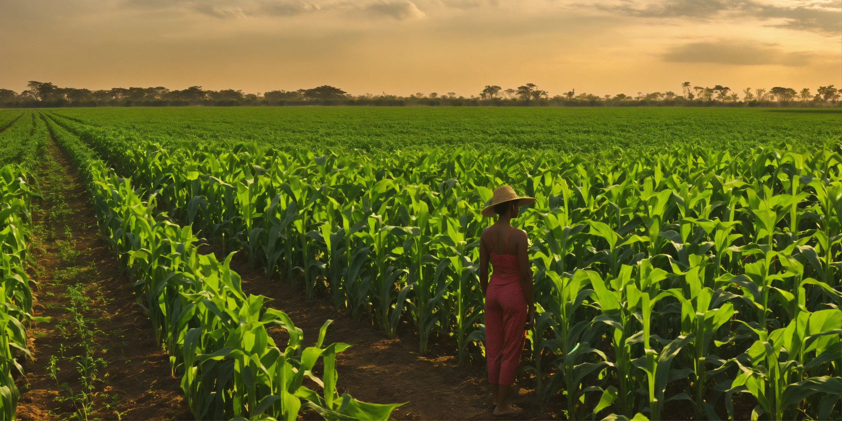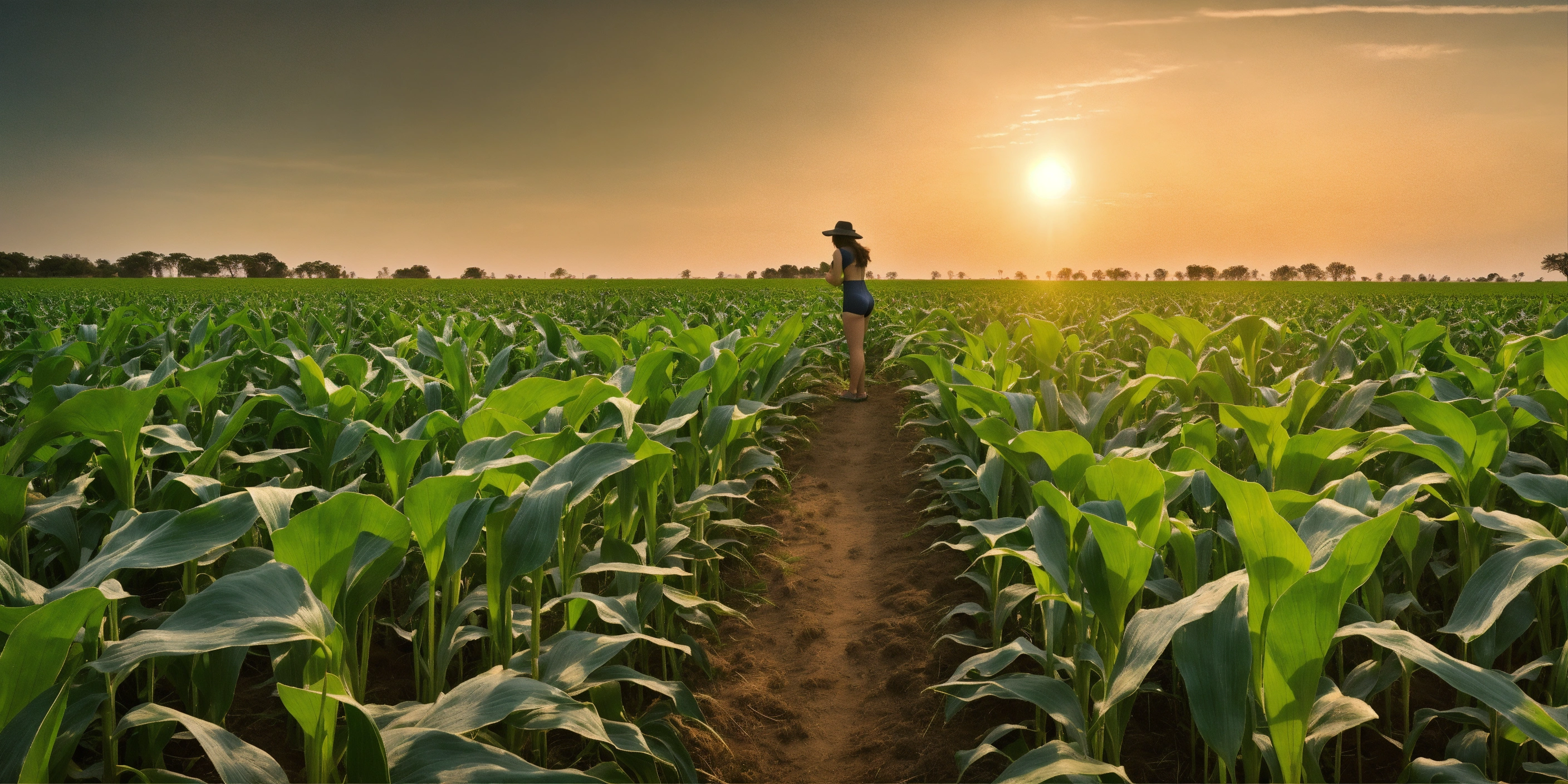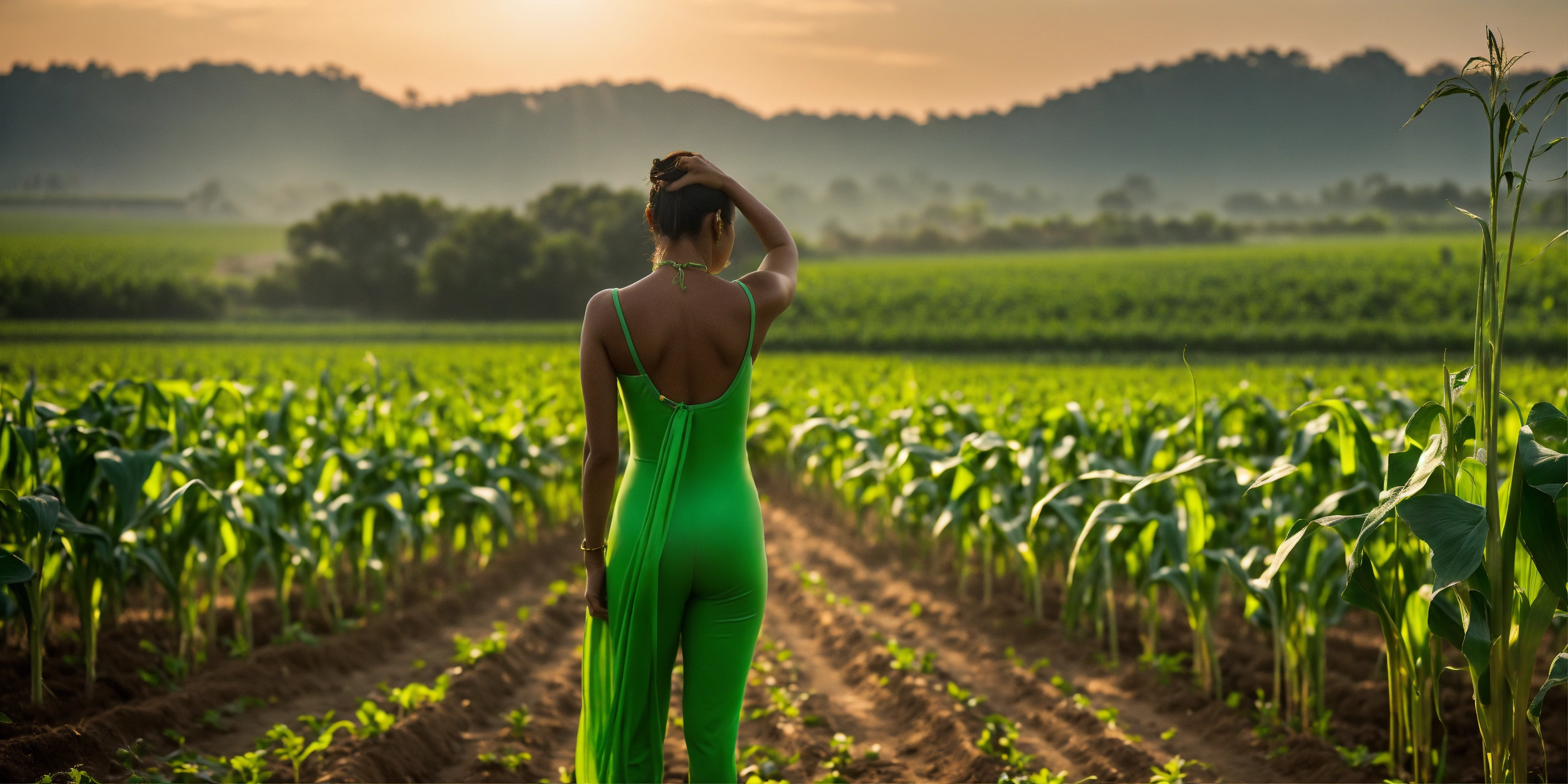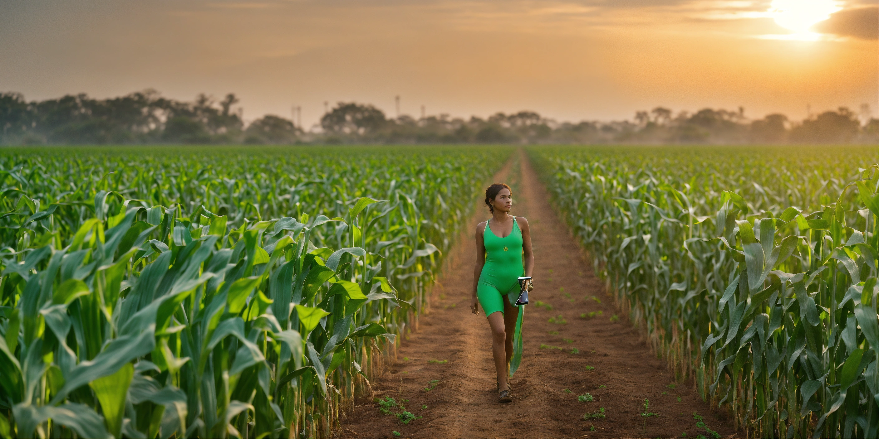 A tall woman gracefully stands in the midst of a maize field, her striking green swimsuit contrasting vividly with the surrounding environment. in her hand, she holds a tablet pc, intently inspecting and analyzing the health of the crops. the maize plants around her are sparse and stunted, indicating a zone with poor vegetation. the sun casts a soft glow, highlighting the lady’s silhouette and her focused demeanor against the backdrop of the struggling crops