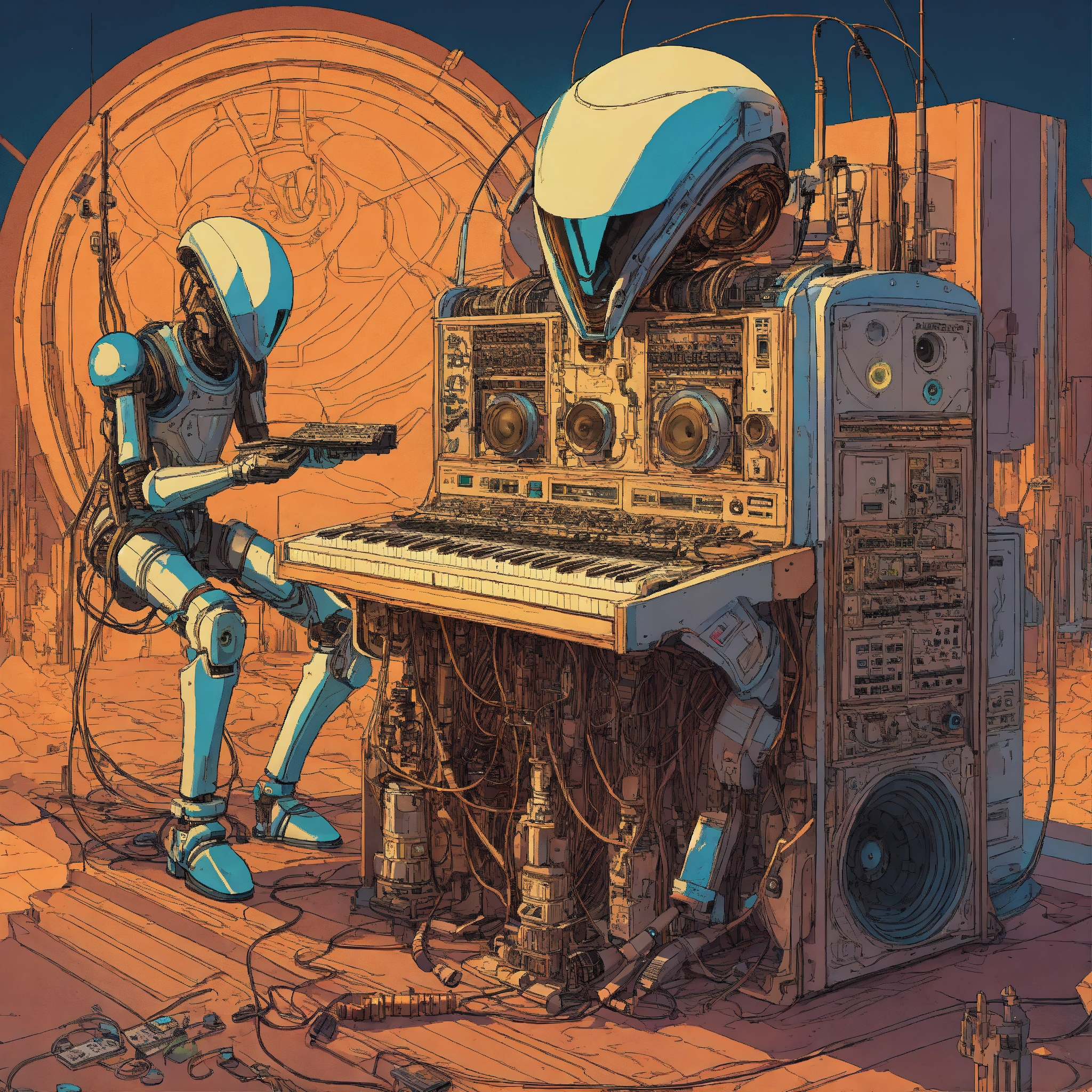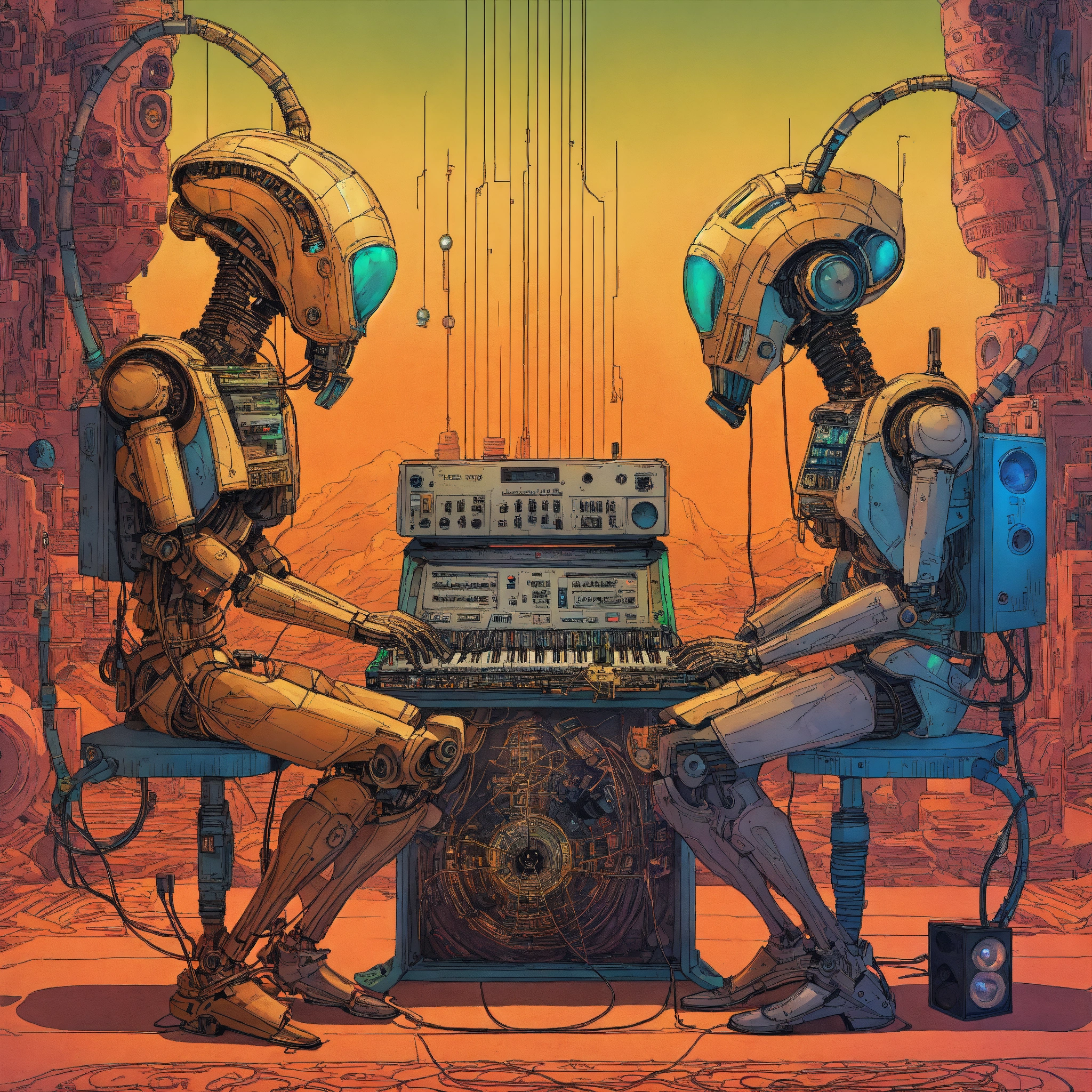 Intricate detailed artwork of two alien techno droids using ancient synthesizer playing music, in the style of moebius, wires, surrounded by huge speakers, full color ink