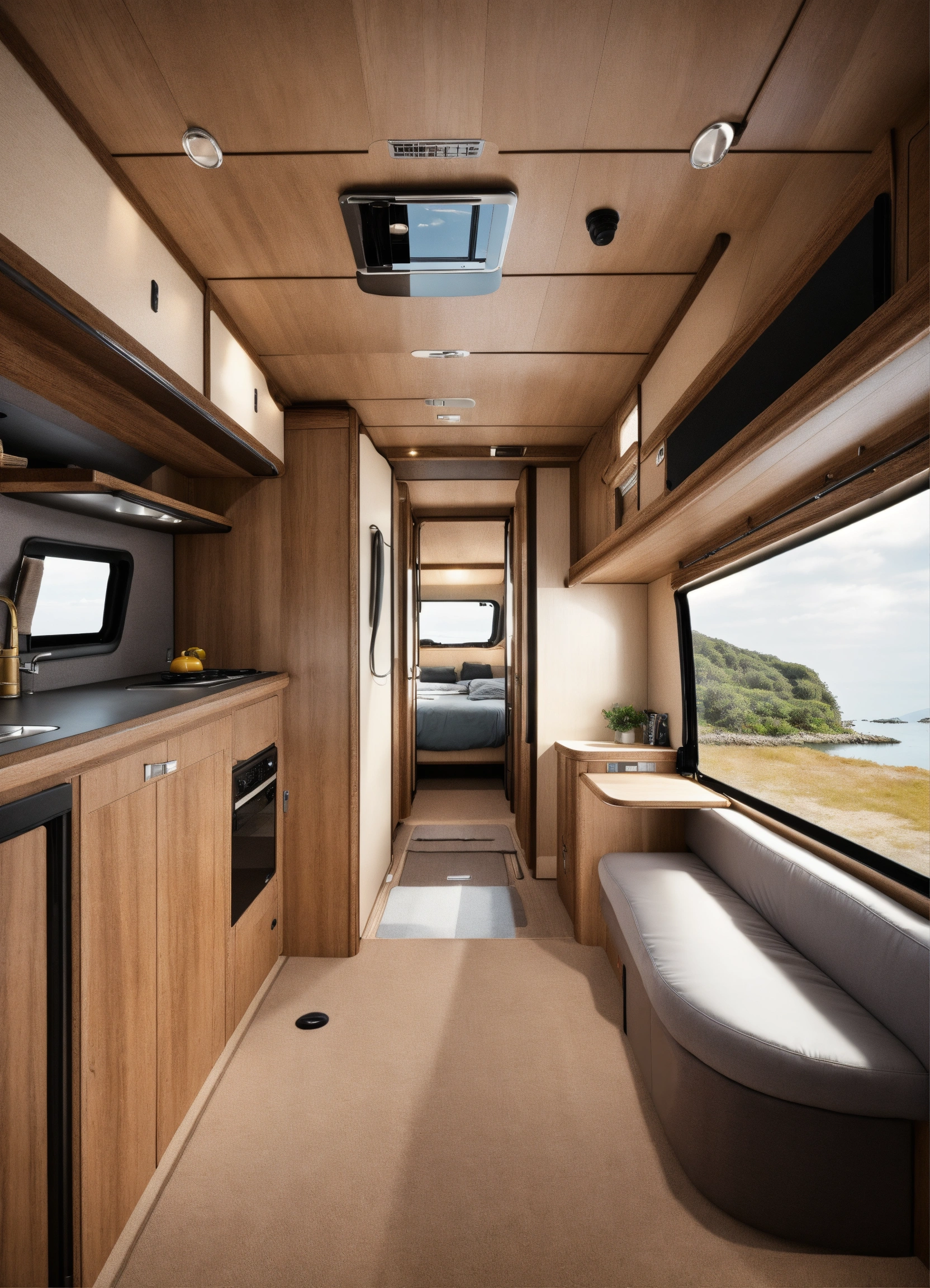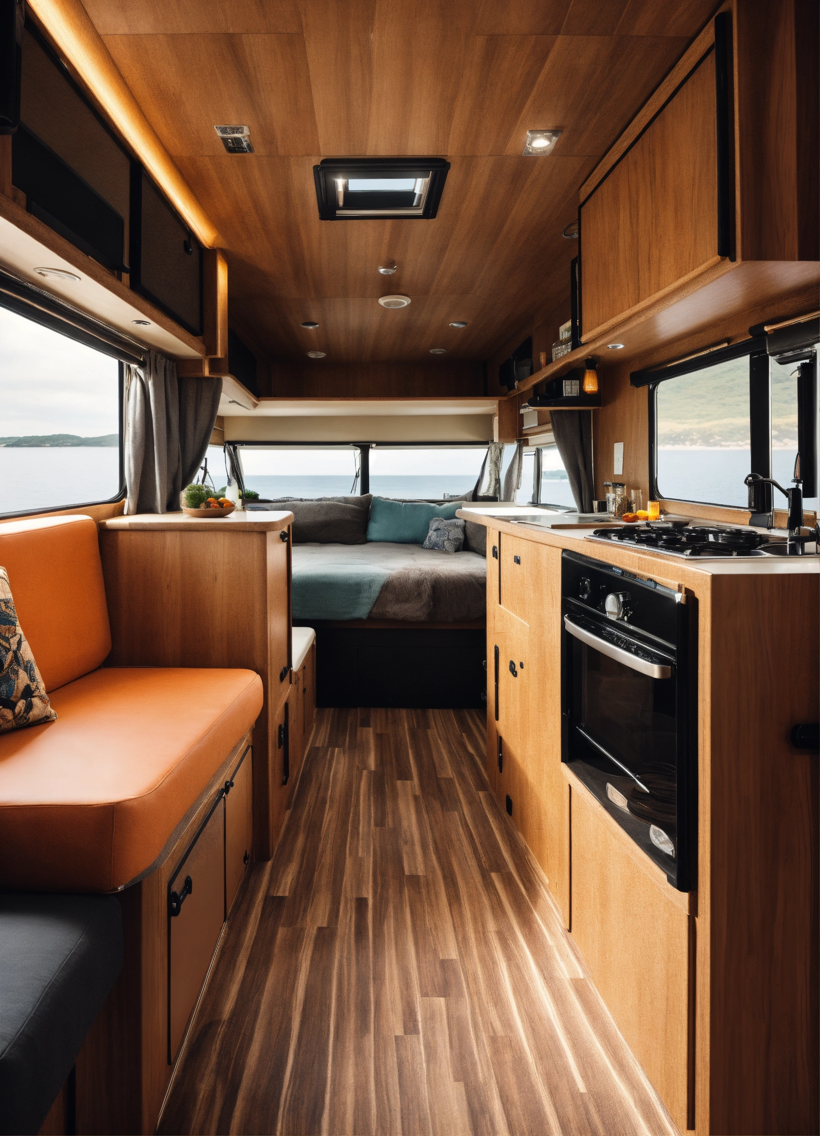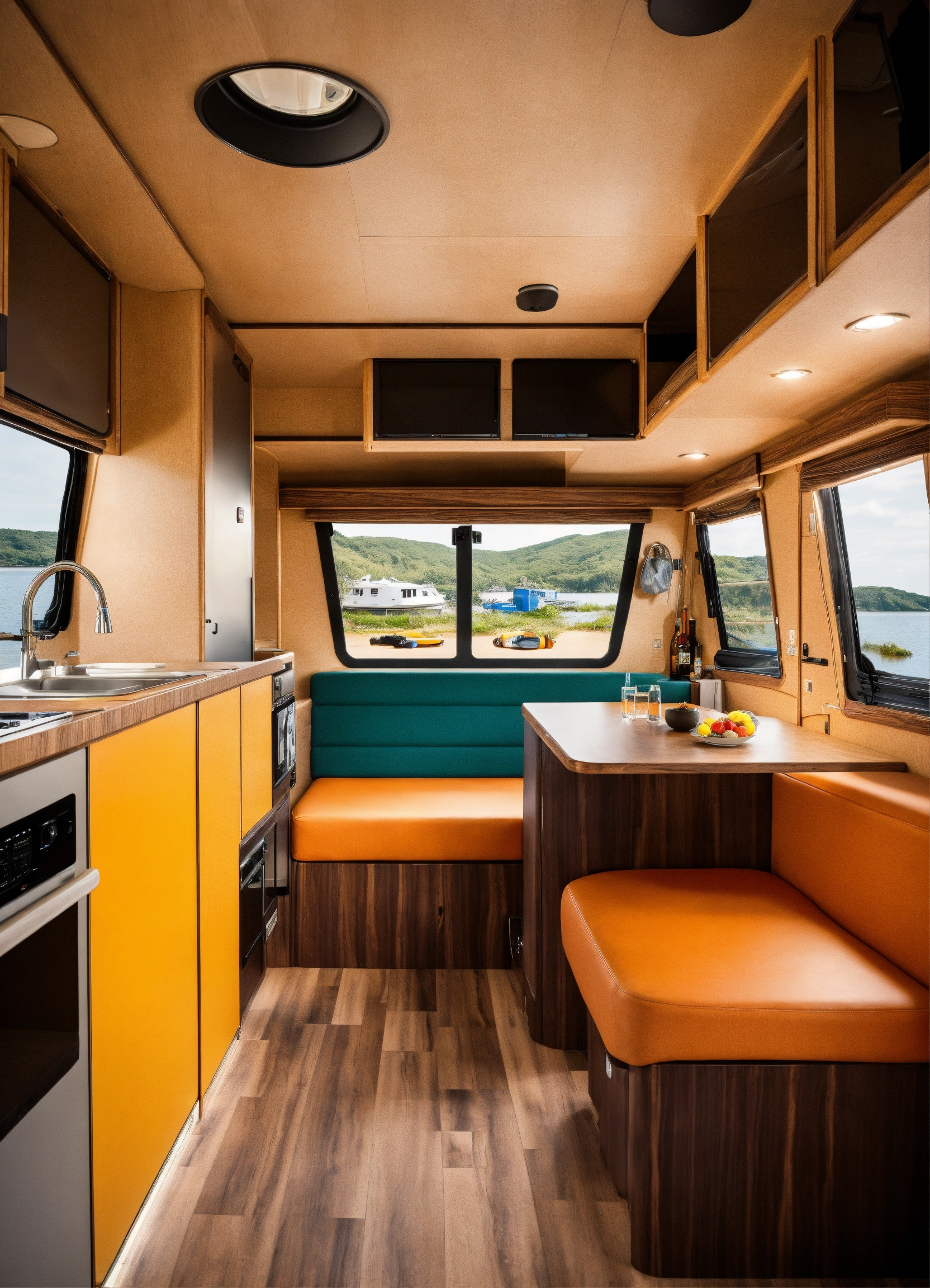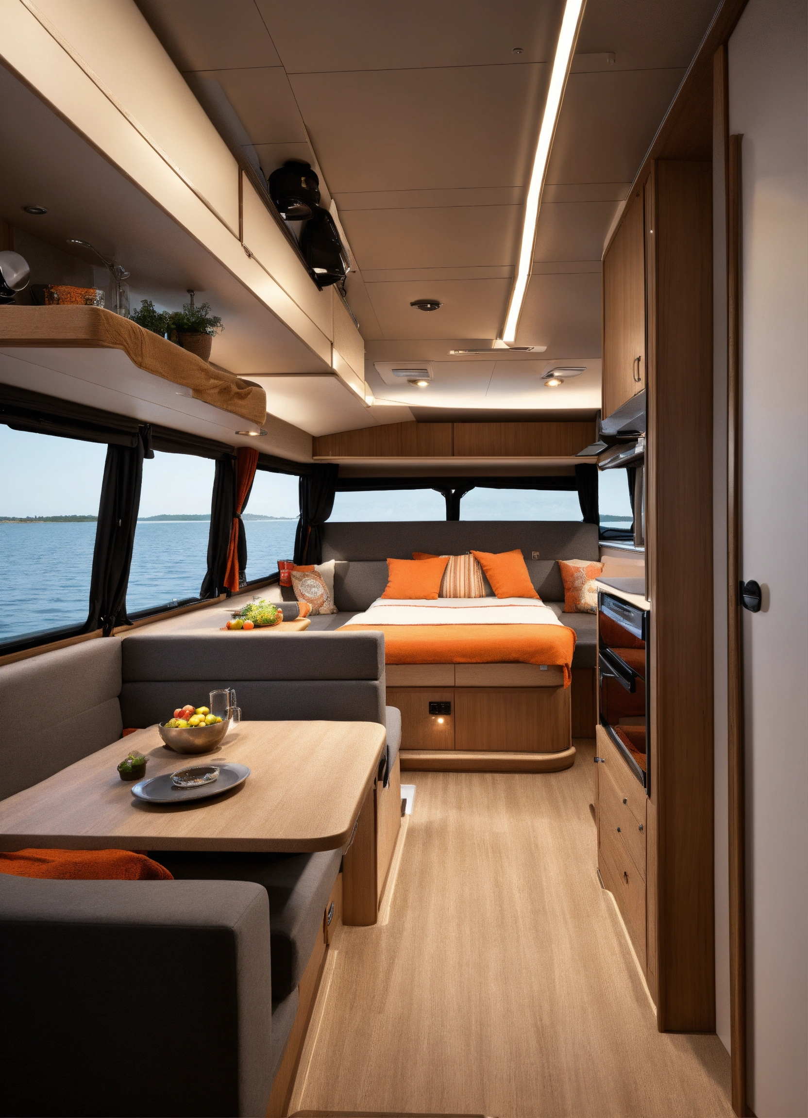 Interior view of a modern design of an amphi-camper, house boat, retractable tires, movement on land will be by a towing van, 45ft, 18 ft wide and the height 10ft on sea.