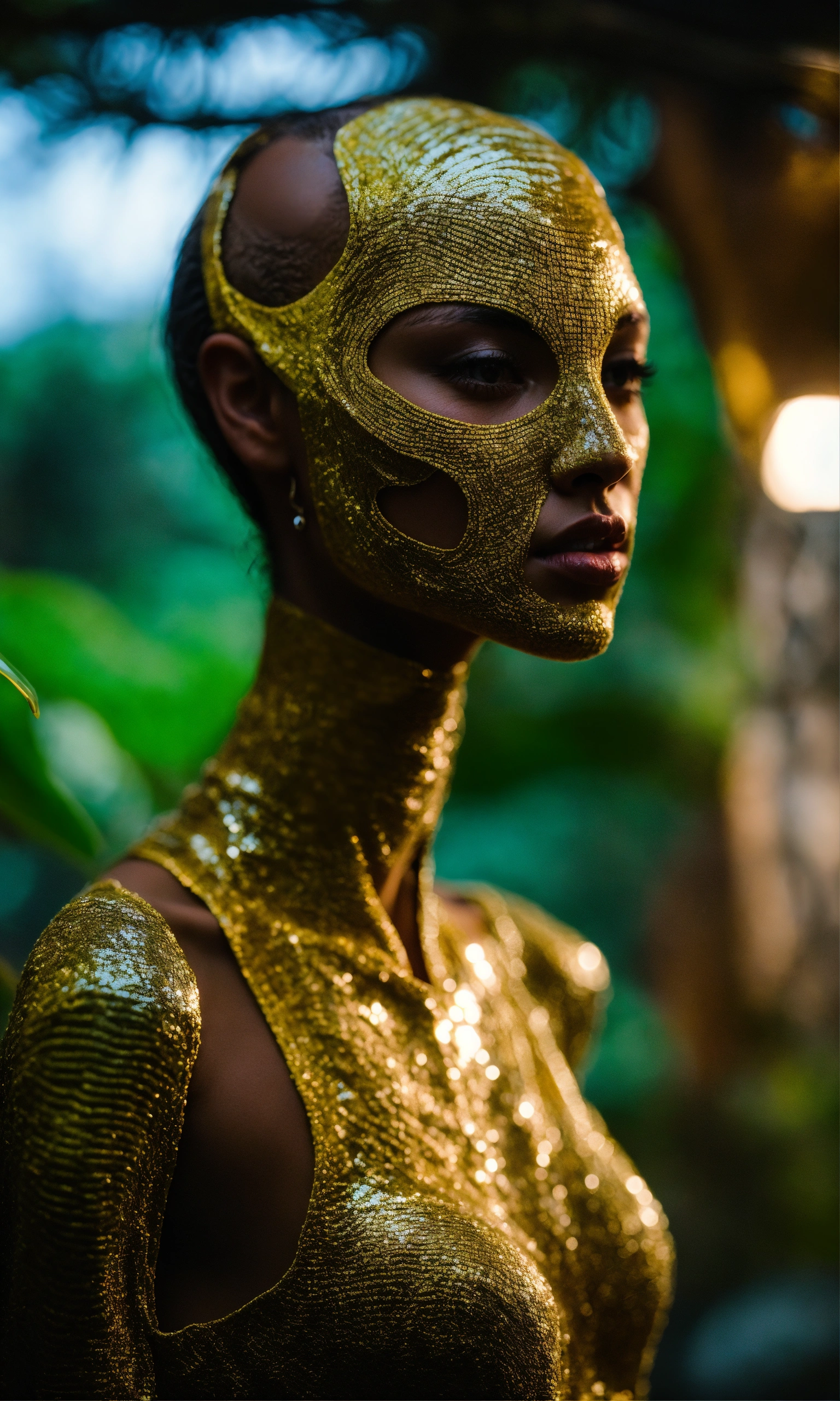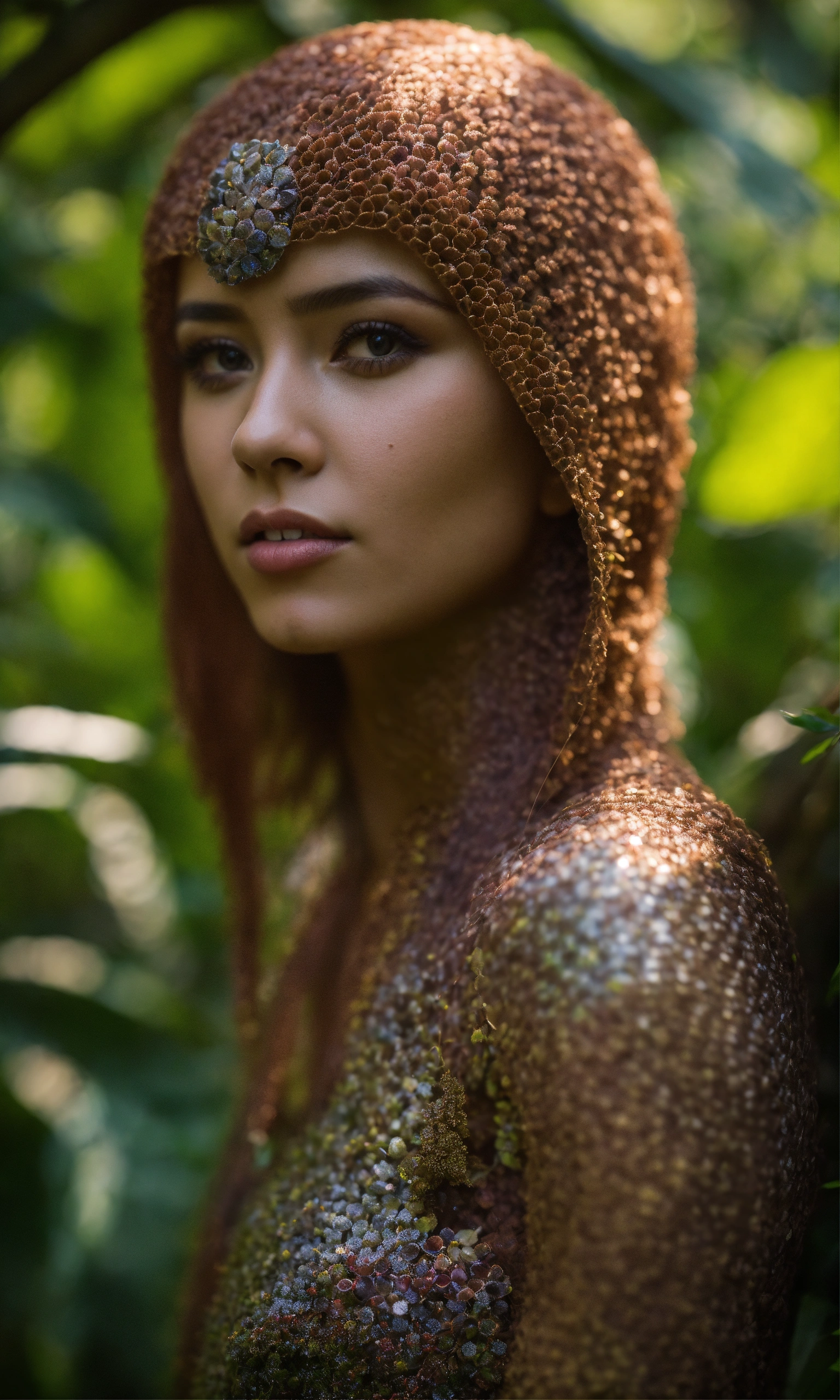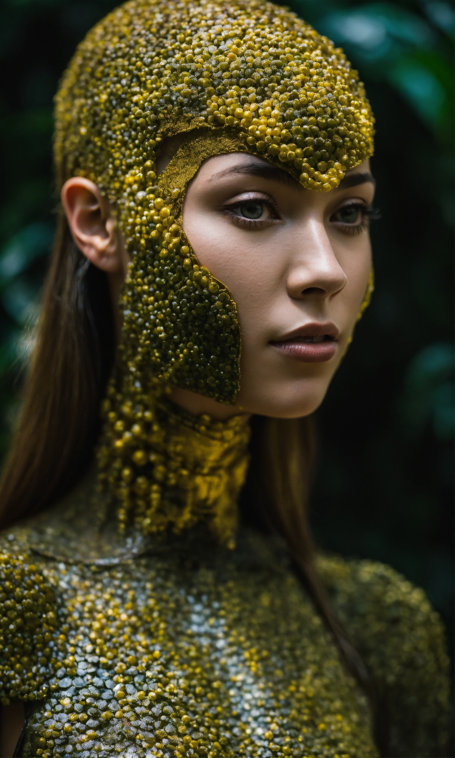 Fotografia de cuerpo entero humanoide extraterrestre femenina con piel de escamas de 21 años, muy alta y delgada sin rasurar en la jungla, detalles fotográficos hiperrealistas, plano general, f2.8, enfoque en los ojos, 1/250, iso 3200, nikon z9, angulo de cámara de 120 grados