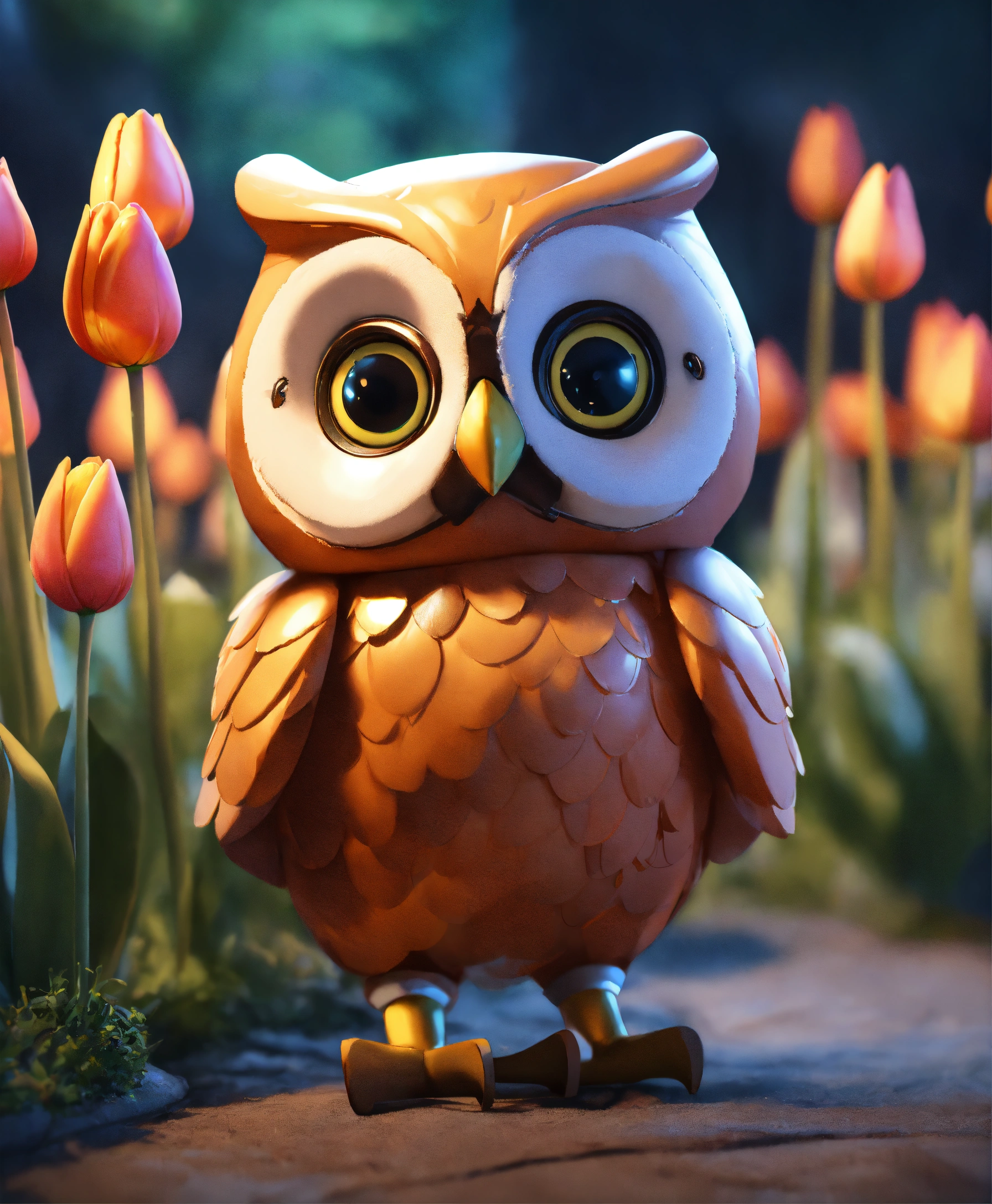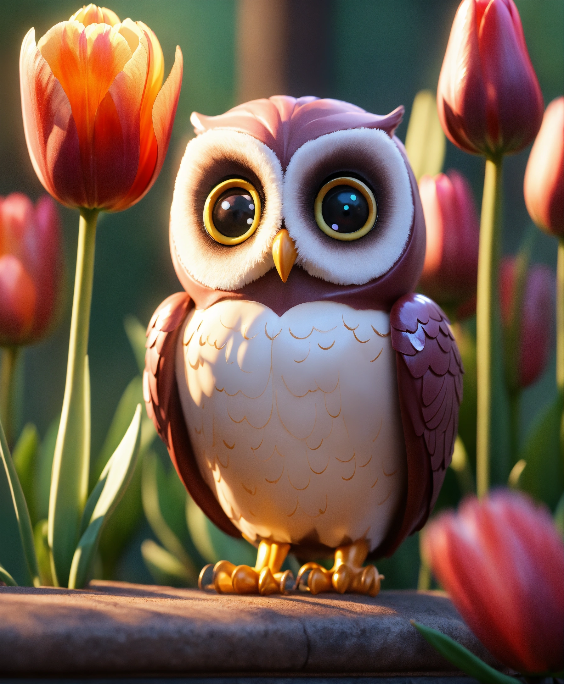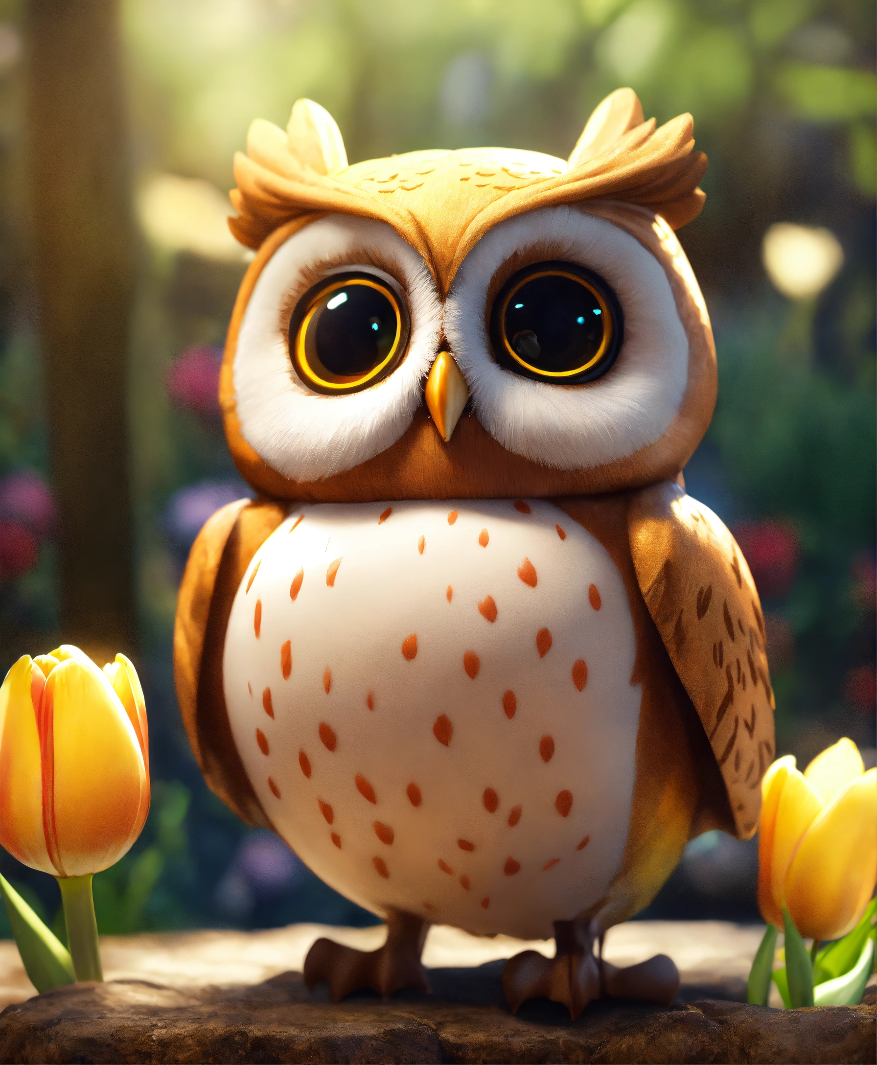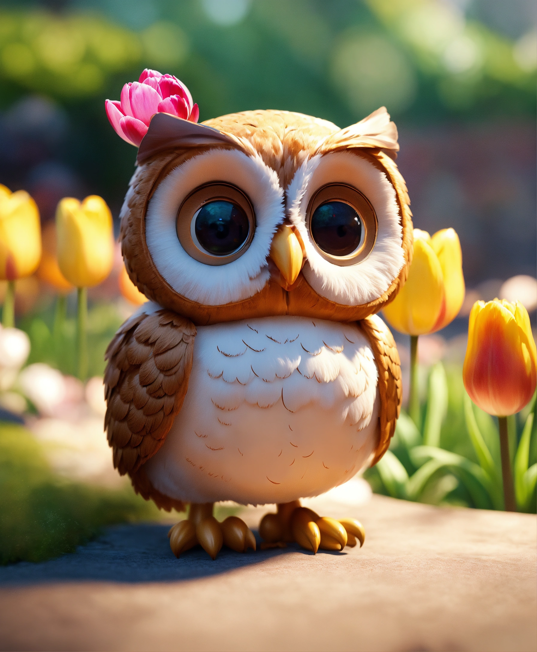 Cute adorable doll style owl smiling looking at a little tulip doll style, unreal engine, garden lighting, art station, detailed digital painting, cinematic, character design by pixar, unreal 5, daz, hyper realistic.