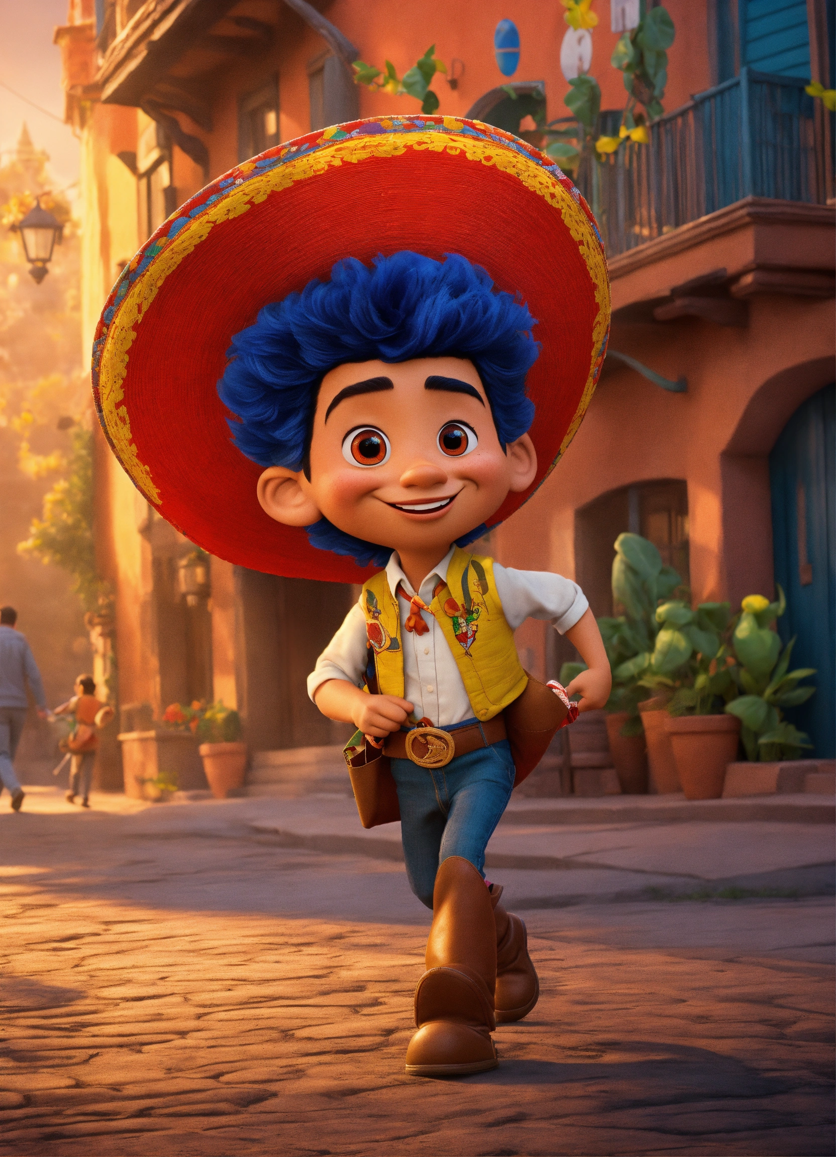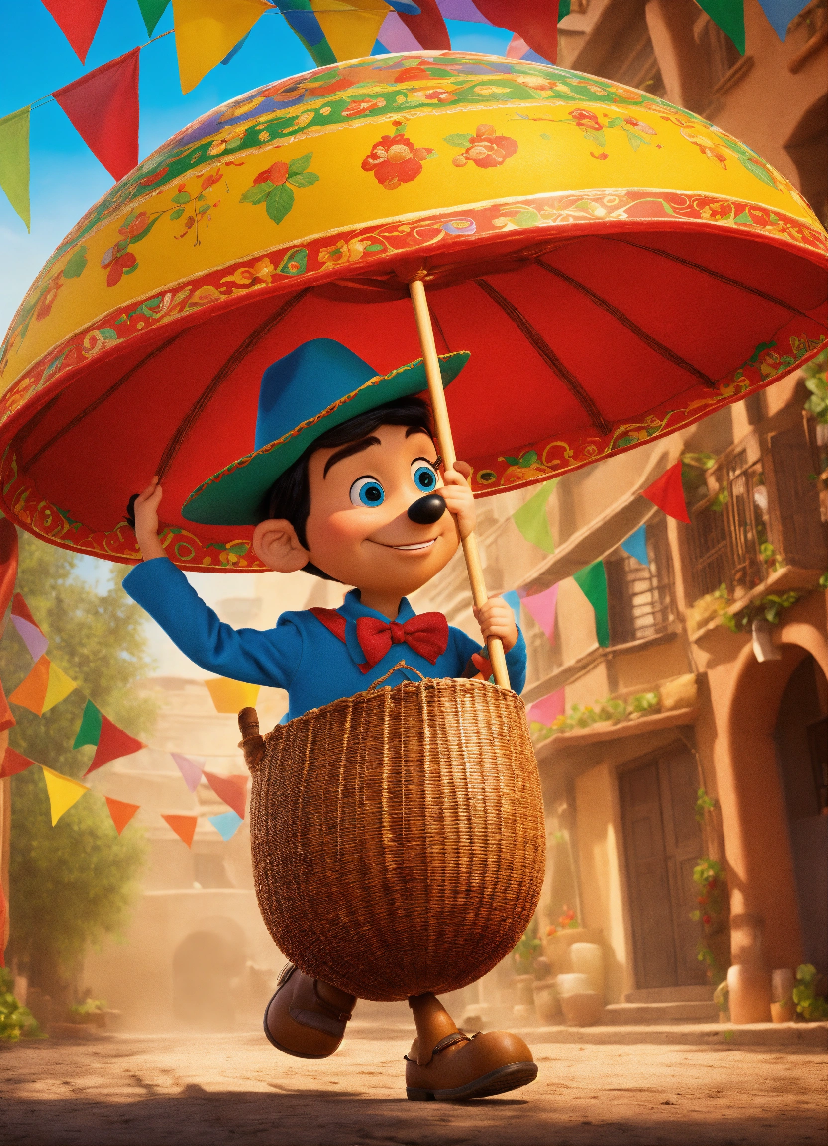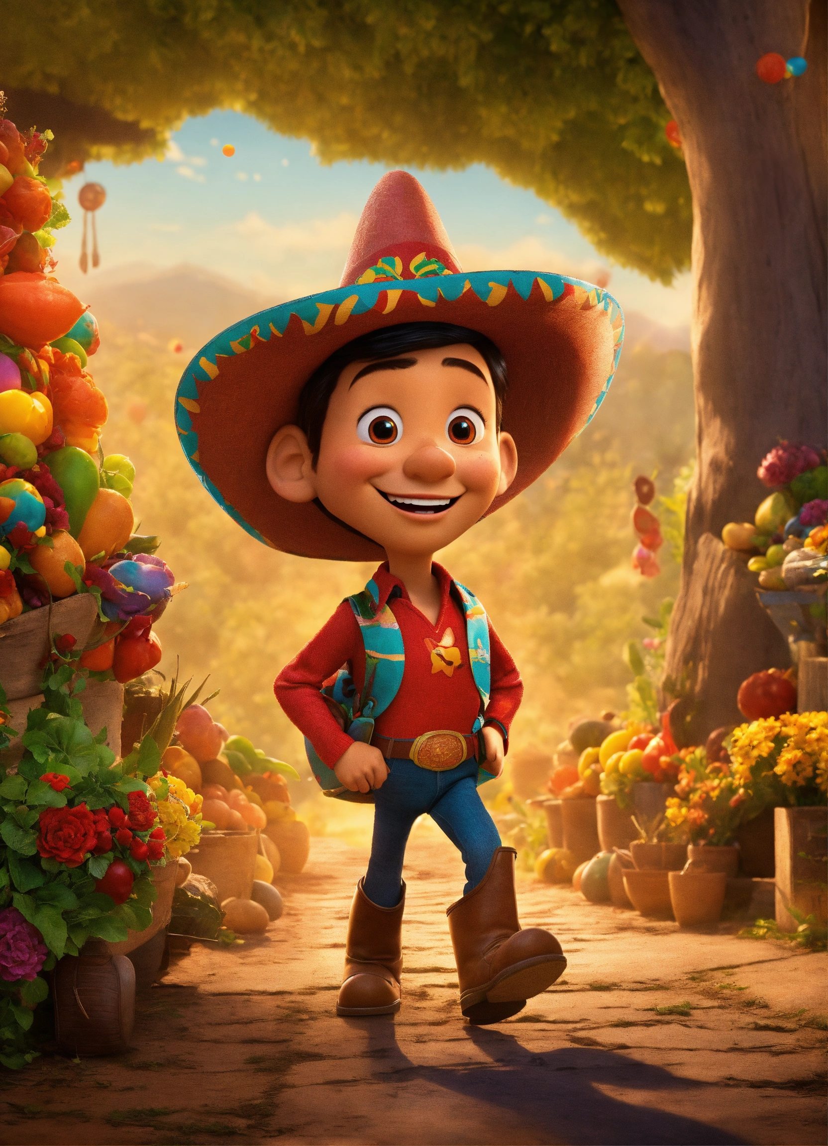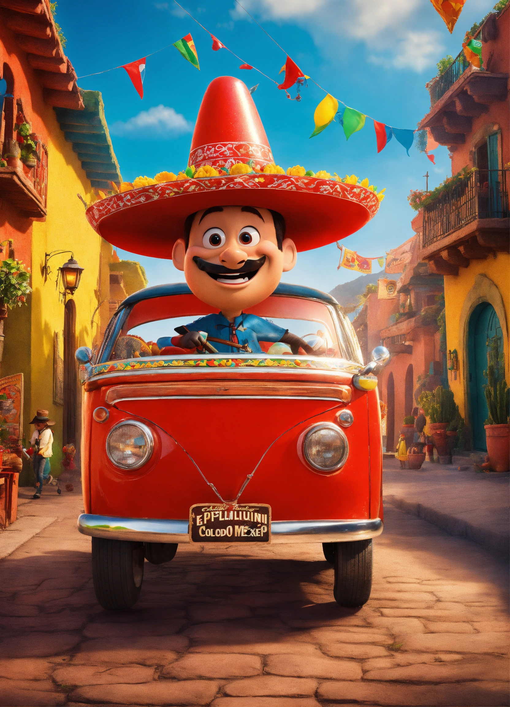 El chapulín colorado caminando hacia una fiesta mexicana, con estilo de poster de película de disney pixar, calicatura 3d