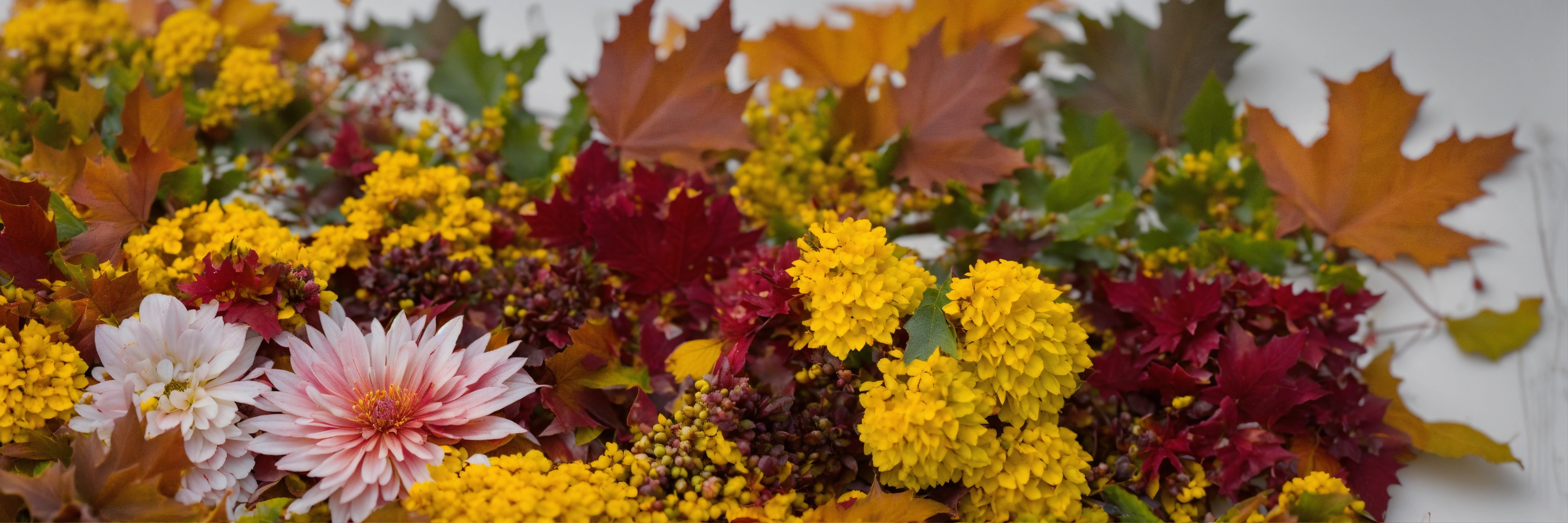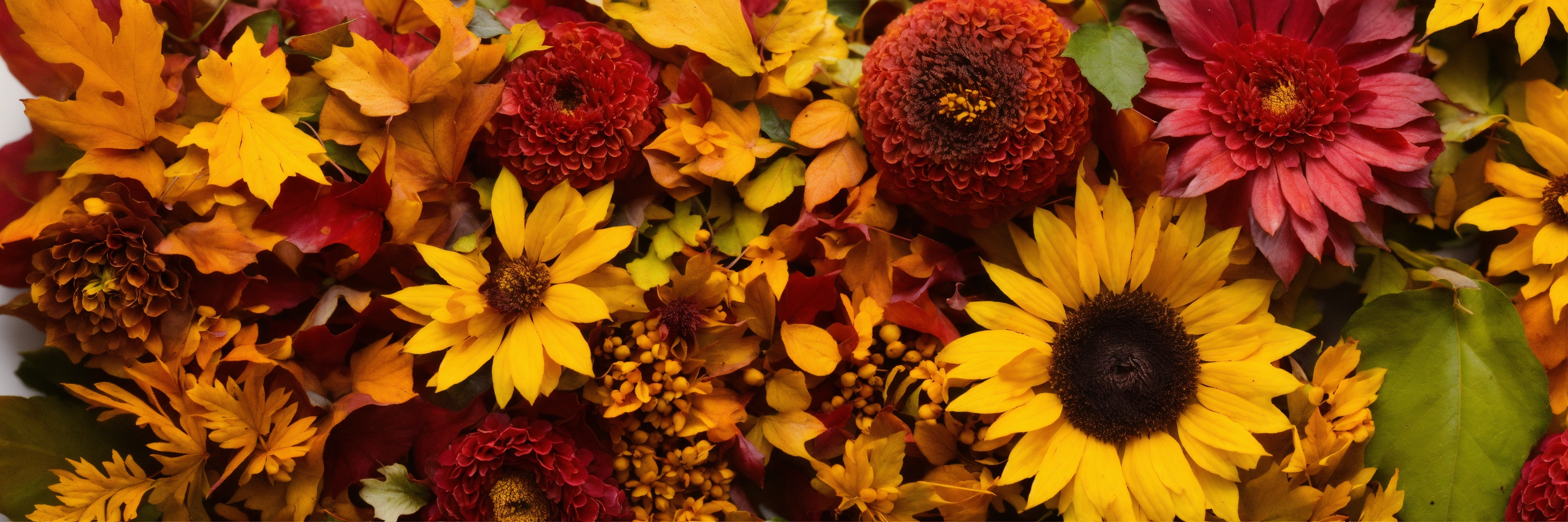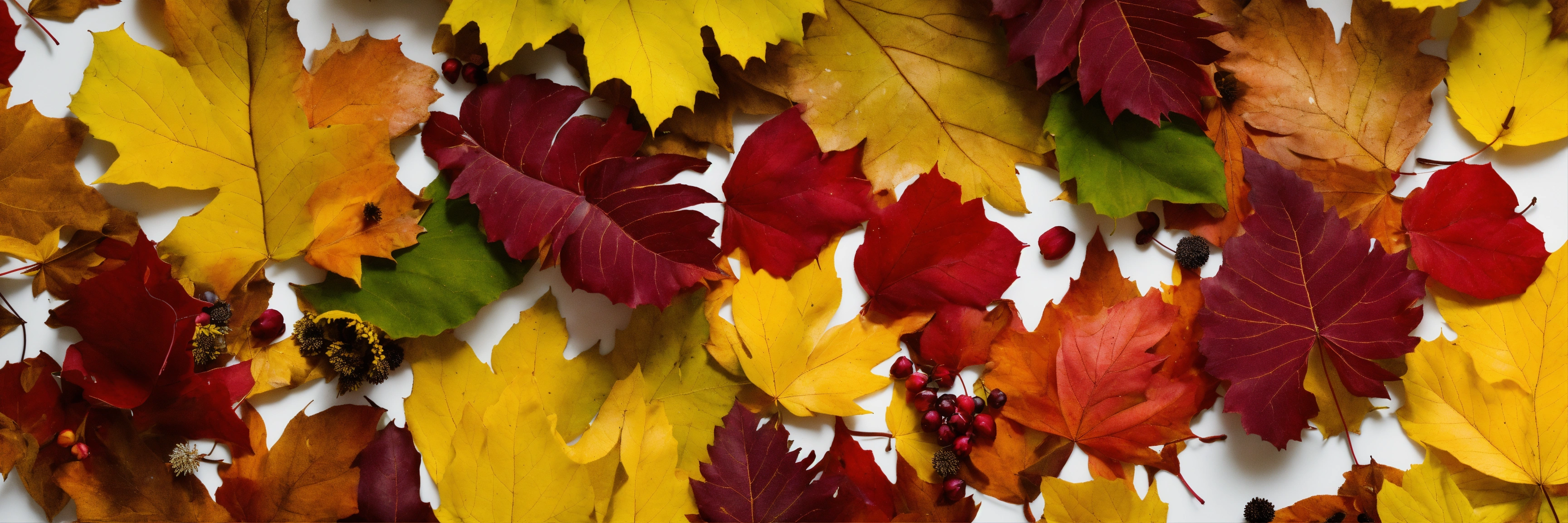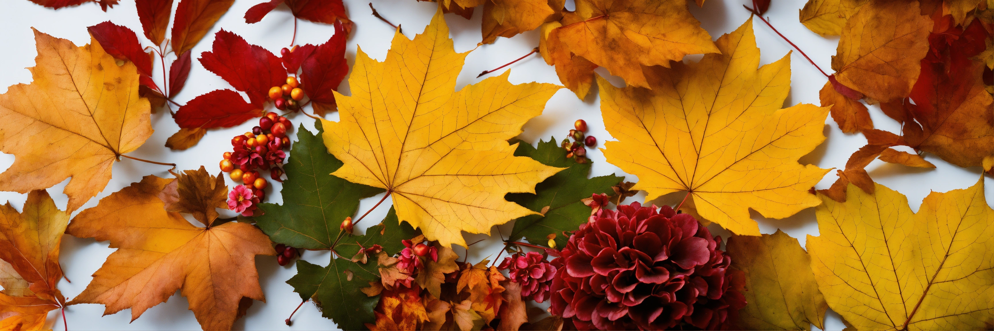Autumnal leaves and flowers arranged randomly in a heap with a clear white background