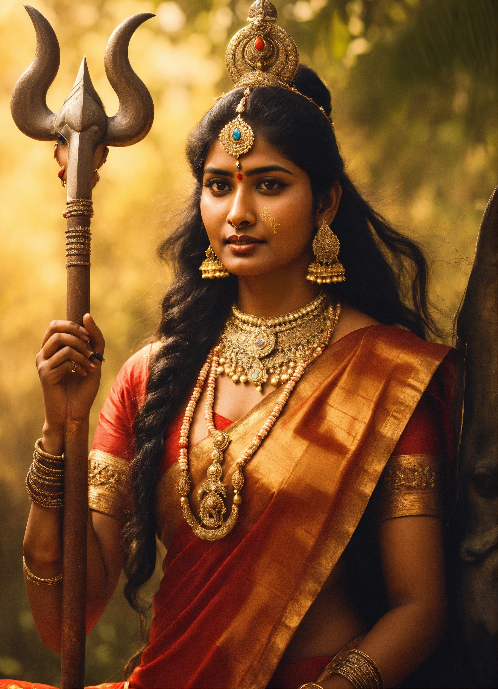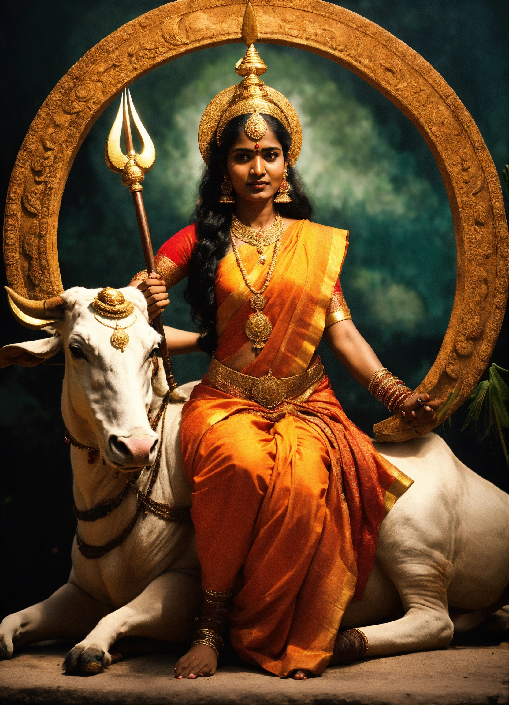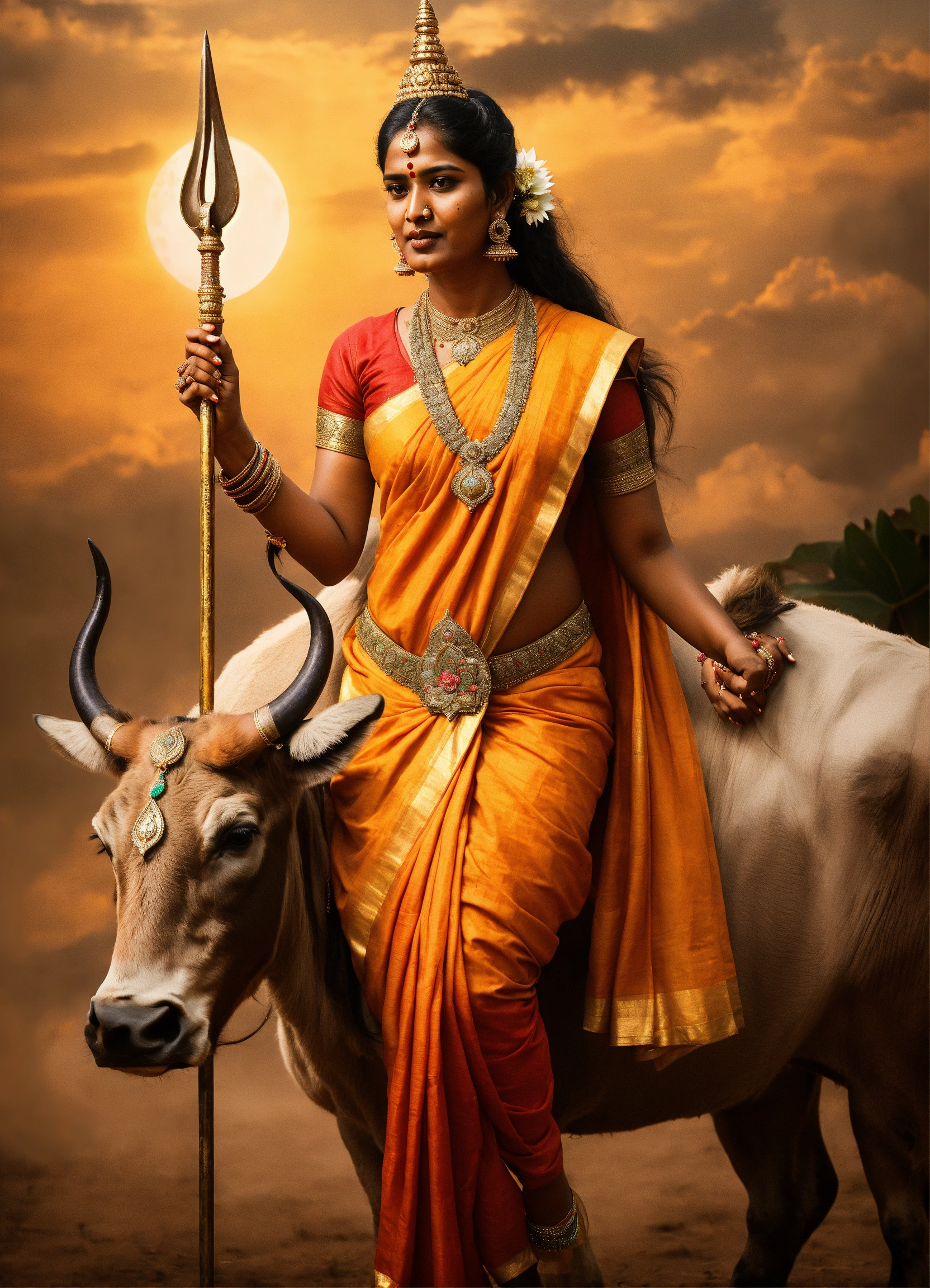 A hyper realistic photograph of a south indian, hindu woman as maa shailaputri has a half moon on her forehead. you can also see a trident in her right hand and a lotus flower in her left hand. she rides on an ox