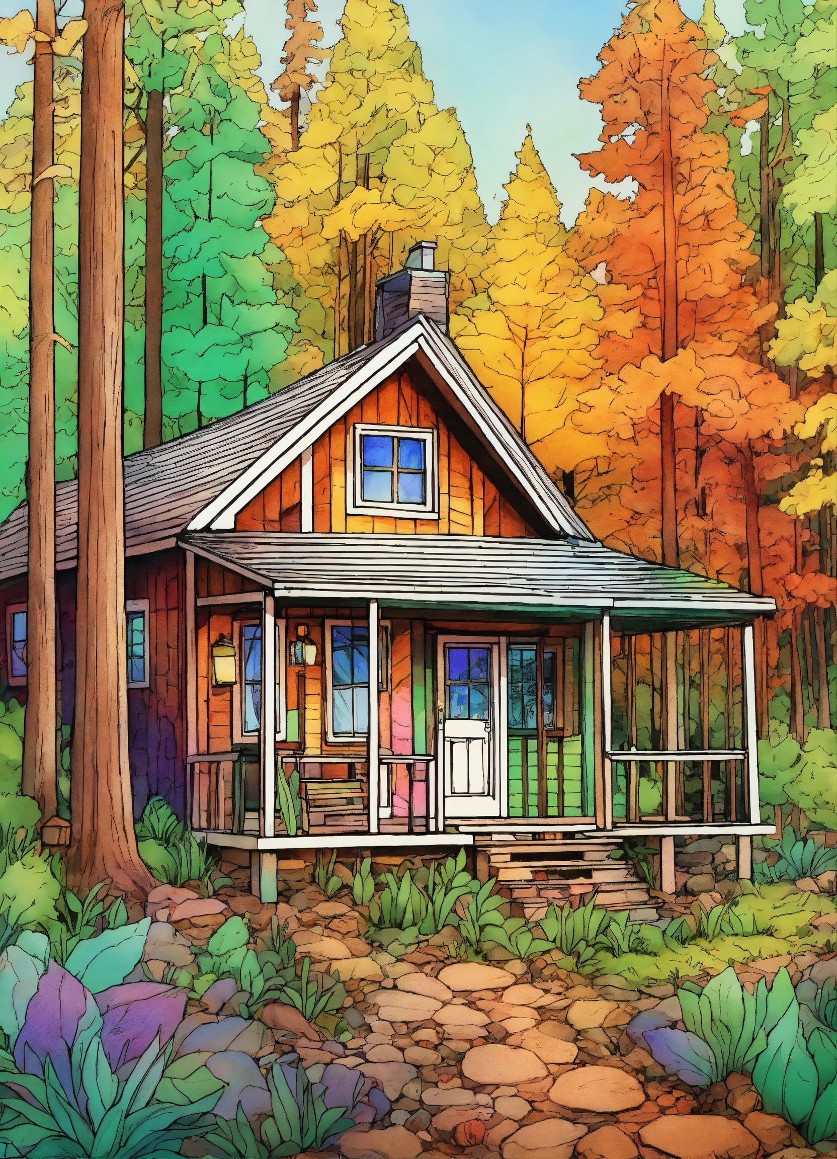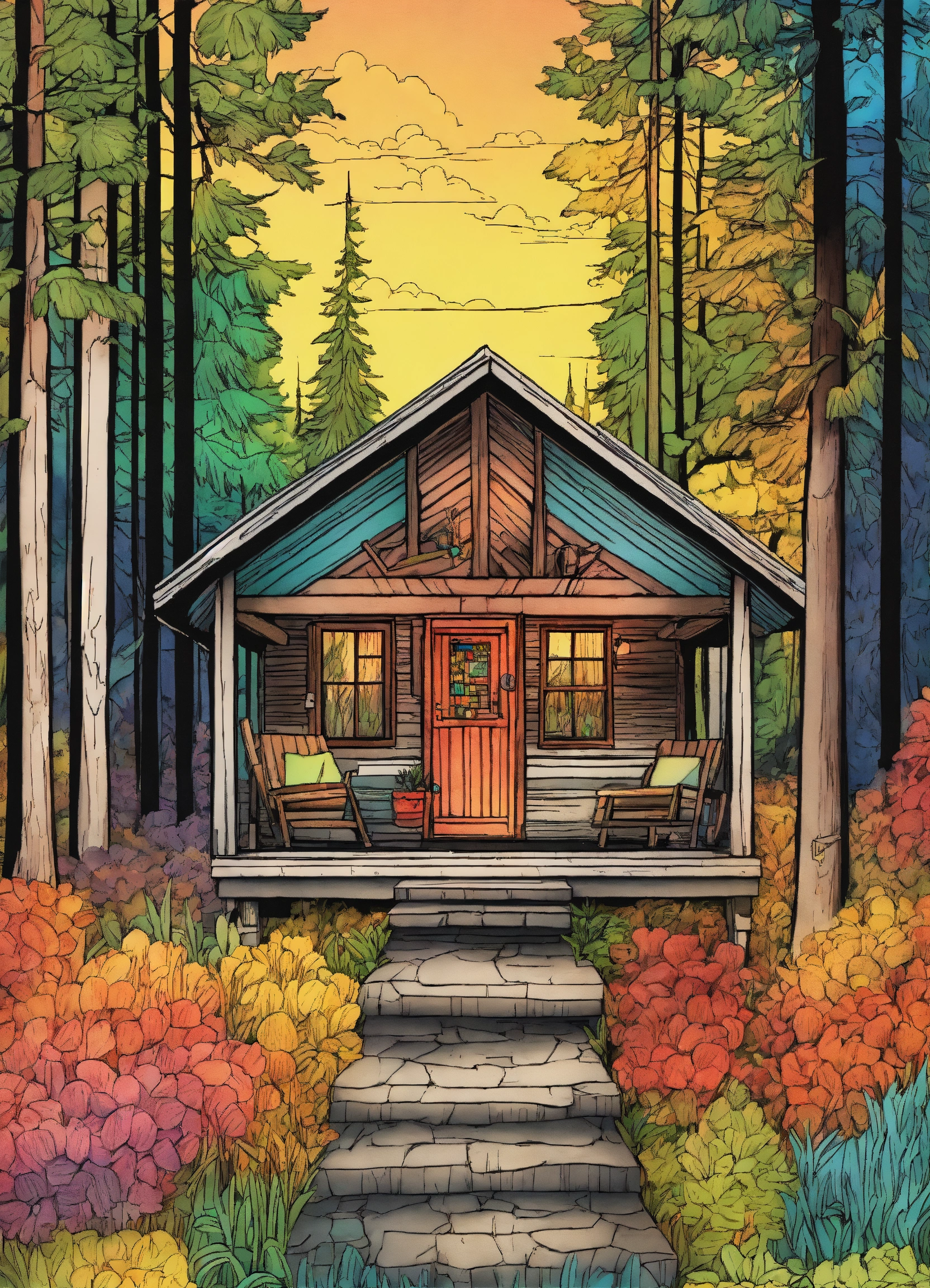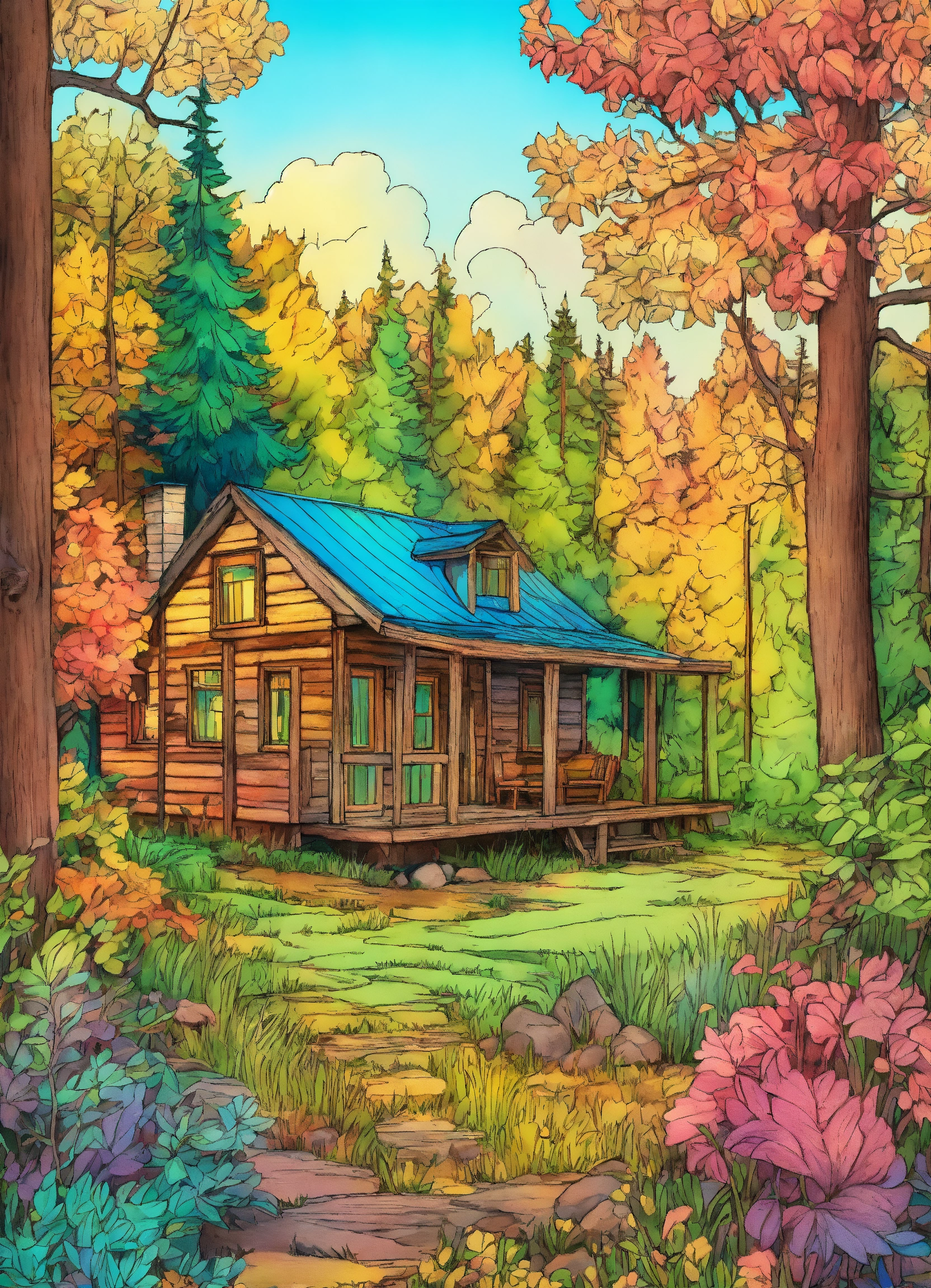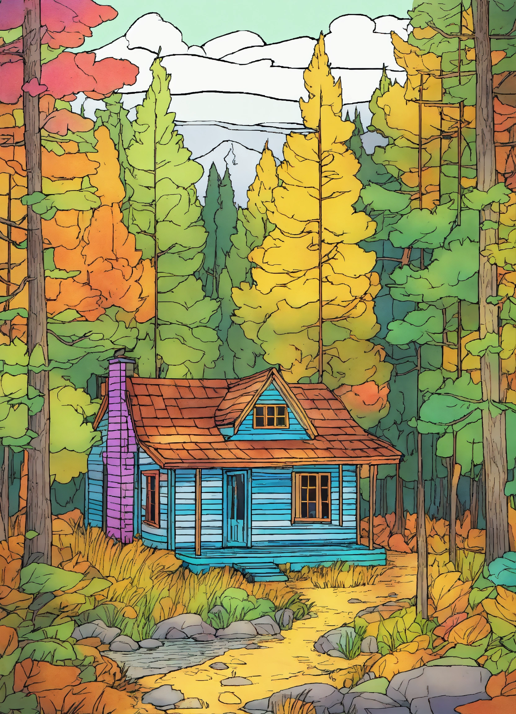 Coloring page for adults, a colorful drawing painted in a coloring pencil style with thin dark lines of a cabin in the woods