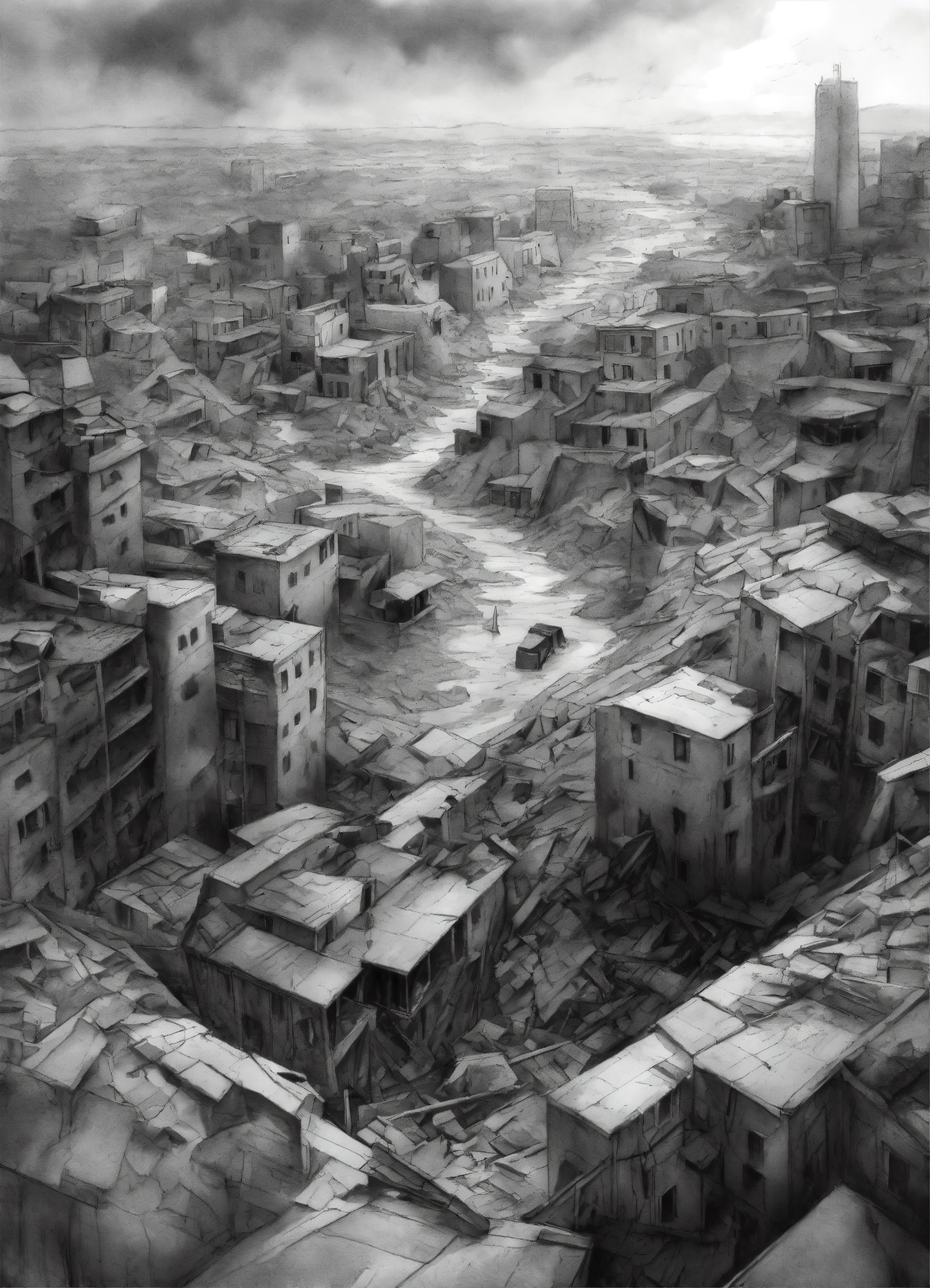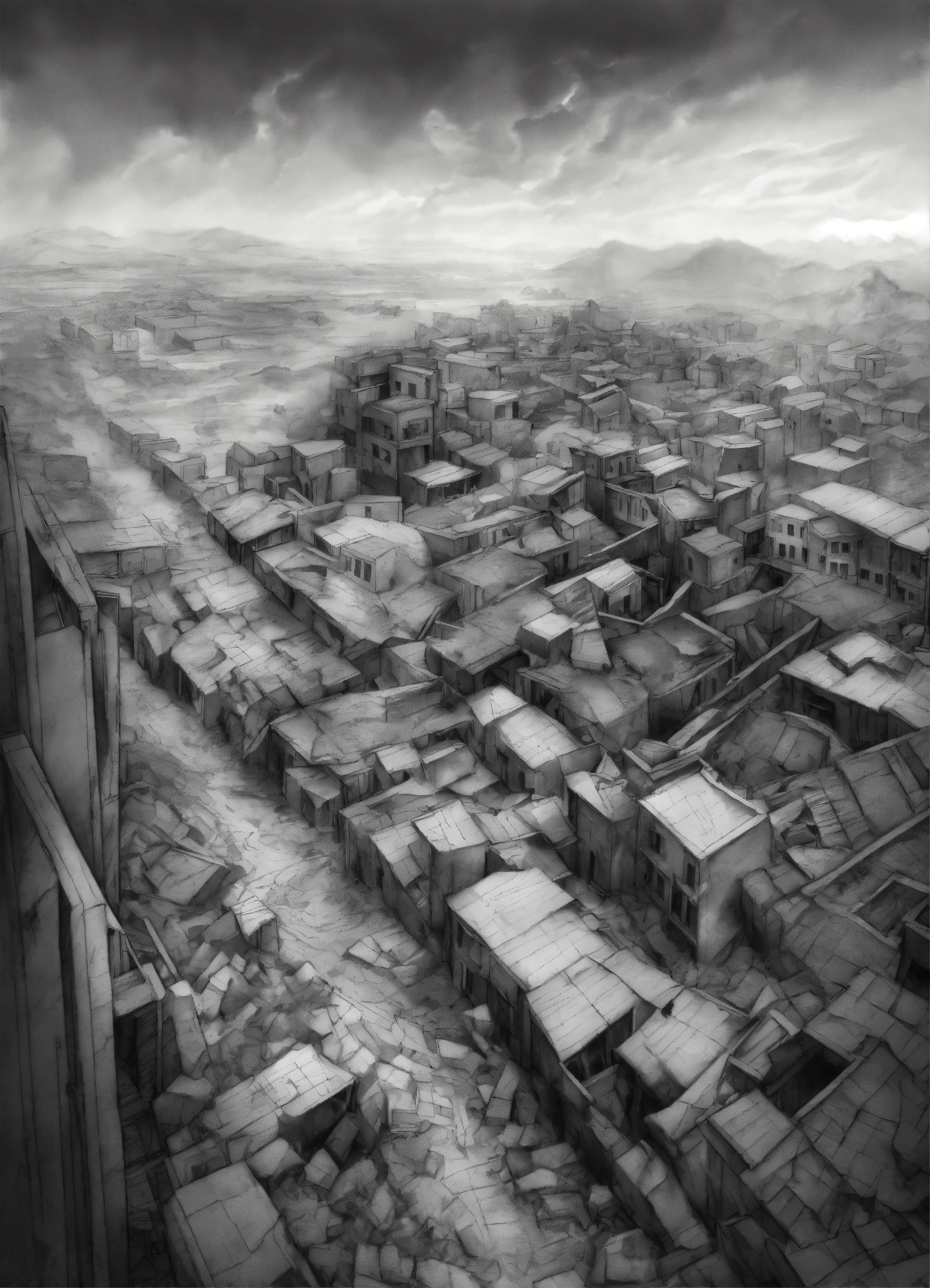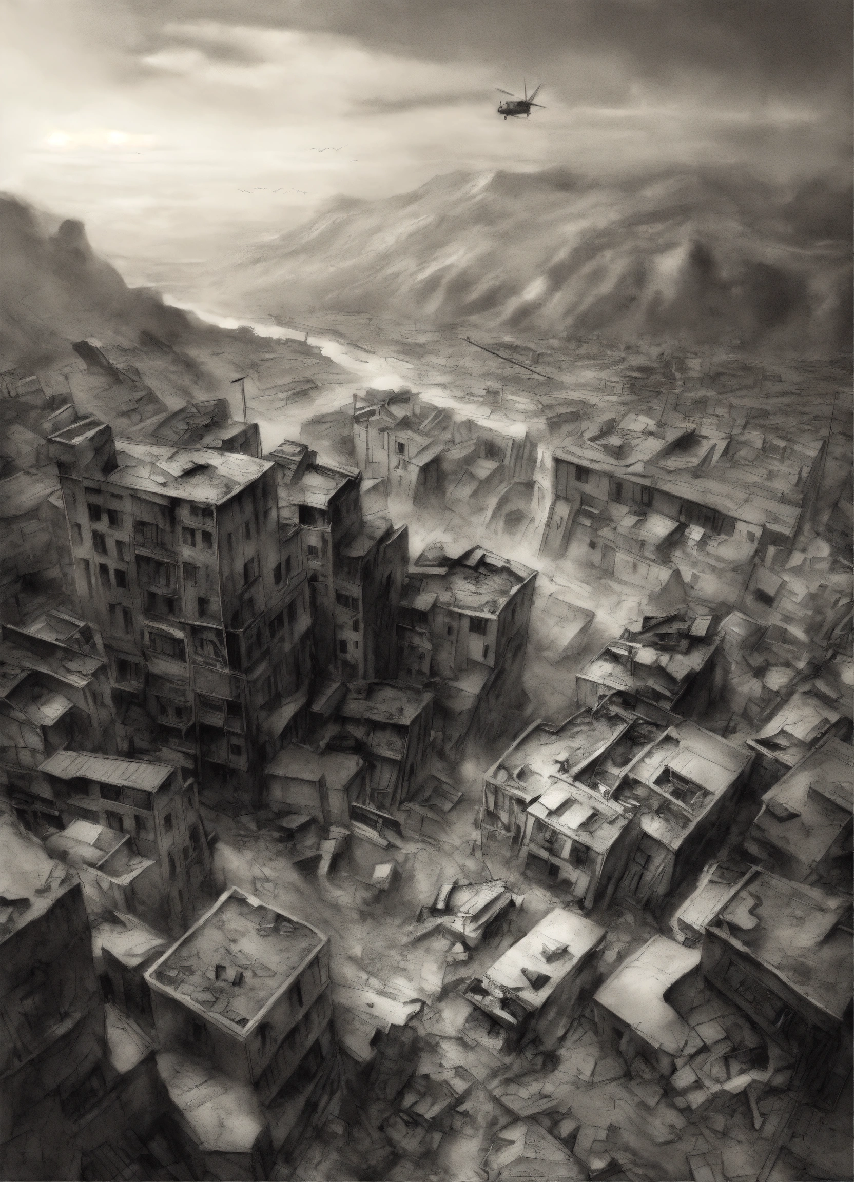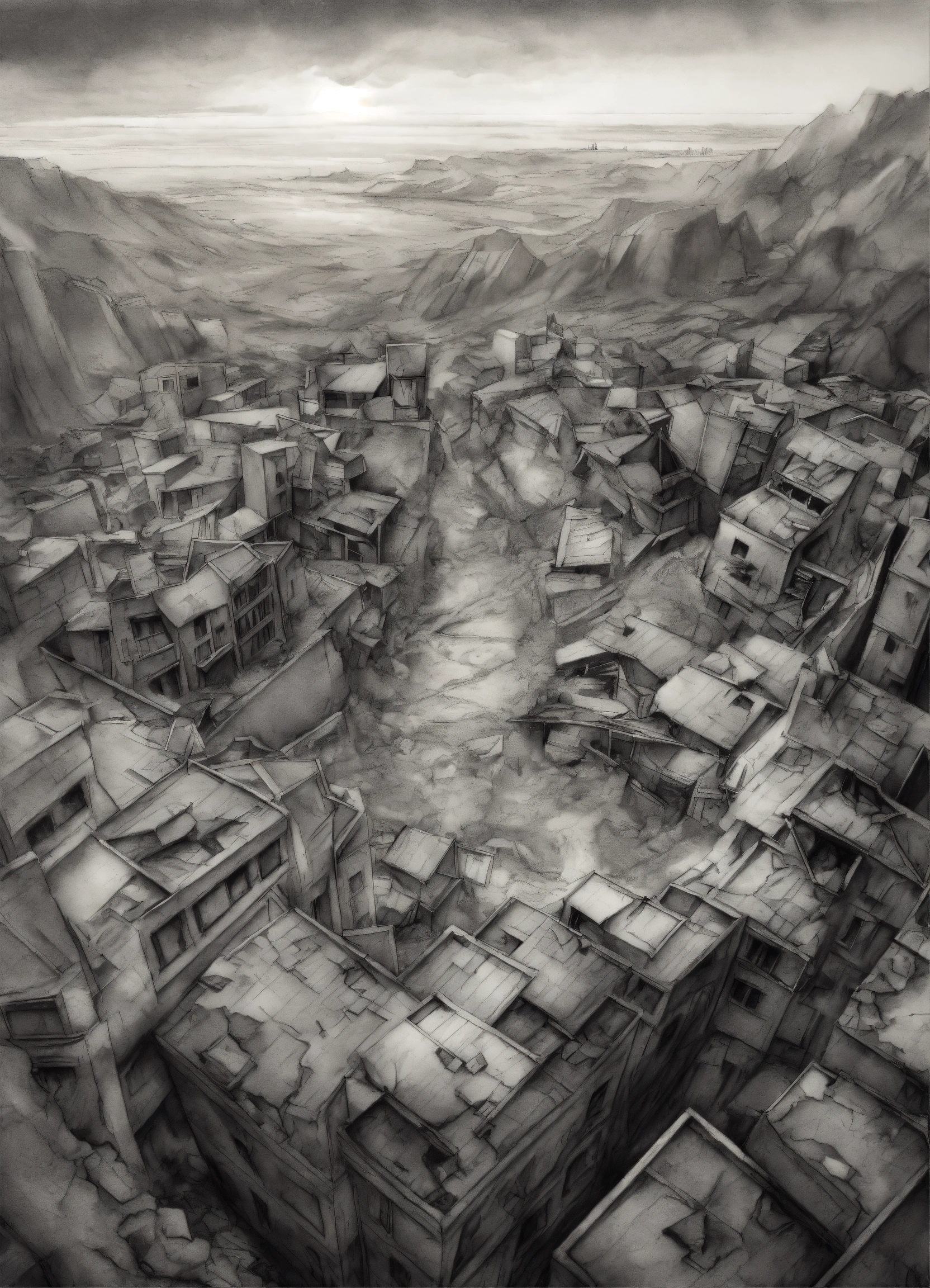 A sketch in greyscale of a scene from above depicting a fractured piece of terrain floating above a devastated city, earthquake, pencil effect. realistic. high details. harsh lighting.