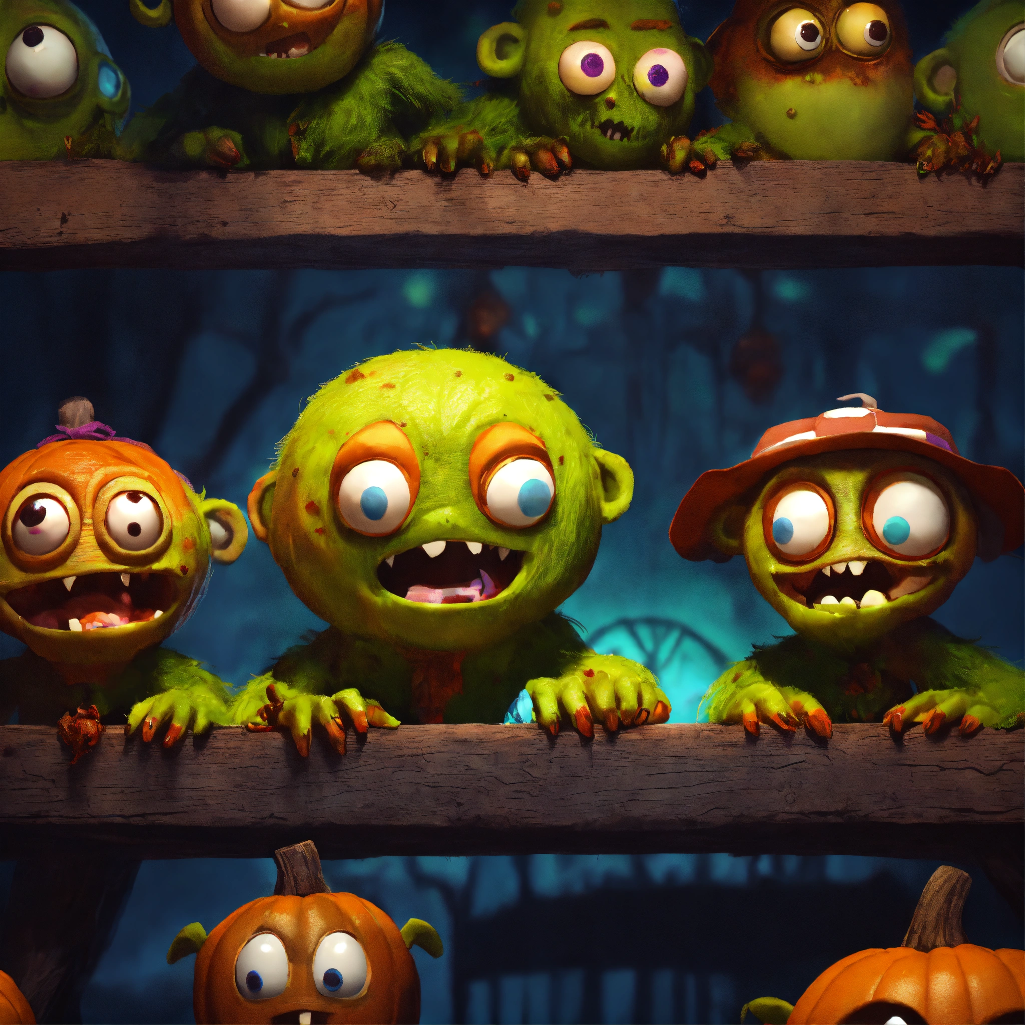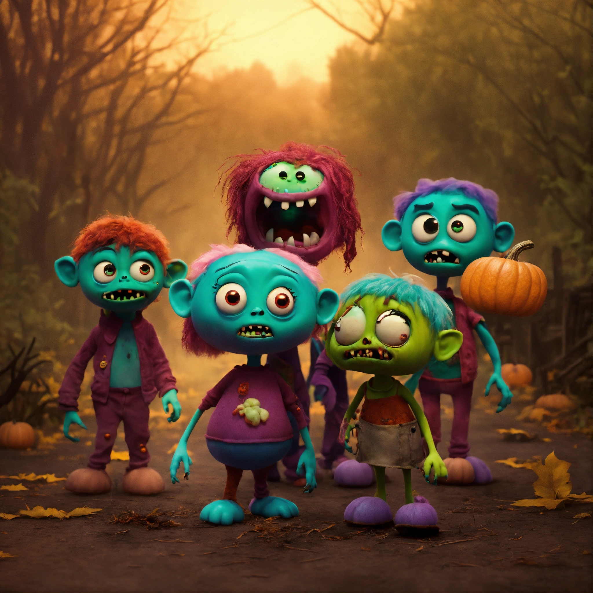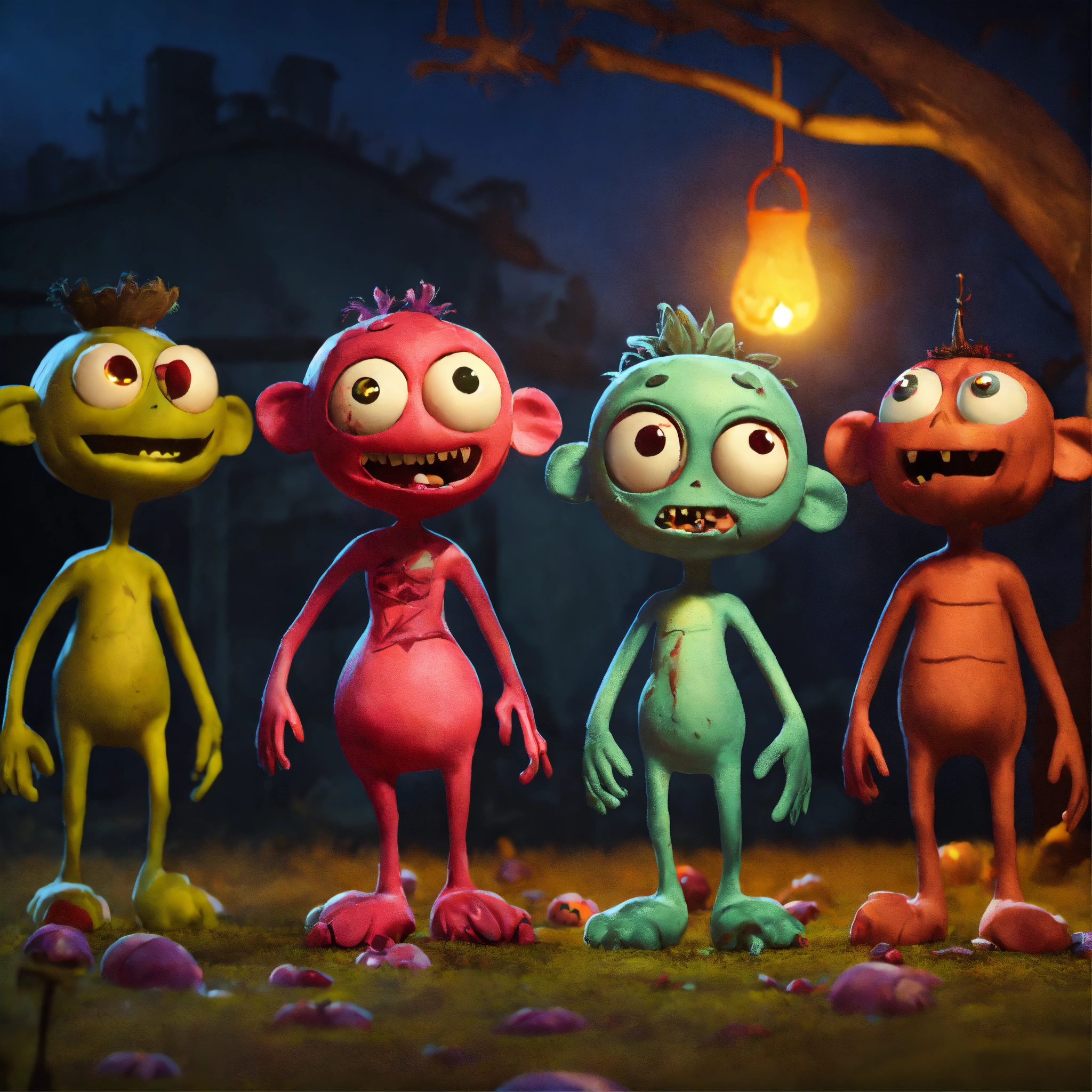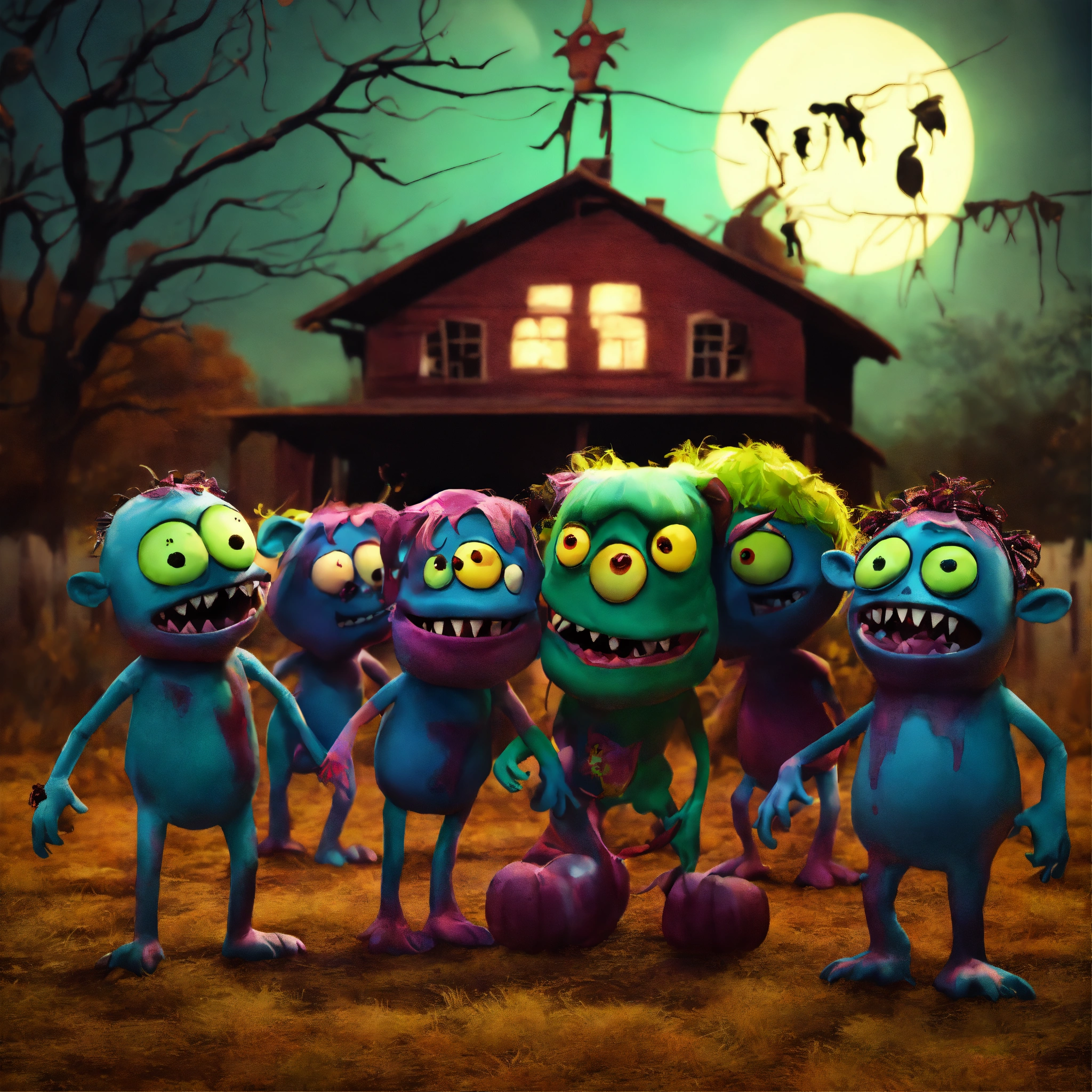 Group of cute friendly pixar-style monstersas zombies for halloween on a haunted farm, dark colors, animated feature film quality but with soft diffusion