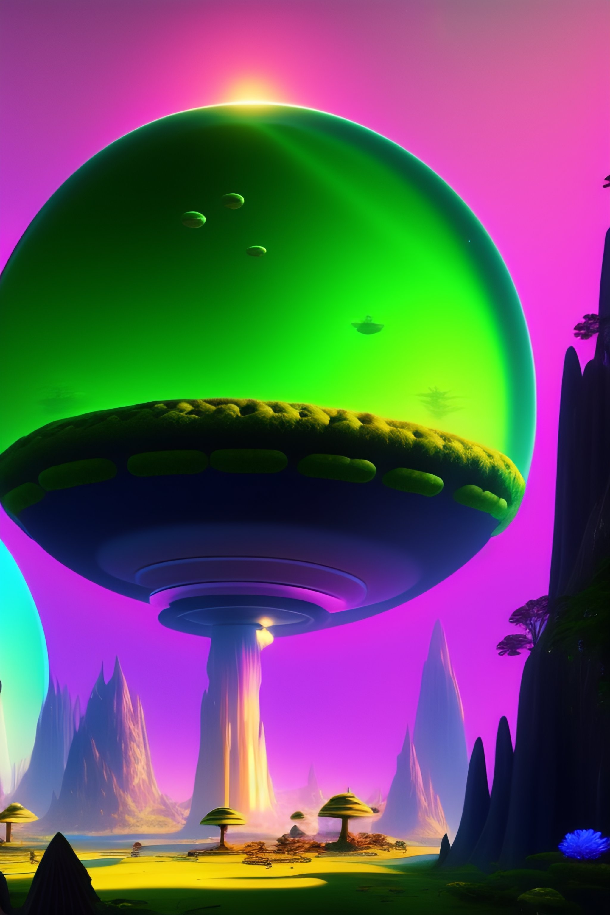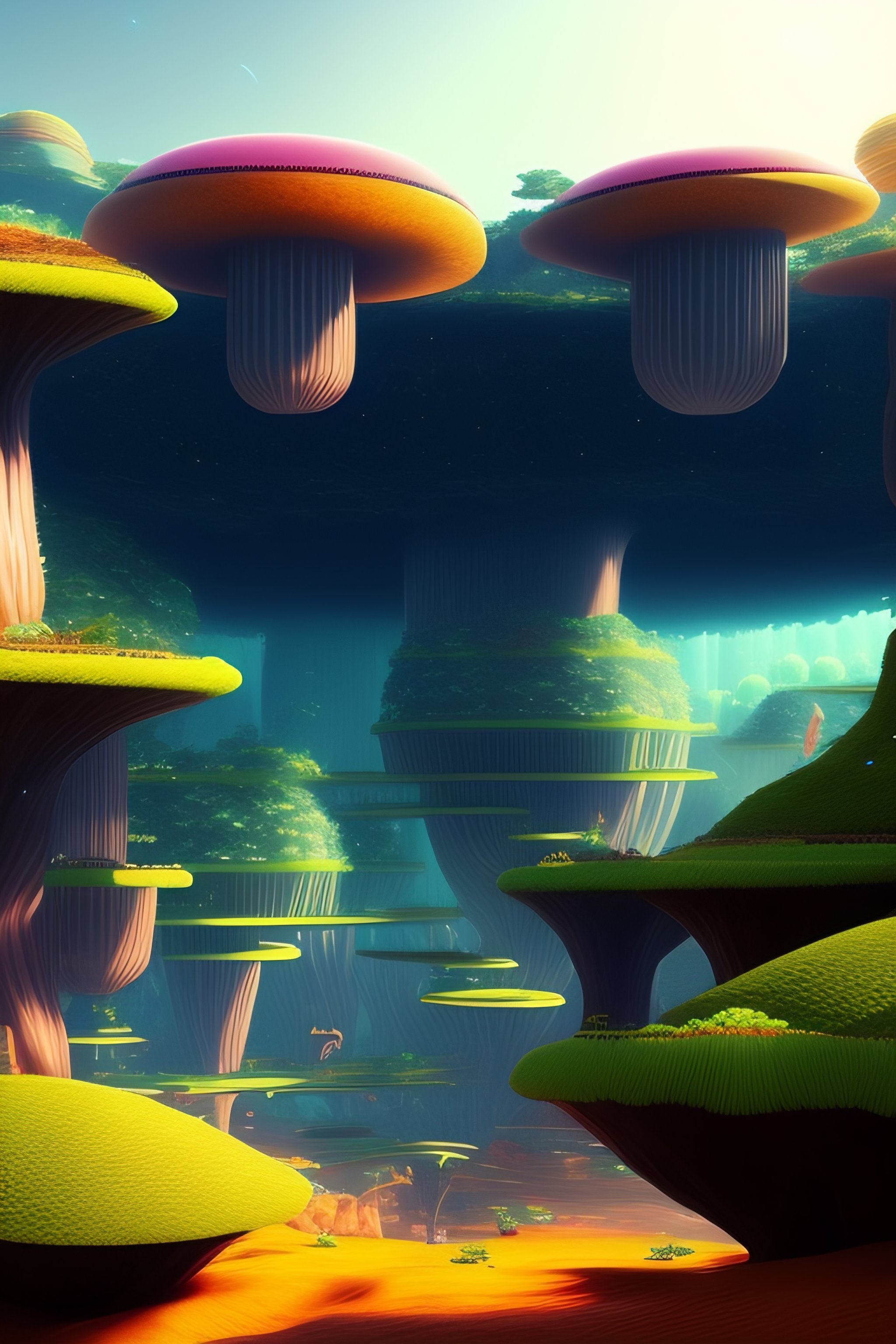 Epic alien world with a jungle made out of mushrooms and futuristic aliens