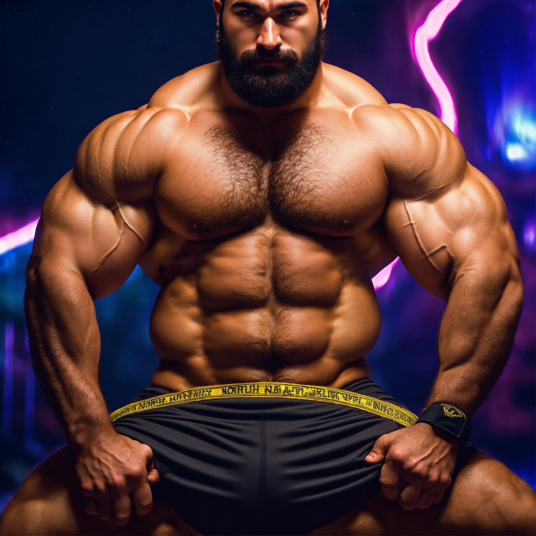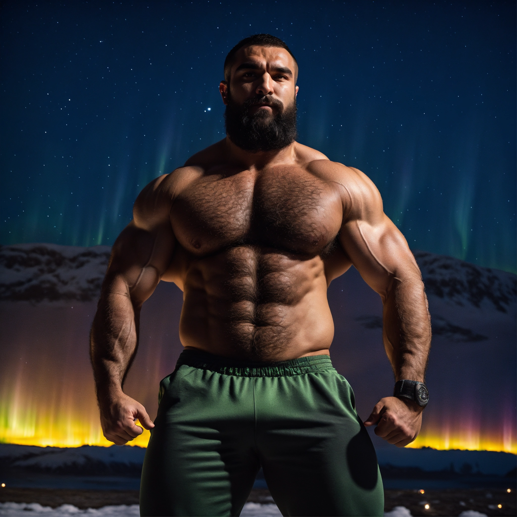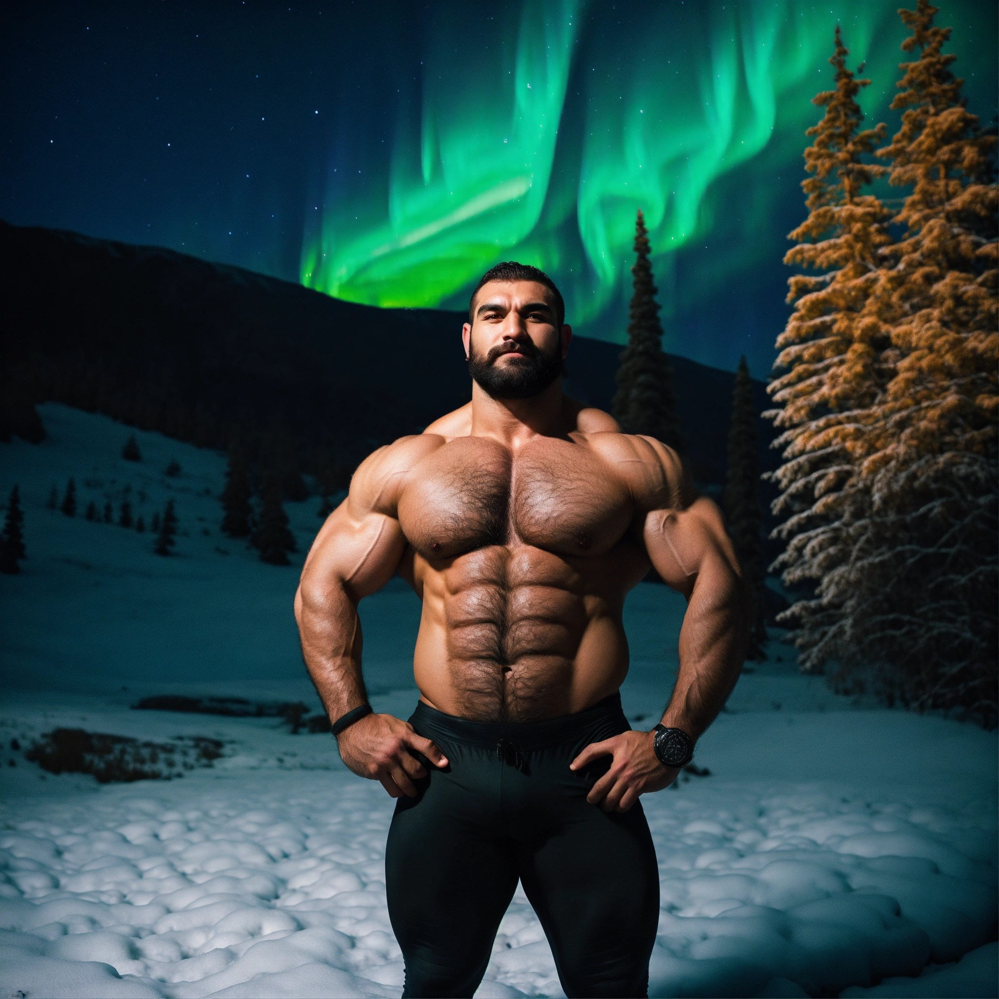 30-year-old hairy azerbaijani man with big muscles, big bodybuilder, body like a wrestler, under the northern lights