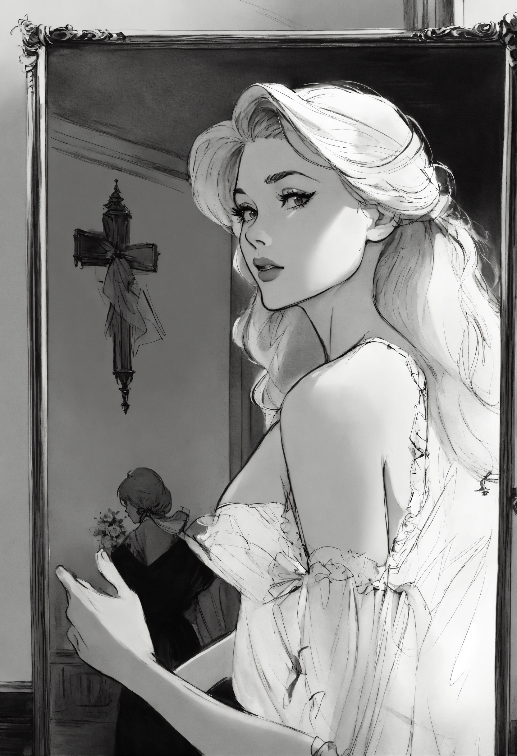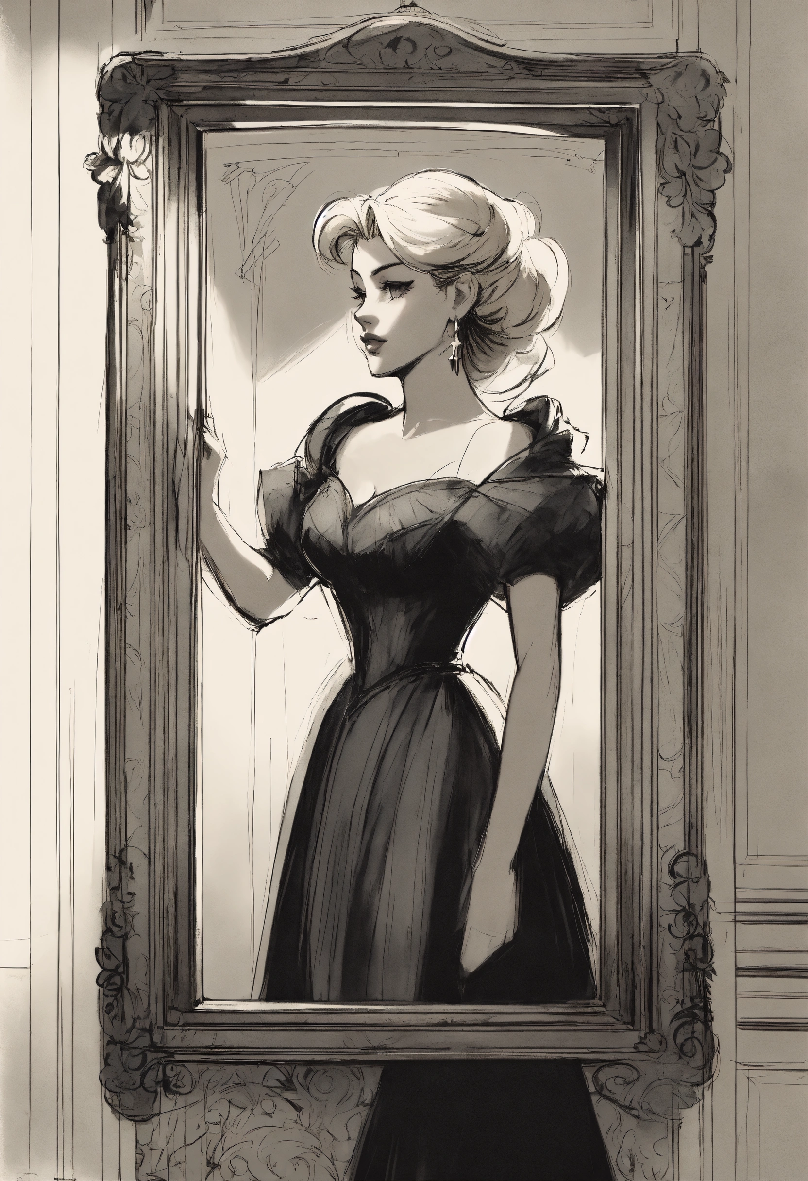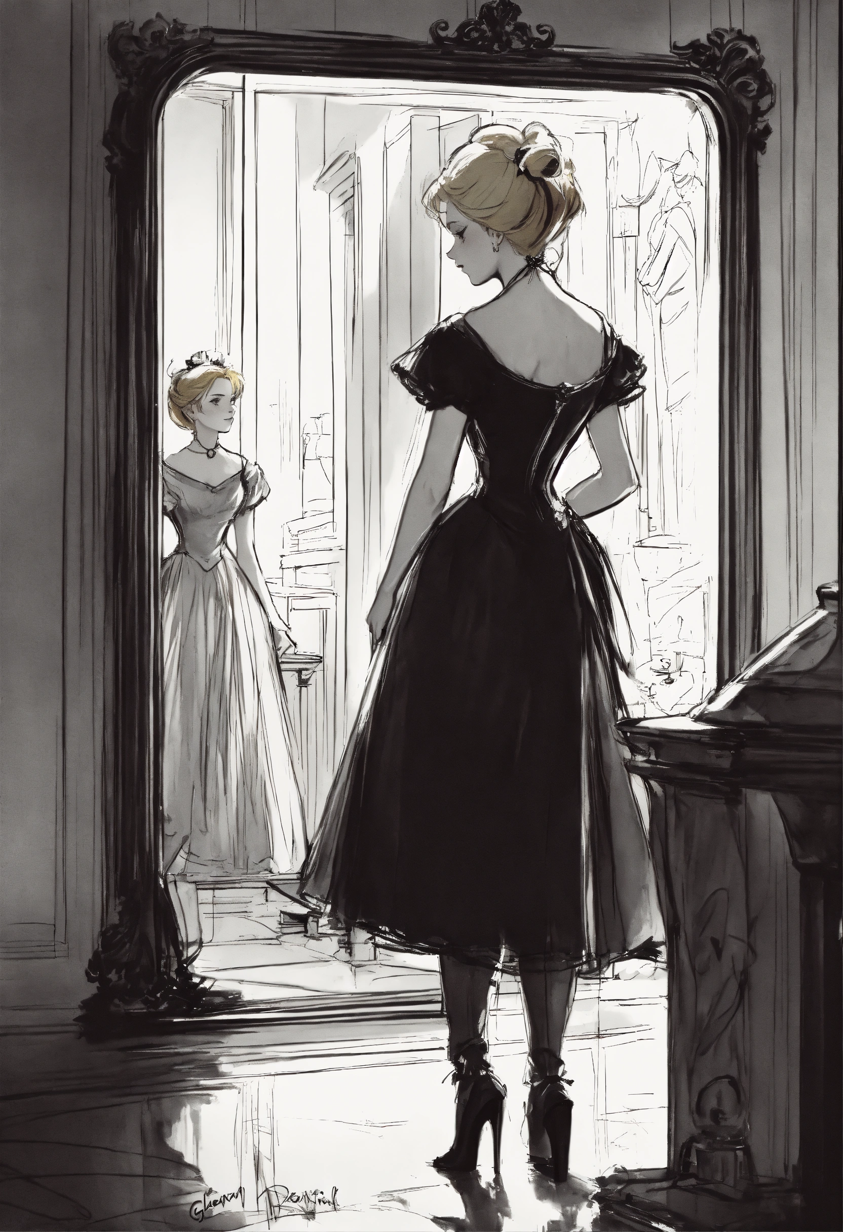 Victorian blonde crosses the mirror. black and white illustration by glen keane, concept art, artstation, disney 1990
