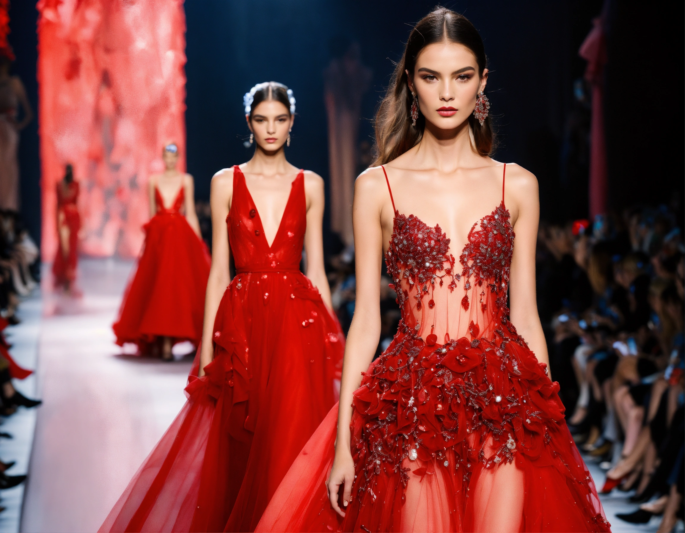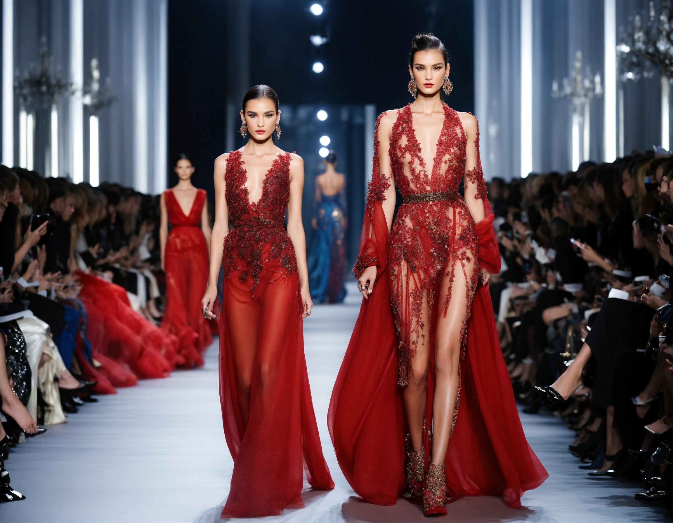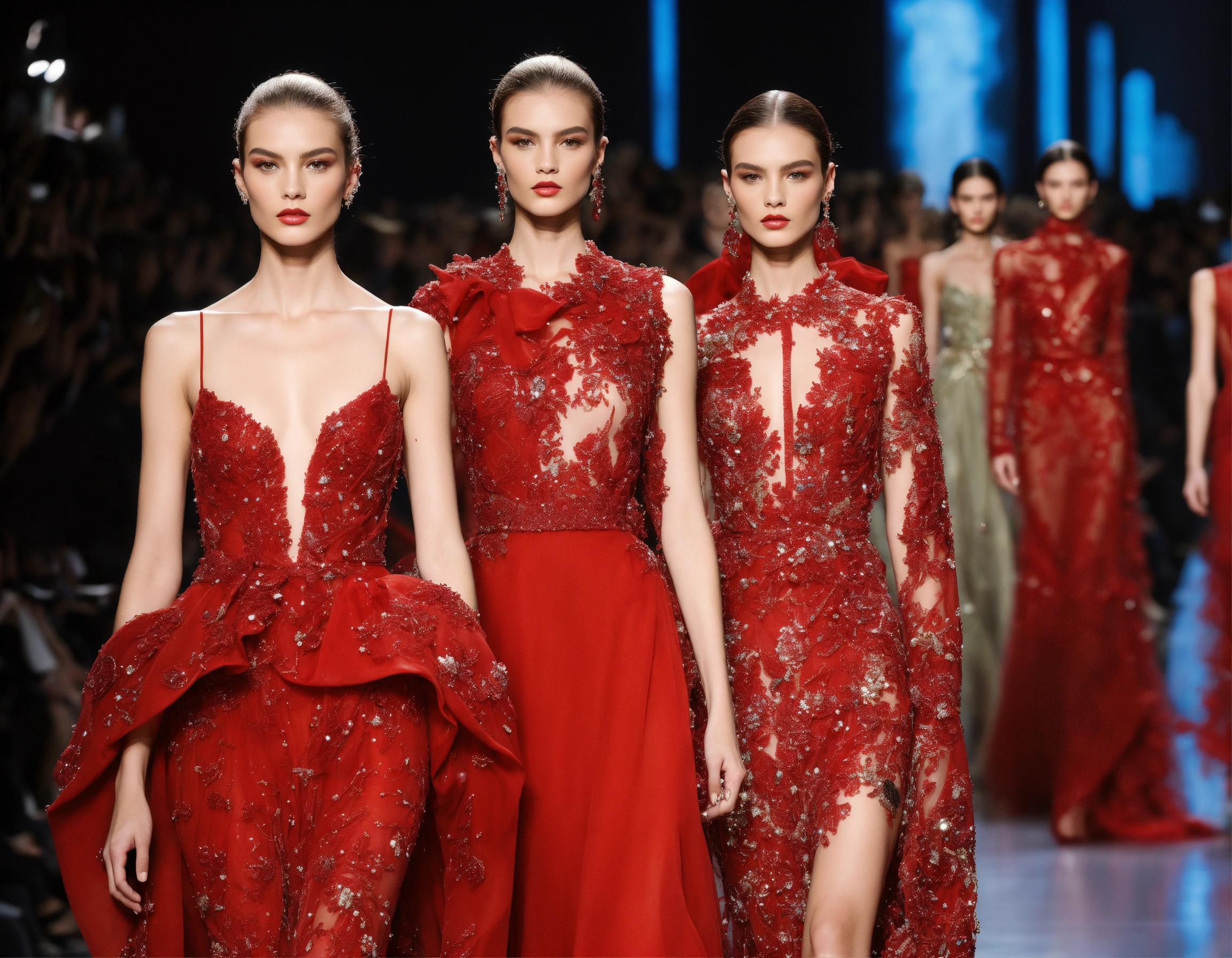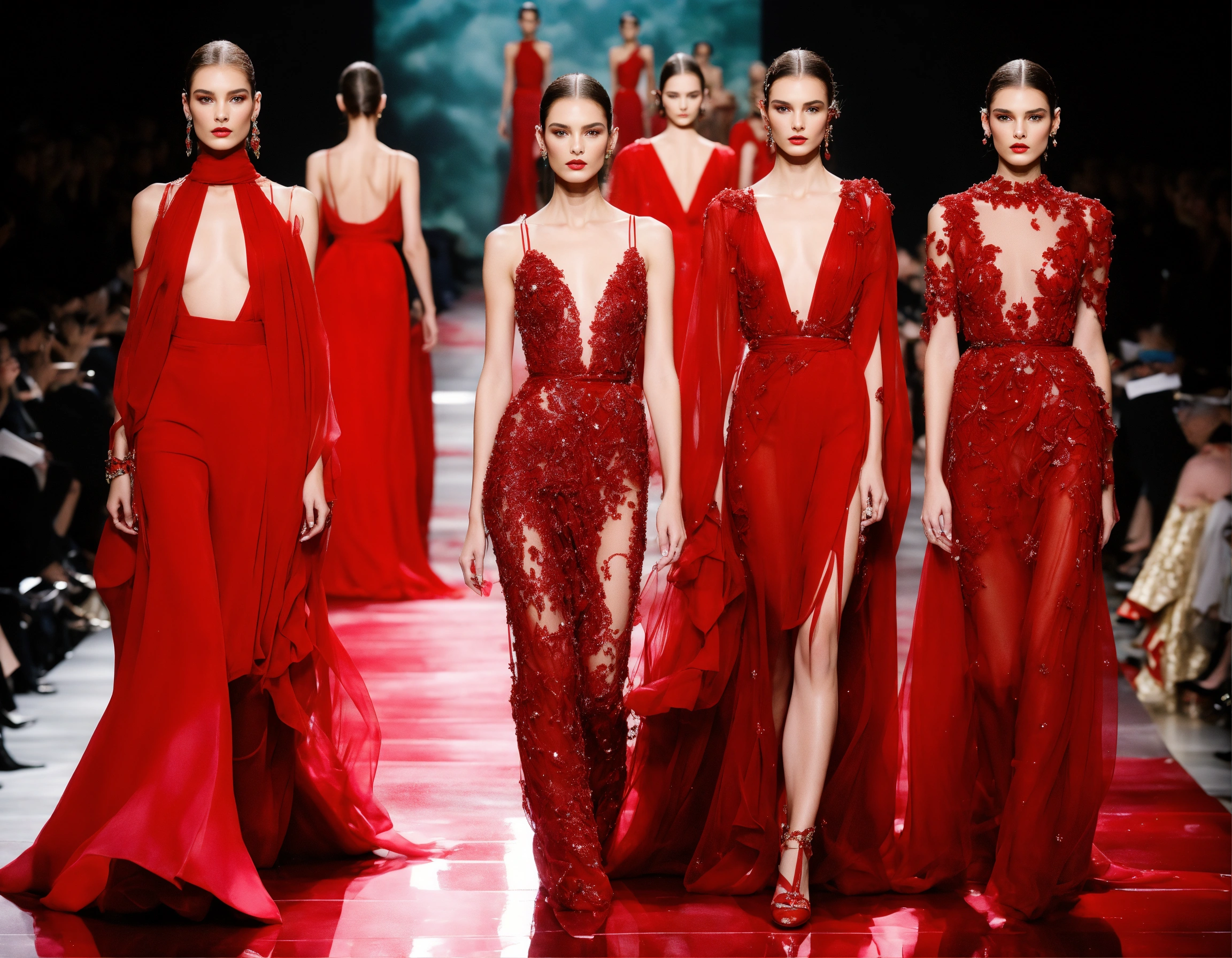 Models walking in a haute couture designer runway show, for elie saab, year is 2300, space and fashion are intertwined, we are on the brink of collapse and aliens have joined earth. these designs need to incorporate and become a sign of the times, yet dont make the garments too wildly out there, they need to be wearable couture. finest embellishments, silks, laces, beadworks, crystals, etc. expensive, luxurious. the theme of the collection is "paint the town red"