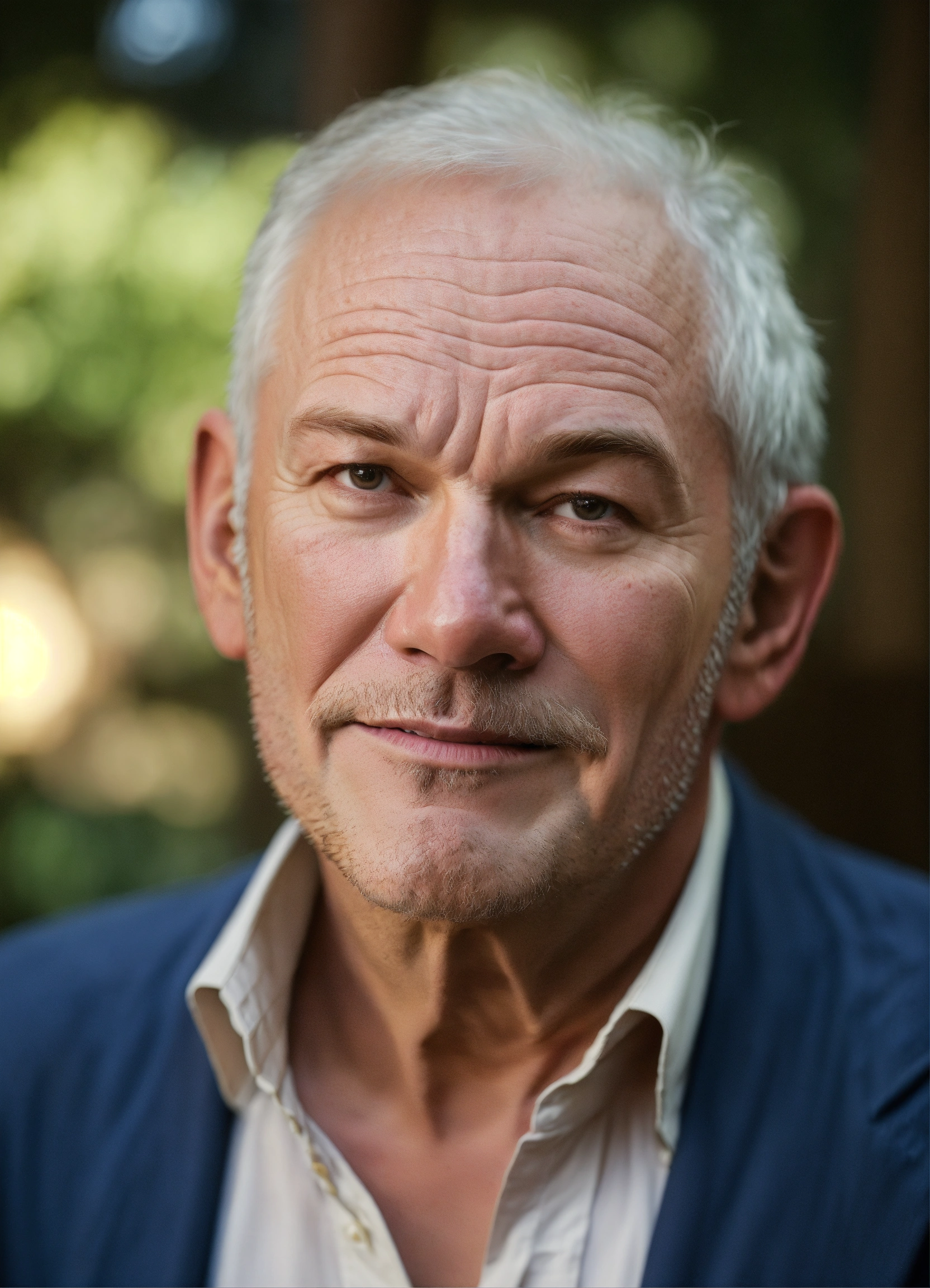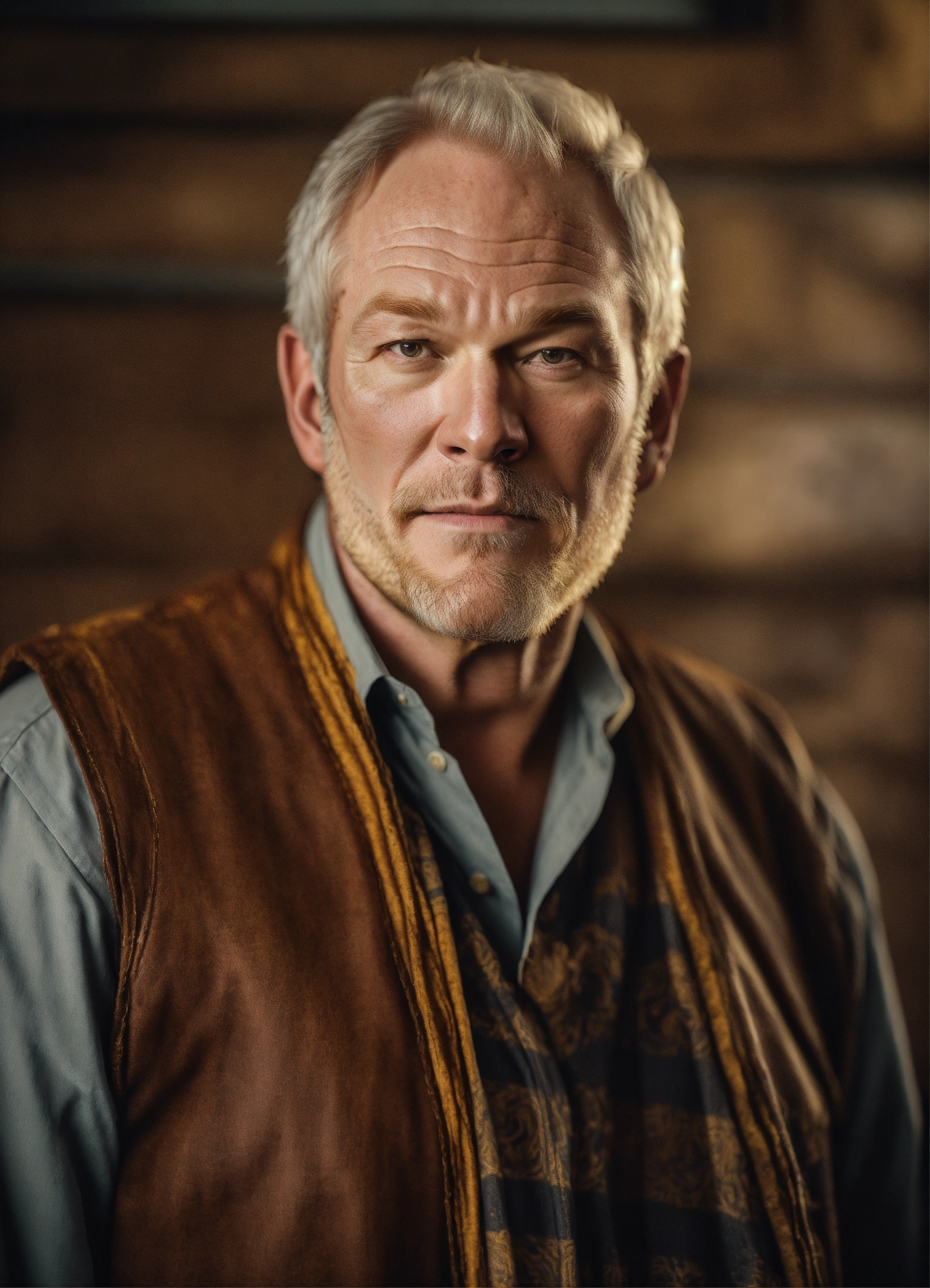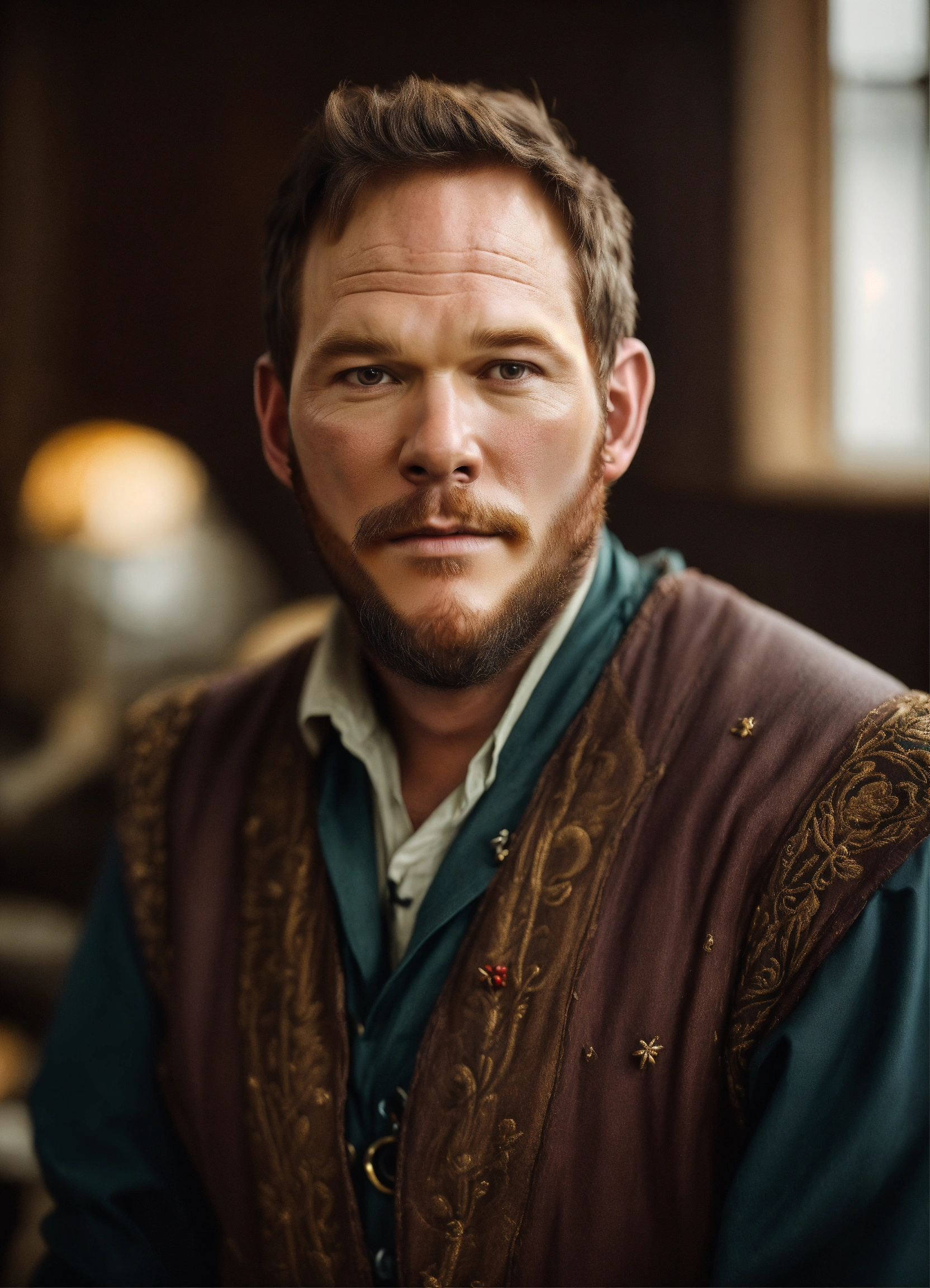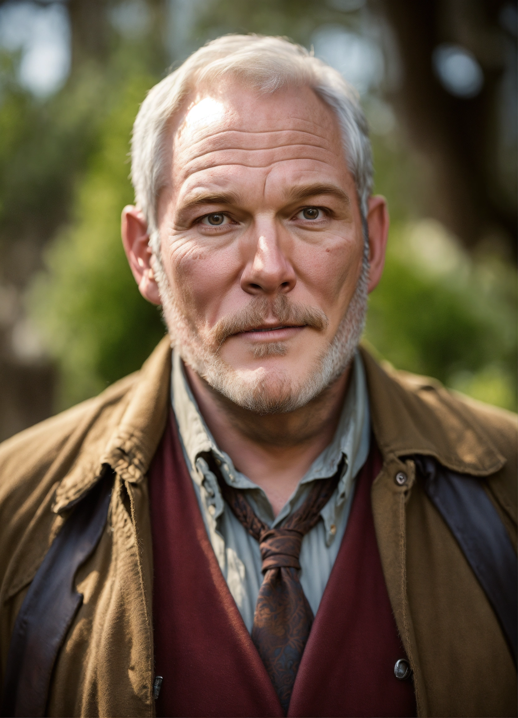 A man in his 80's who looks a bit like chris pratt, man with short hair and no beard, the man is wearing old wizard clothes portrait