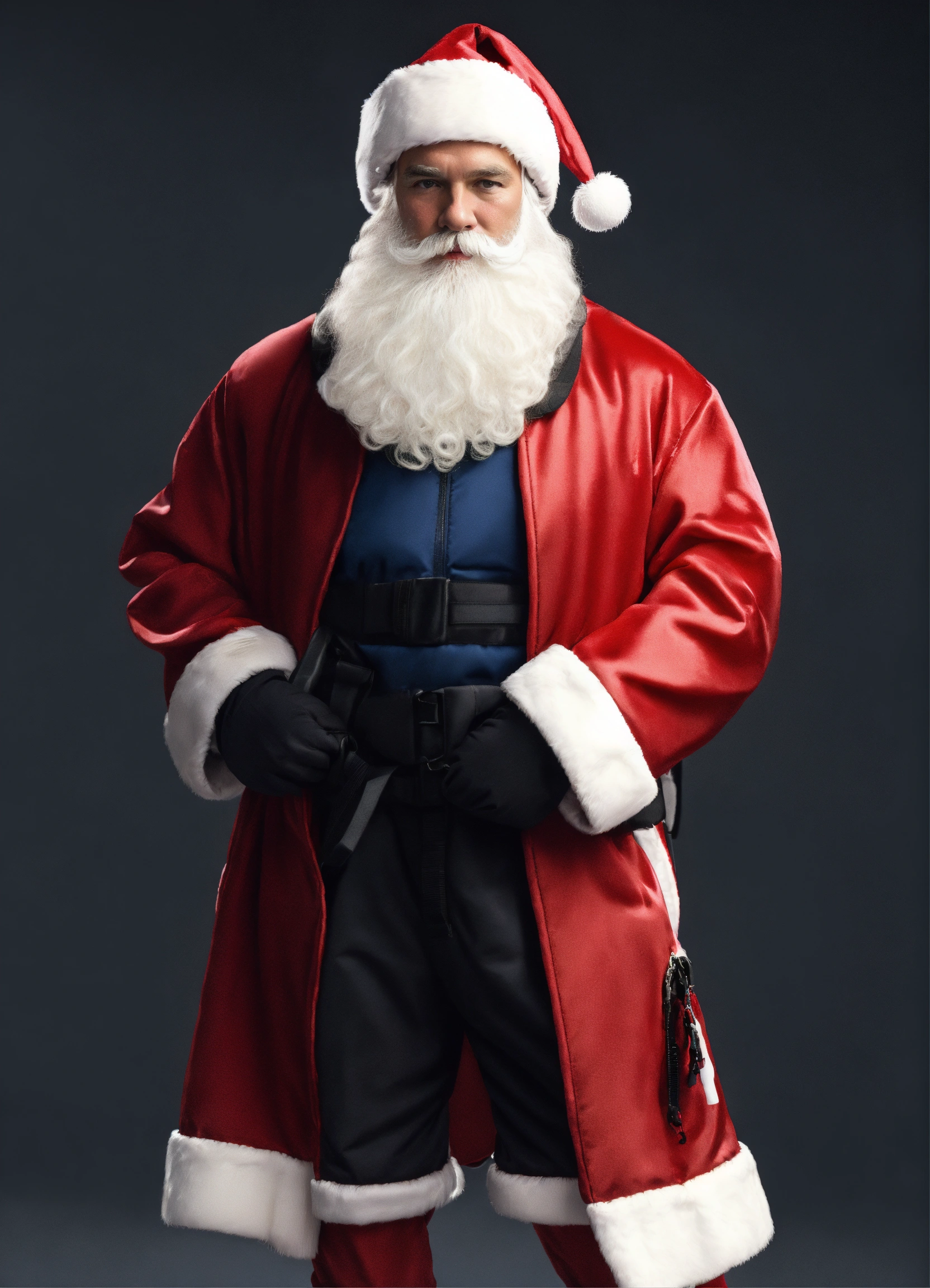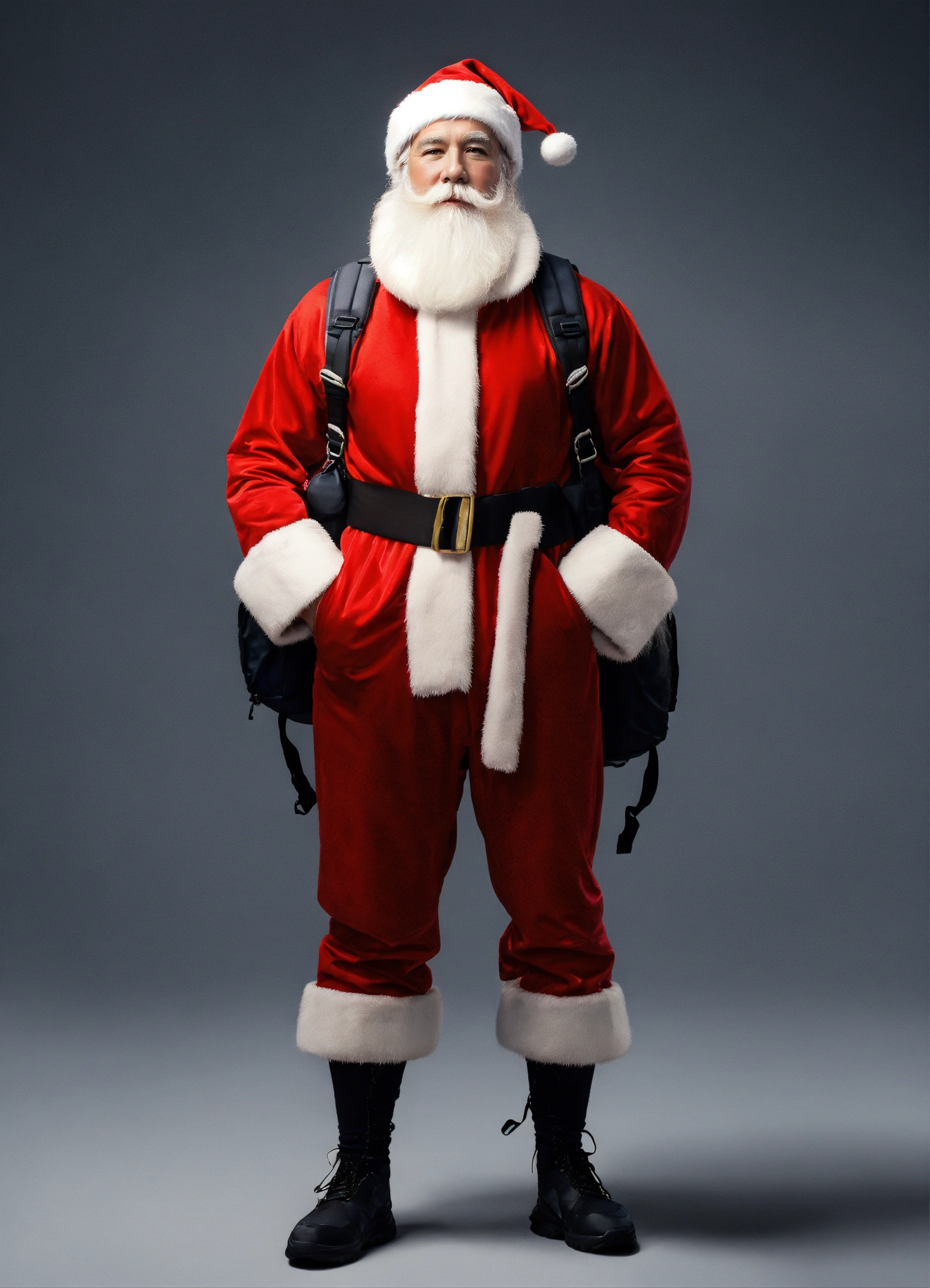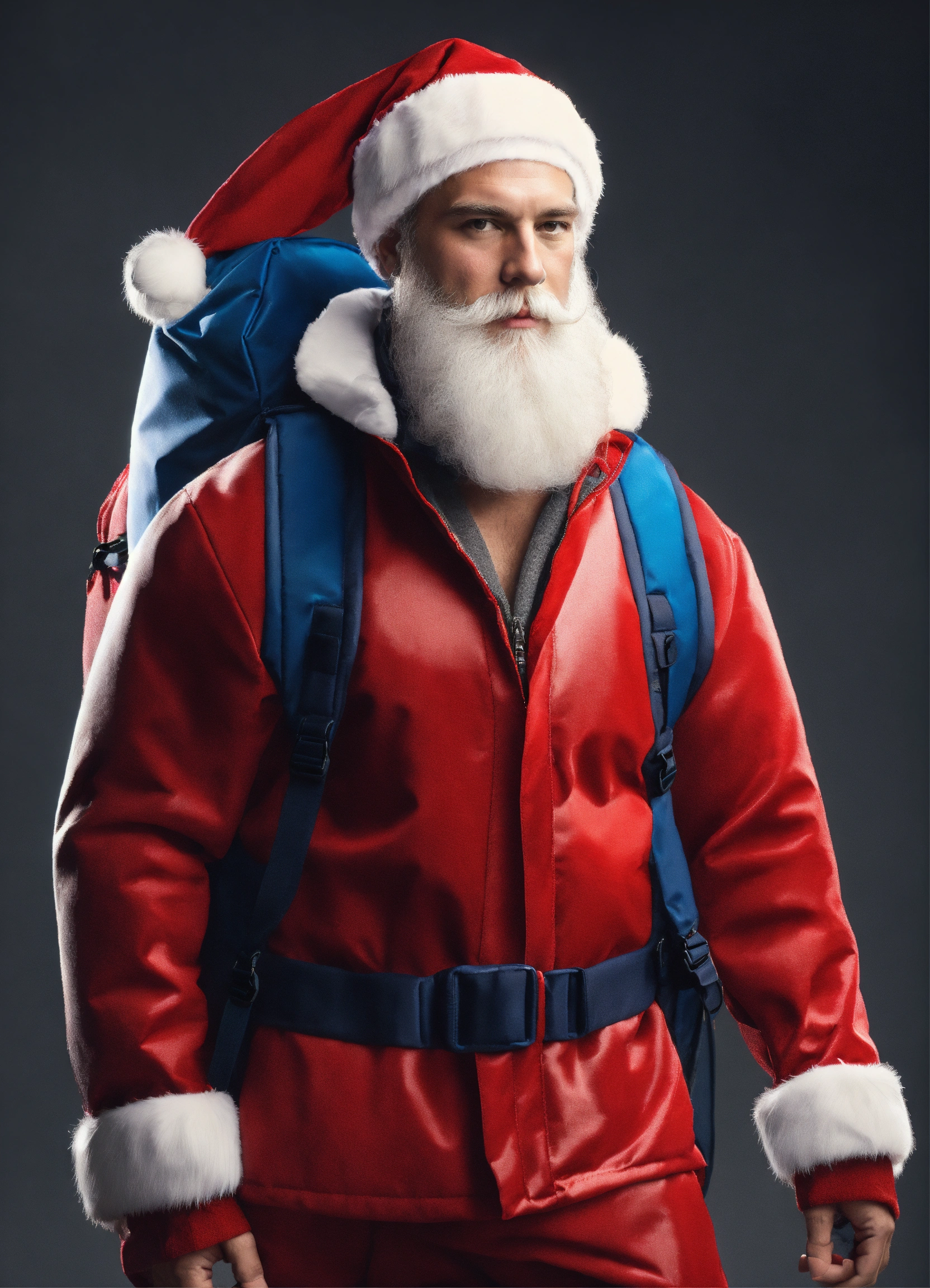 A extremely handsome modern caucasian santa claus, wearing a backpack and athletic wear, inspired by balenciaga. --v 5.0
