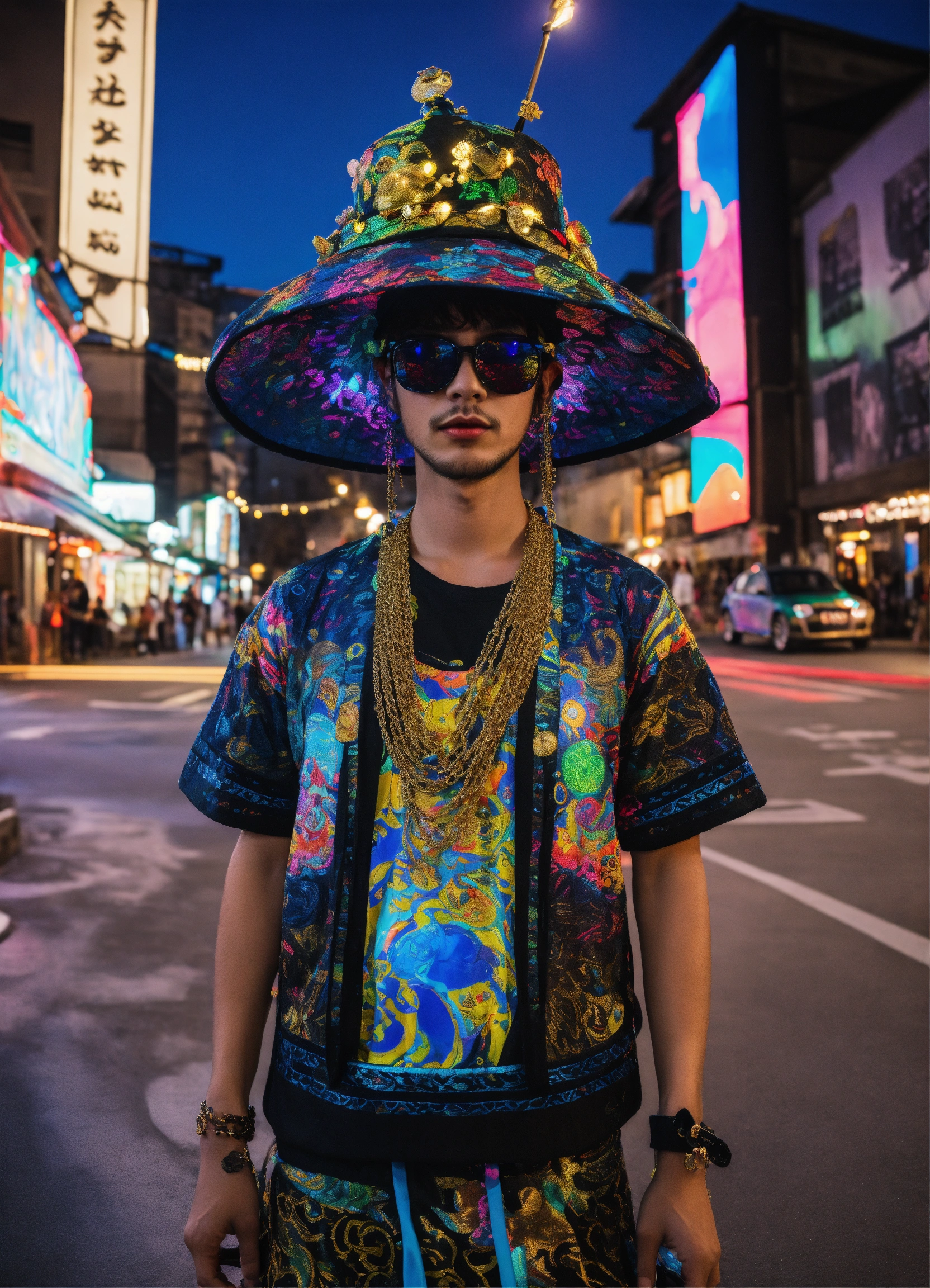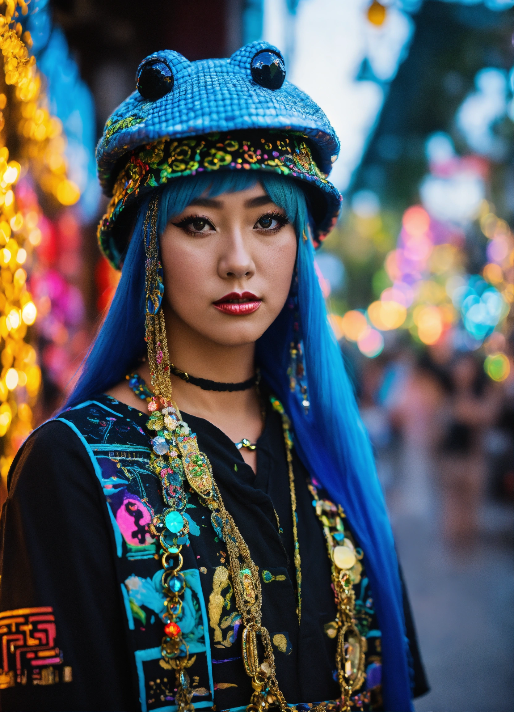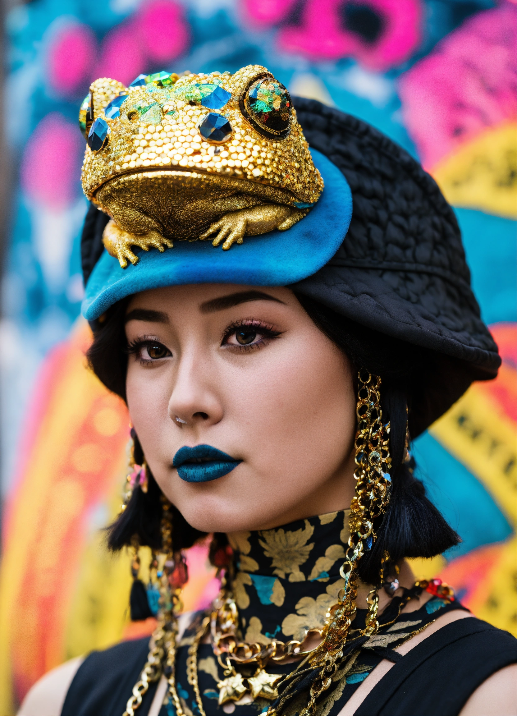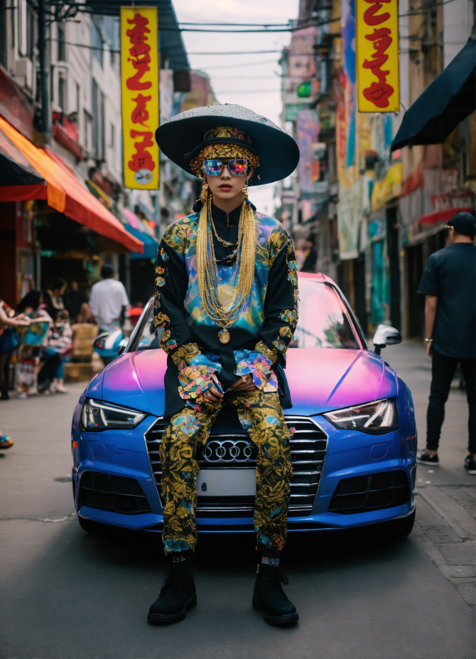 Daytime on the street, in front of an audi car, full body portrait a toad made out of a 3d black and sapphire crystal cloud psychedelic patterned light neon optical illusion, festival raver street wear, kawaii hat with crystal hemp gold black chains, ninja qr code samurai in folk costume in a fashion magazine