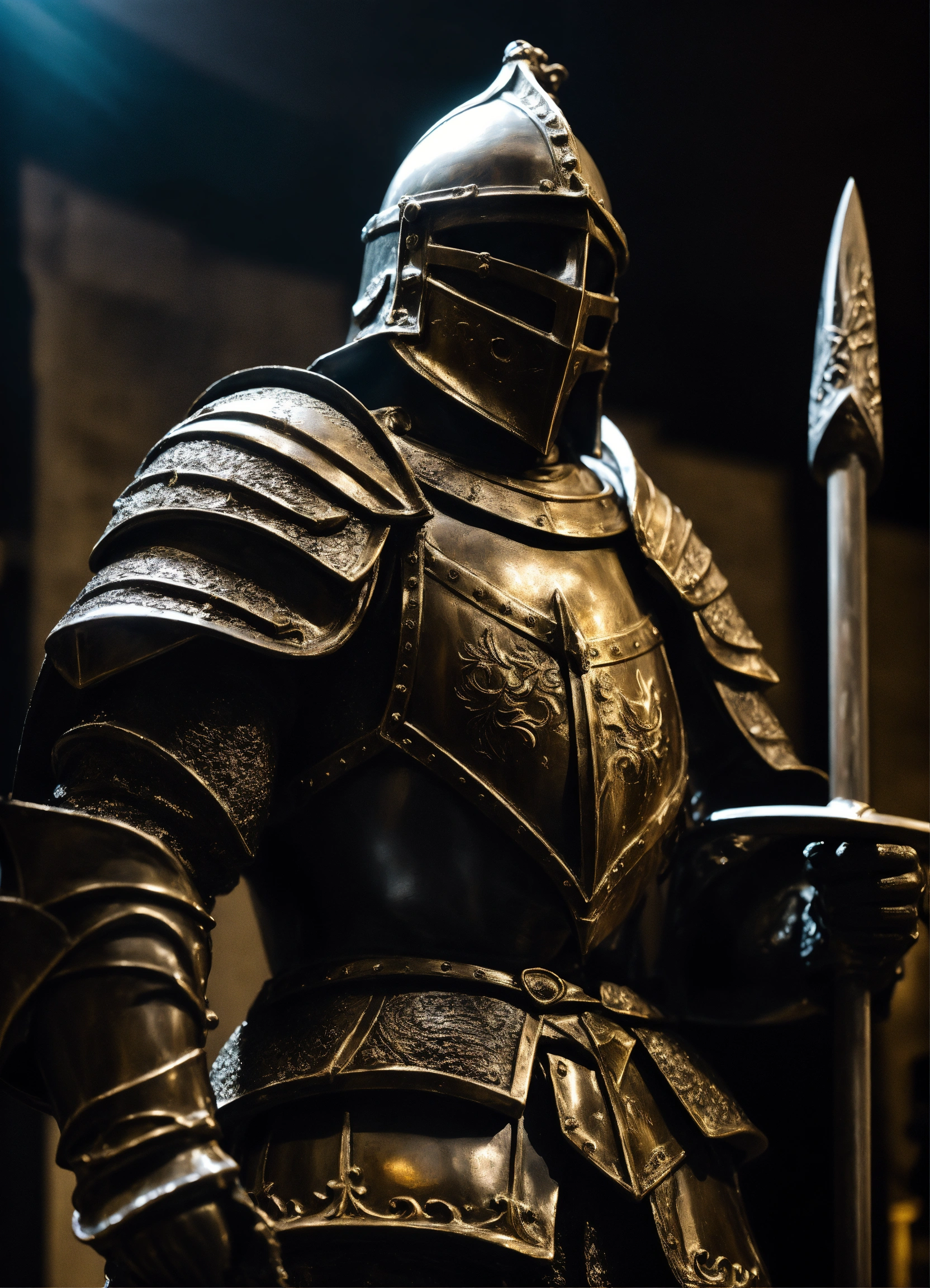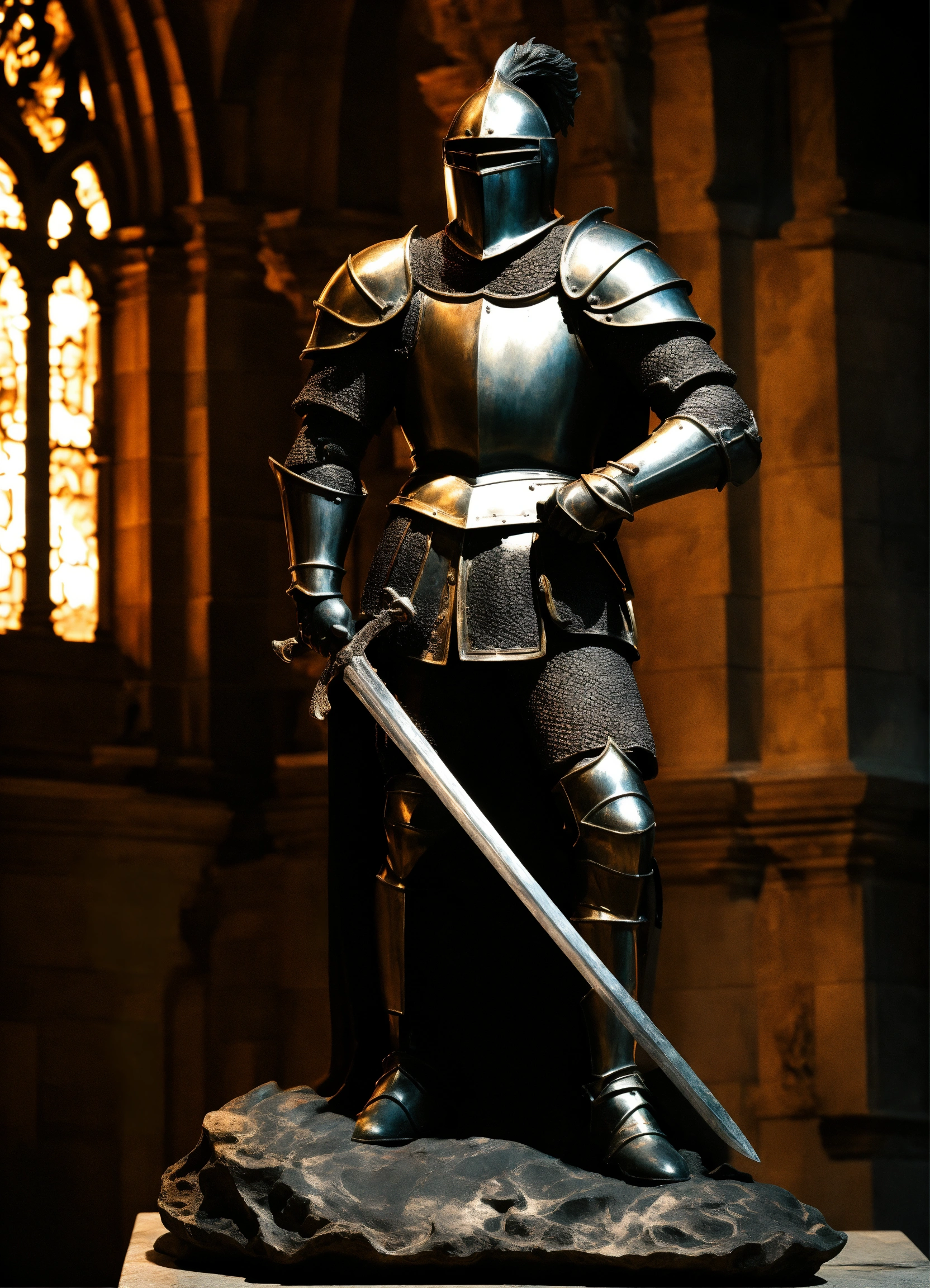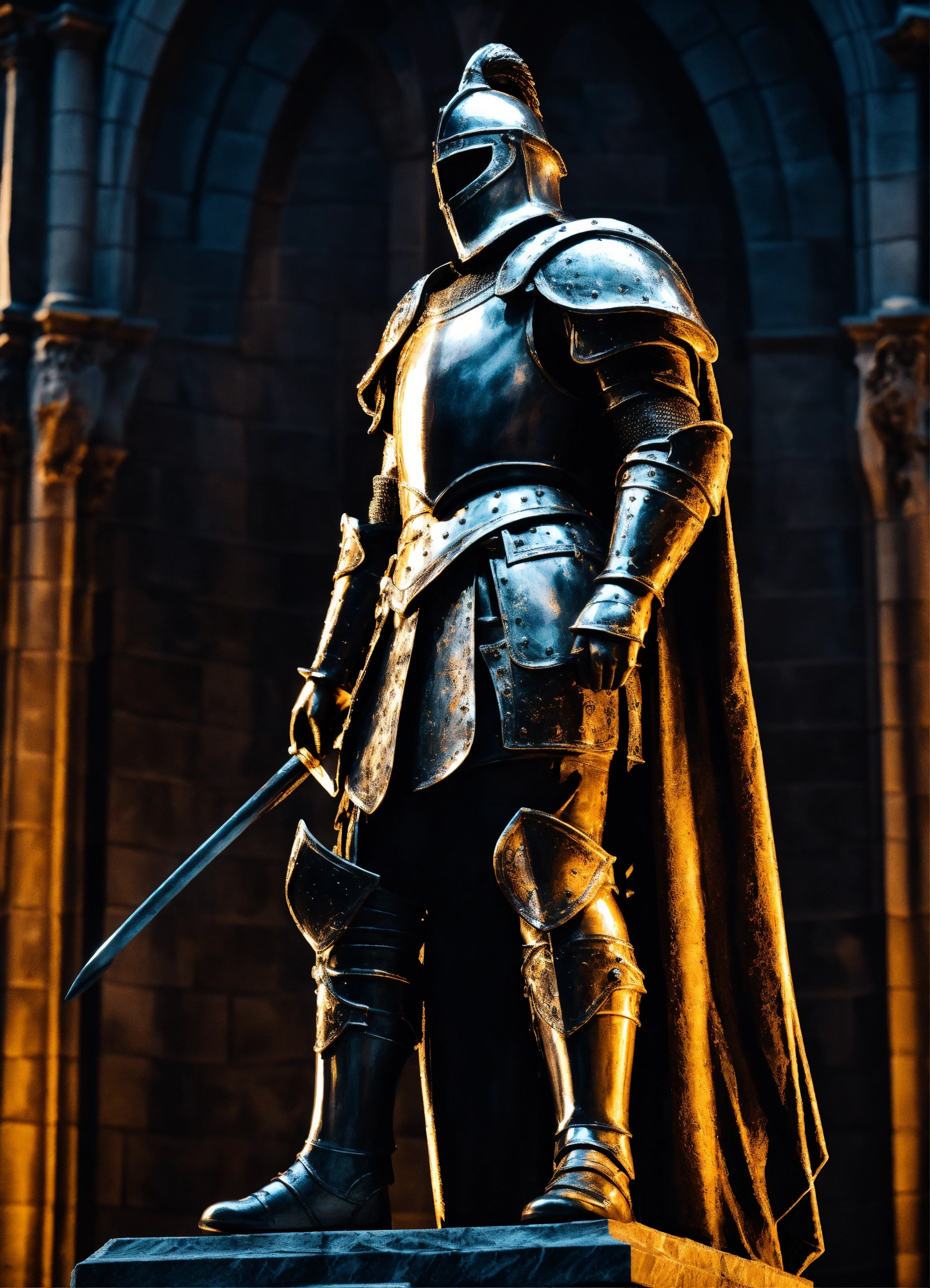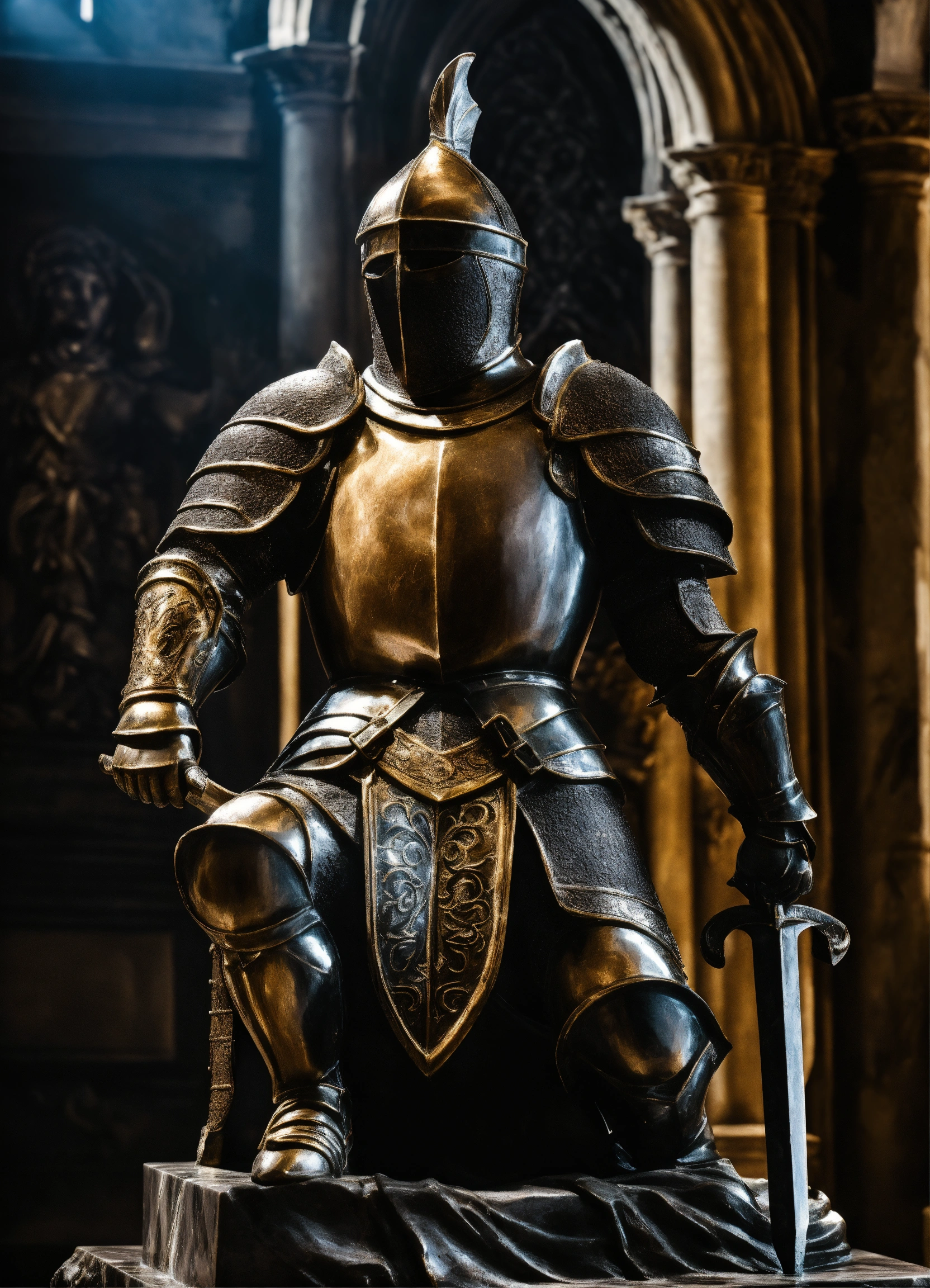 A muscular medieval knight statue set against a background of deep black tones, with dramatic interplay of light and shadow, accentuating the knight's sculpted physique and features, creating an atmosphere of serenity and tranquility. sculpture, marble with strategic spotlighting to enhance contrast, monument background.