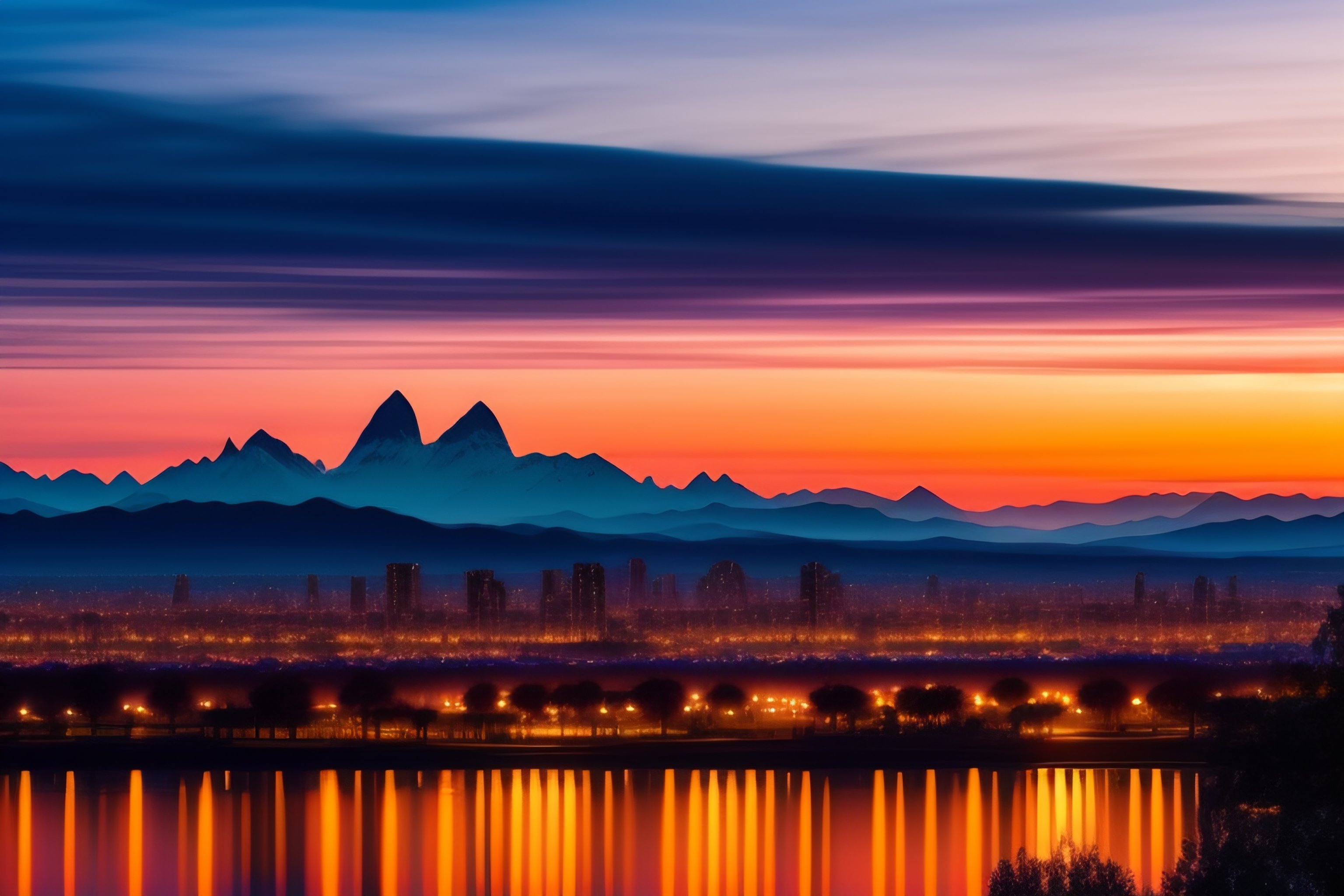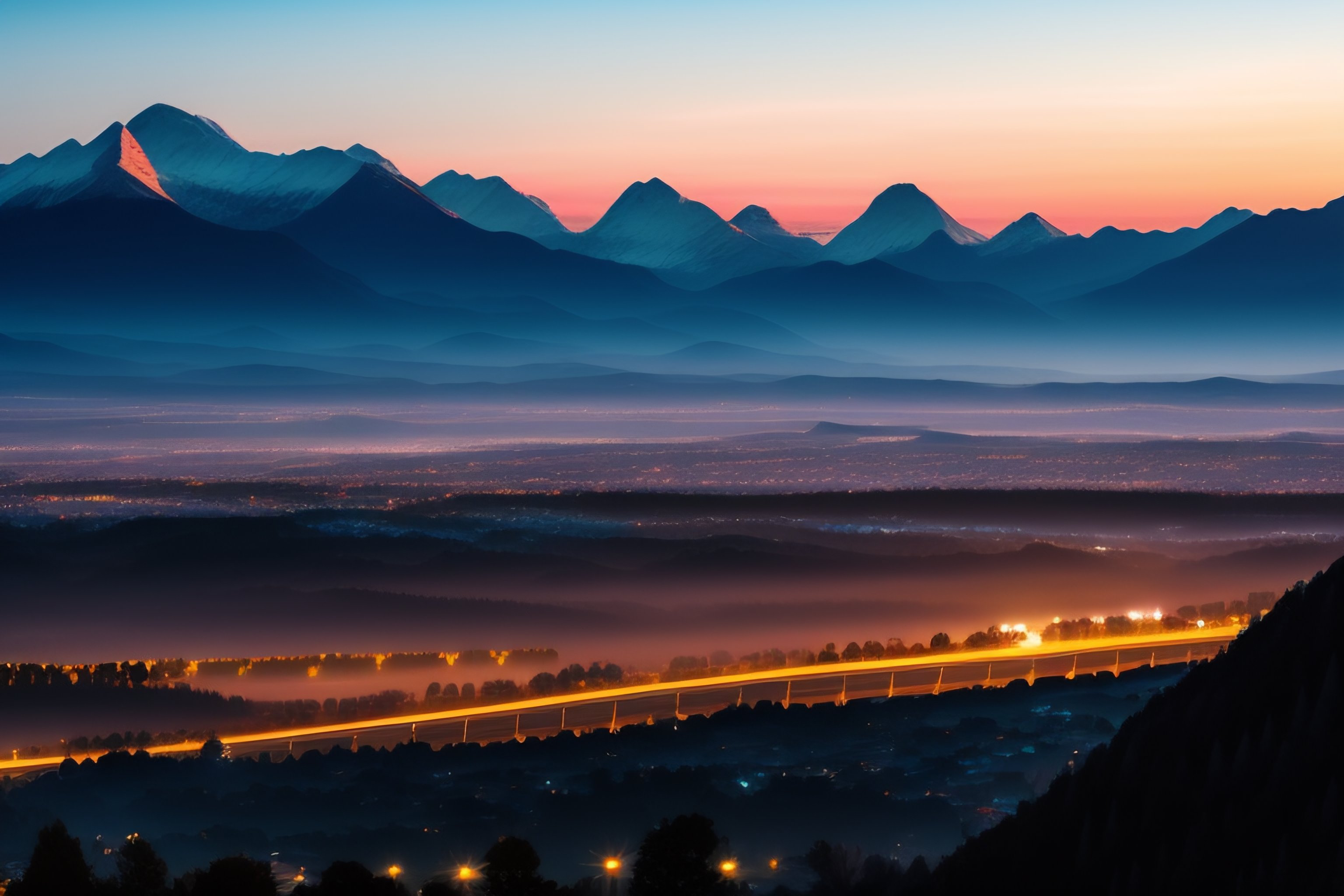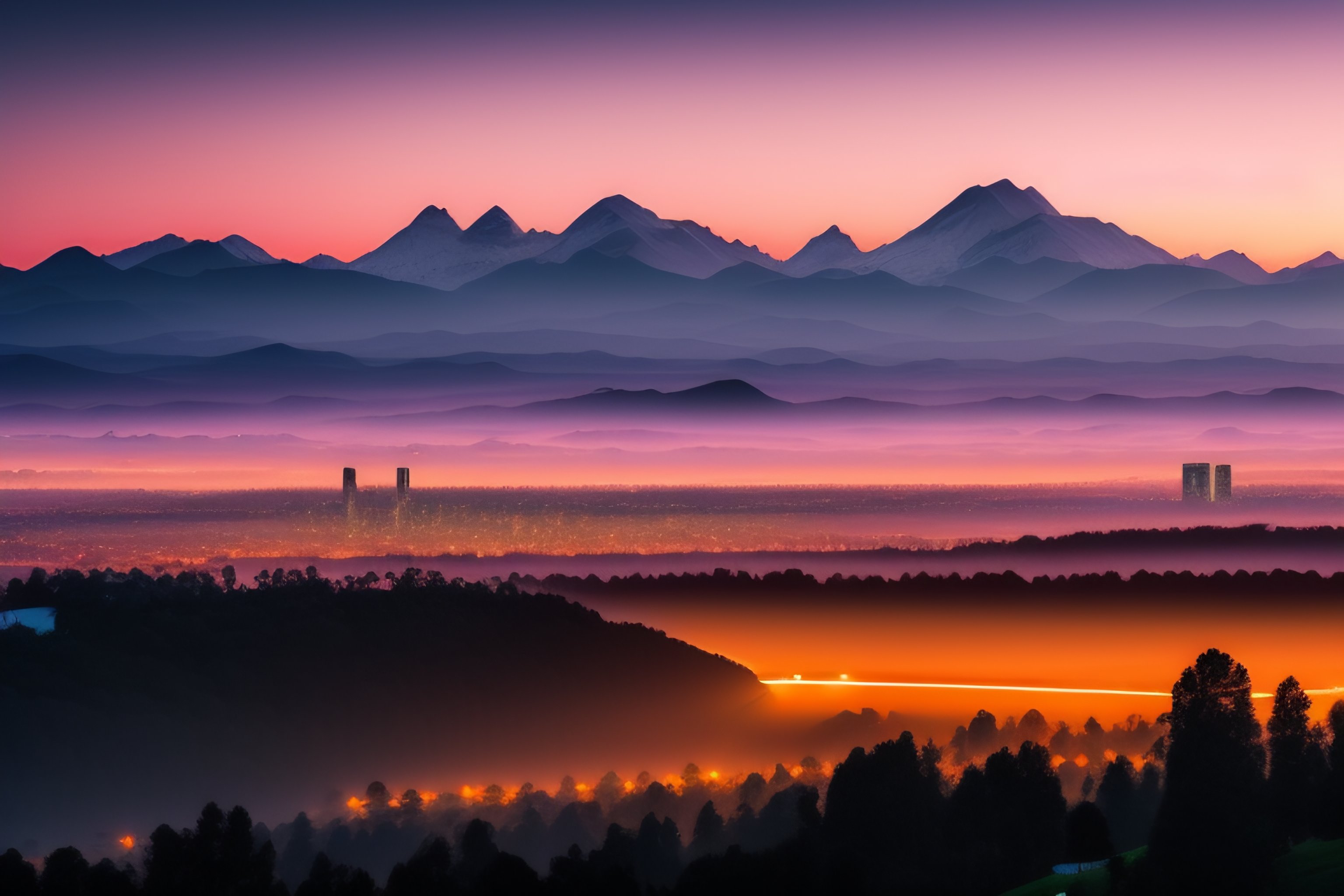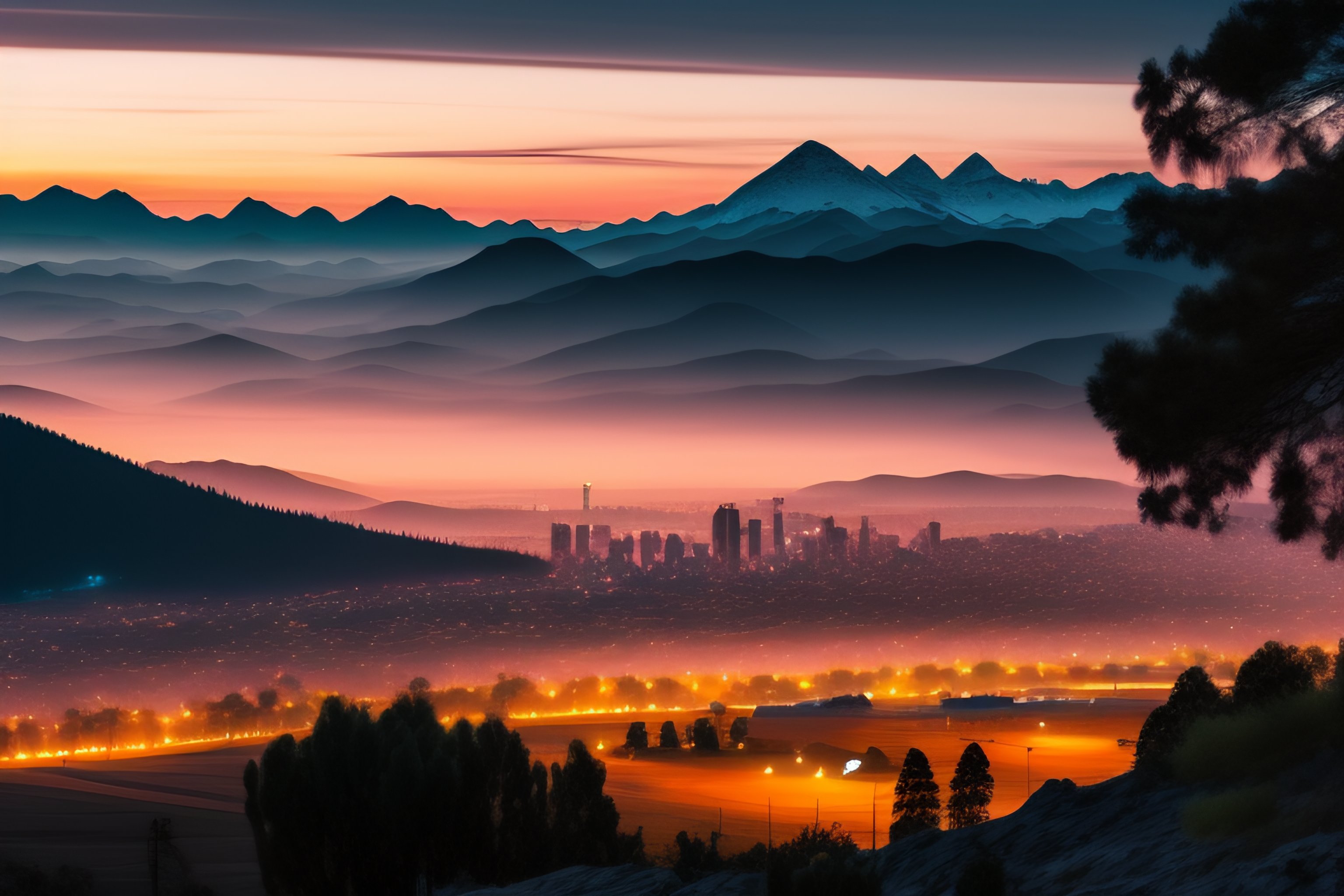 A view of a city in the distance with mountains around at dawn