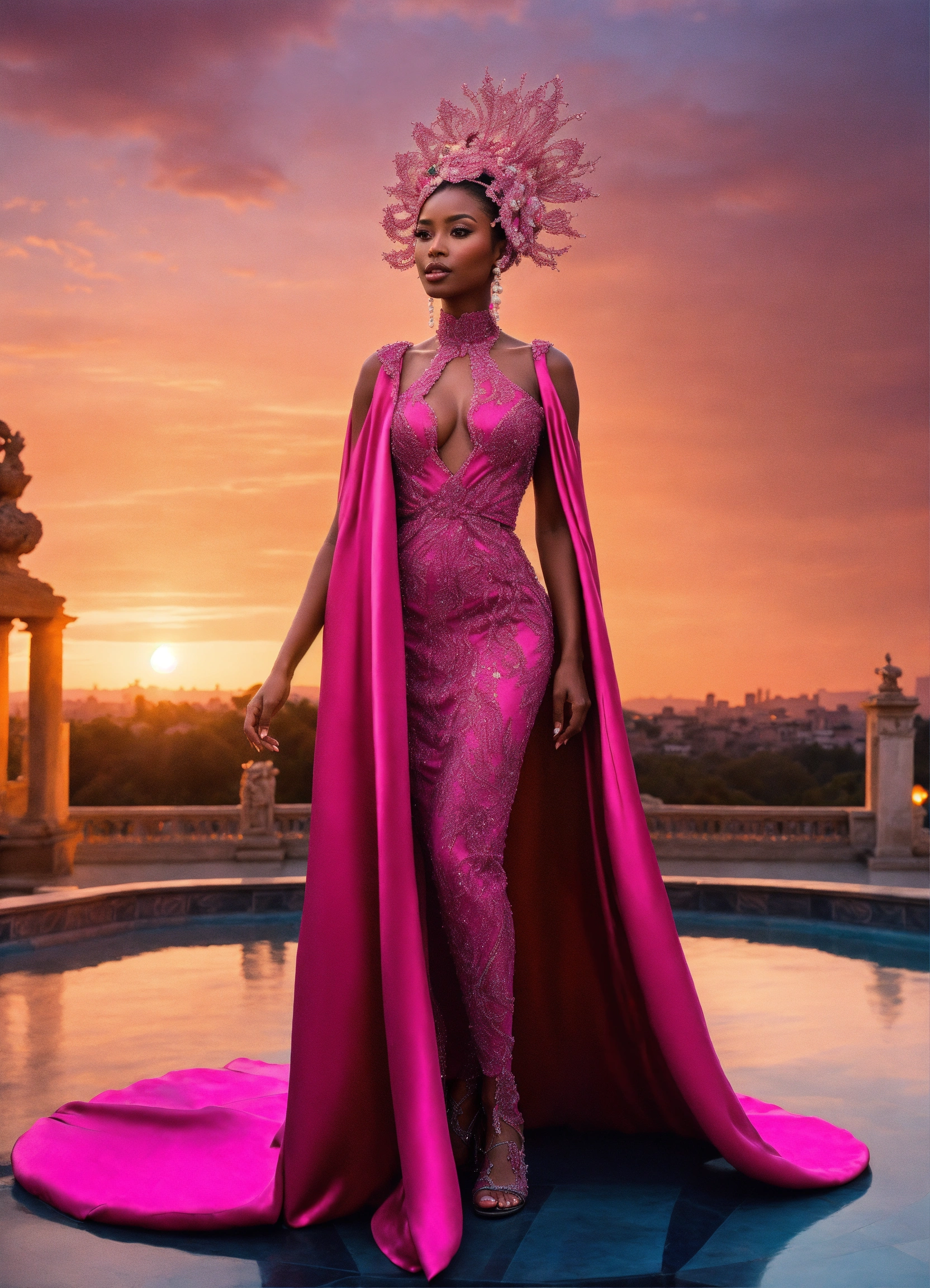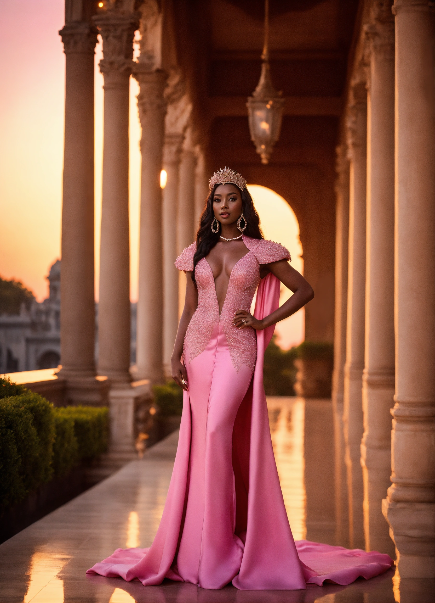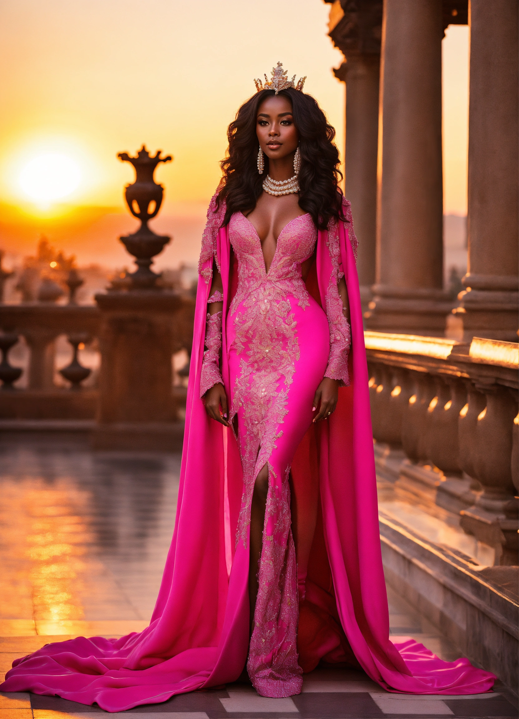 Alien queen, dark skin, long dark hair. pearl-embellished head-peice, wide hips. dressed in pink haute couture dress and robe, open toe heels, standing on a sumptuous palace terrace at sunset. outgoing persona.