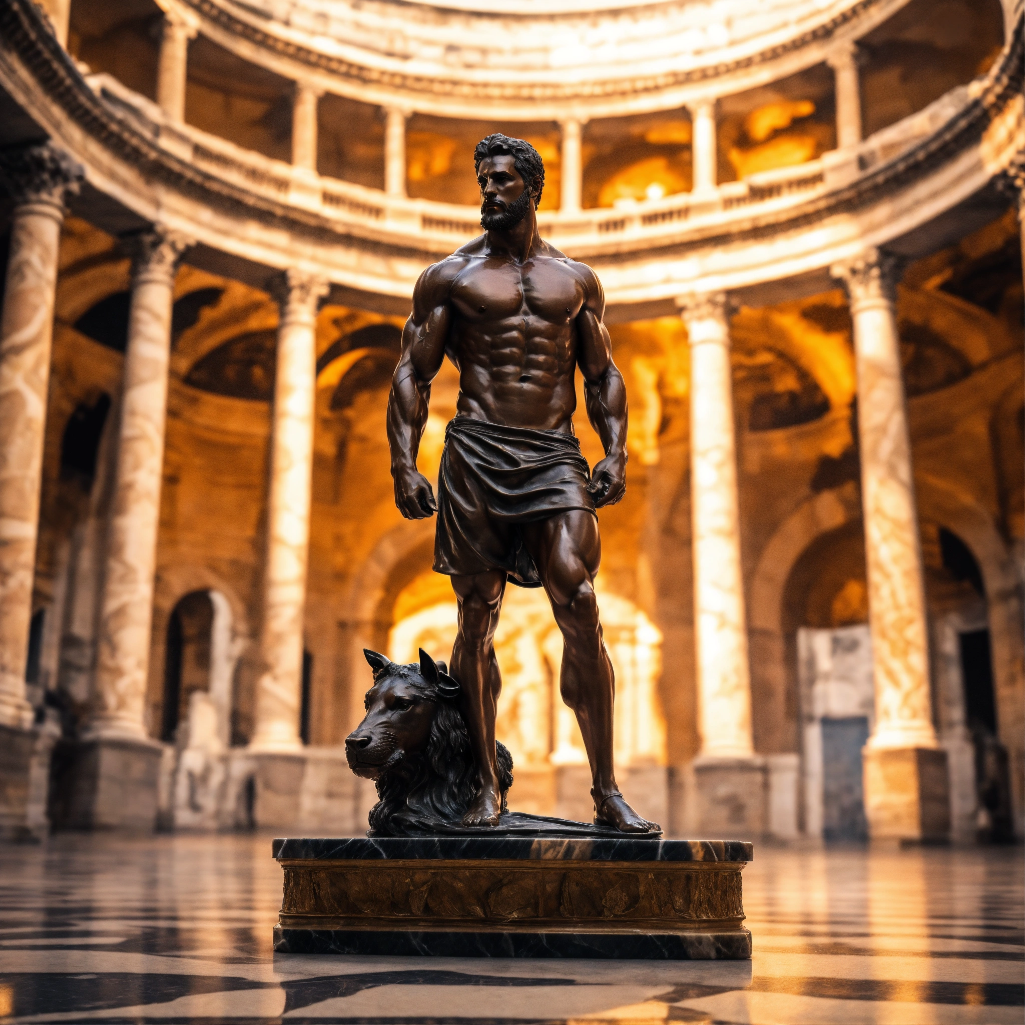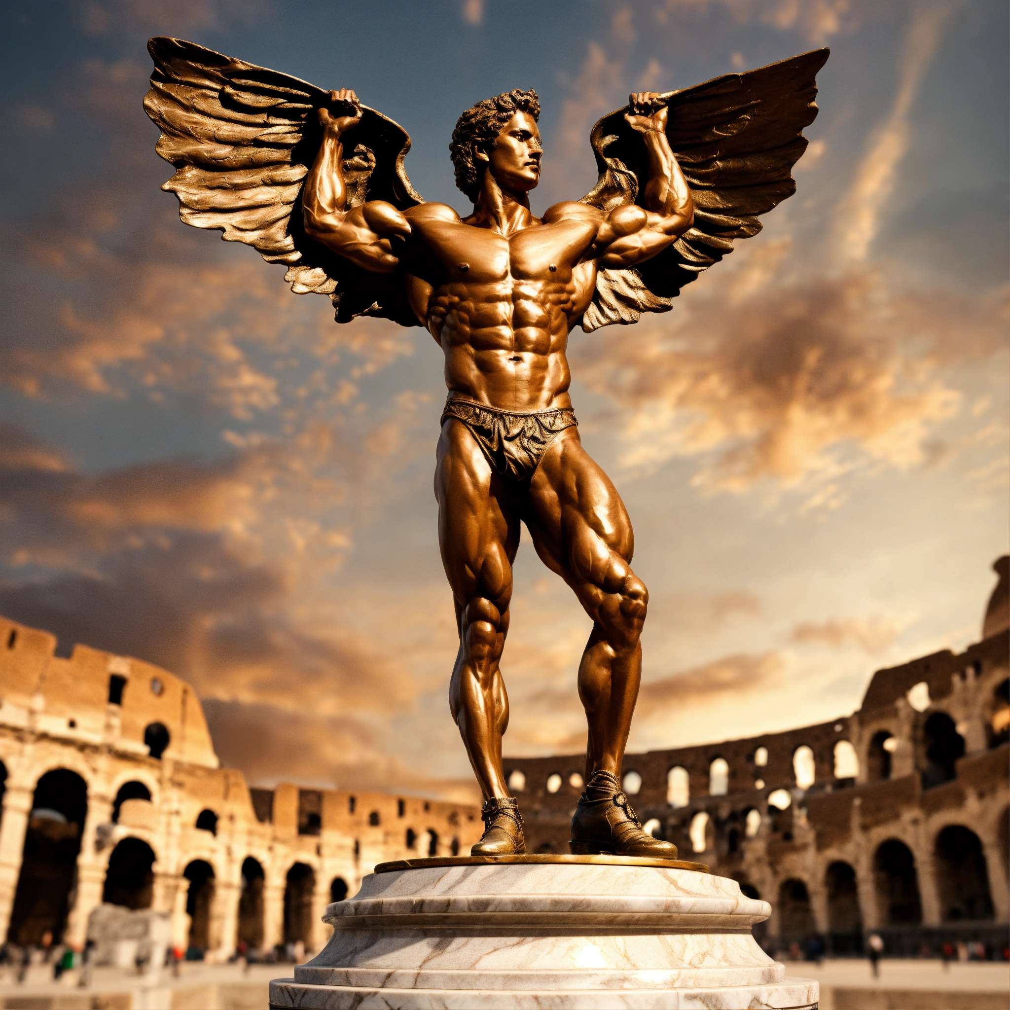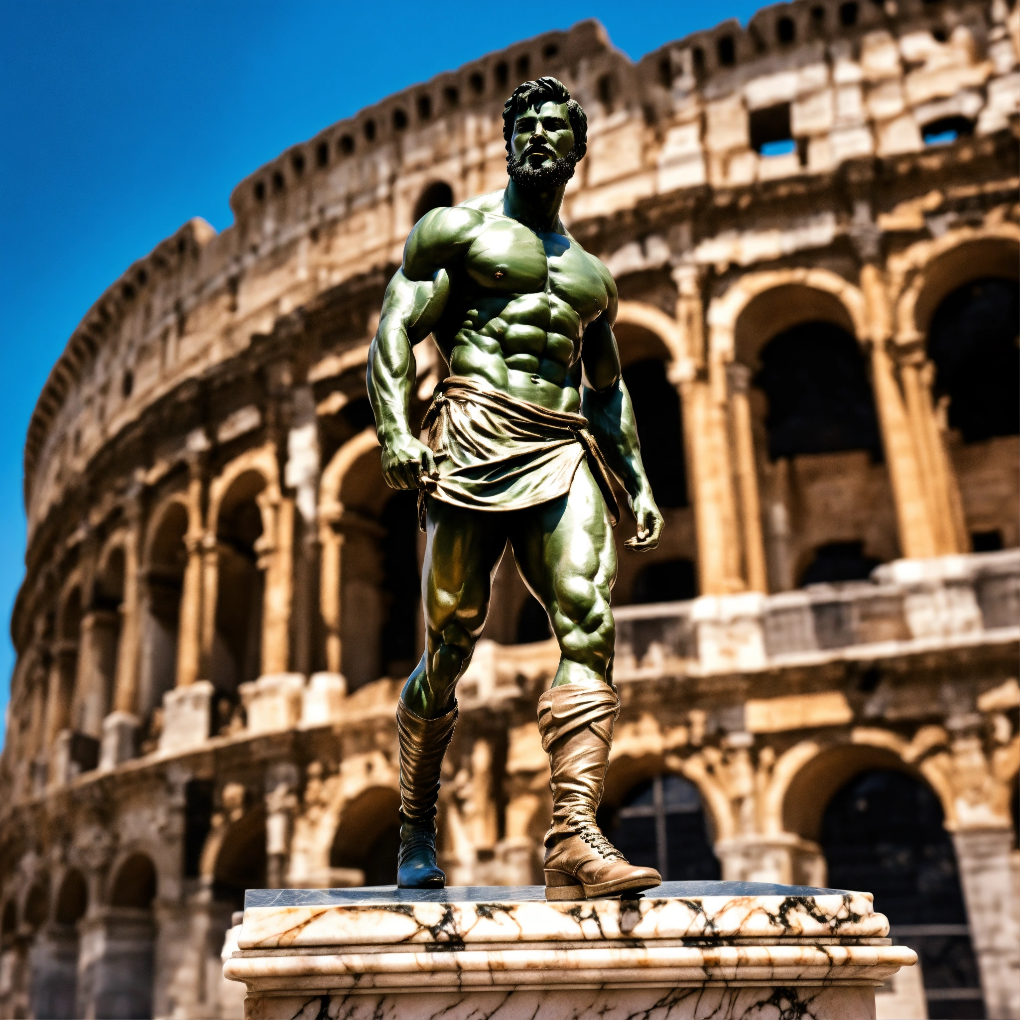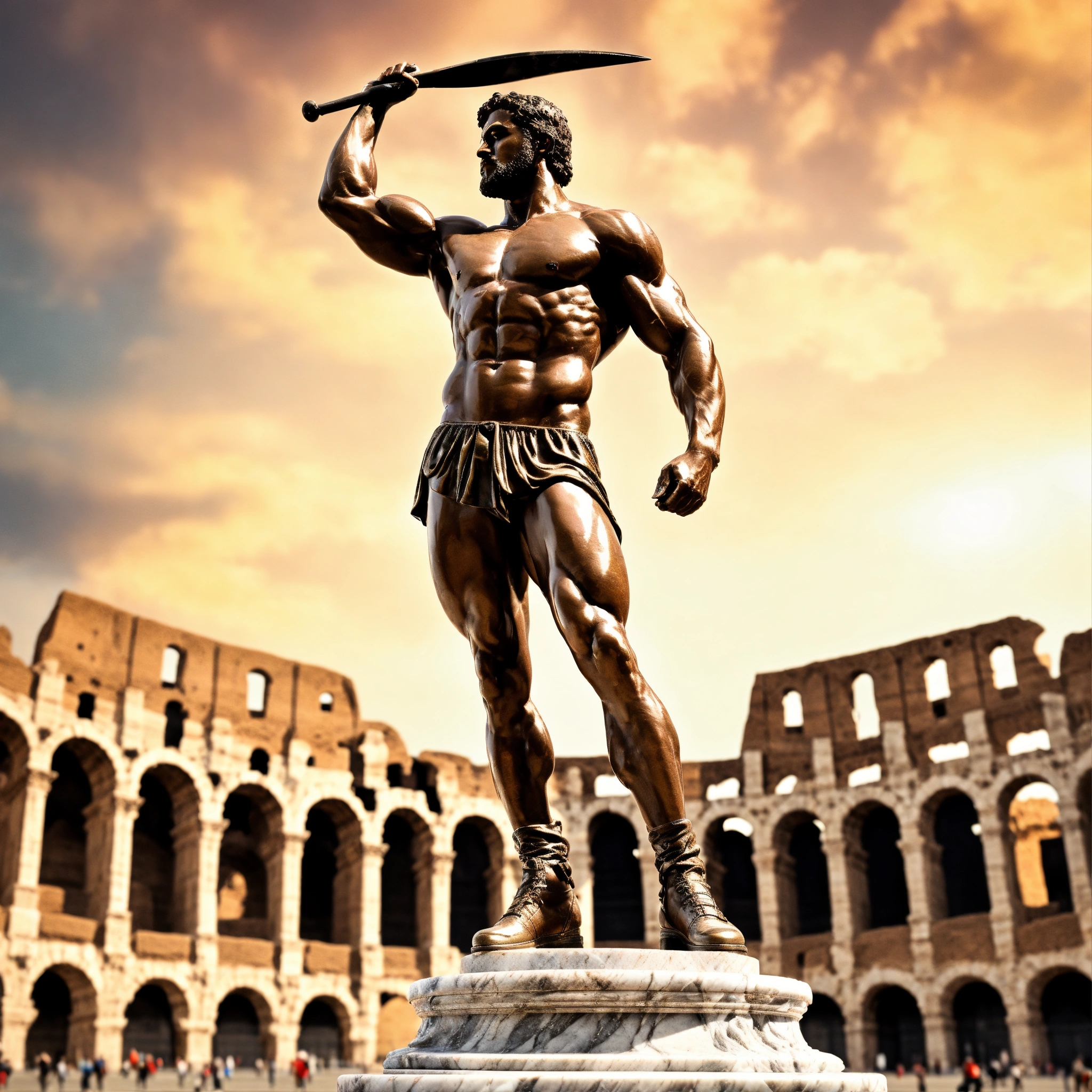 Sculpture full body muscular em bronze on top of a marble base ultra realistic ultra definition 32k photography type, in the background the coliseum