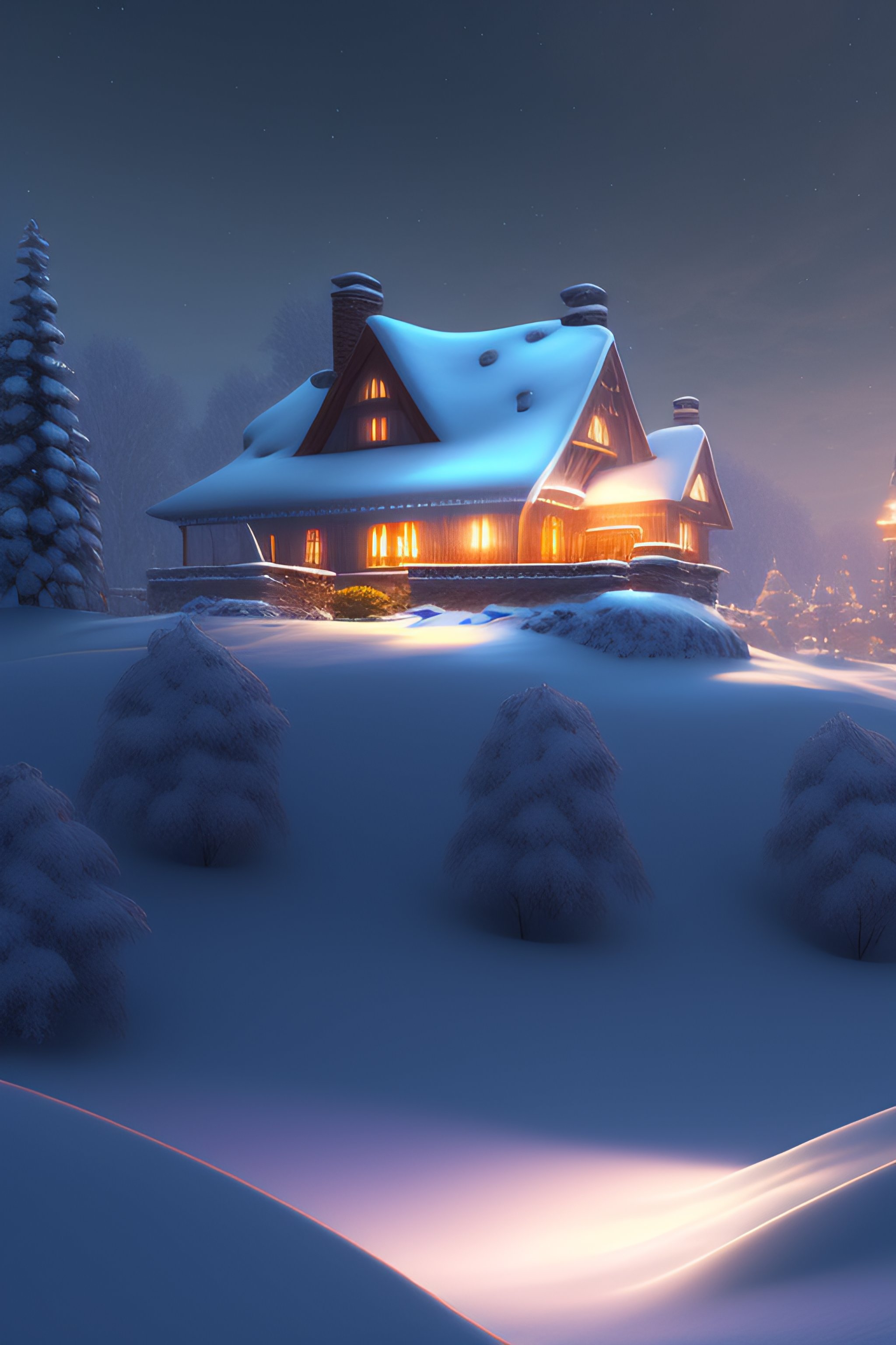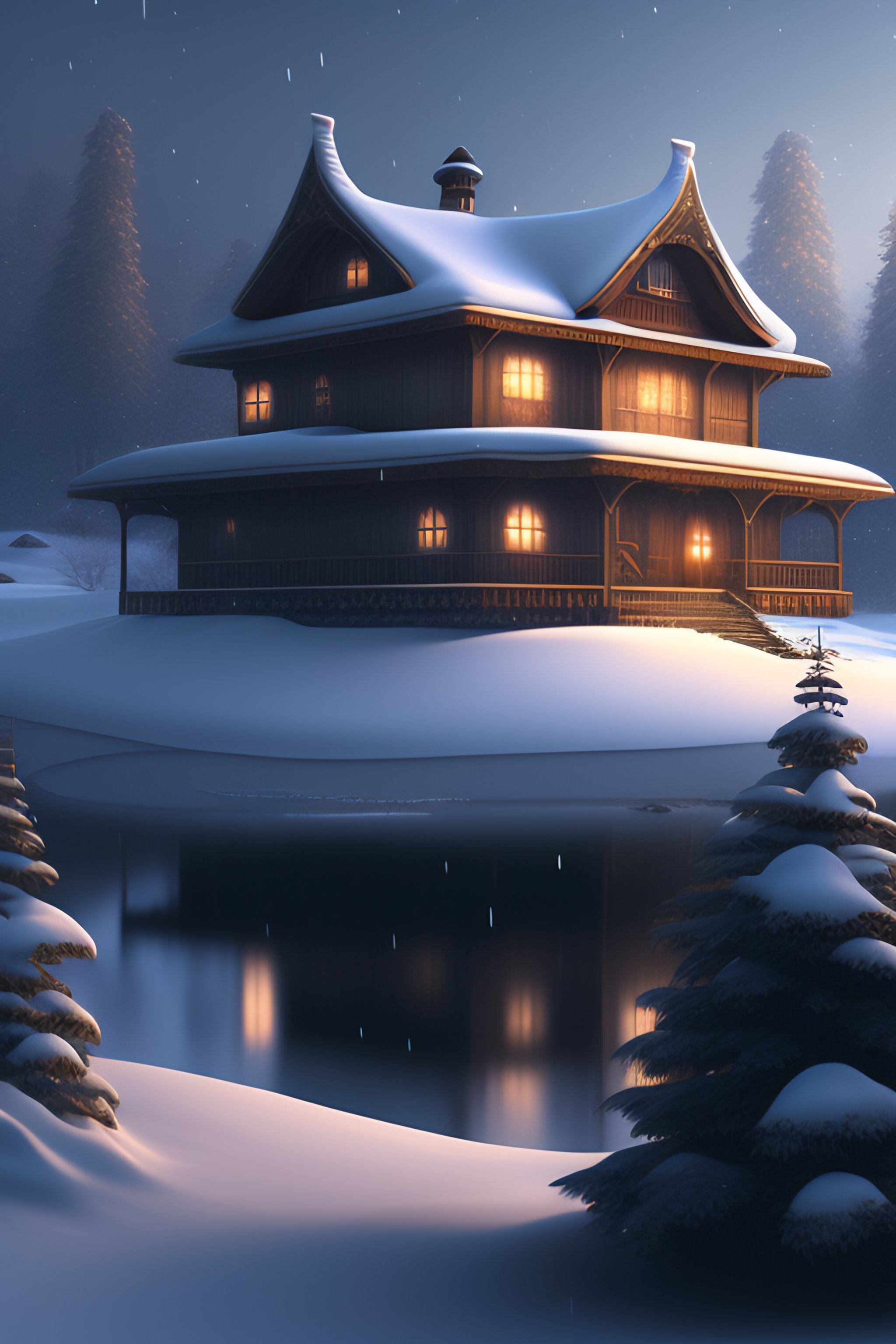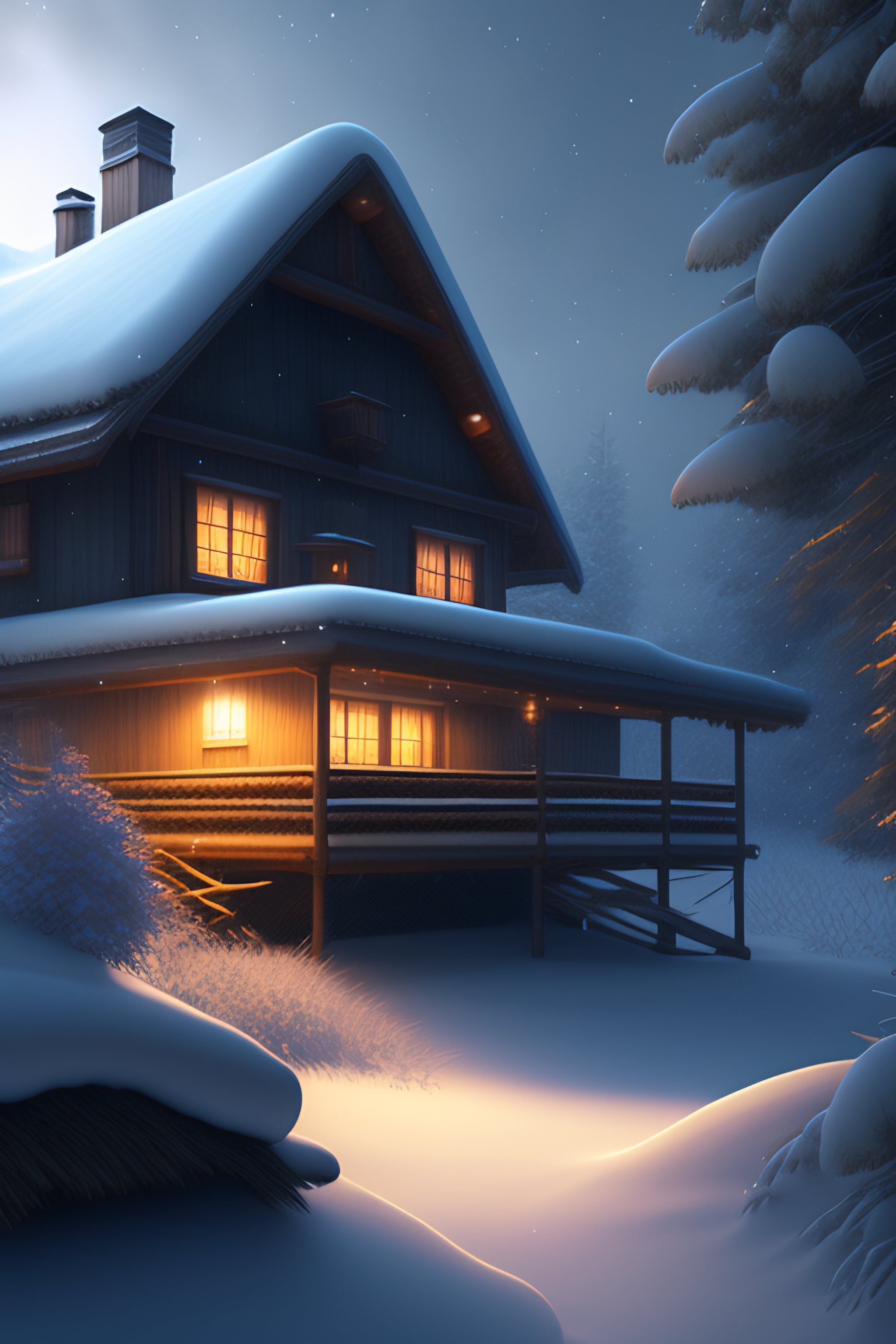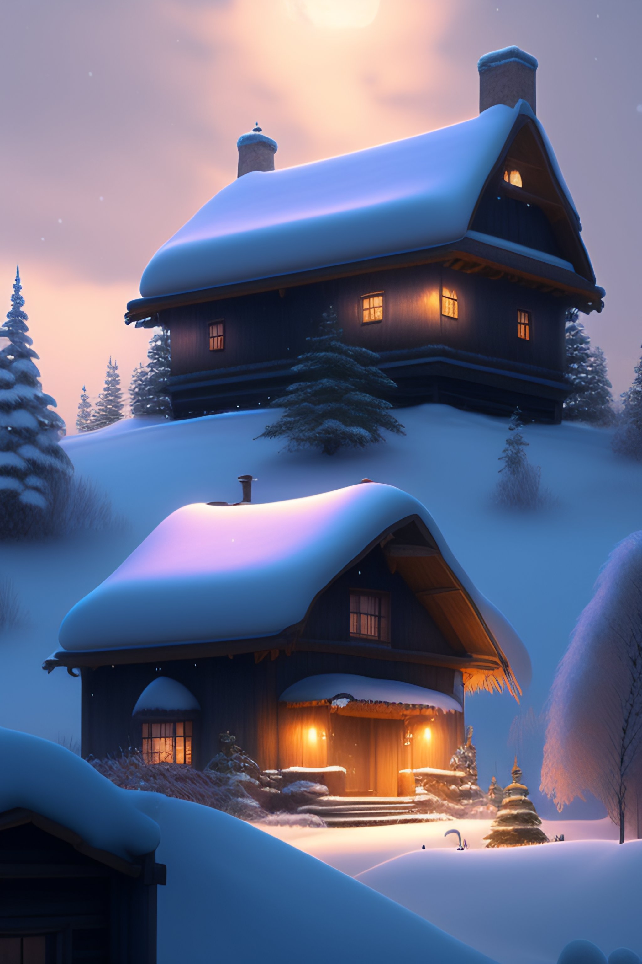 Snow - covered house, gassho-zukuri, night, stars in the sky, landscape, painting by craig mullins, octane rendering, wide angle lens, in the style of hayao miyazaki, trending on artstation