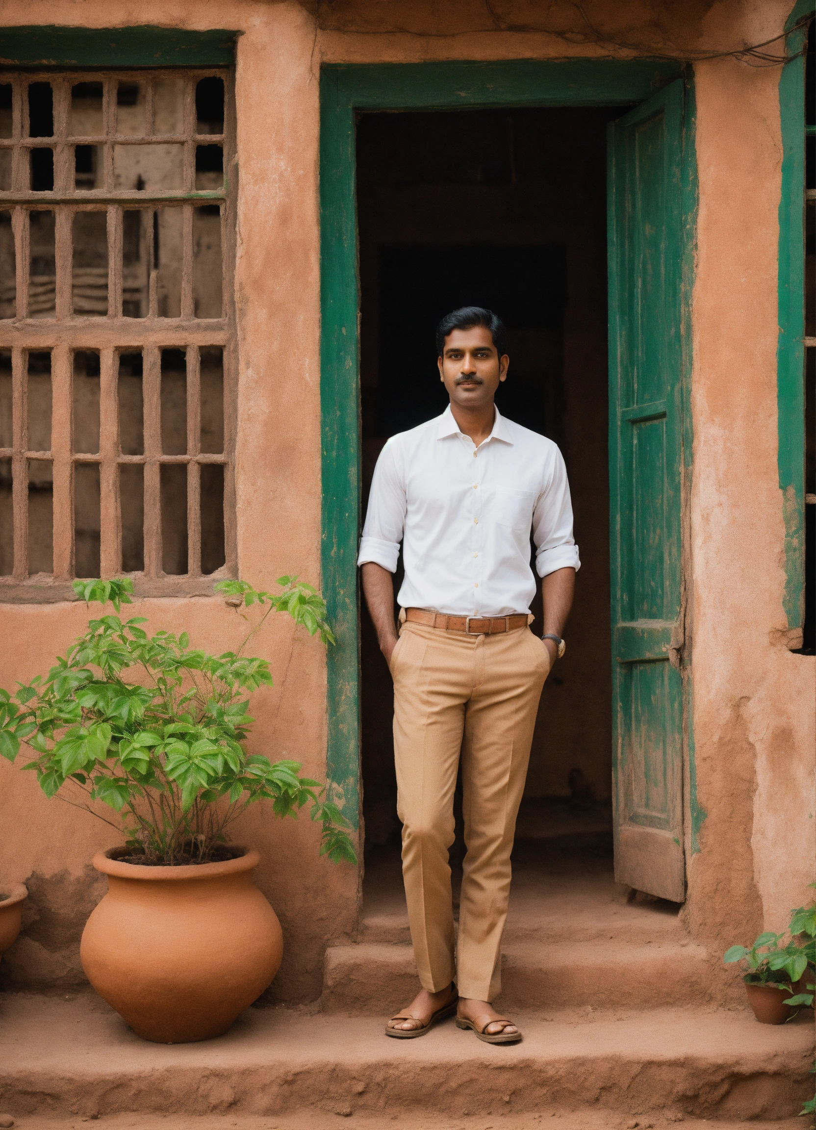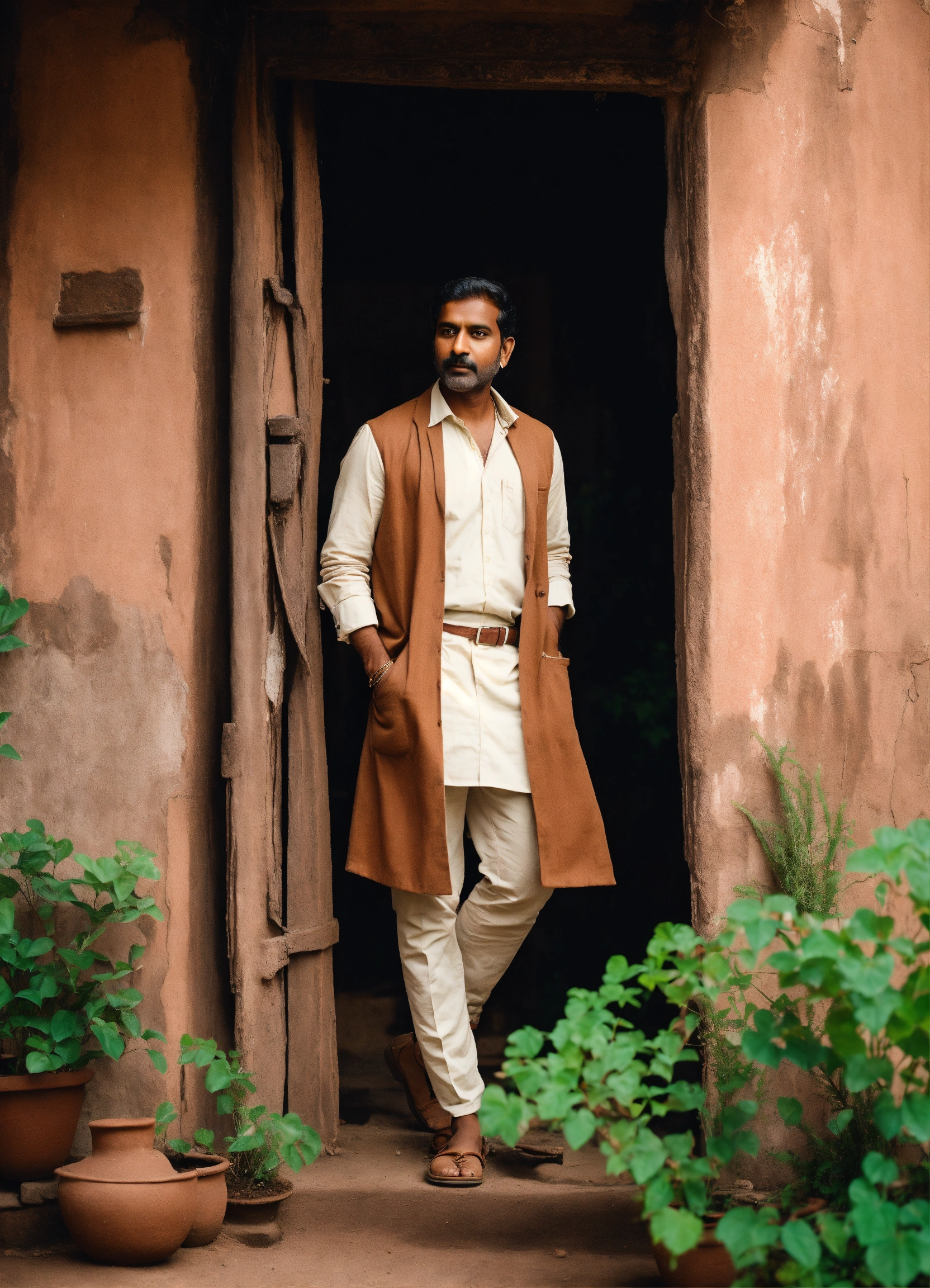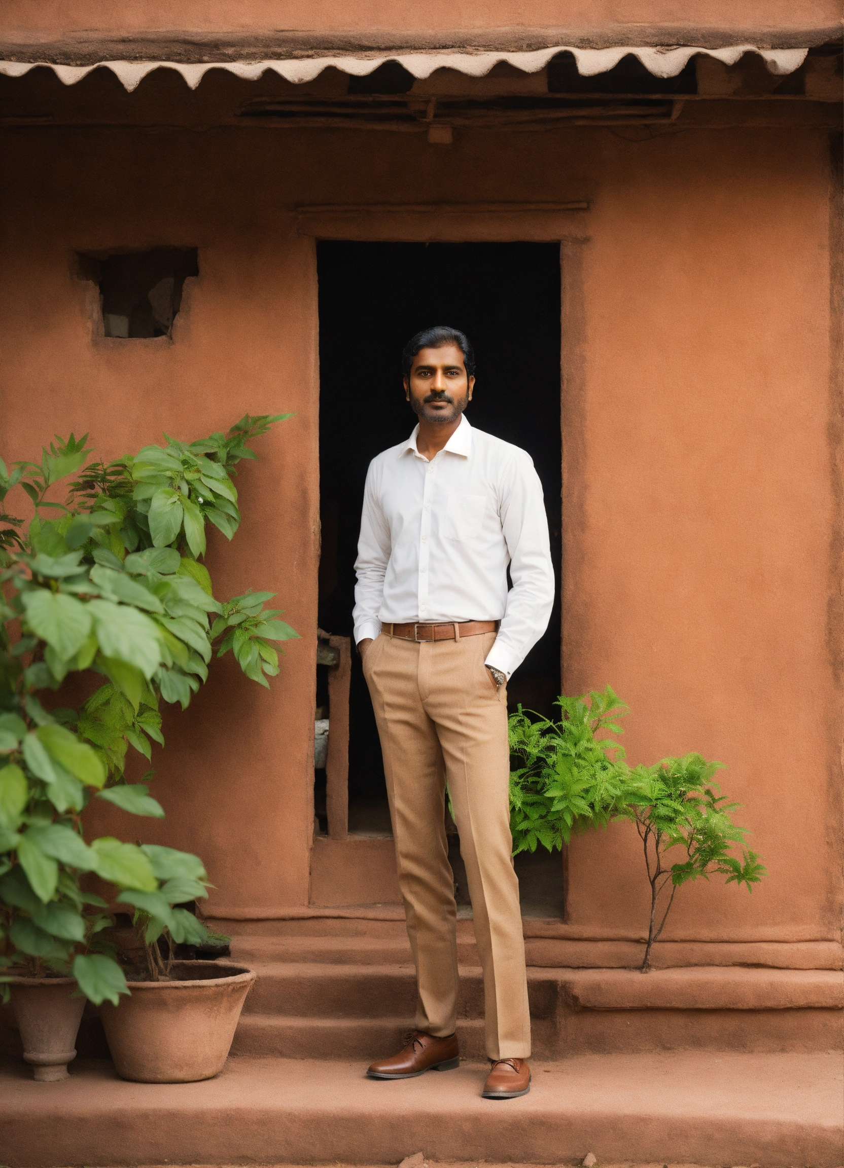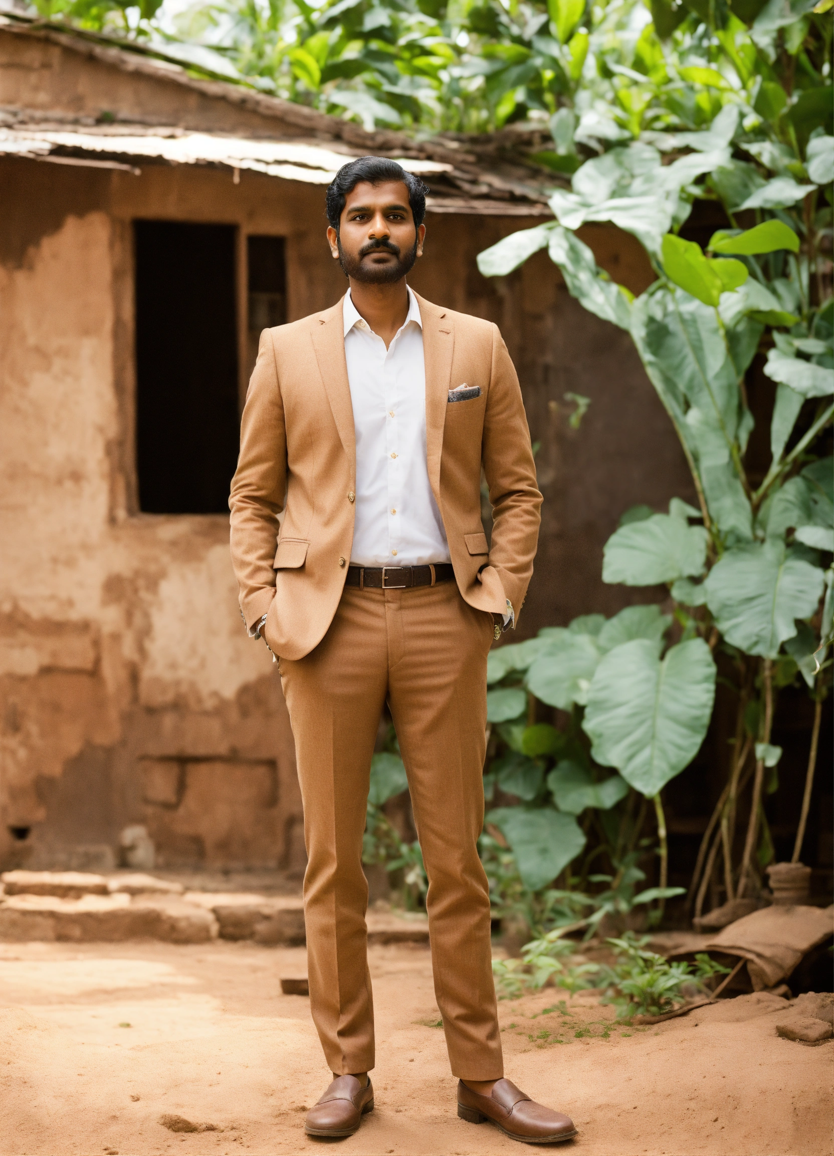 Light skin indian man in a brown suit with white shirt hands in the pocket standing in front of an old clay house with green plant on his right