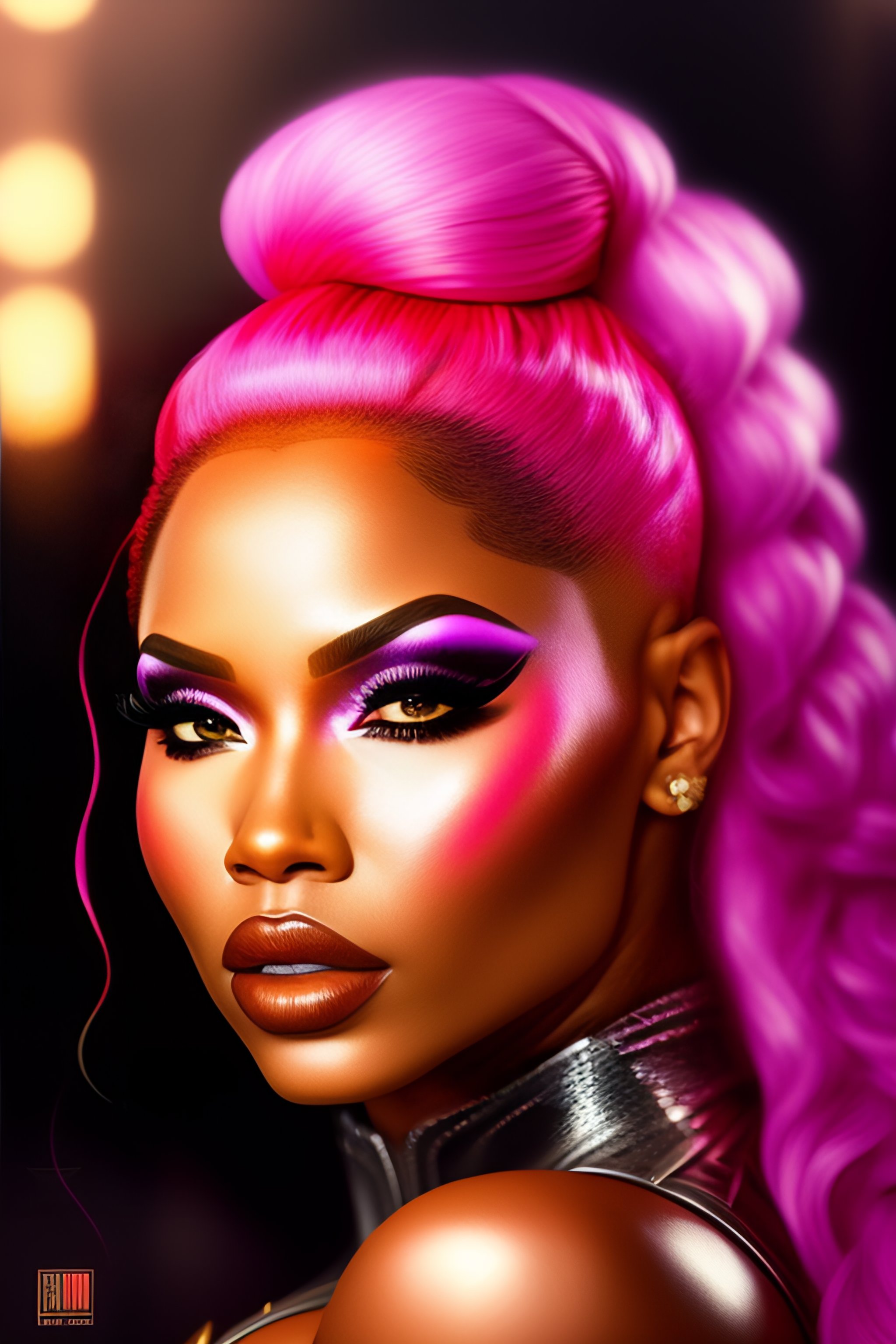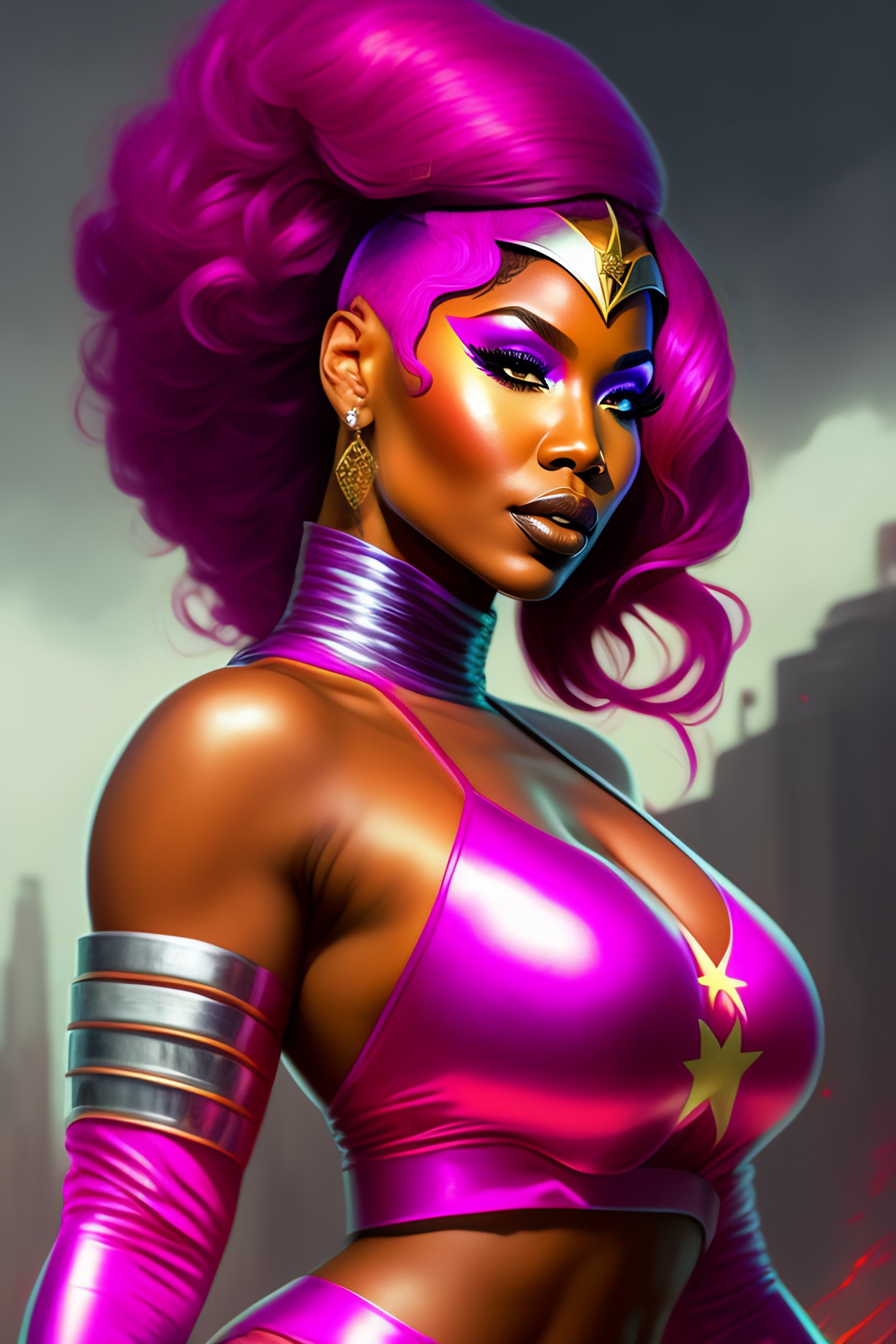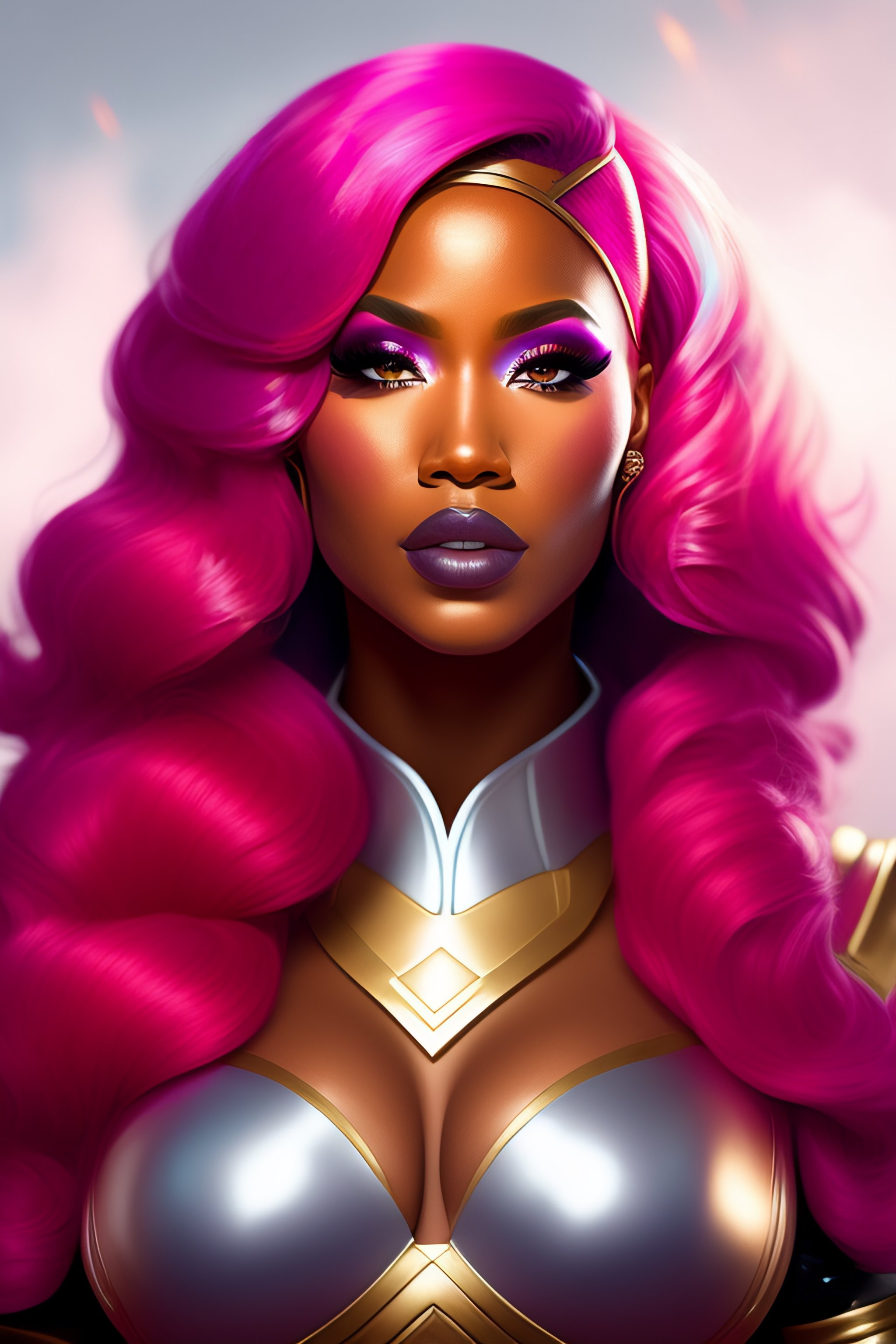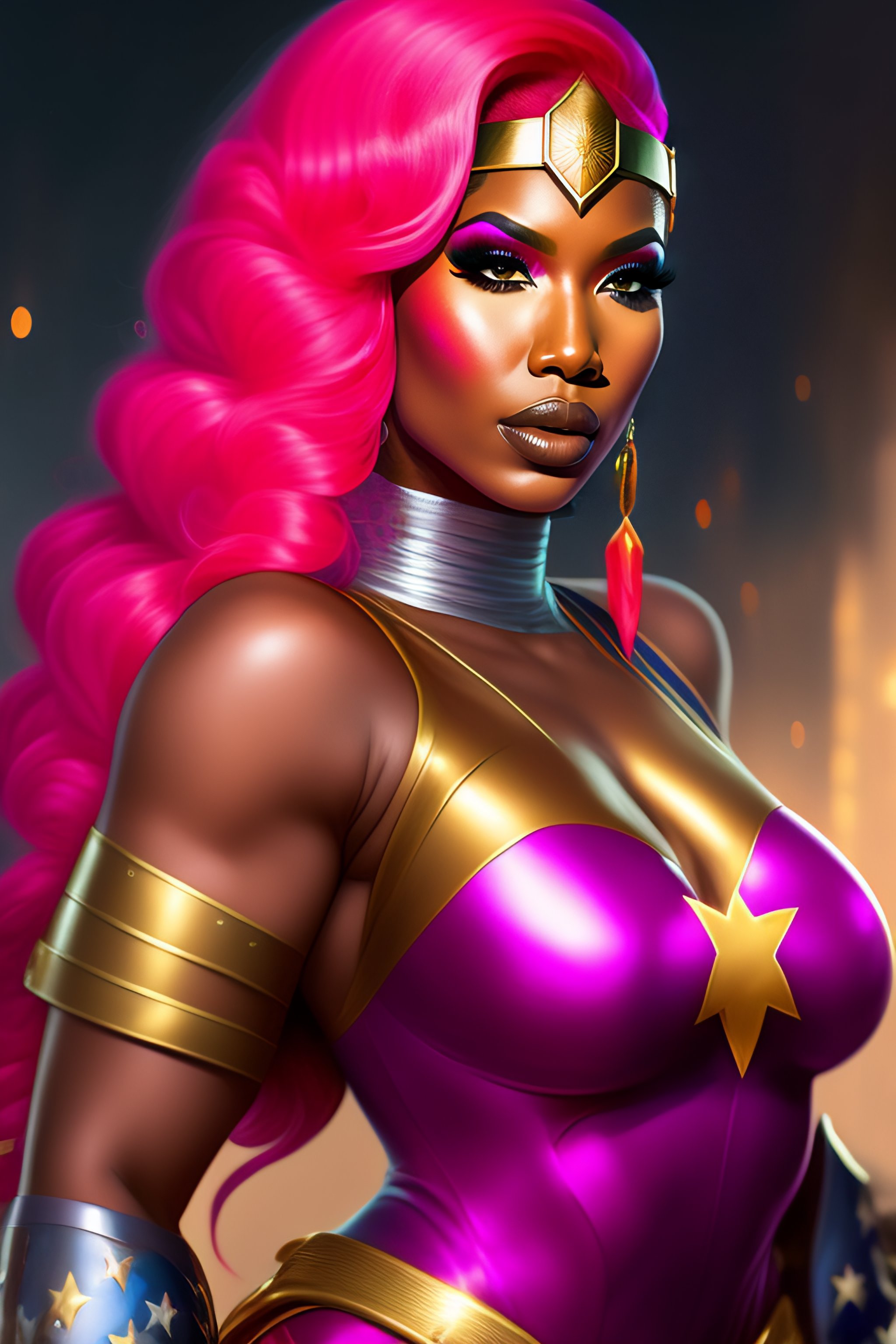 Portrait of rapper nicki minaj, pink hair, dressed as superhero wonder woman, epic, tragic, military art, fantasy, dieselpunk, hd shot, digital portrait, beautiful, artstation, comic style, by artgerm, guy denning, jakub rozalski, magali villeneuve and charlie bowater, comic book, superhero costume