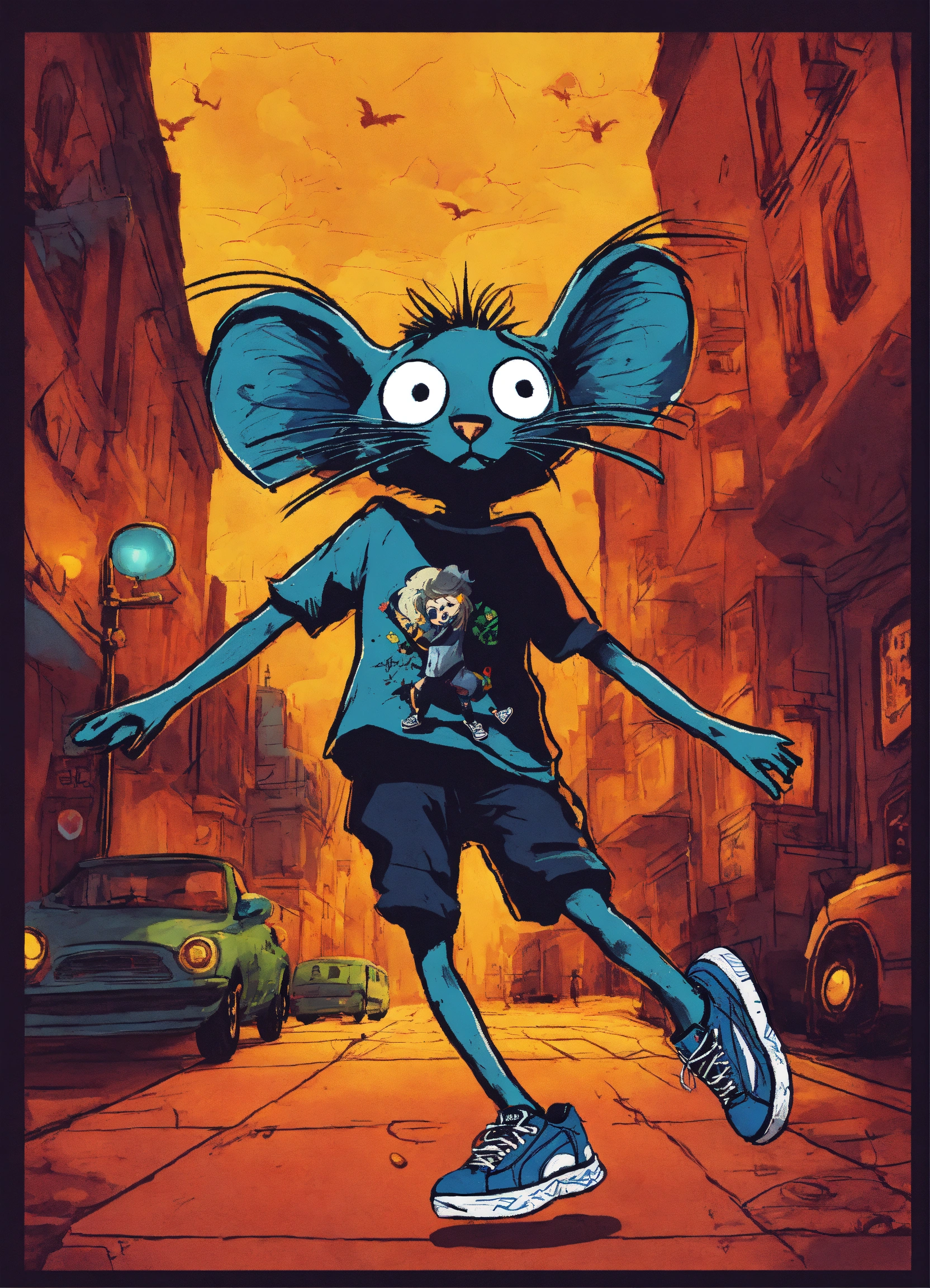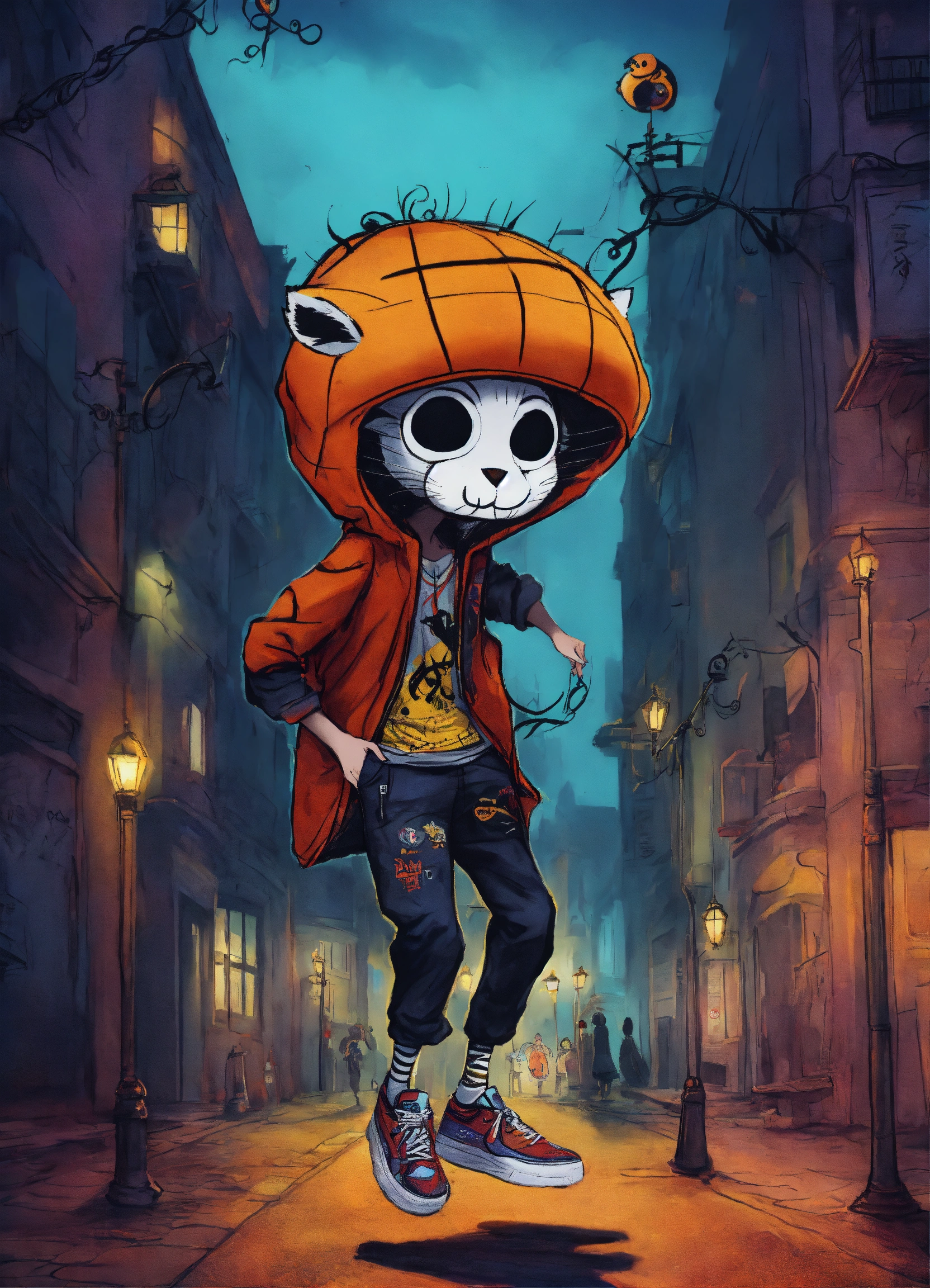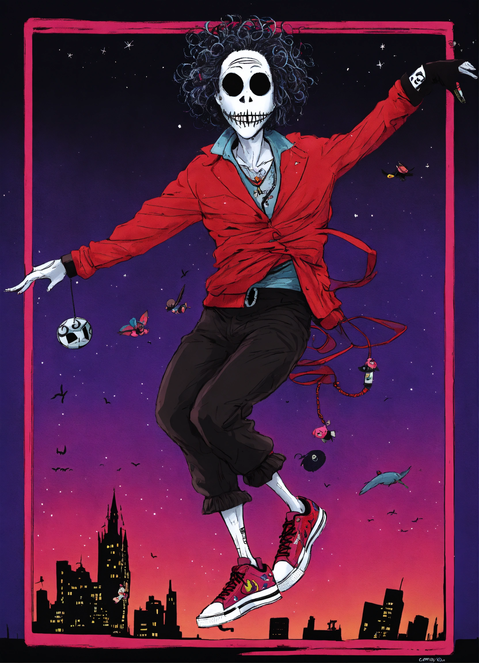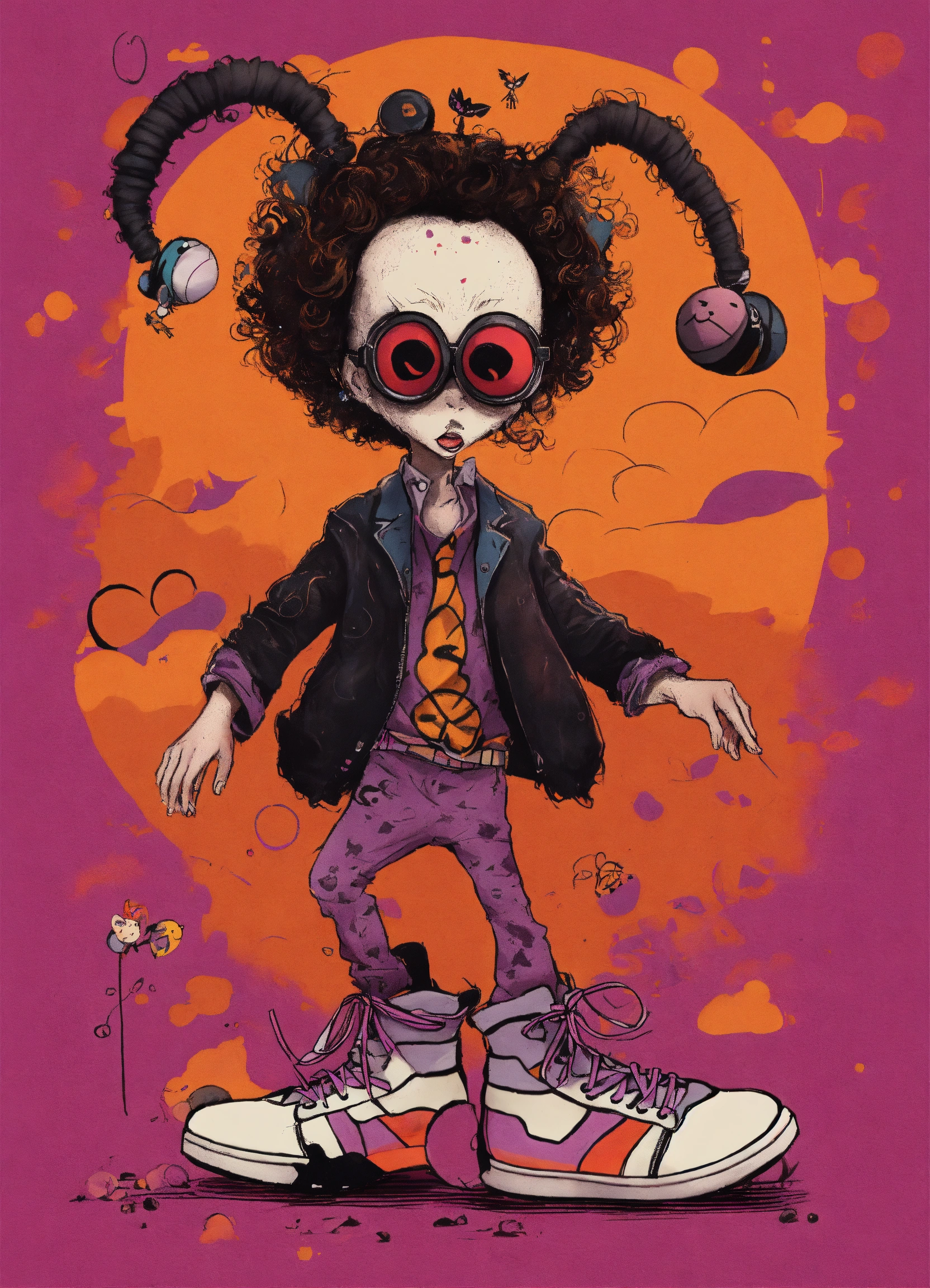 Diseño para camiseta con personajes de tim burton que contenga el símbolo puma en las zapatillas bailando urbano marty mc fly