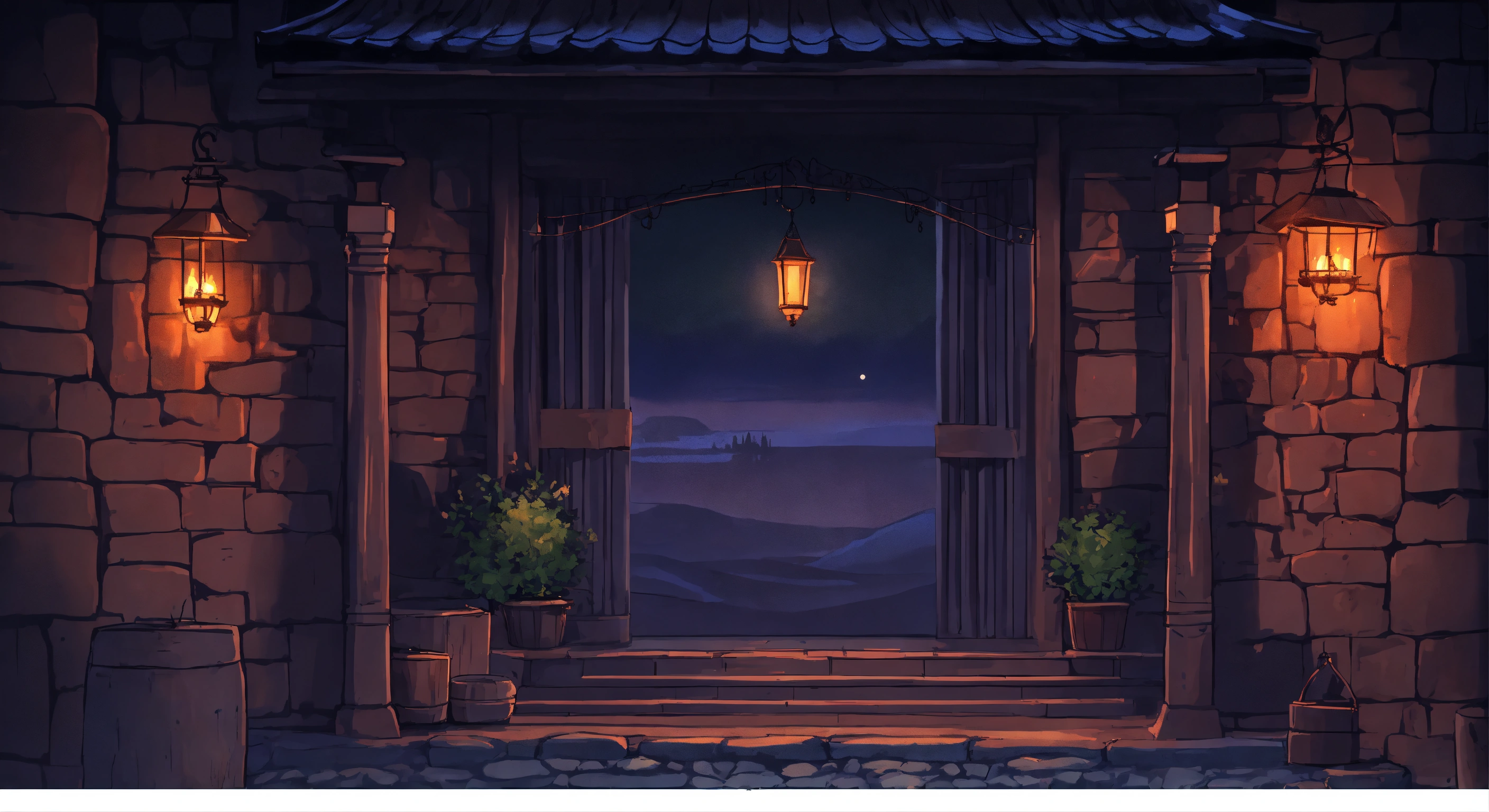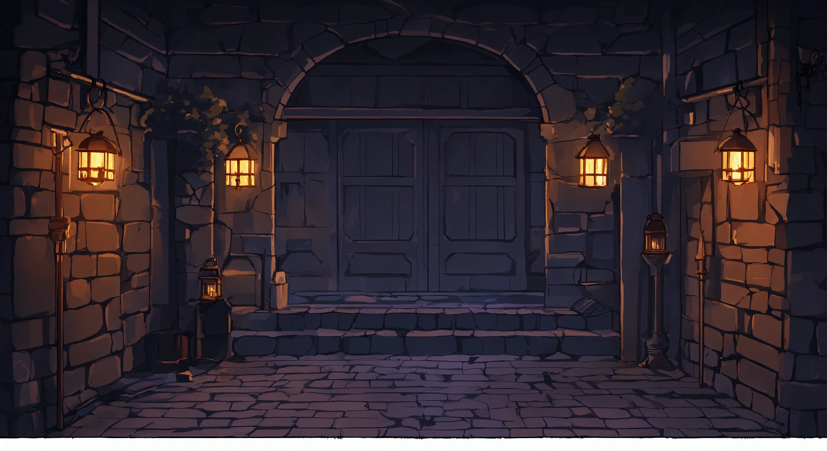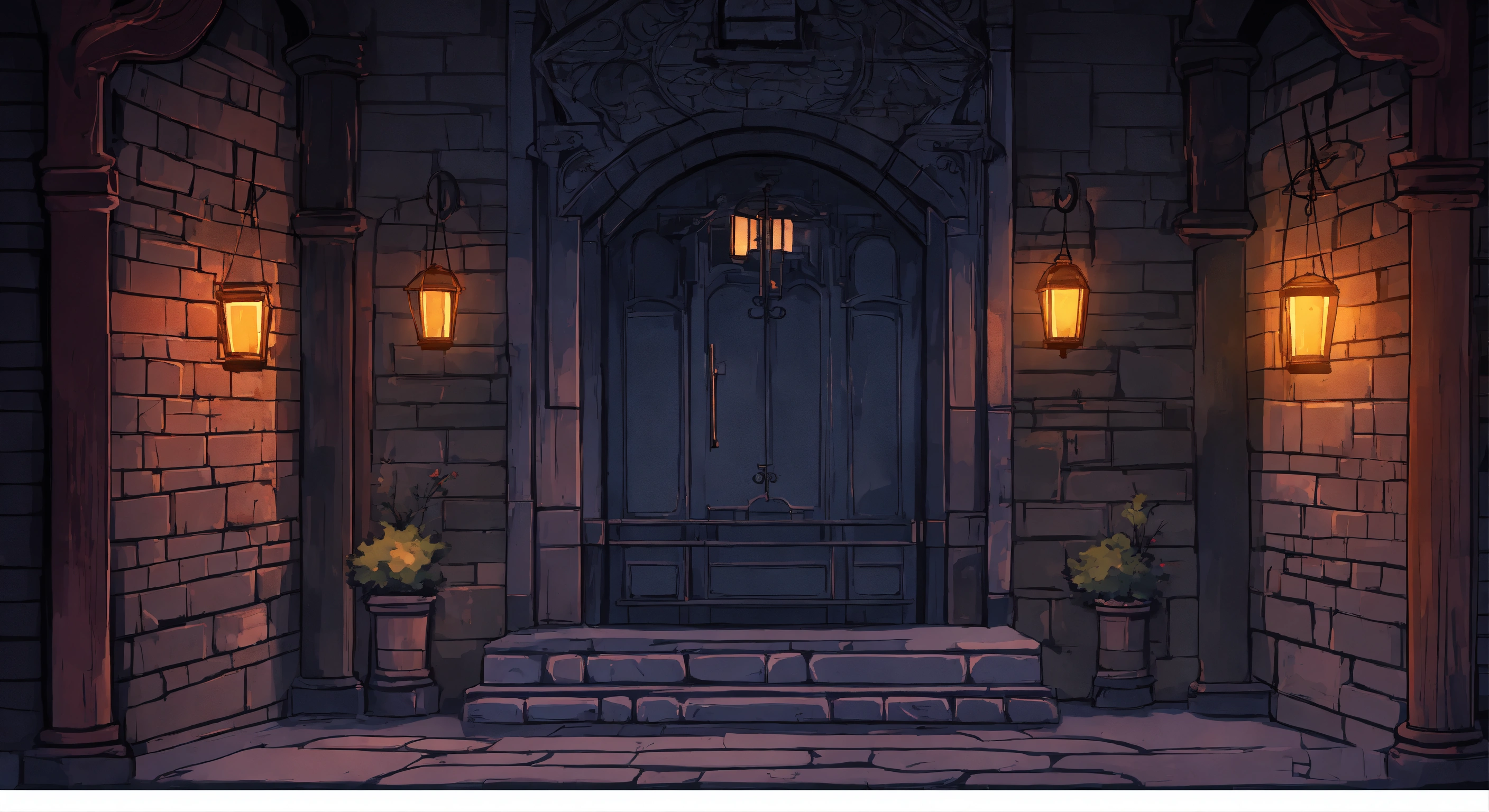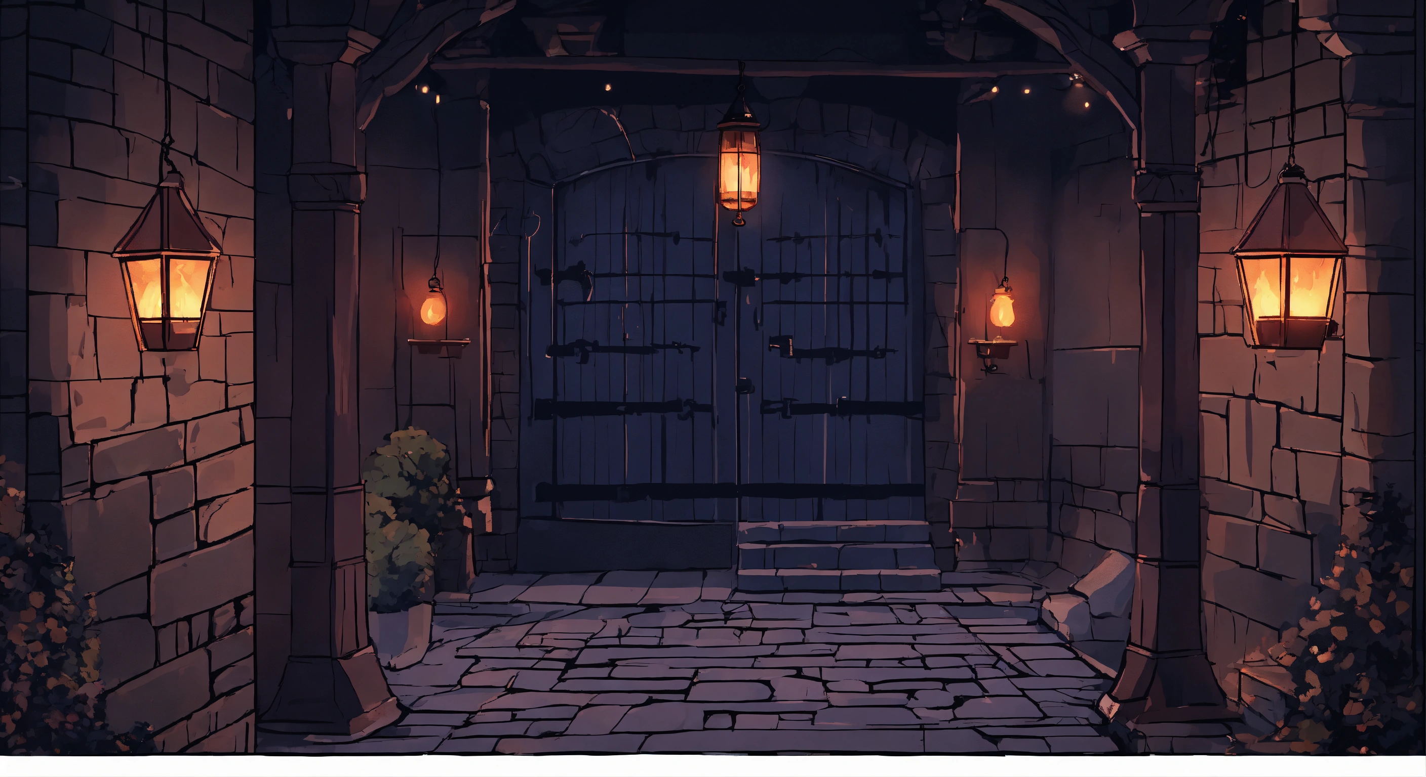 A similar image, old cassel entrance with big old side pilers with hanging firelight, box type stone style for wall, dark color scheme, dramatic lighting, illustration style, comics style, ghibli style, 8k