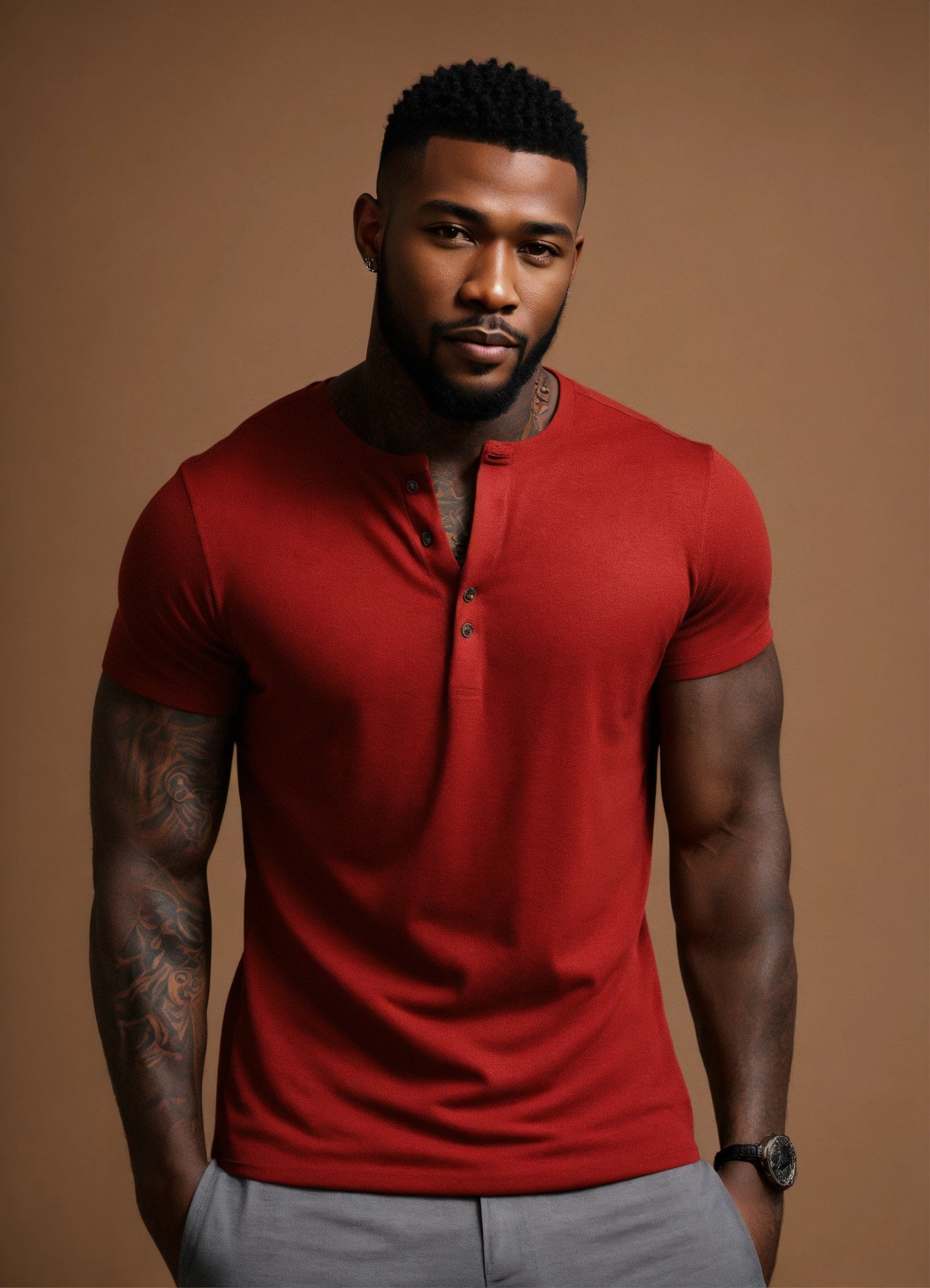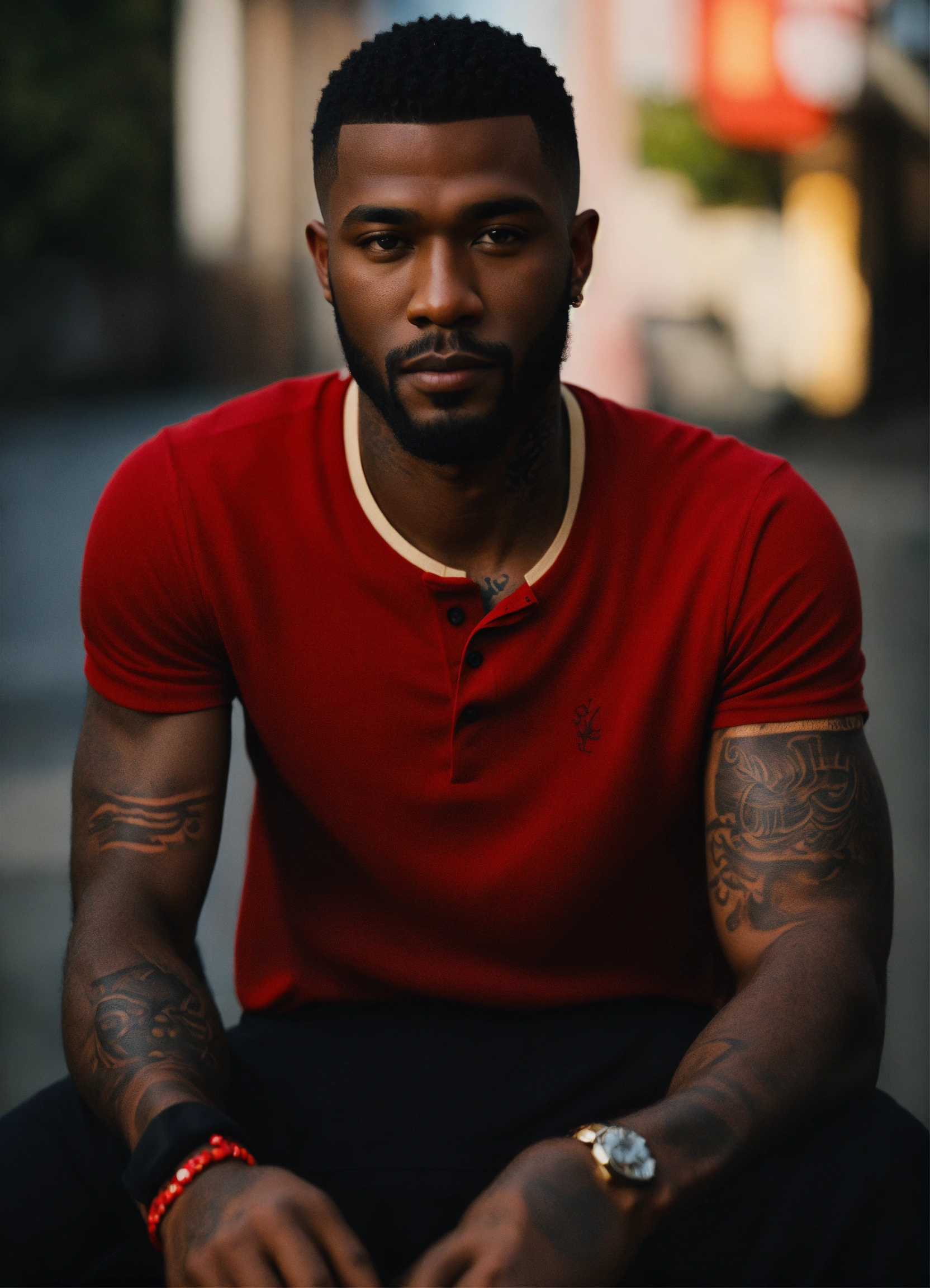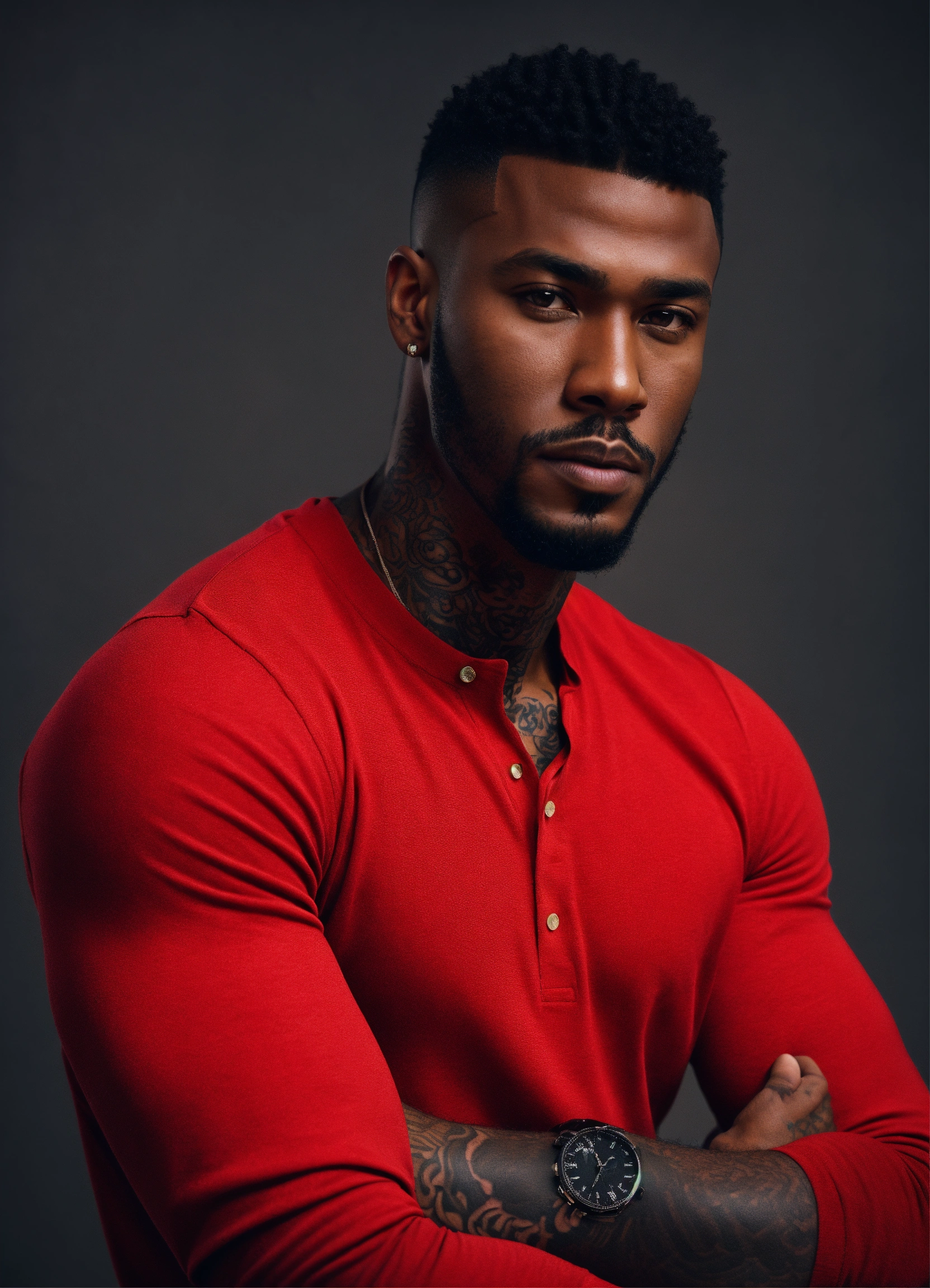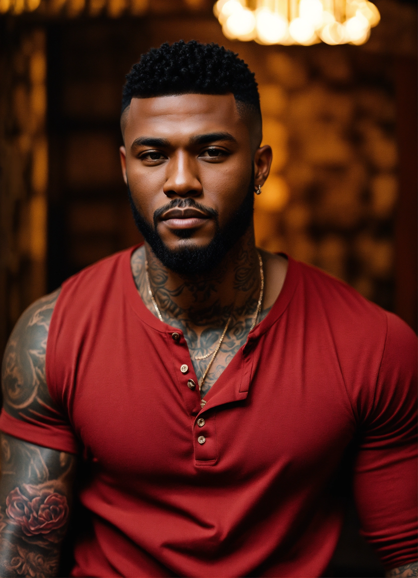 Handsome black man, low hair, caesar cut. cut beard, dark eyes, dark skin, tattoos on arms, red long sleeve henley, realistic portrait