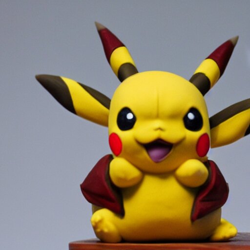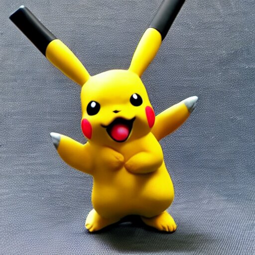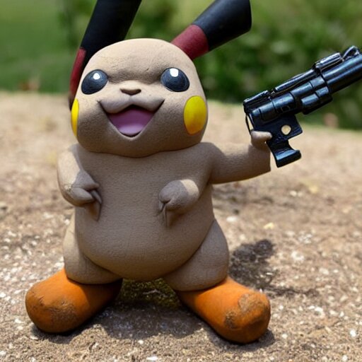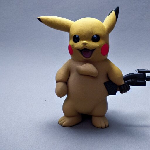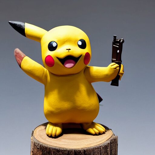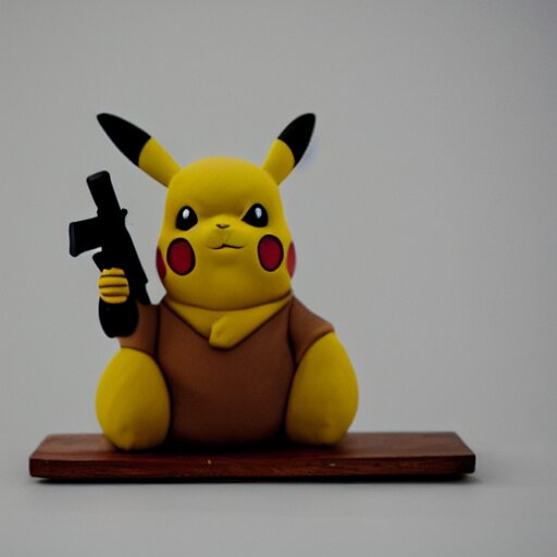 Clay sculpture of pikachu holding a gun and standing on a wooden desk, clay sculpture, 33mm, high res photo