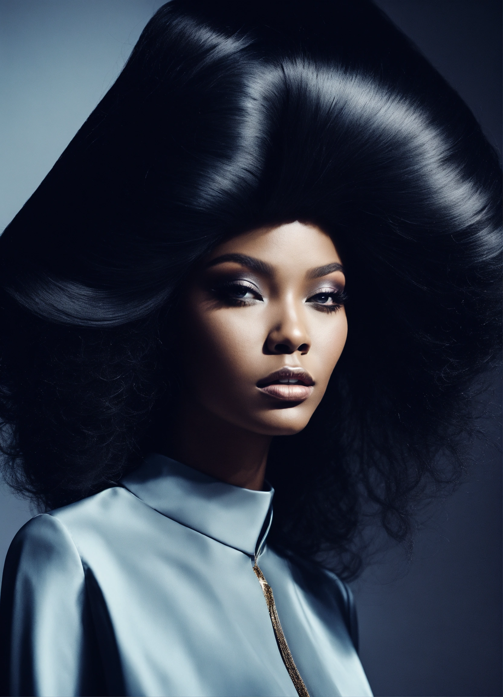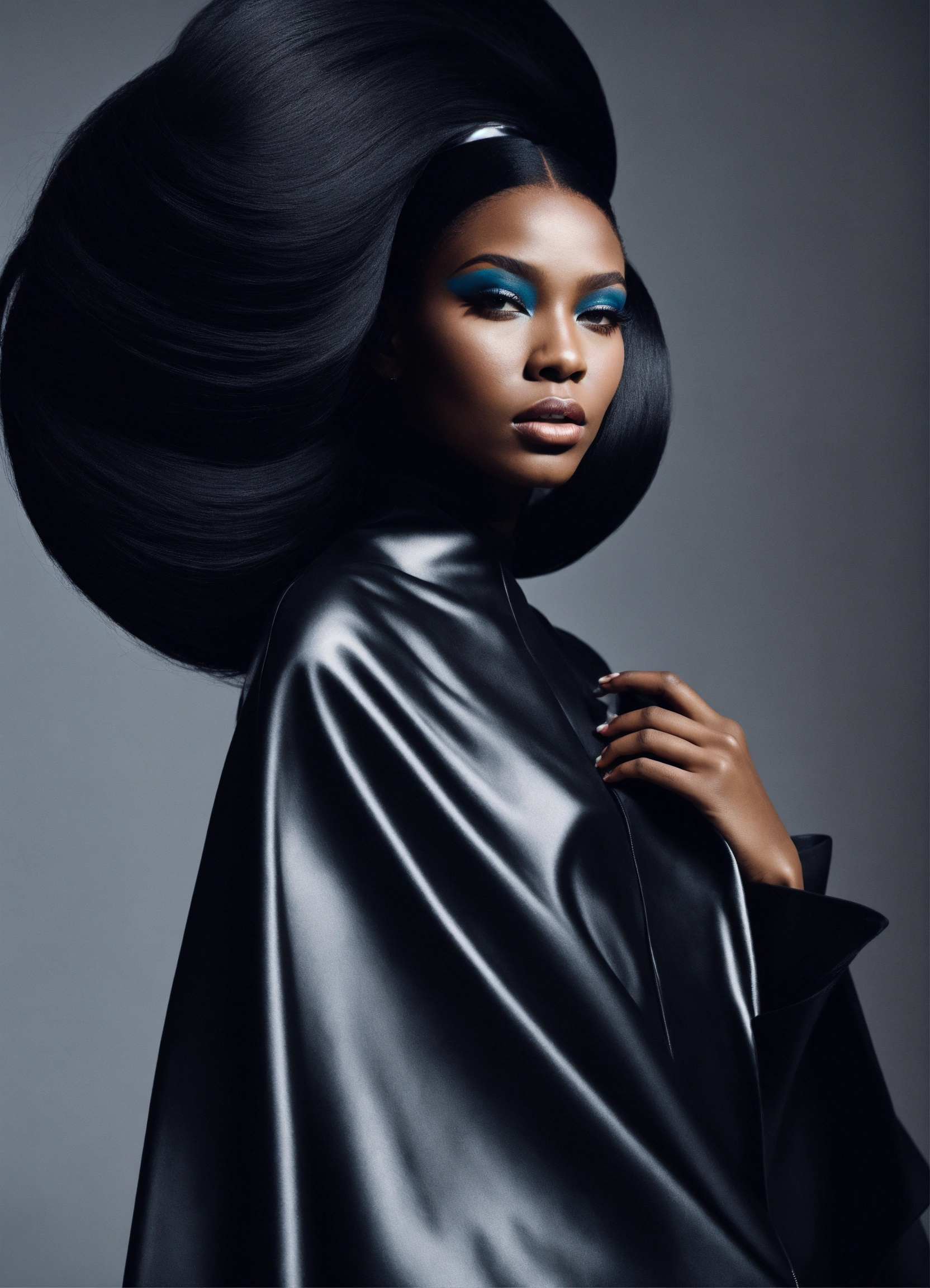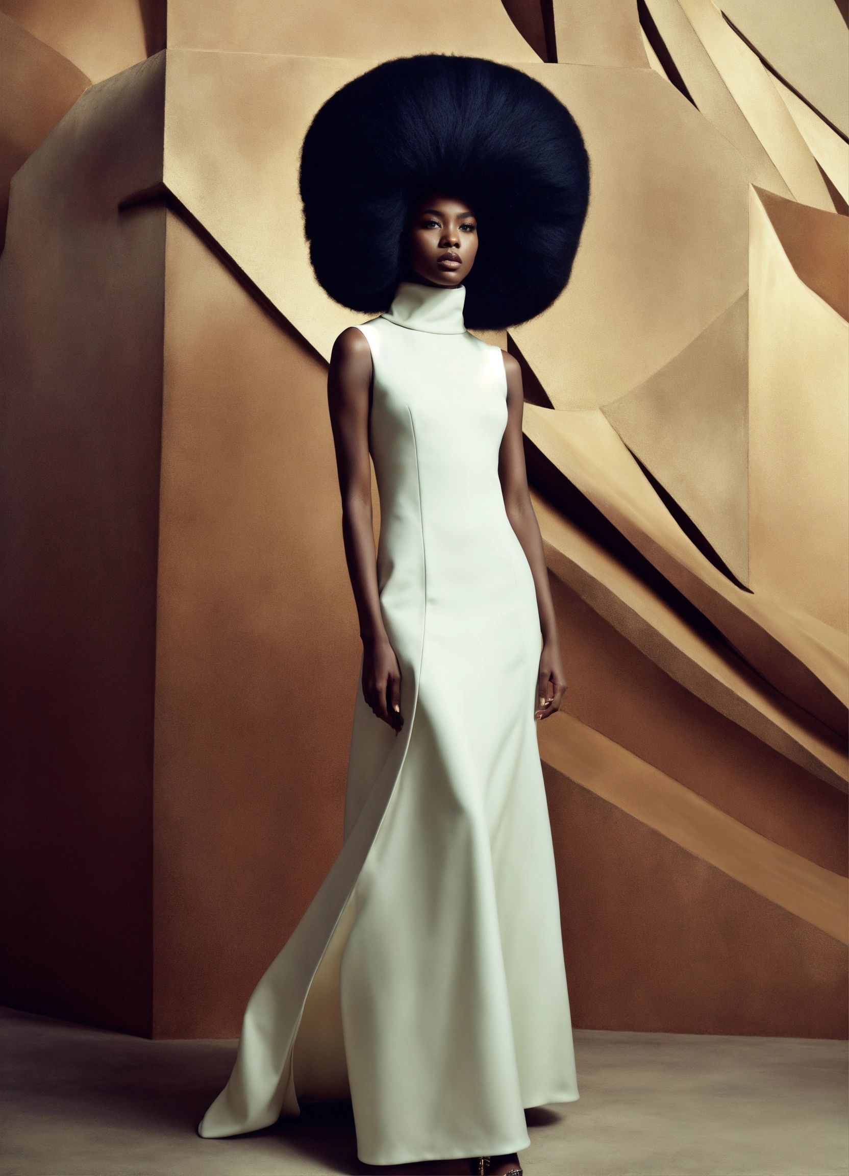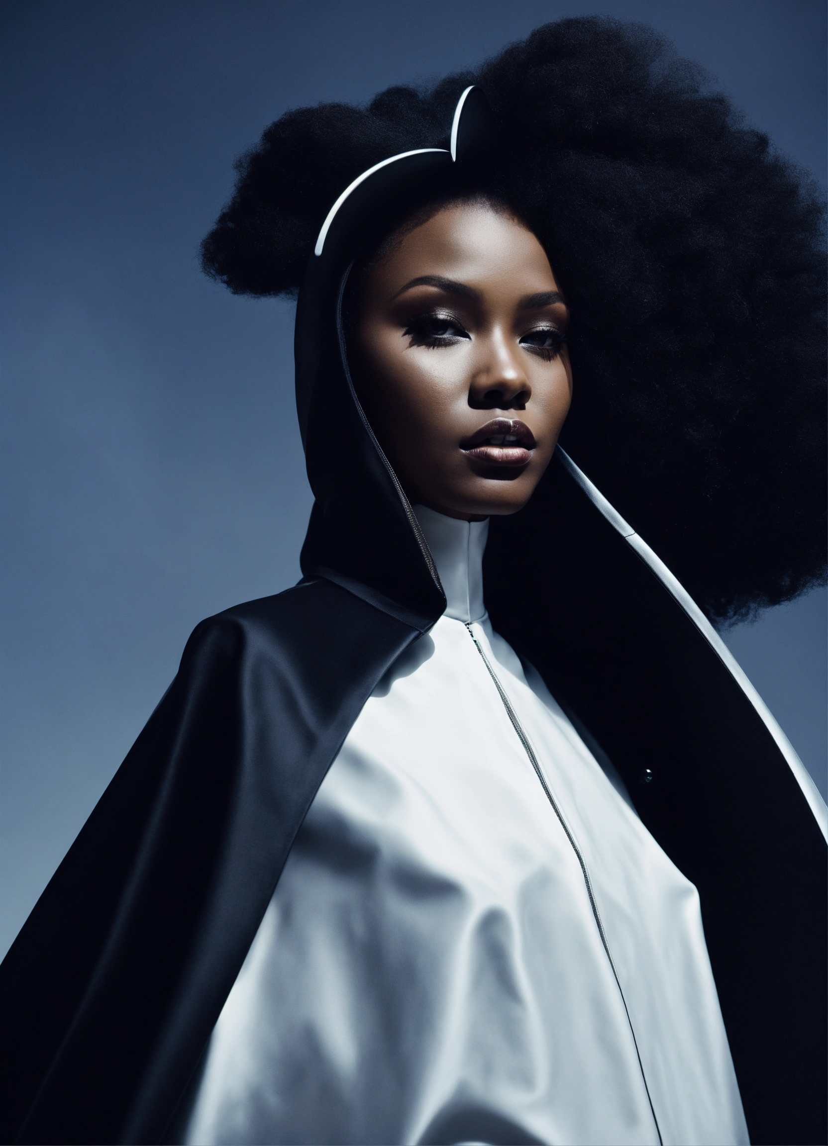 Fashion editorial, black woman, futuristic 60’s mod fashion avant-garde couture photography, sleek oversized flowing hair, minimalism