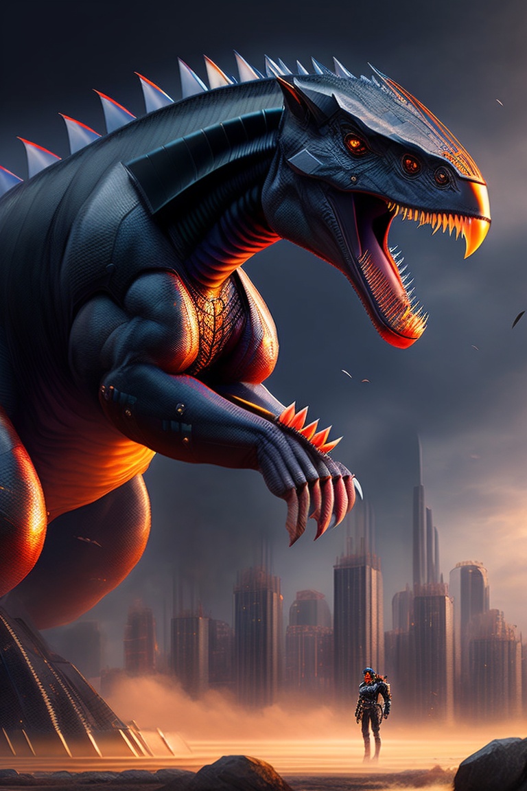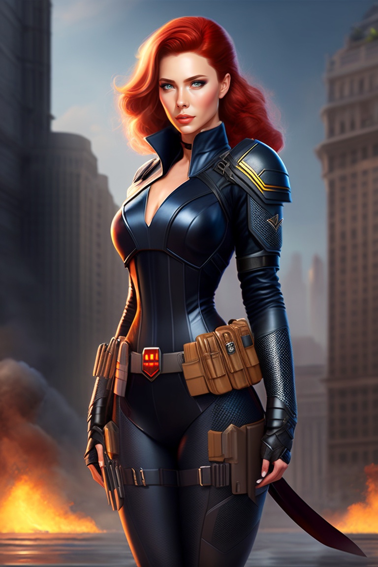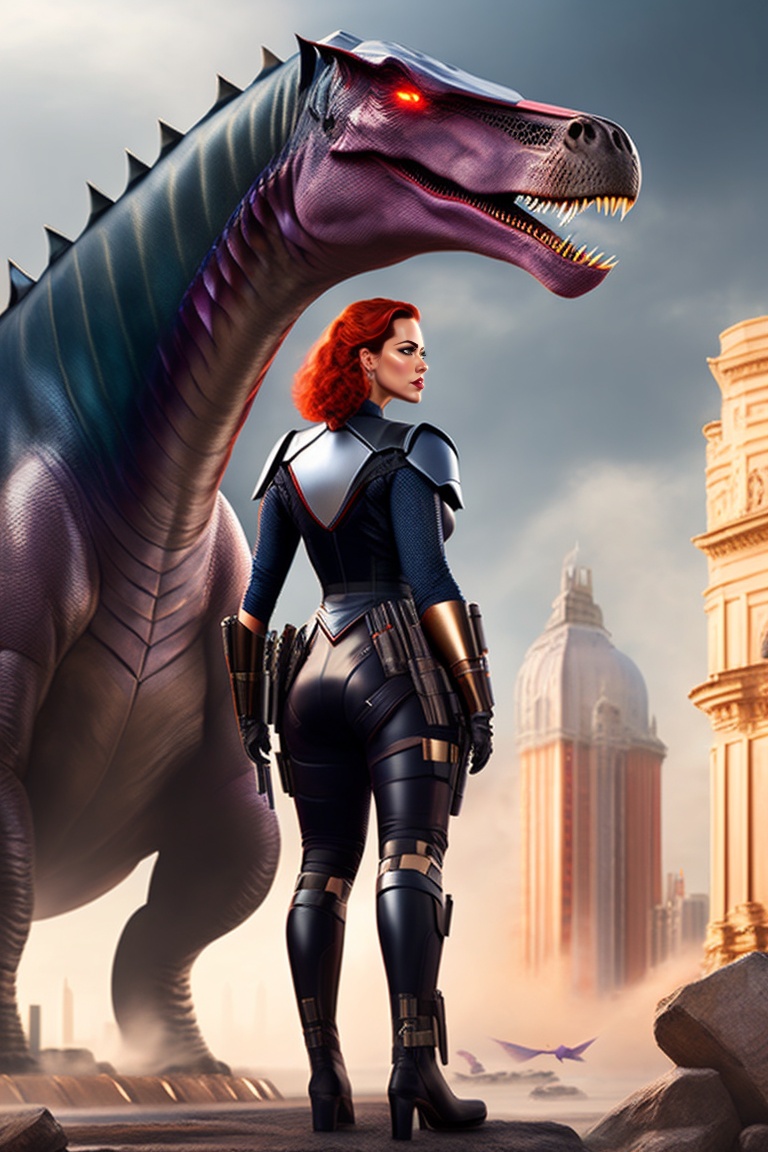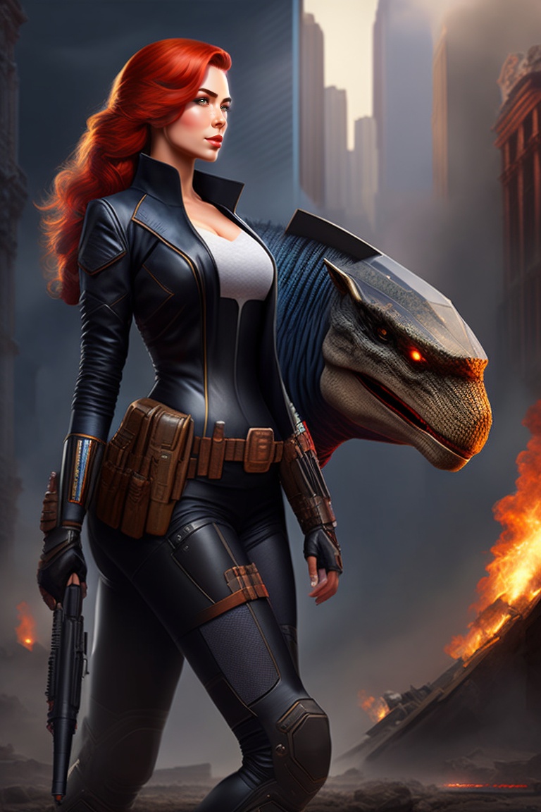 Black widow character but dinoasur, the dinosaur must be wearing black widow outfit, city destroyed background, untra realistic, like original