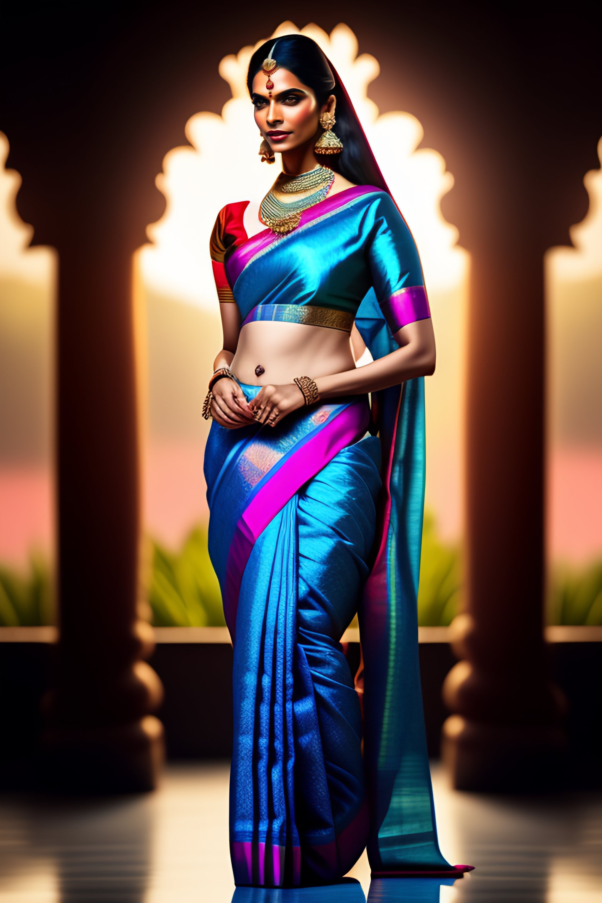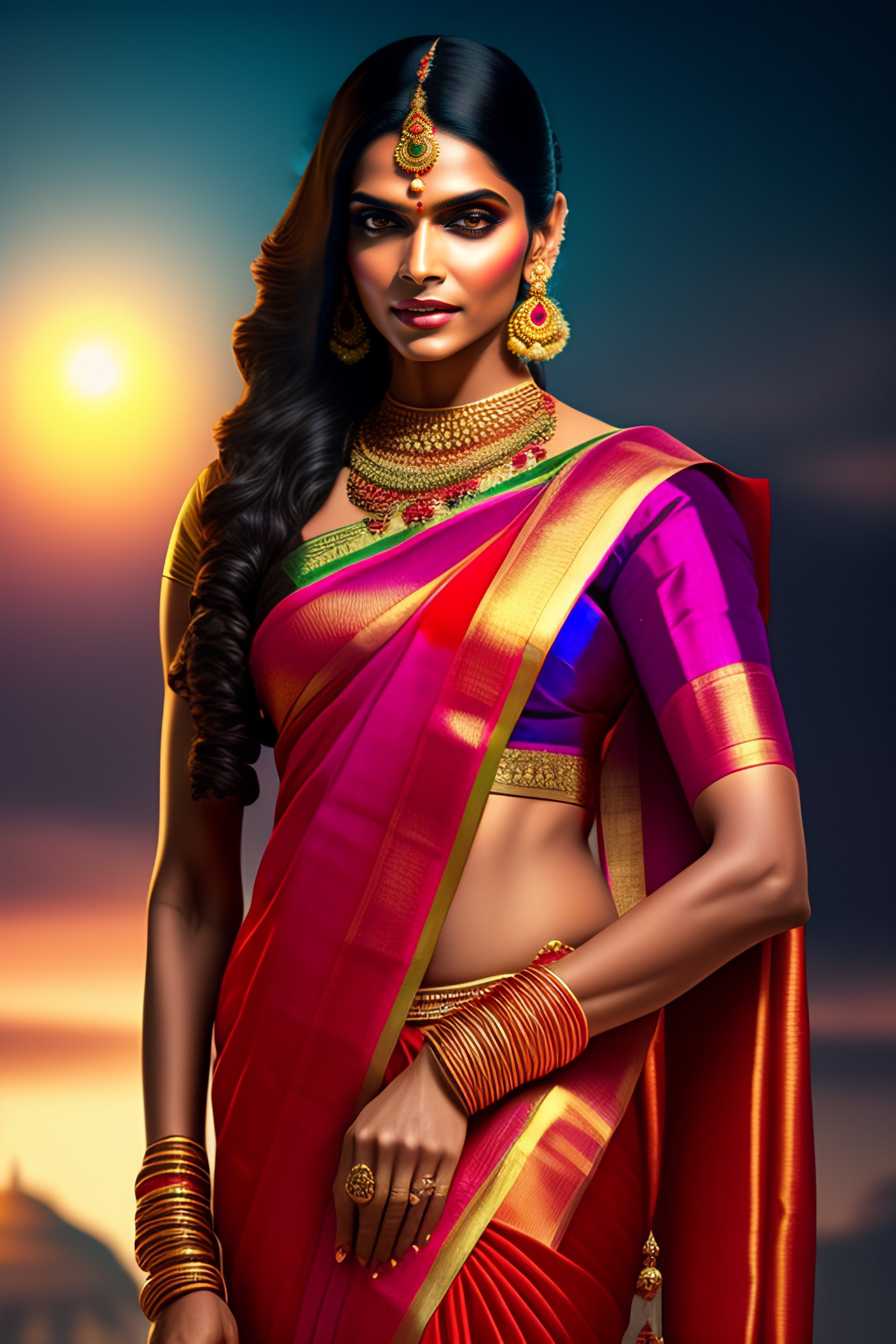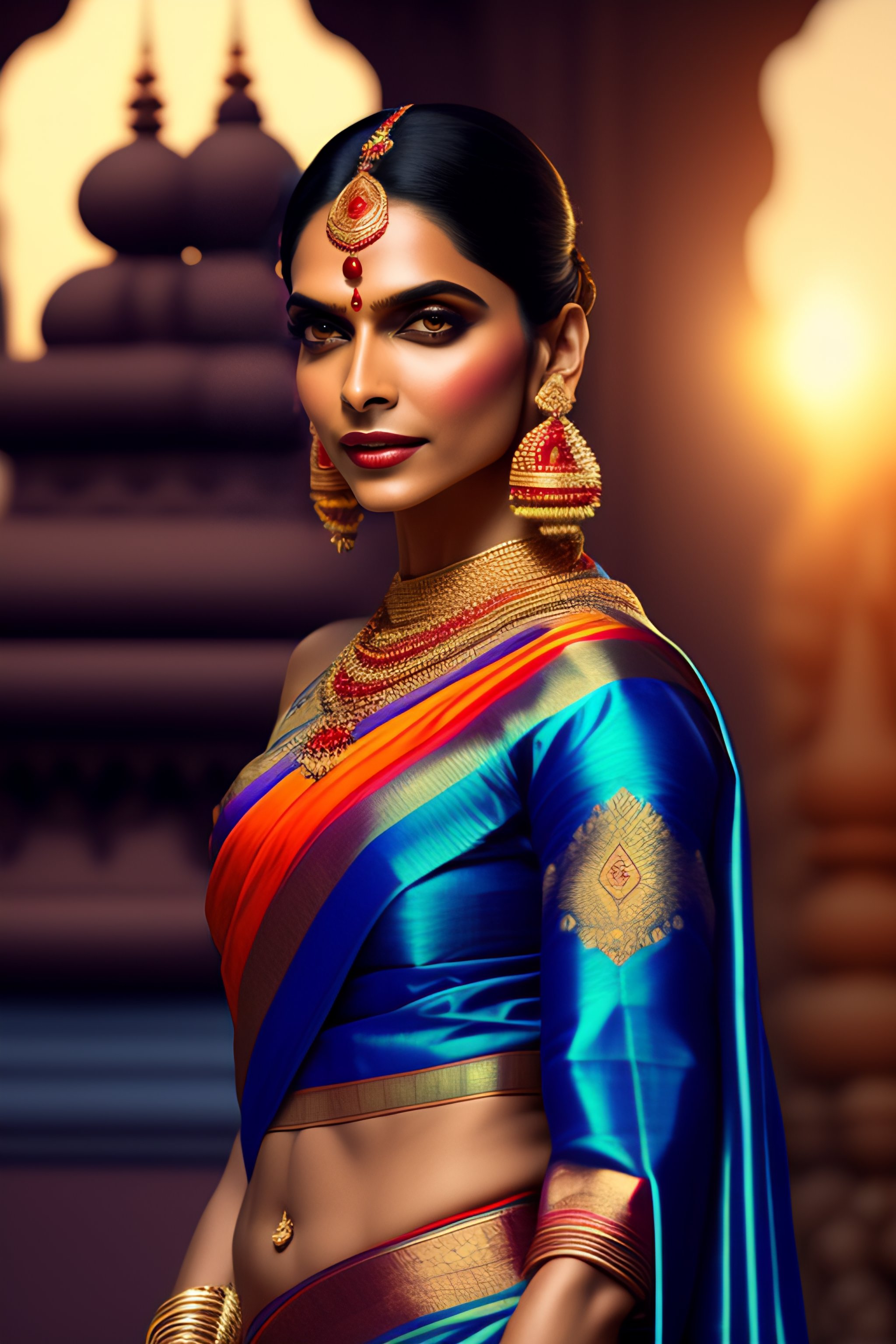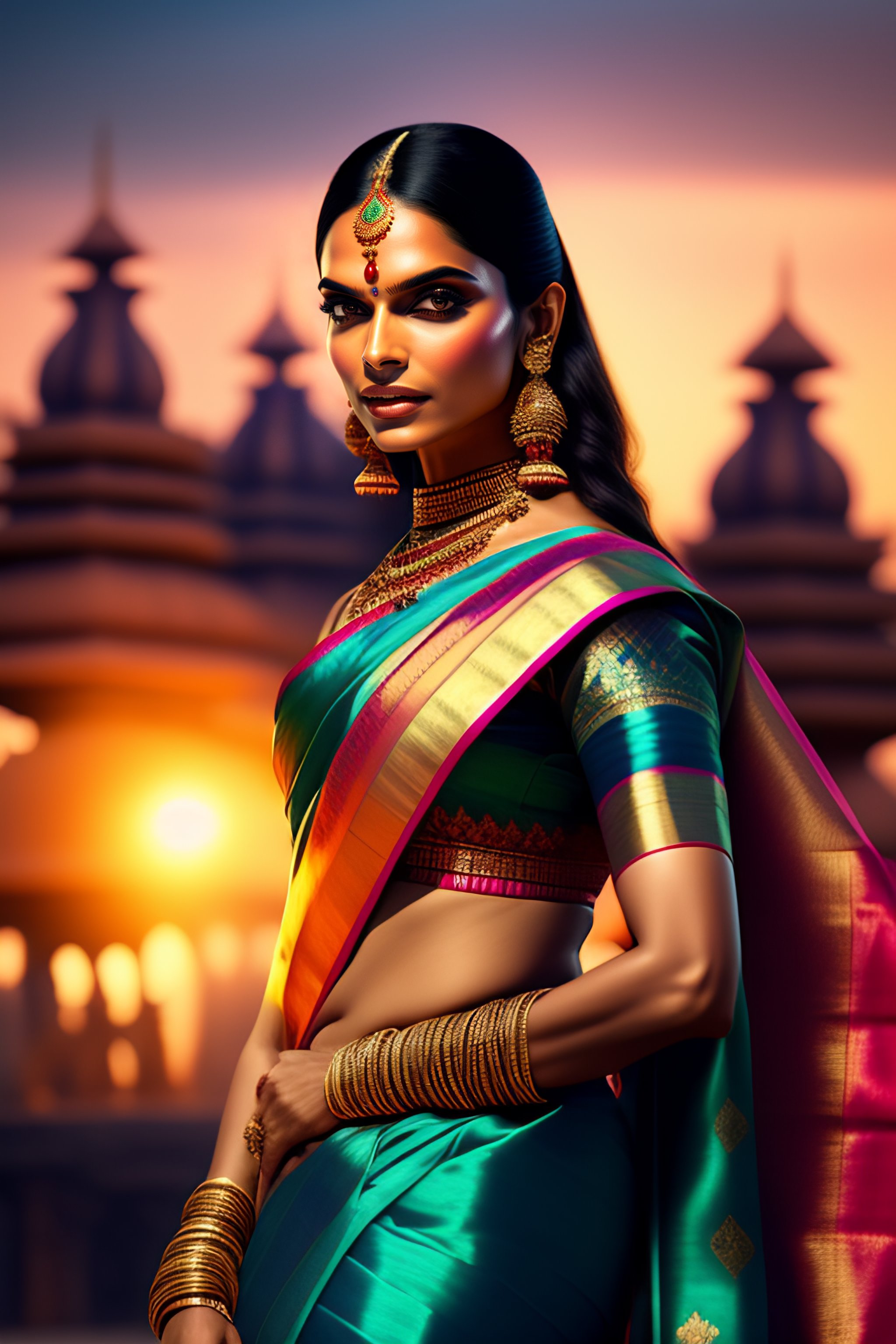 View full body very attractive indian actor deepika padukone with traditional saree clothing and big hanuman temple in kerala with beautiful detailed smooth face texture, retro style, fantasy, color graded blue, sunlight and shadows, hdr, 8k, hdr, clean face, texture details, octane render, frank retro art style, sunrise, soft lighting, volumetric, contre-jour, beautiful lighting
