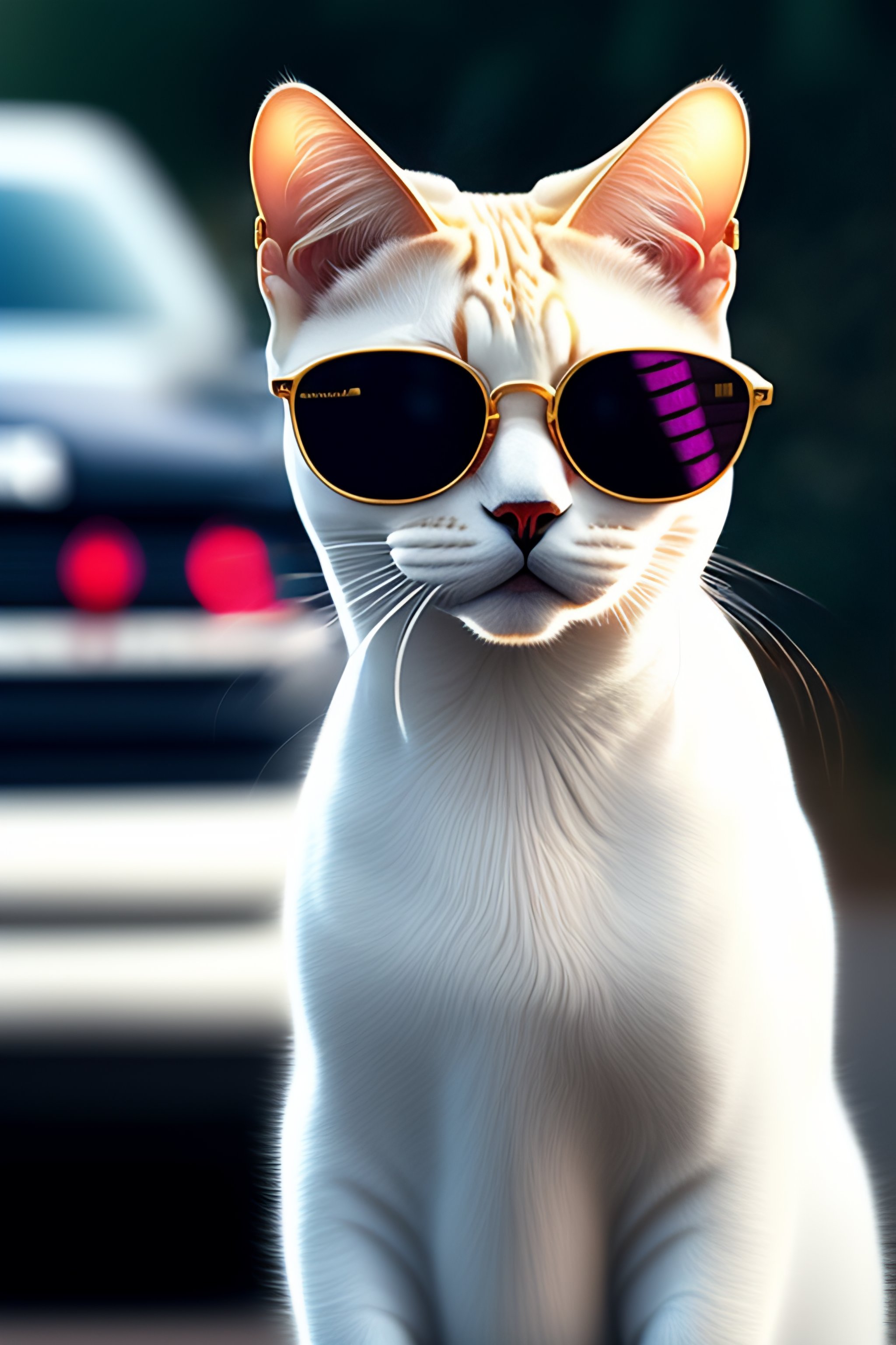 big sunglasses and a cop car in the background