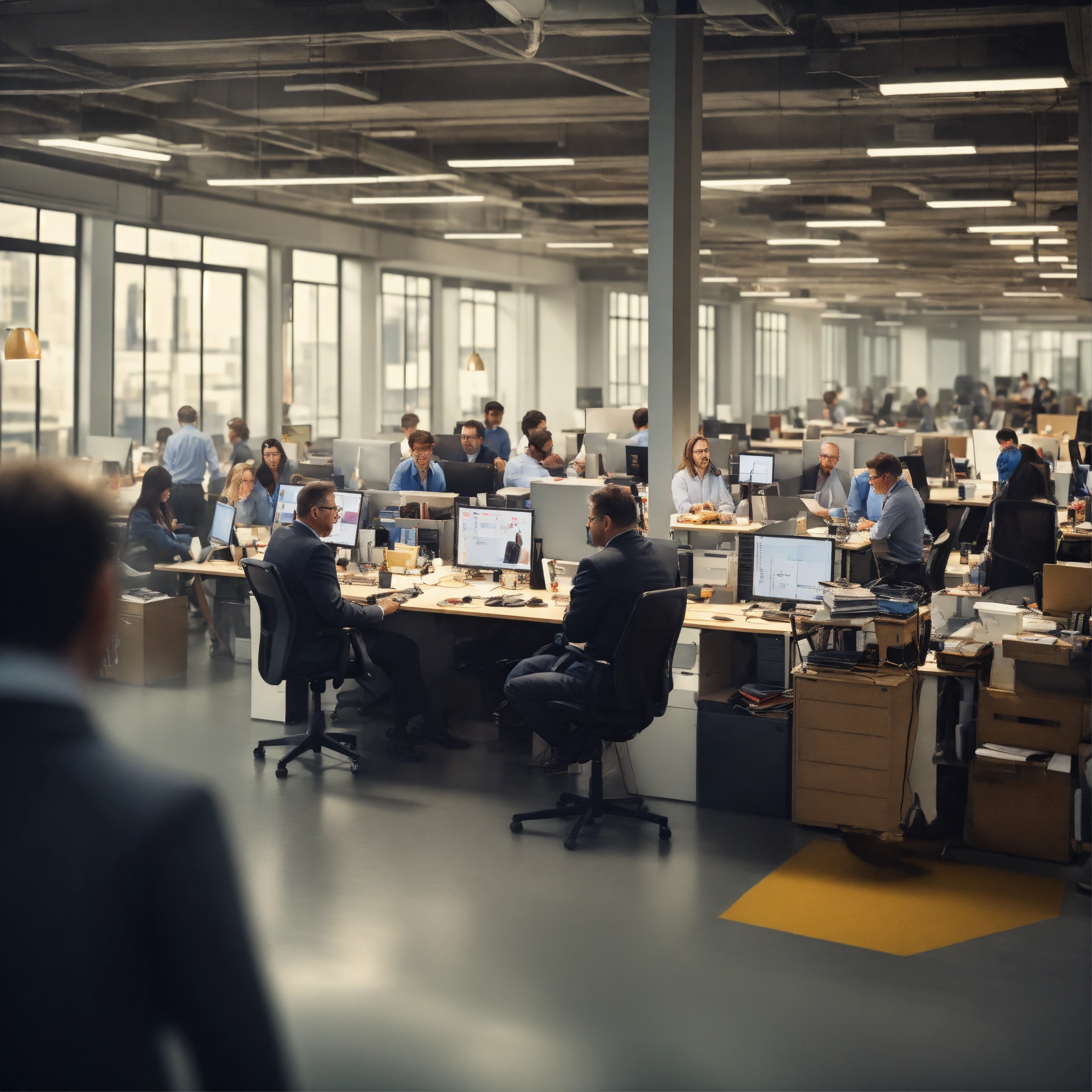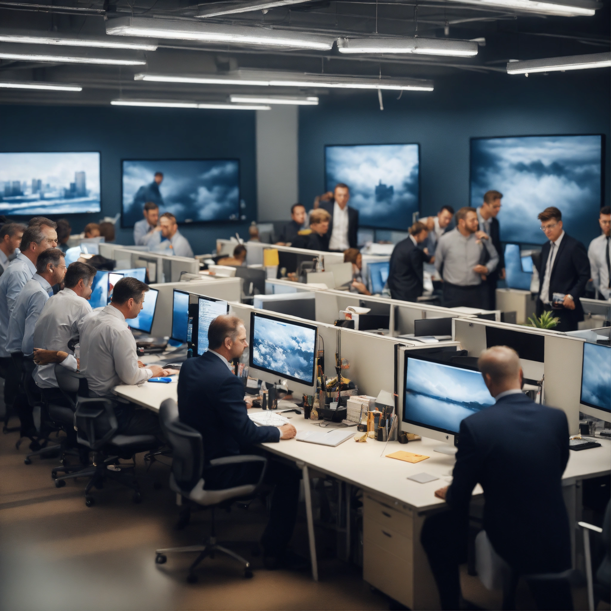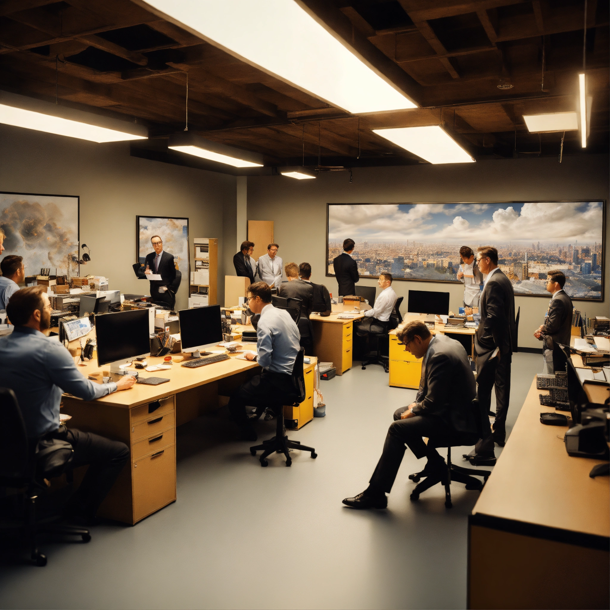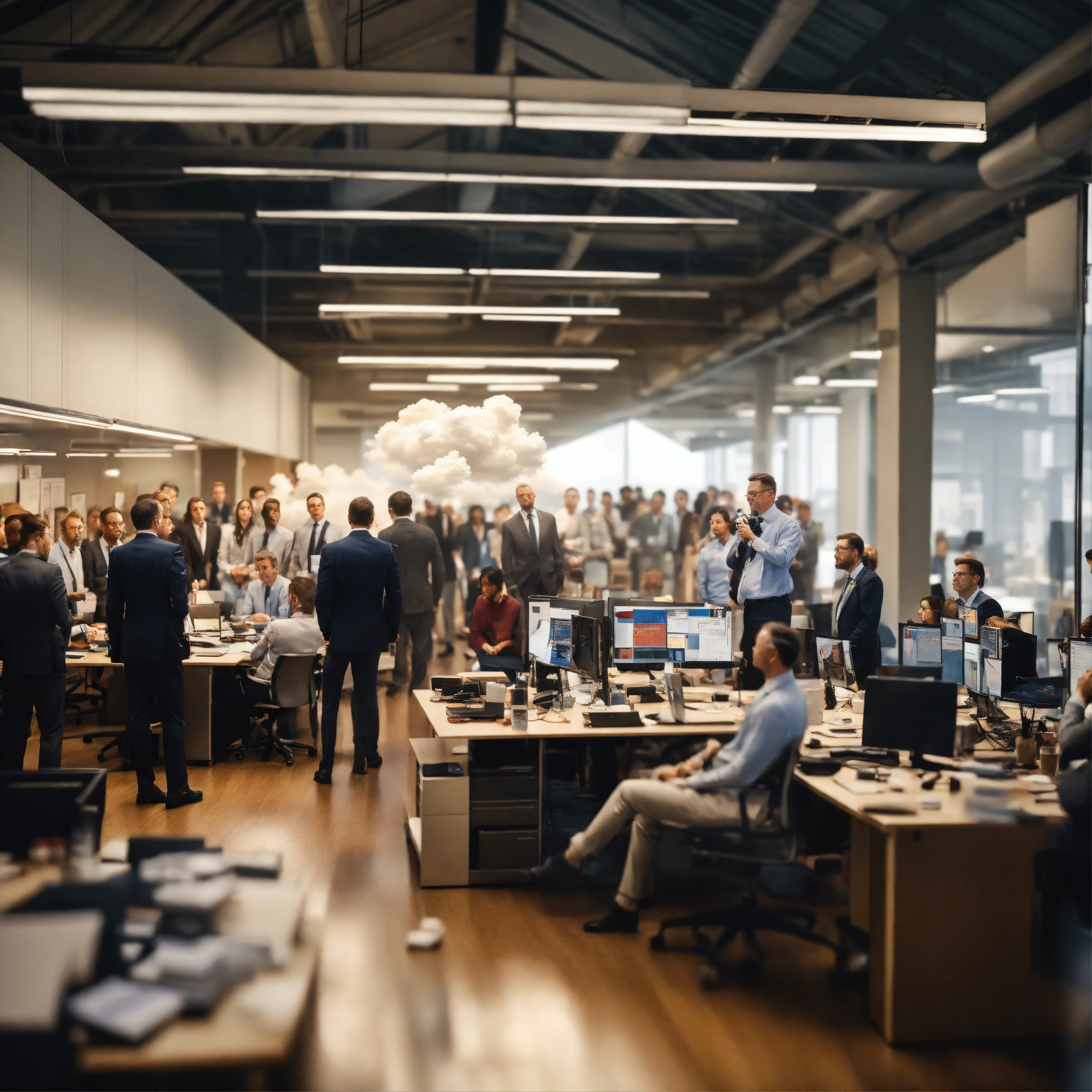 Tilt-shifted photo of team in a crowded open space office, manager sad speaks to his team, there is a data cloud over them, 8k, very coherent, surrealism, airbrush, realistic detailed image of mark brooks, in the style of francis bacon