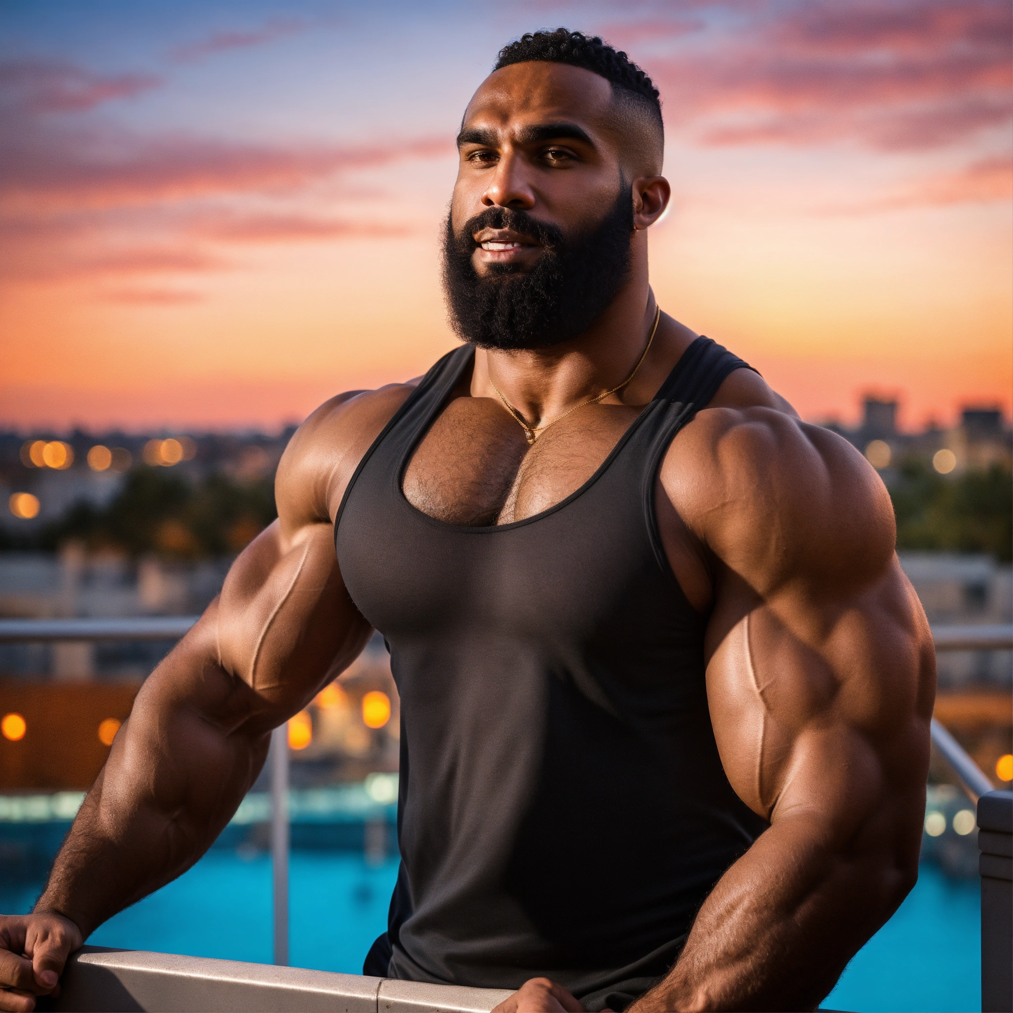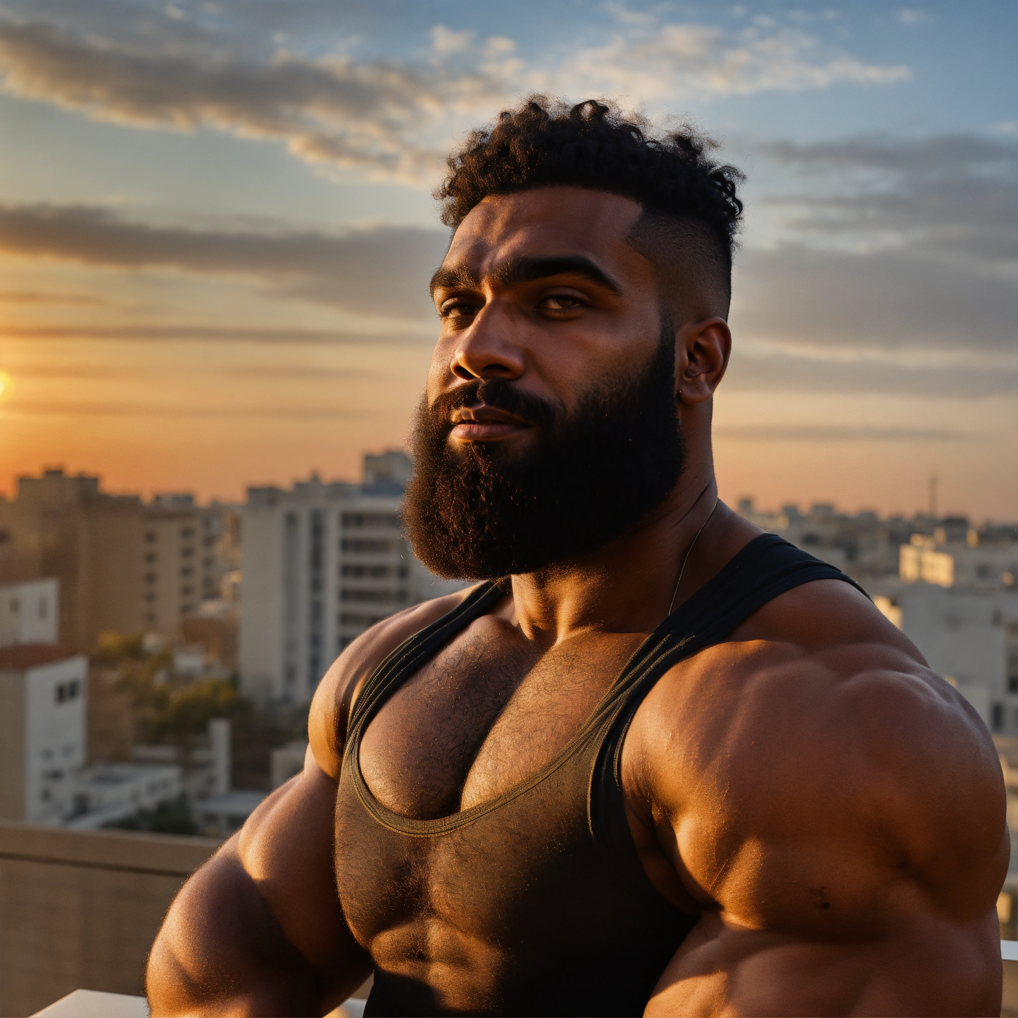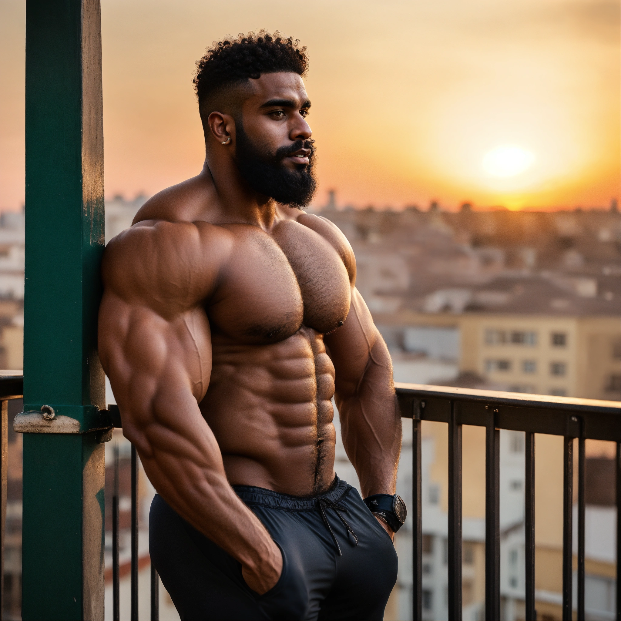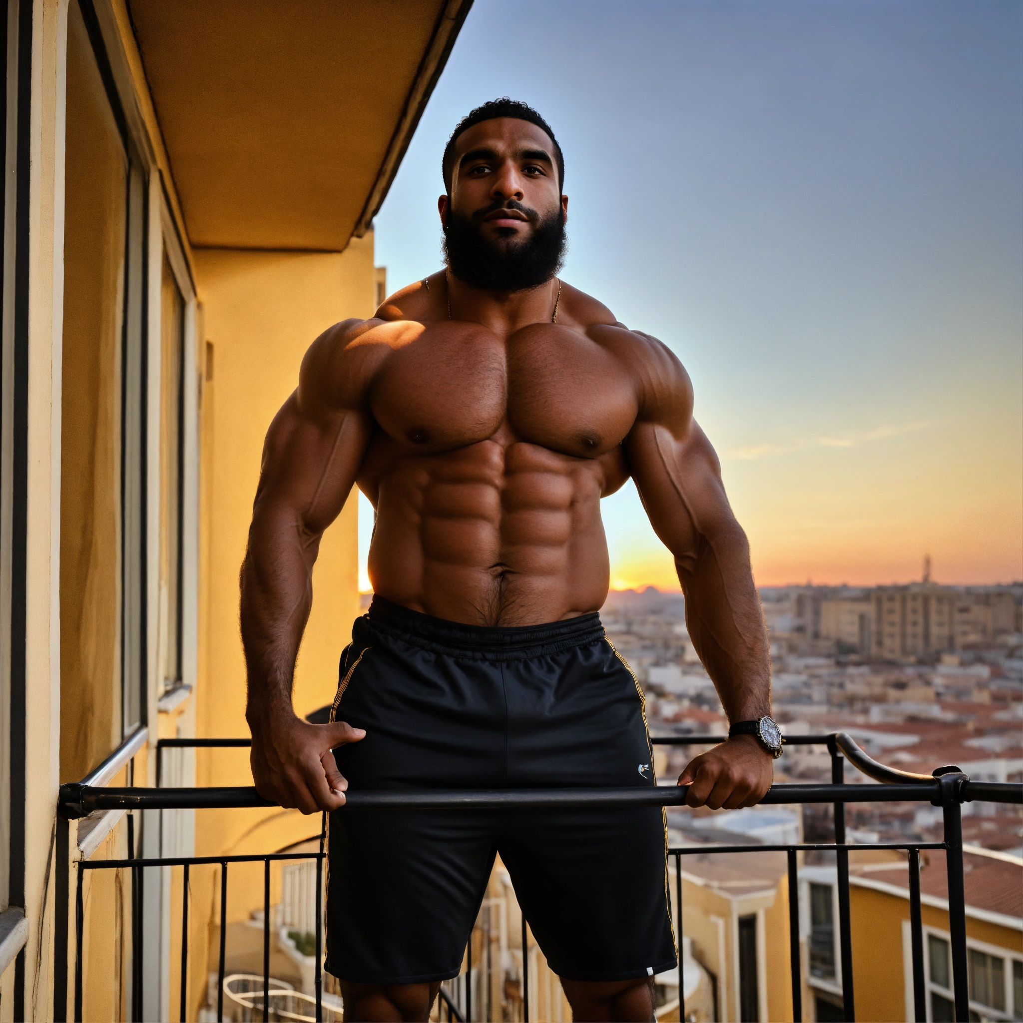 30-year-old hairy black arab man with big muscles, big bodybuilder, body like a wrestler, on a balcony at sunset