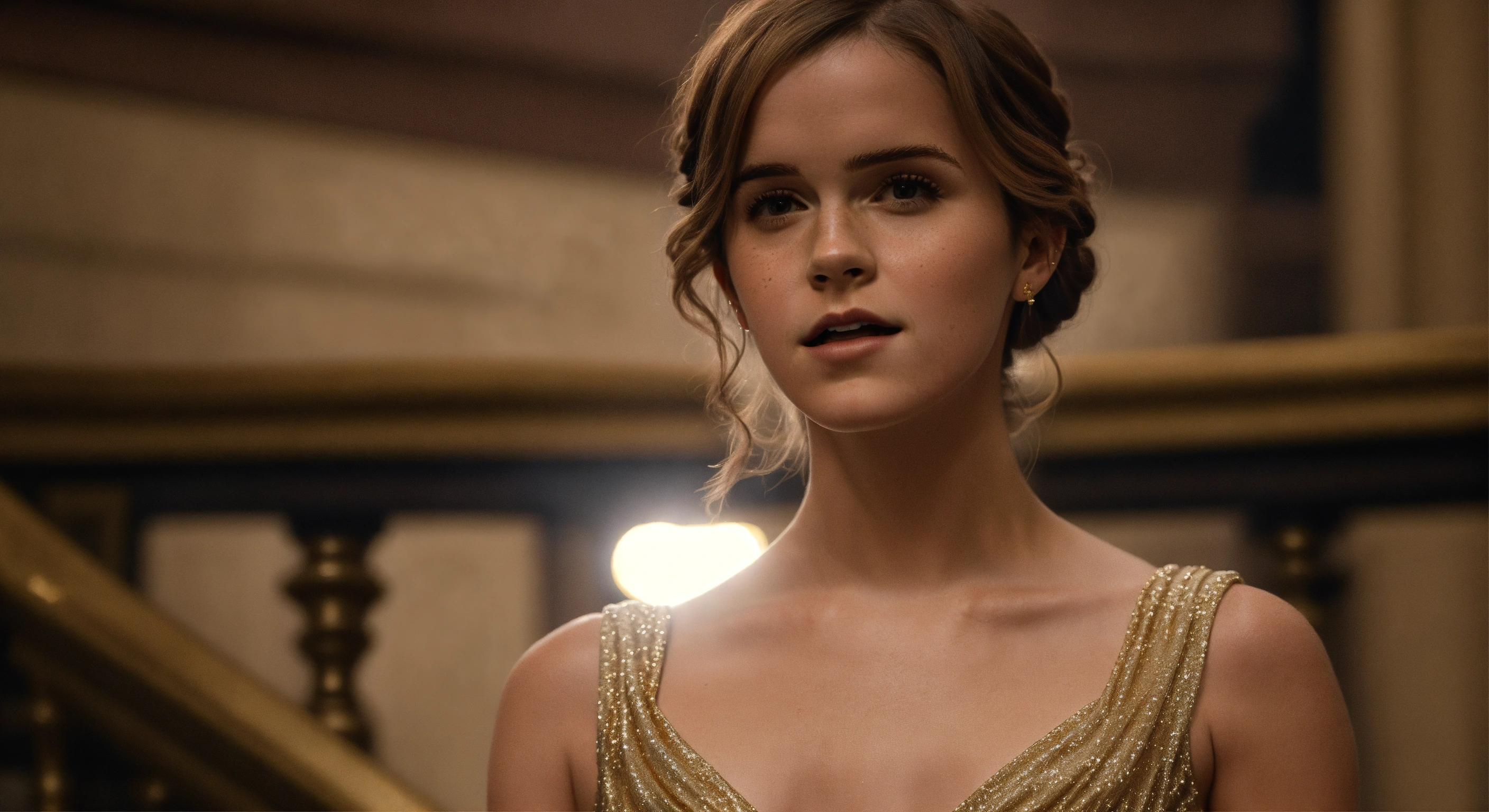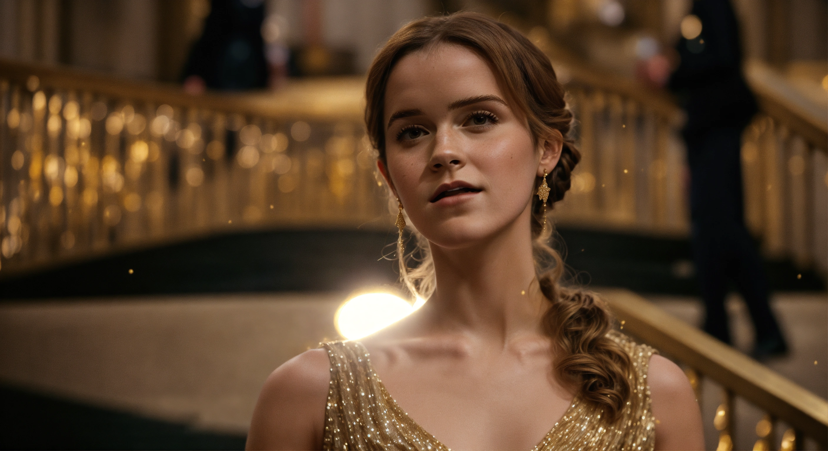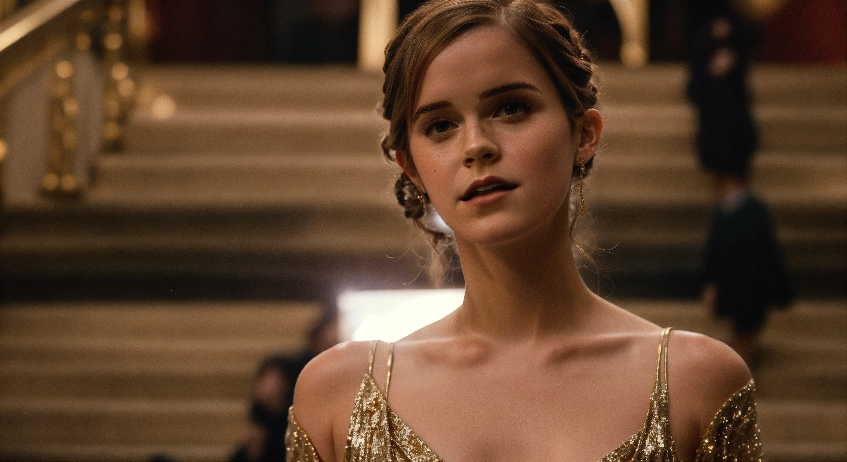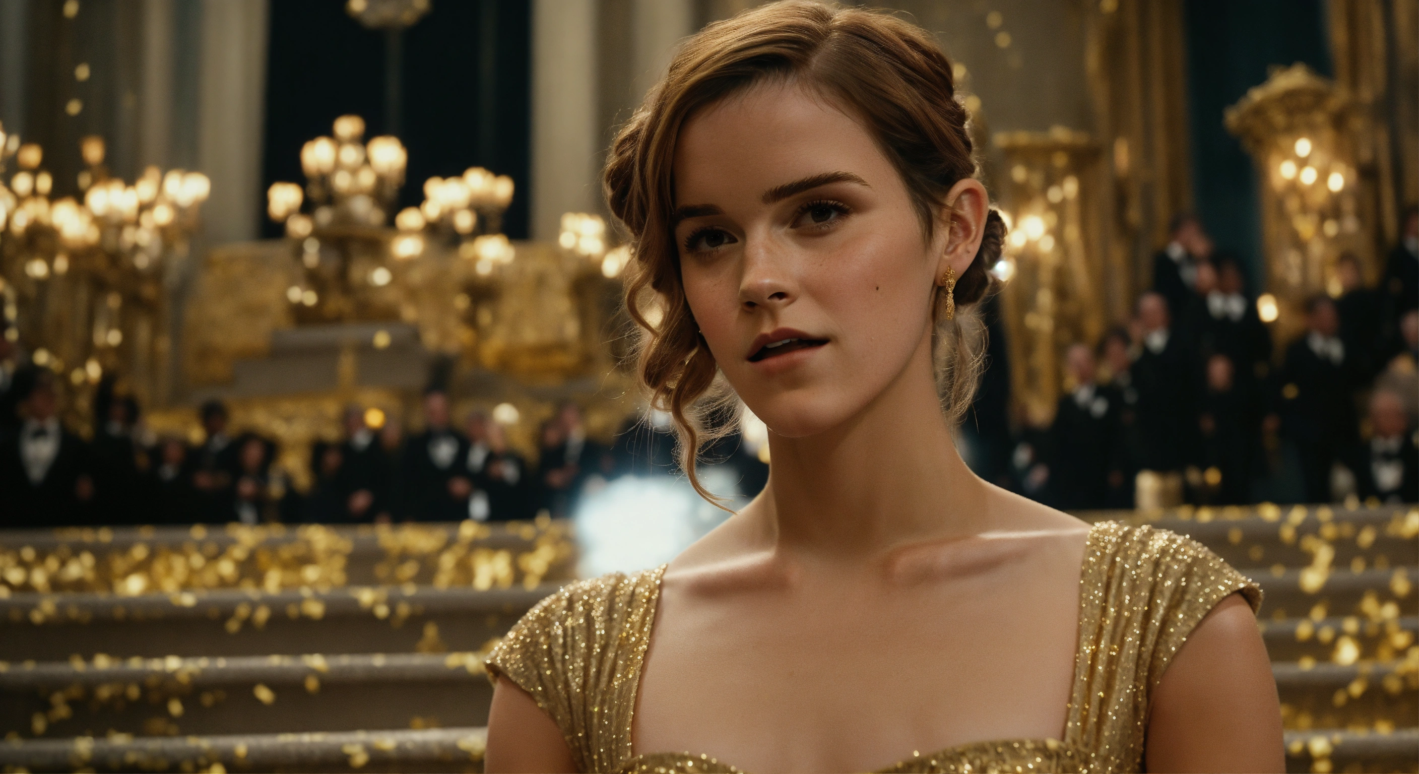 High quality, movie scene of emma watson as hermione granger with a curly updo in a gold sparkly dress walking down grand stairs at a white a gold gala on new years day. brown tones. 8k resolution. digital art, high quality, realistic, tv show lighting, perfect lighting, canon 35mm f2.0, natural lighting, film grain