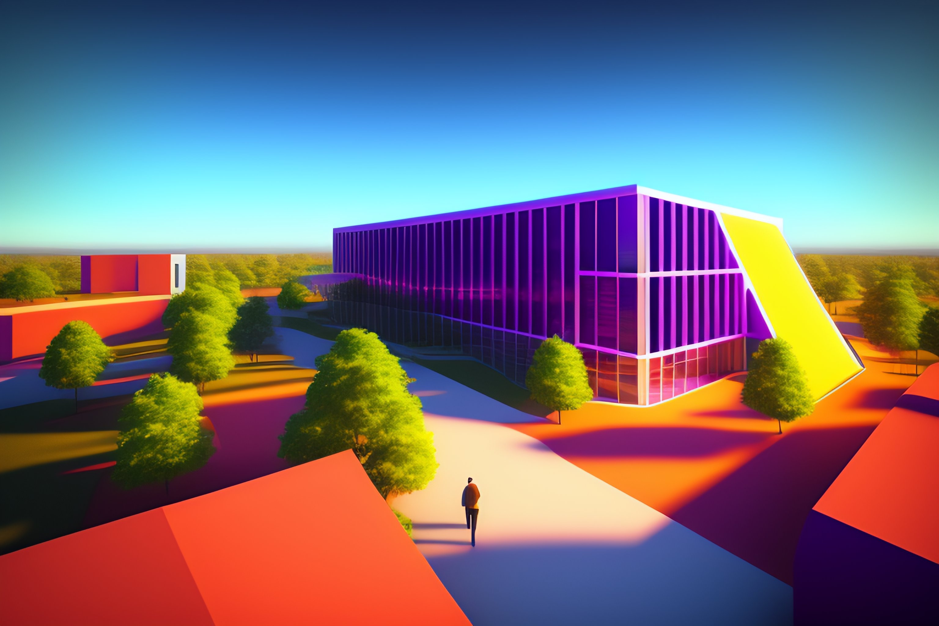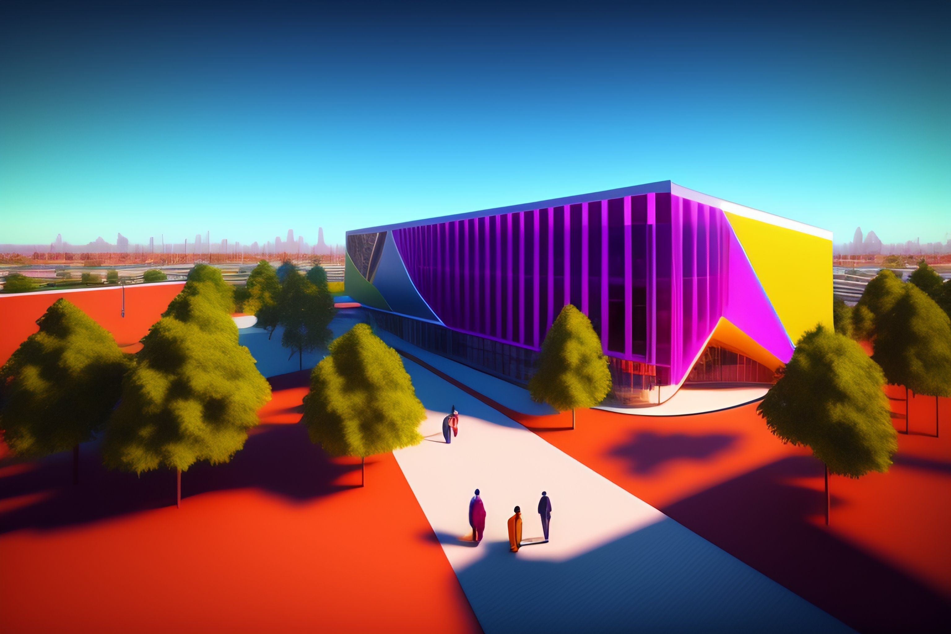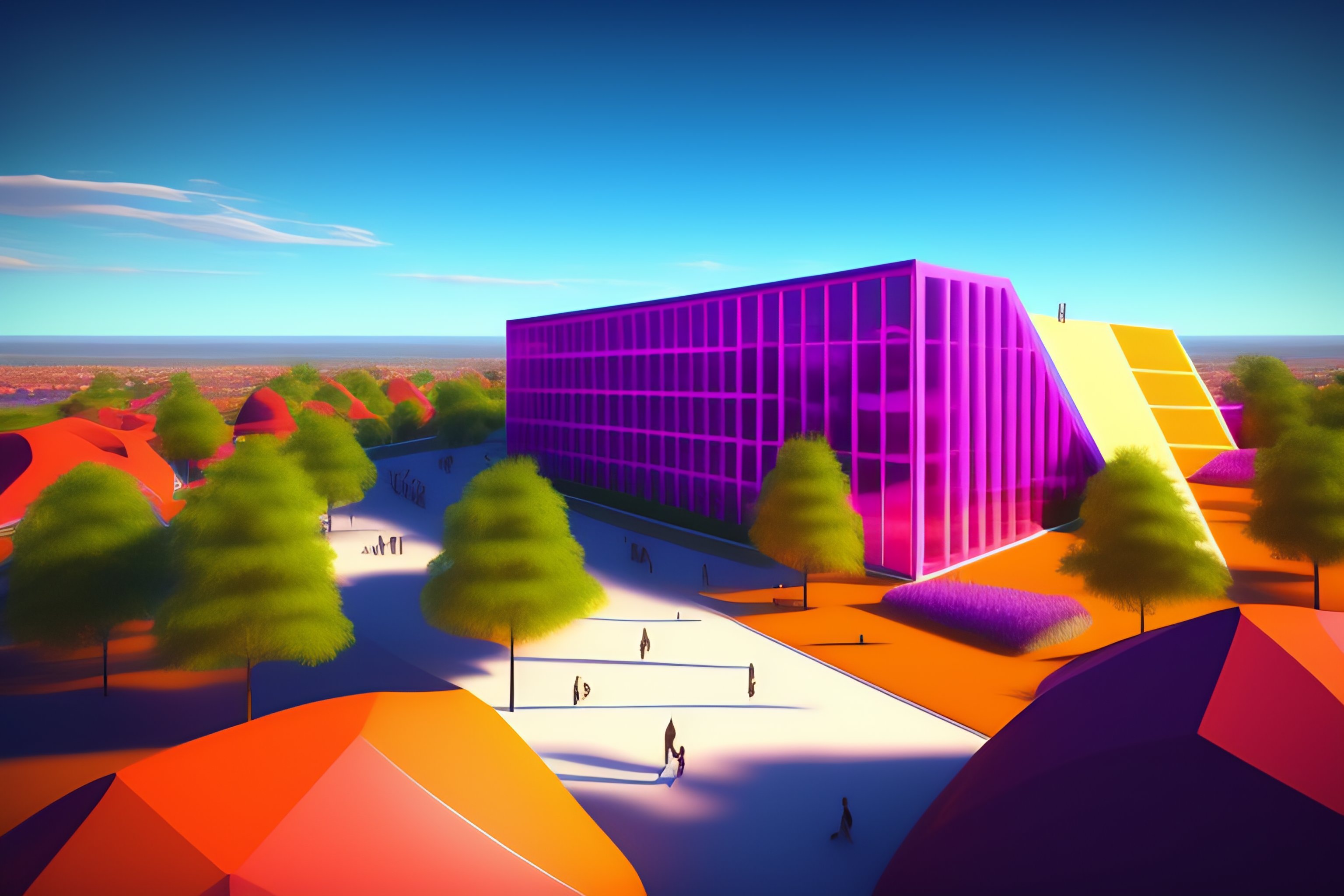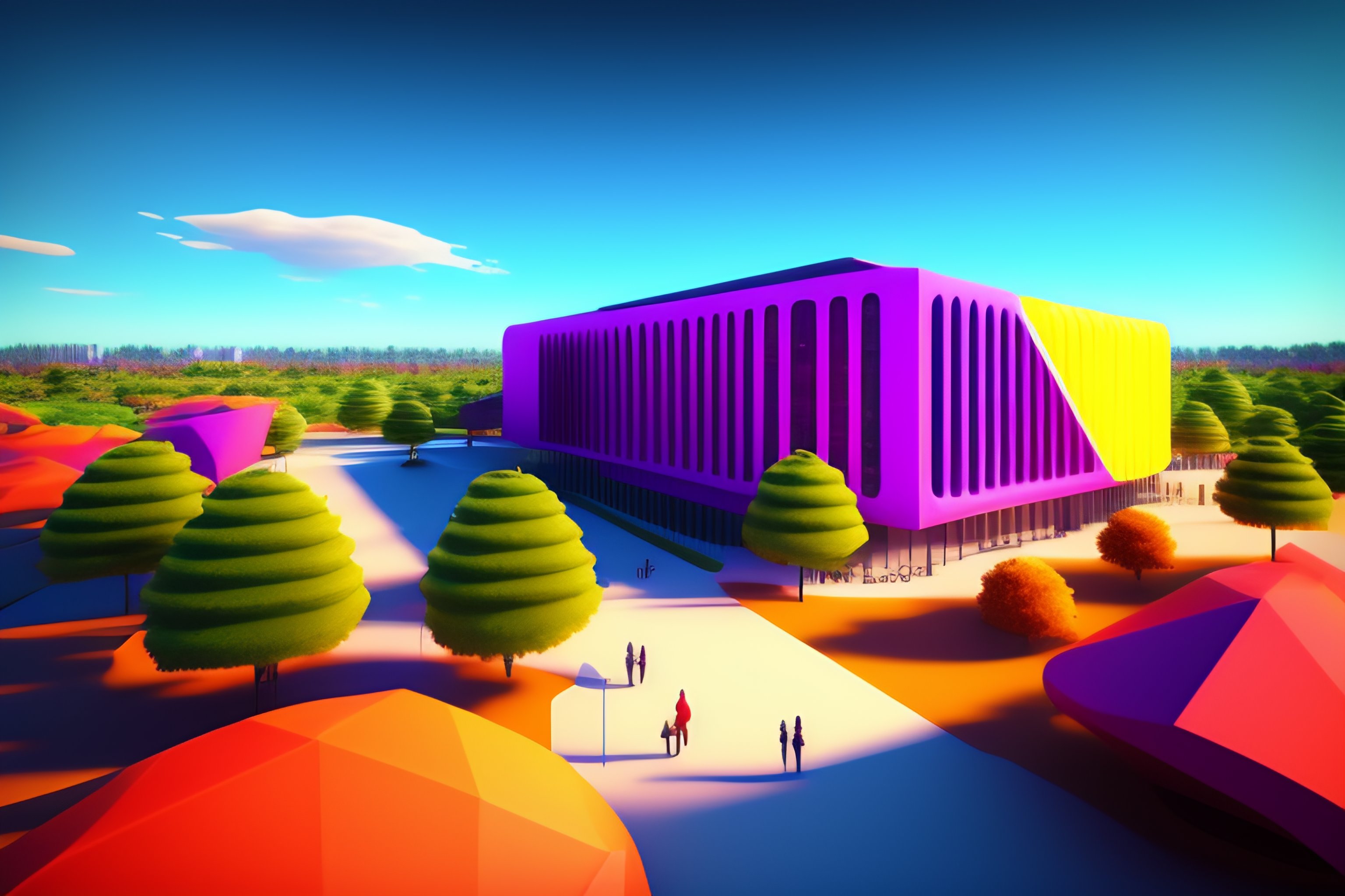 A modern building in a city landscape, low - poly, 3d, bright colours, depth, 4k, high res add a crowd of people having fun outside