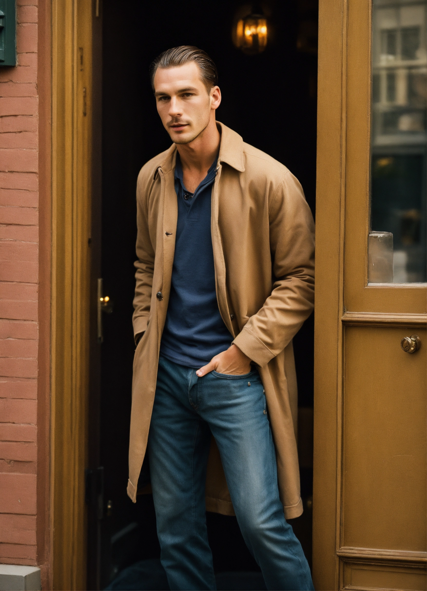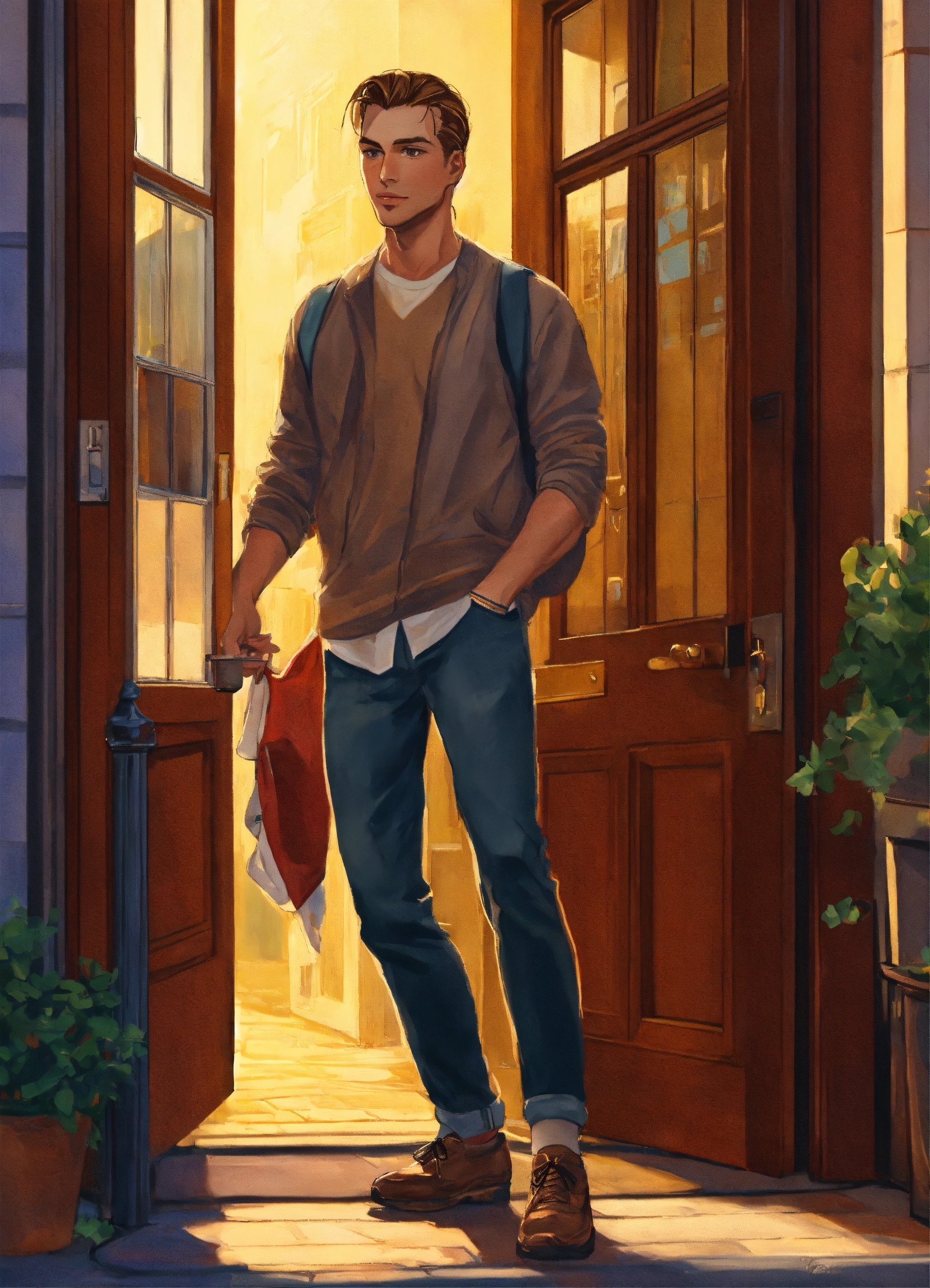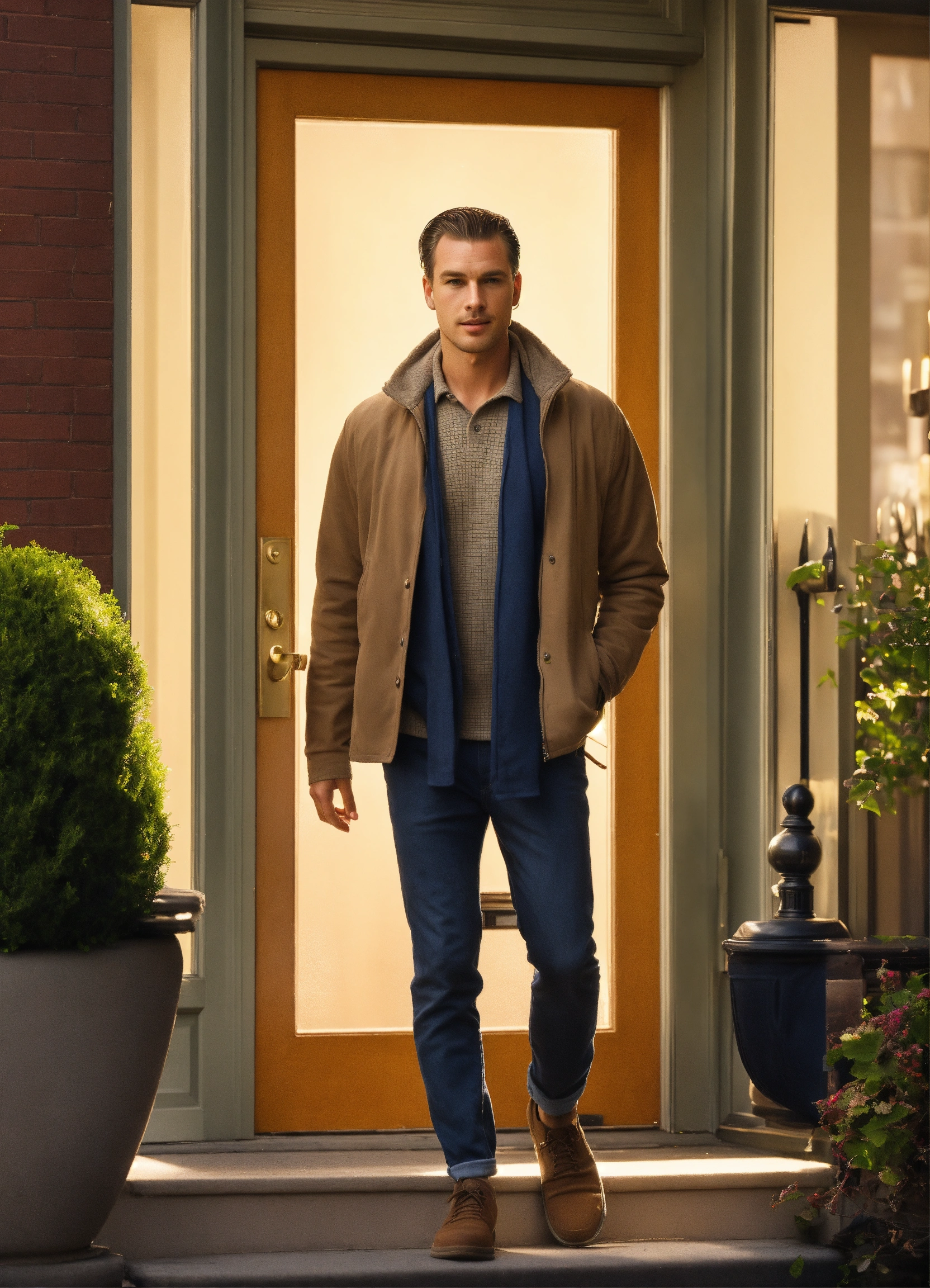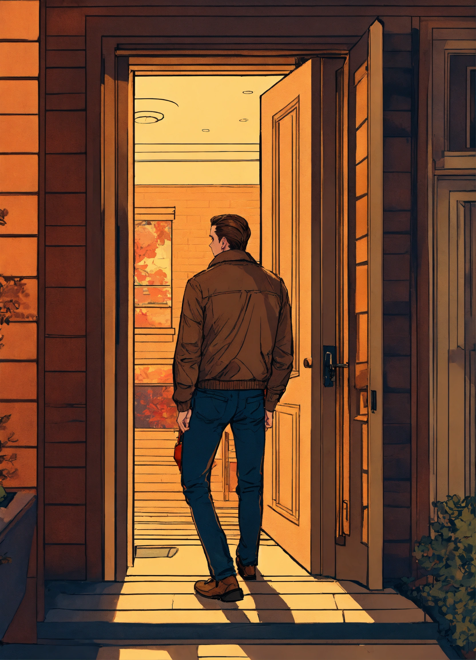 A german man with light brown hair, 6'2" with his hair slicked back, dressed in casual clothes, knocks on the door of a house on a random street in new york.