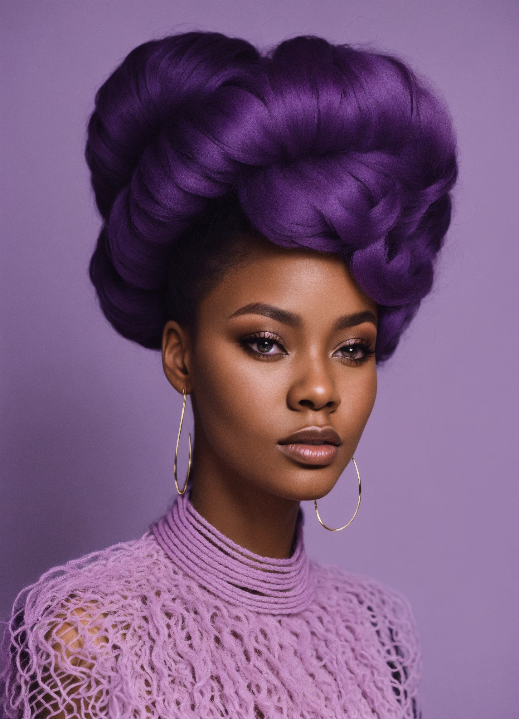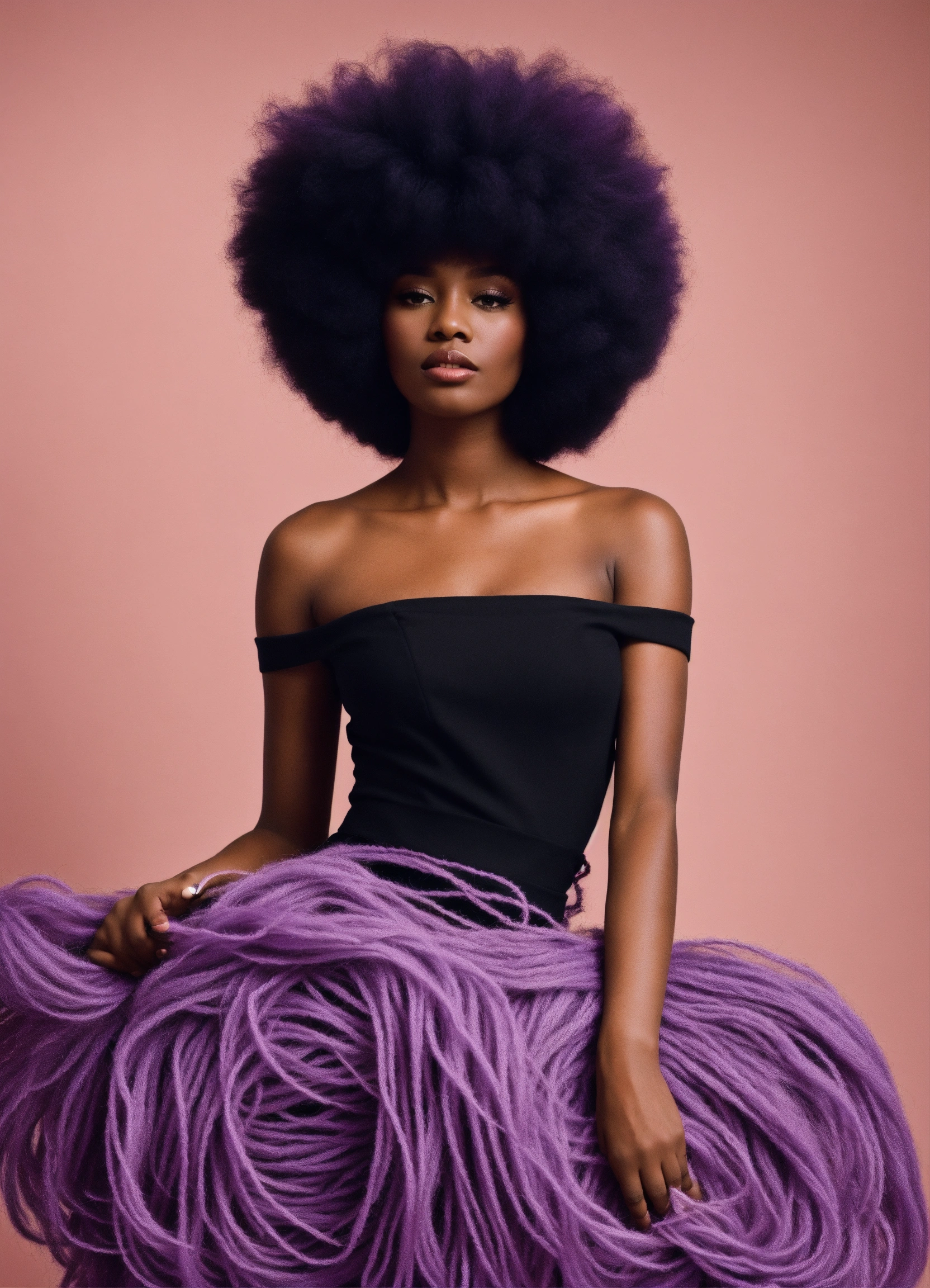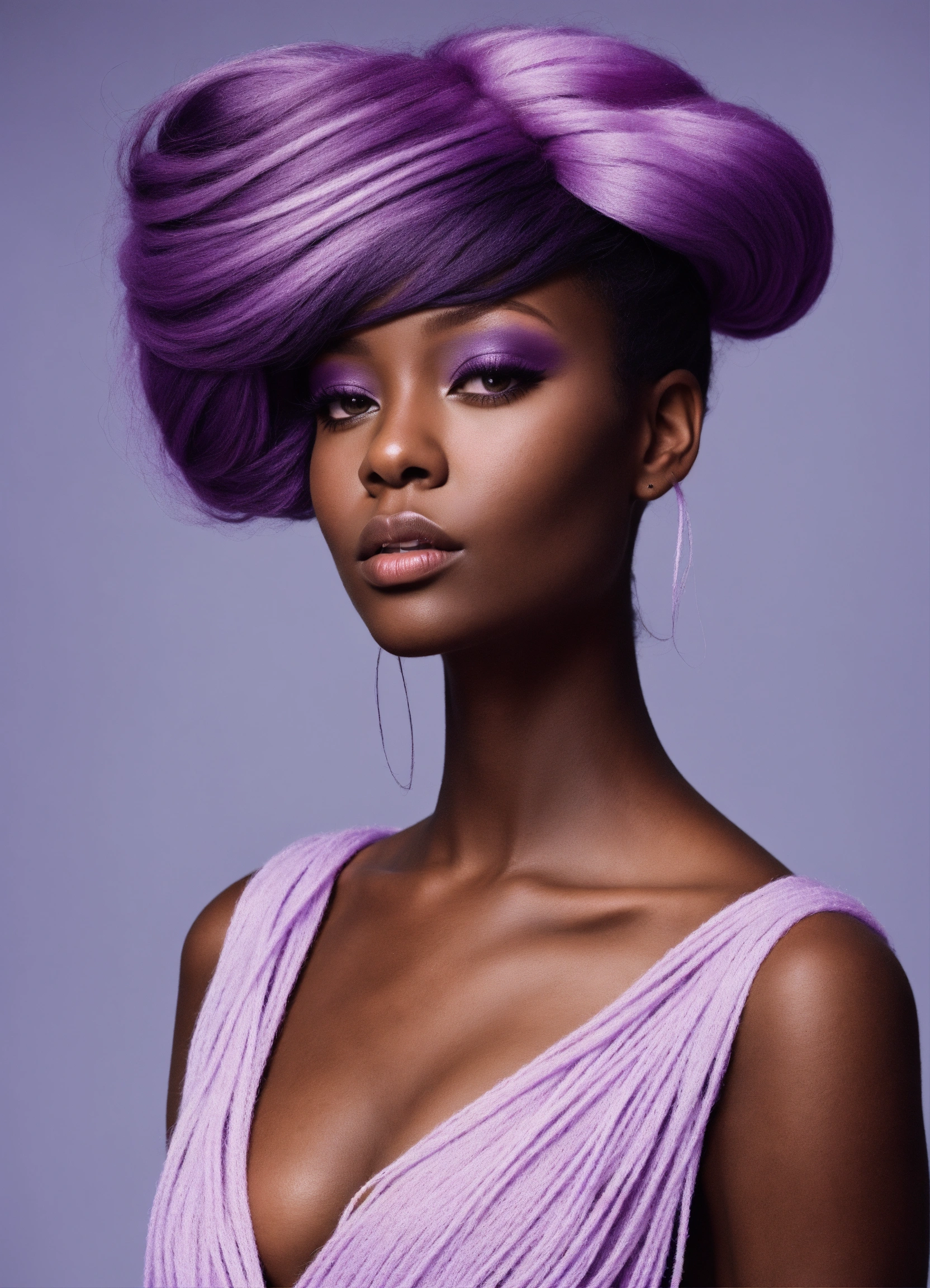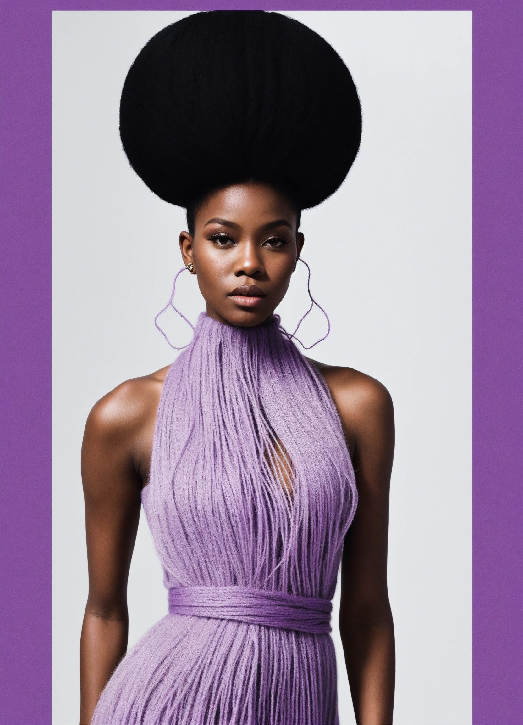 Photography, size 8 black woman with long flowing lilac yarn hair, minimal stylish avant-garde outfit in the style of 60’s mod fashion, a detailed line art, fine details