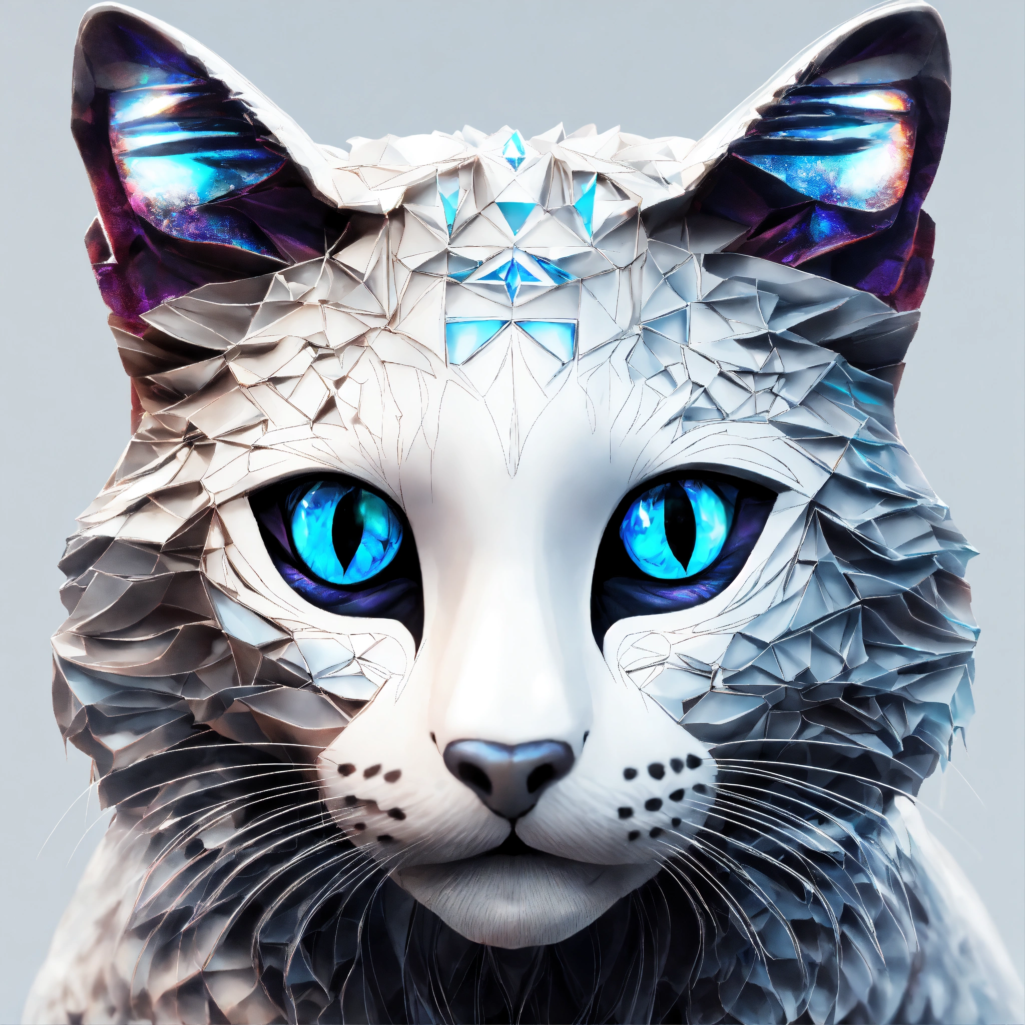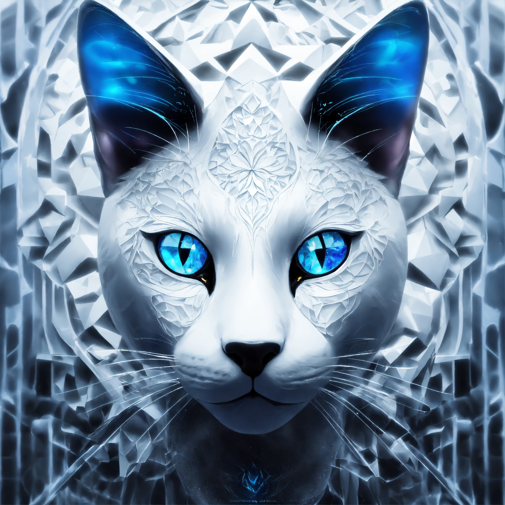 On white background, underwater photography, long exposure, a graceful elegant smiley white and black cosmic mystic female cat face portrait facing front, blue eyes. front view. front portrait, no angle. cartoon style. backlit. sacred geometry patterns on the face, in the style of disney, pixar, tim burton, beauty and the beast, and peter pan. crystal on the forehead. enchanting glowing aura. fractal, volumetric lighting, and the power of the god. white background, no background, zero background, 0 background. nothing around the face.