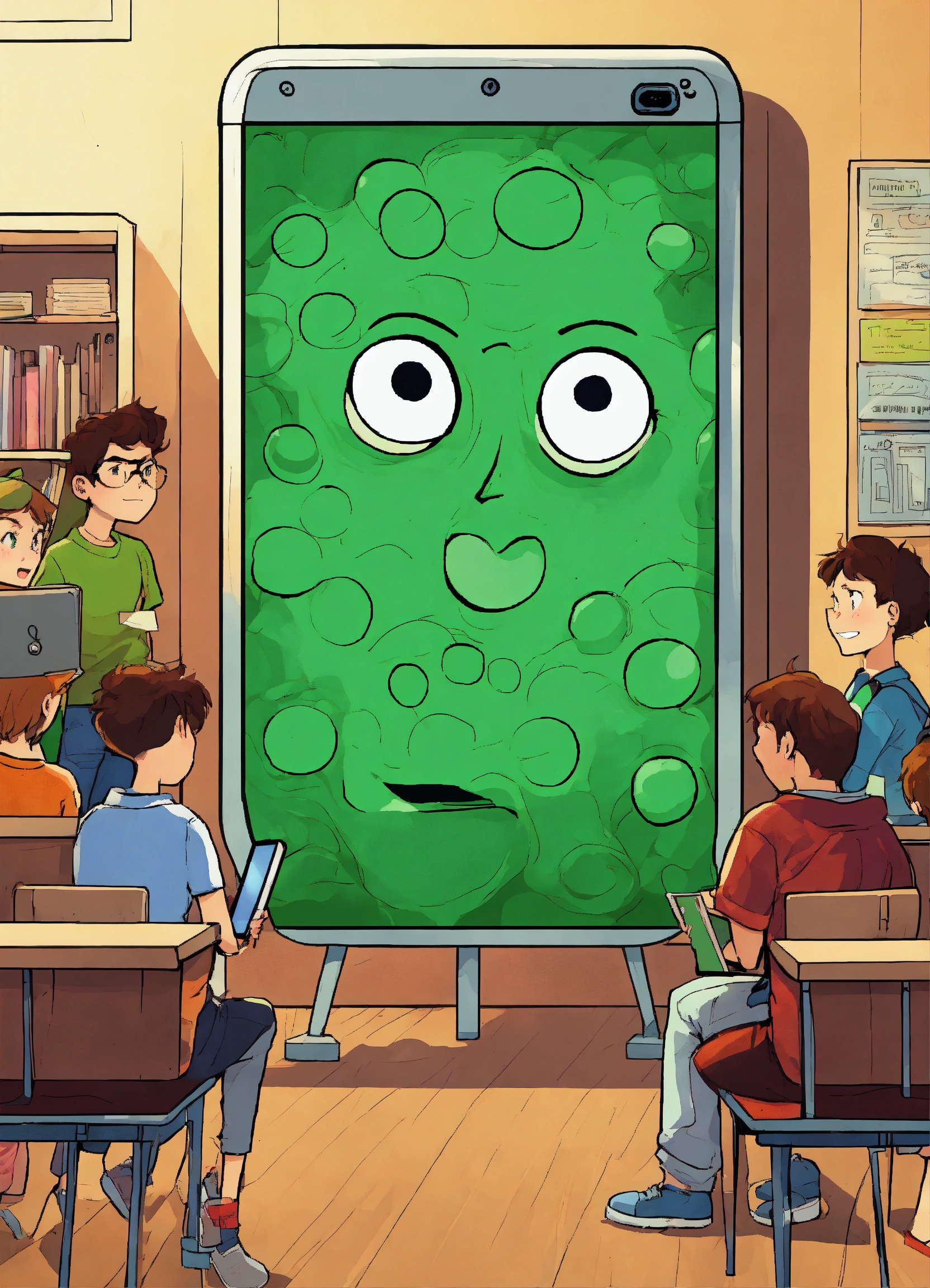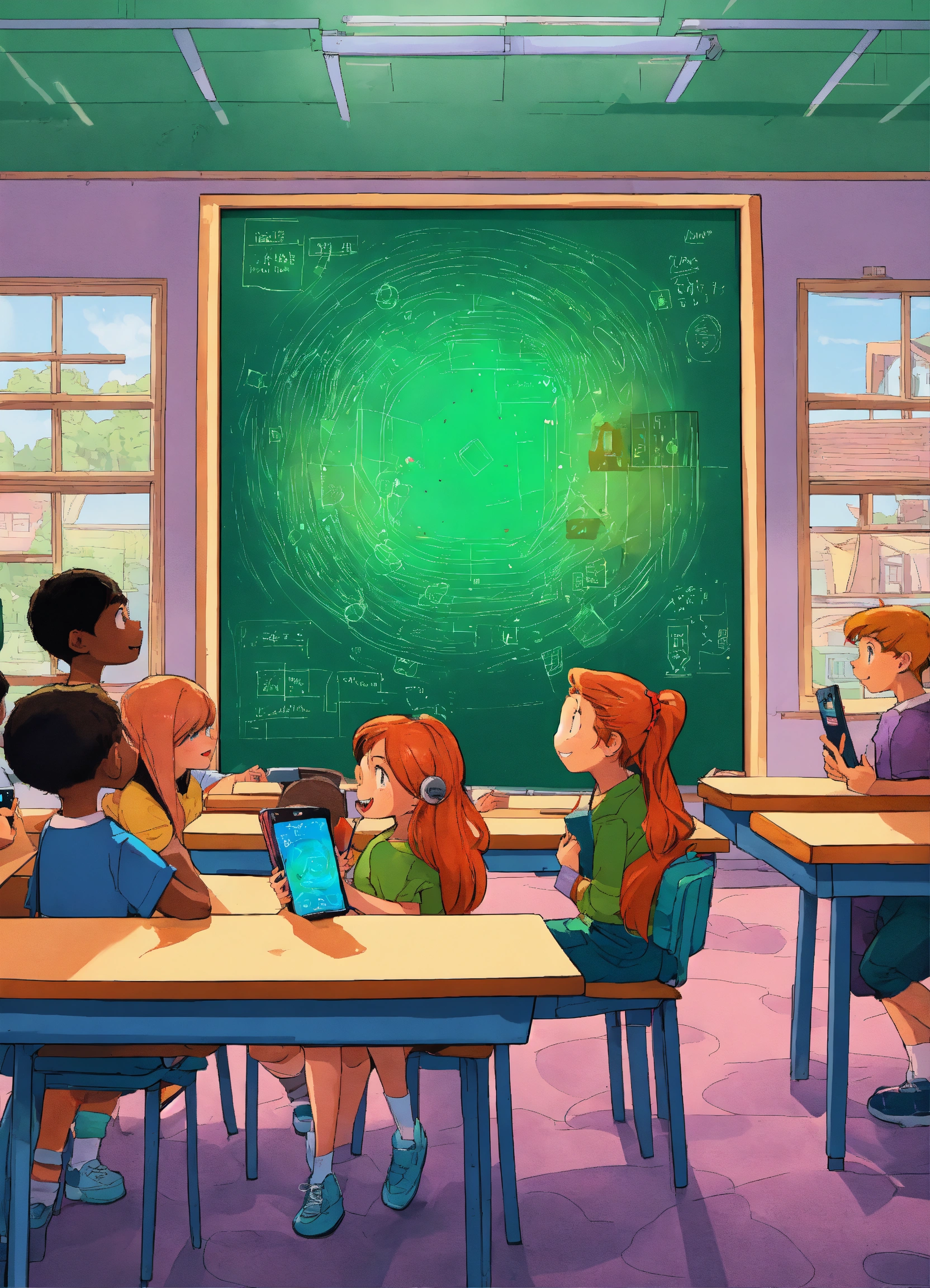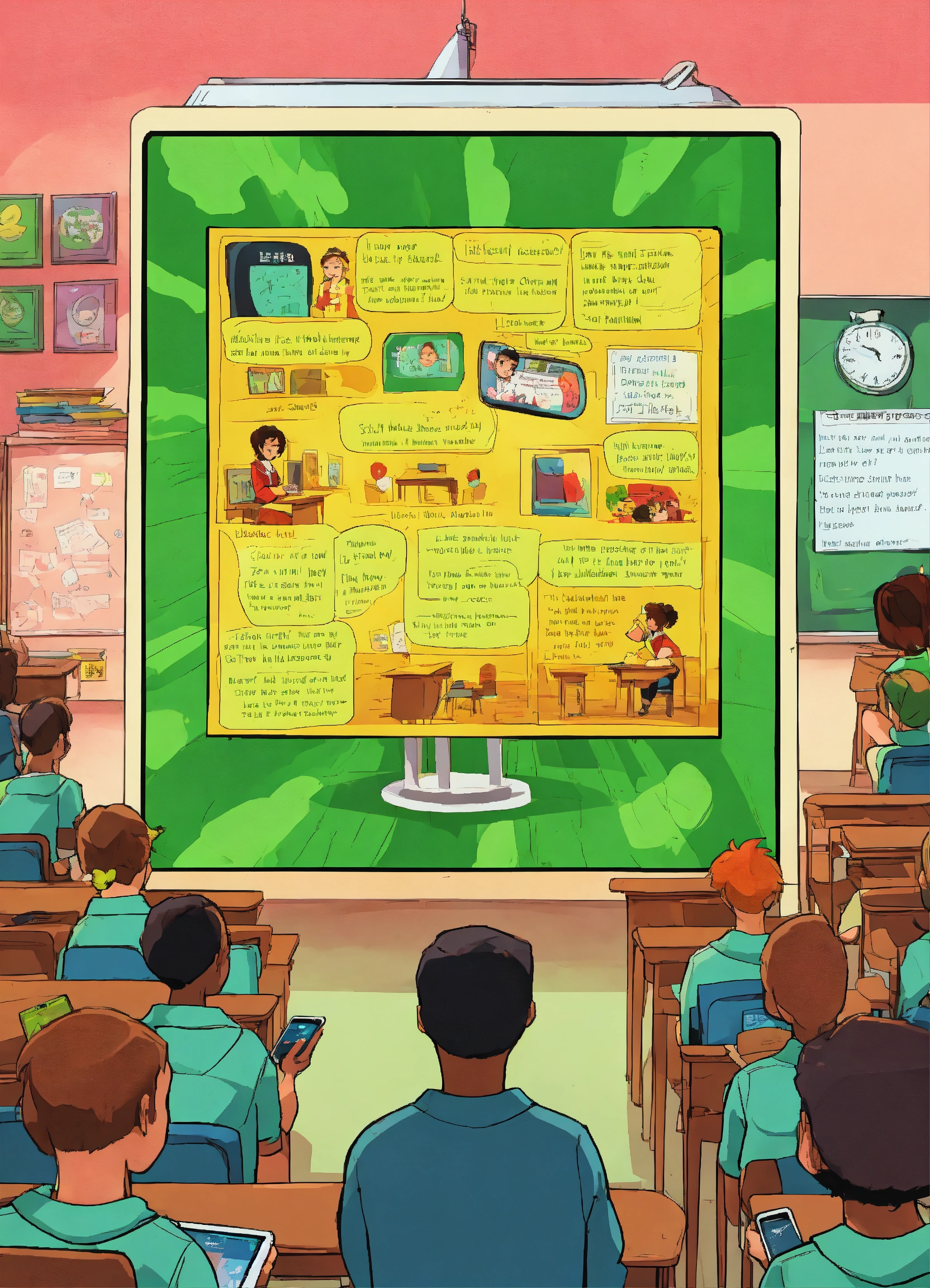 Design a comic cartoon poster showcasing a classroom scene where the blackboard is a giant cell phone screen, with students' eyes locked onto it, their faces glowing an unnatural green, highlighting their absorption and isolation
