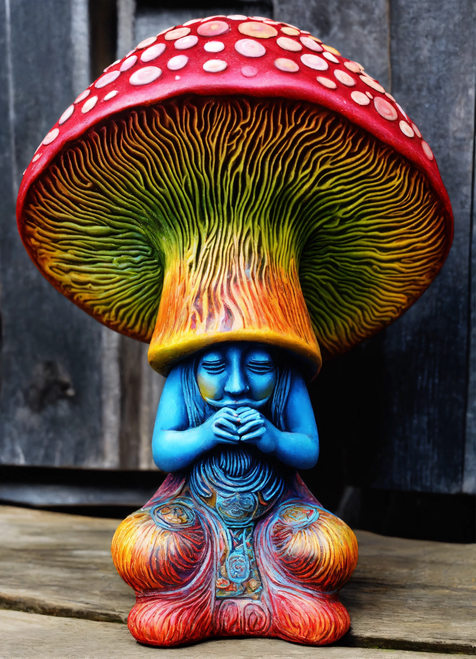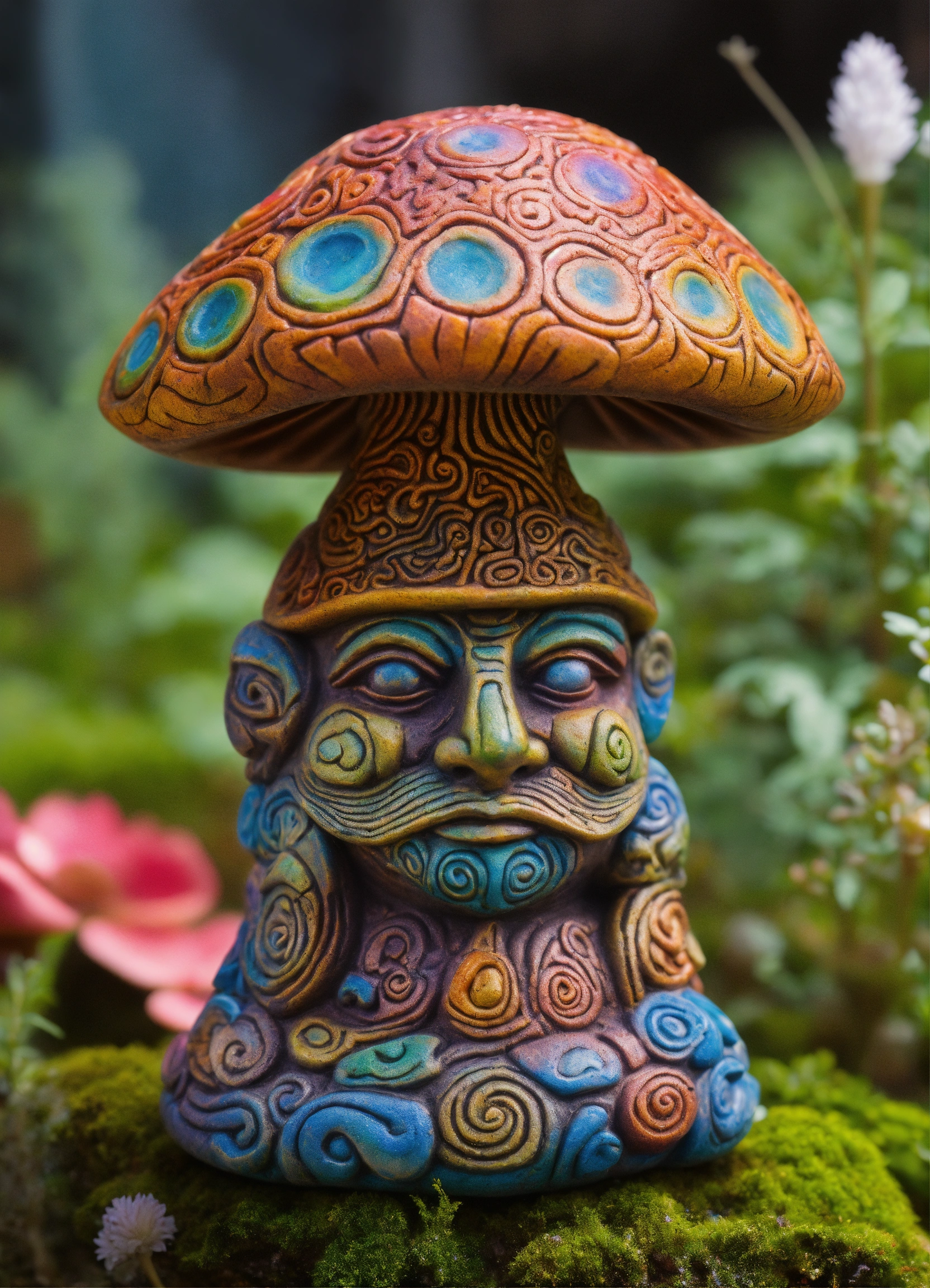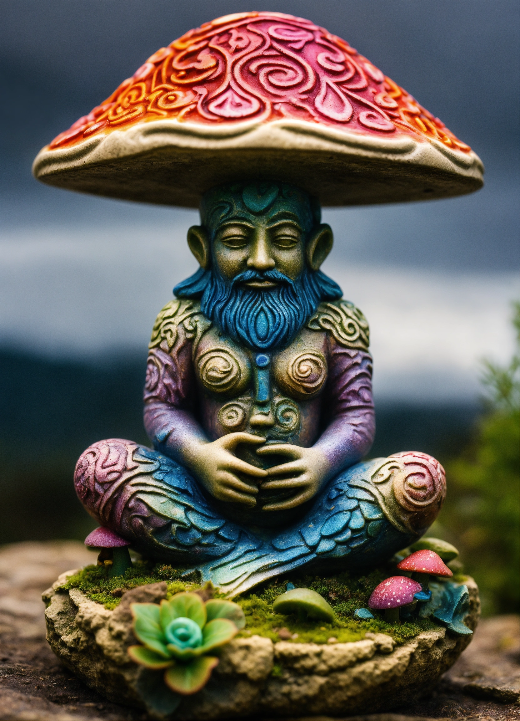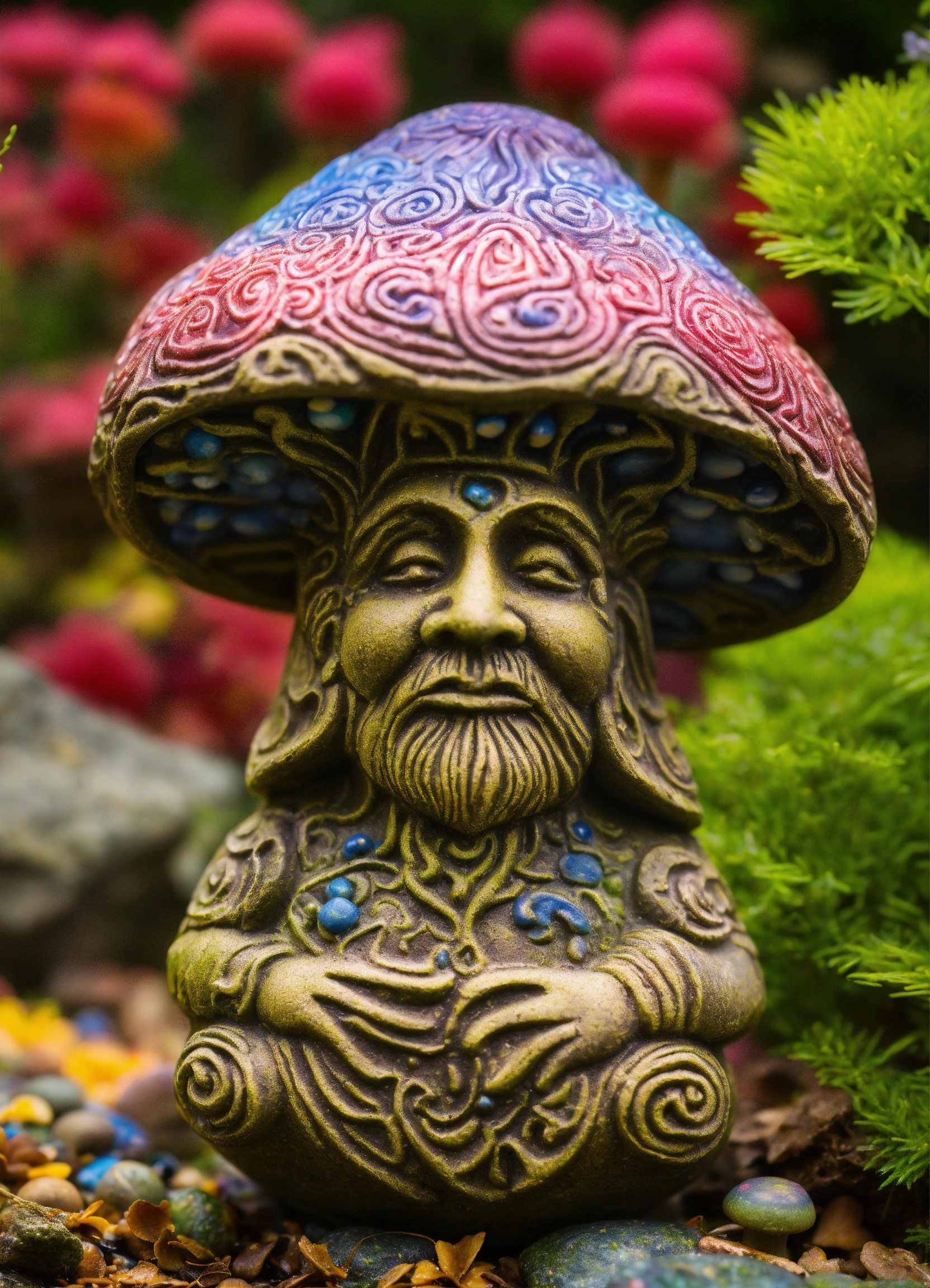 An ancient stone meditative lsd magic mushroom gnome totem garden ornament style of alex grey