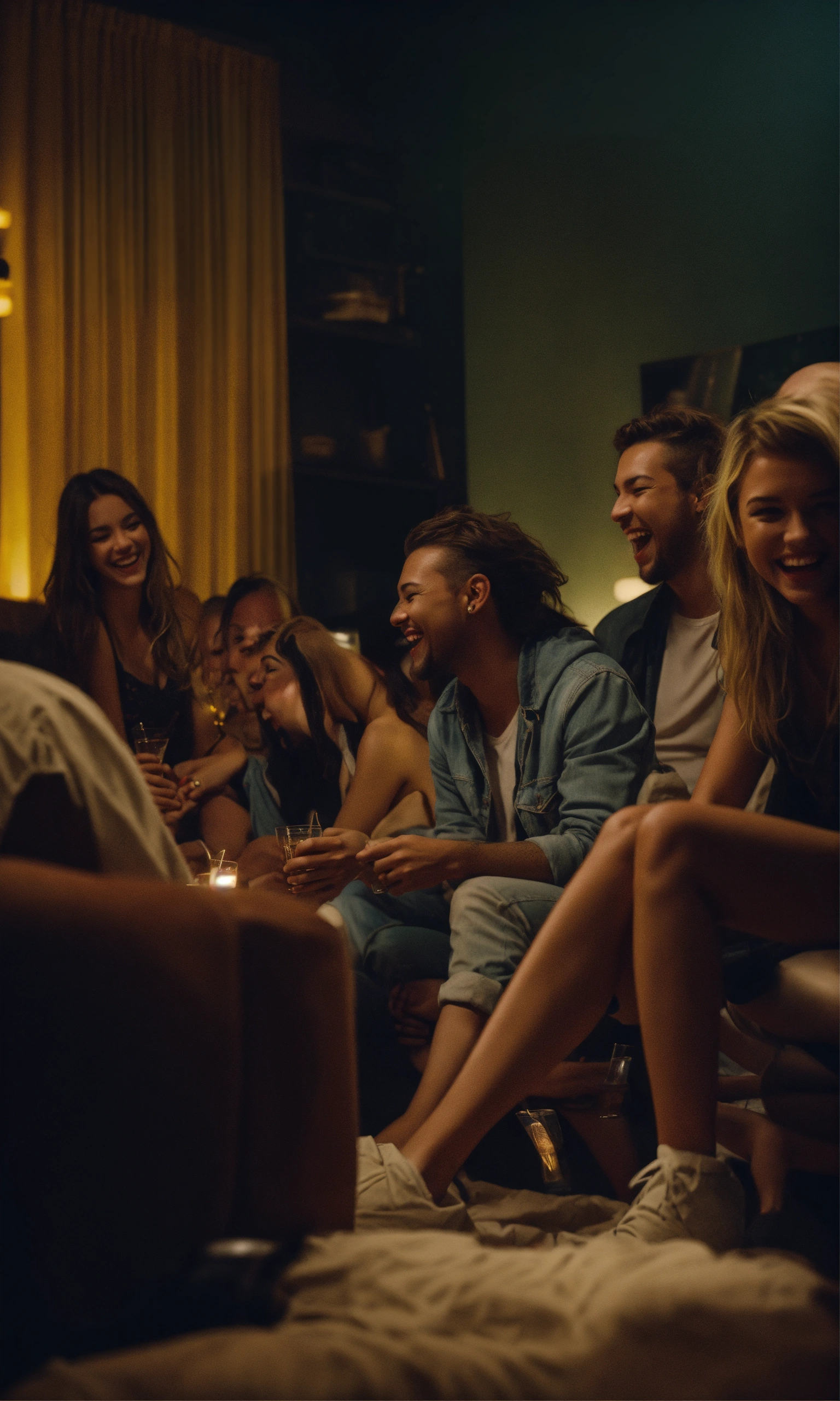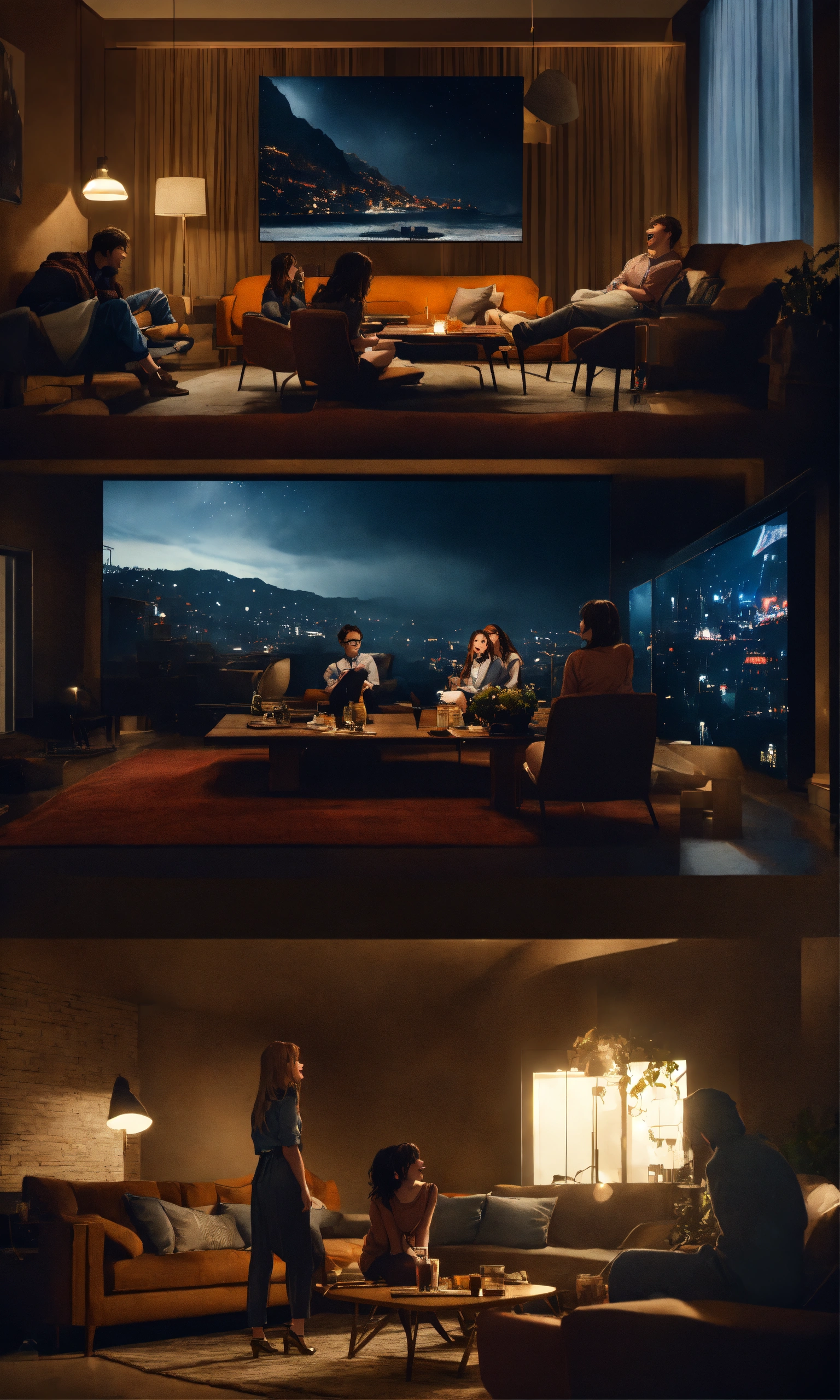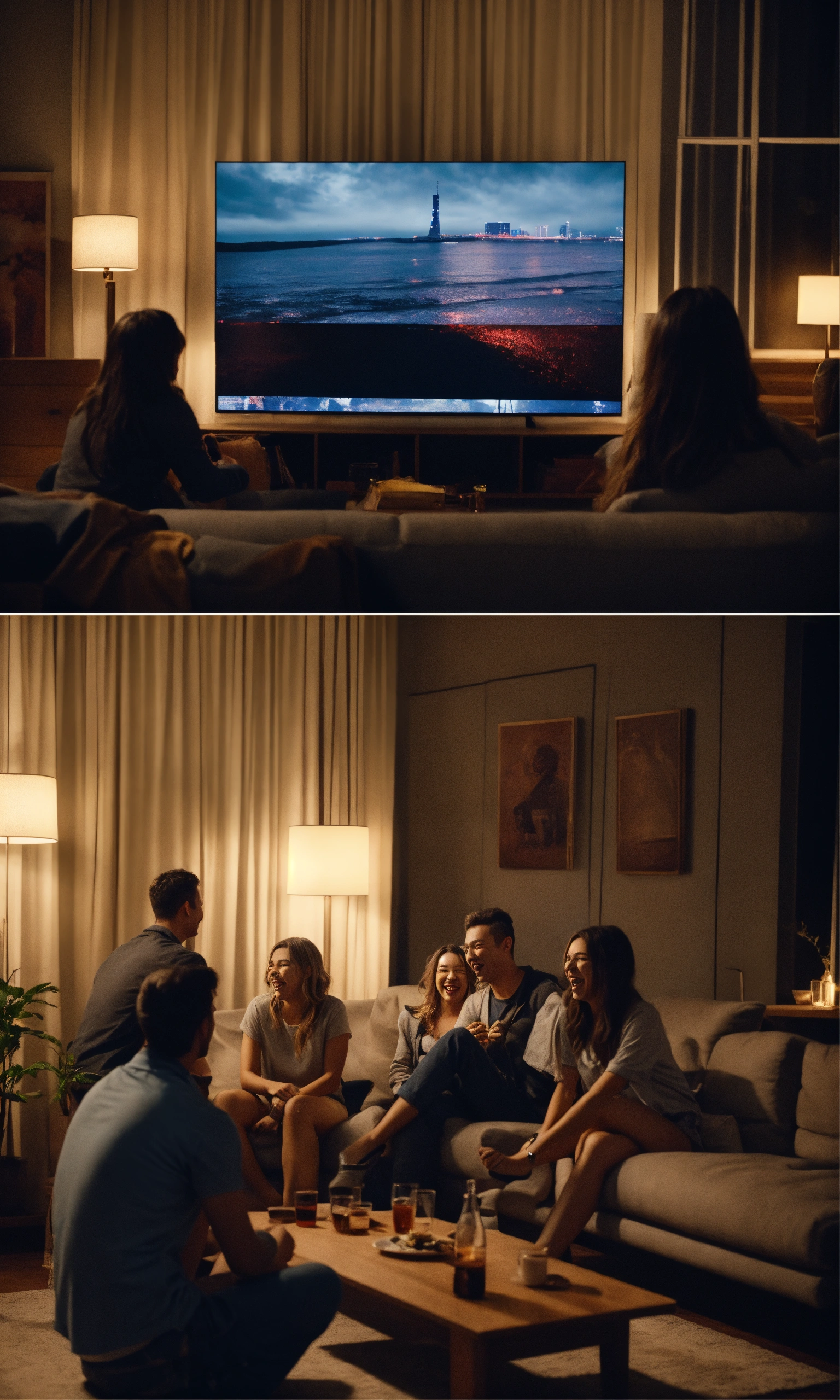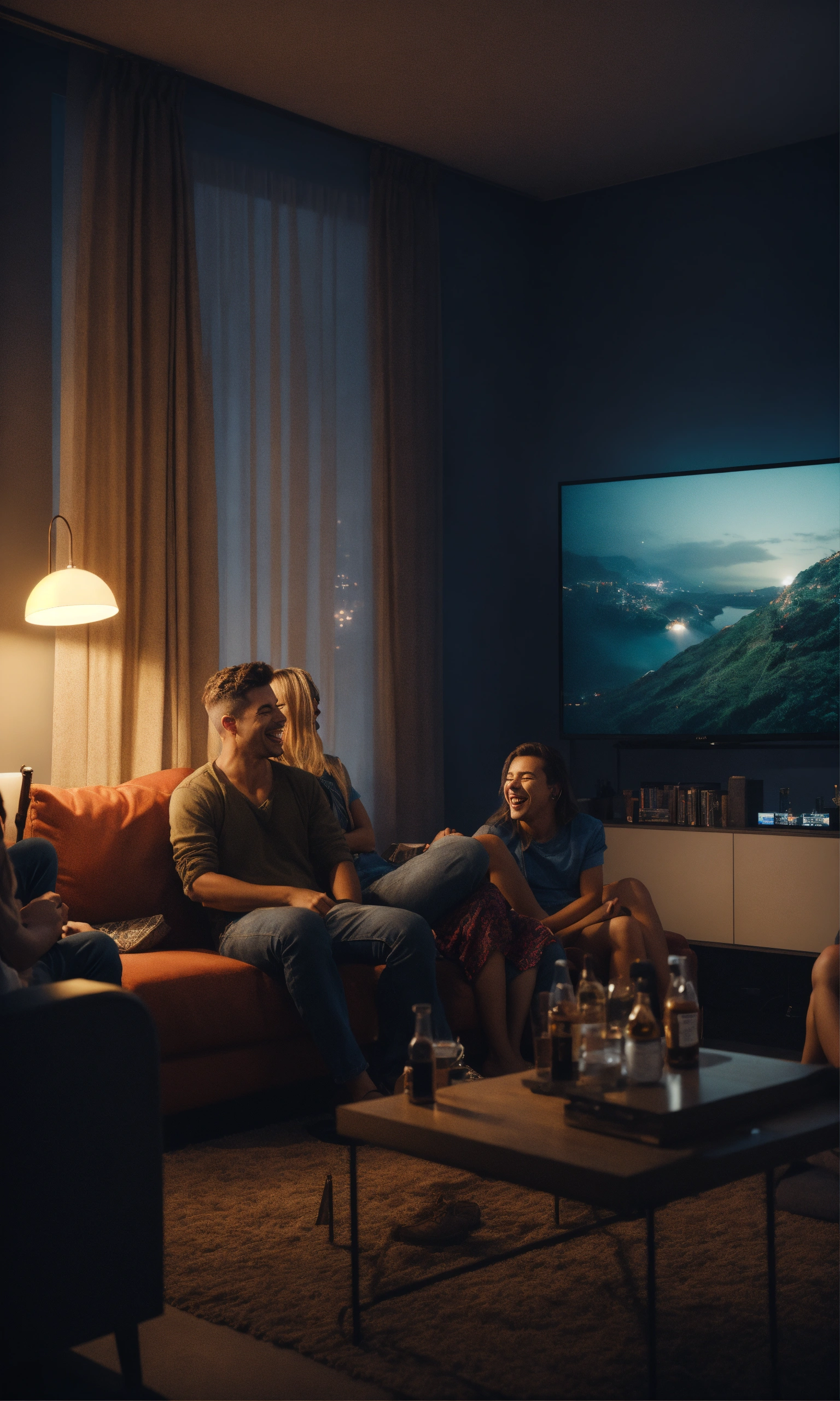 A group of friends with 2 girl and 3 guys watching tv laughing loudly, interior night time, dark lighting, front shot, 8k, luxcorerender, earthly colour, cinematic photography, real humans, real images, matte finish, shot on arri anamorphic, extreme wide shot, smooth, sharp focus, ornate, highly dynamic, particulate, hyperreal, wide shot