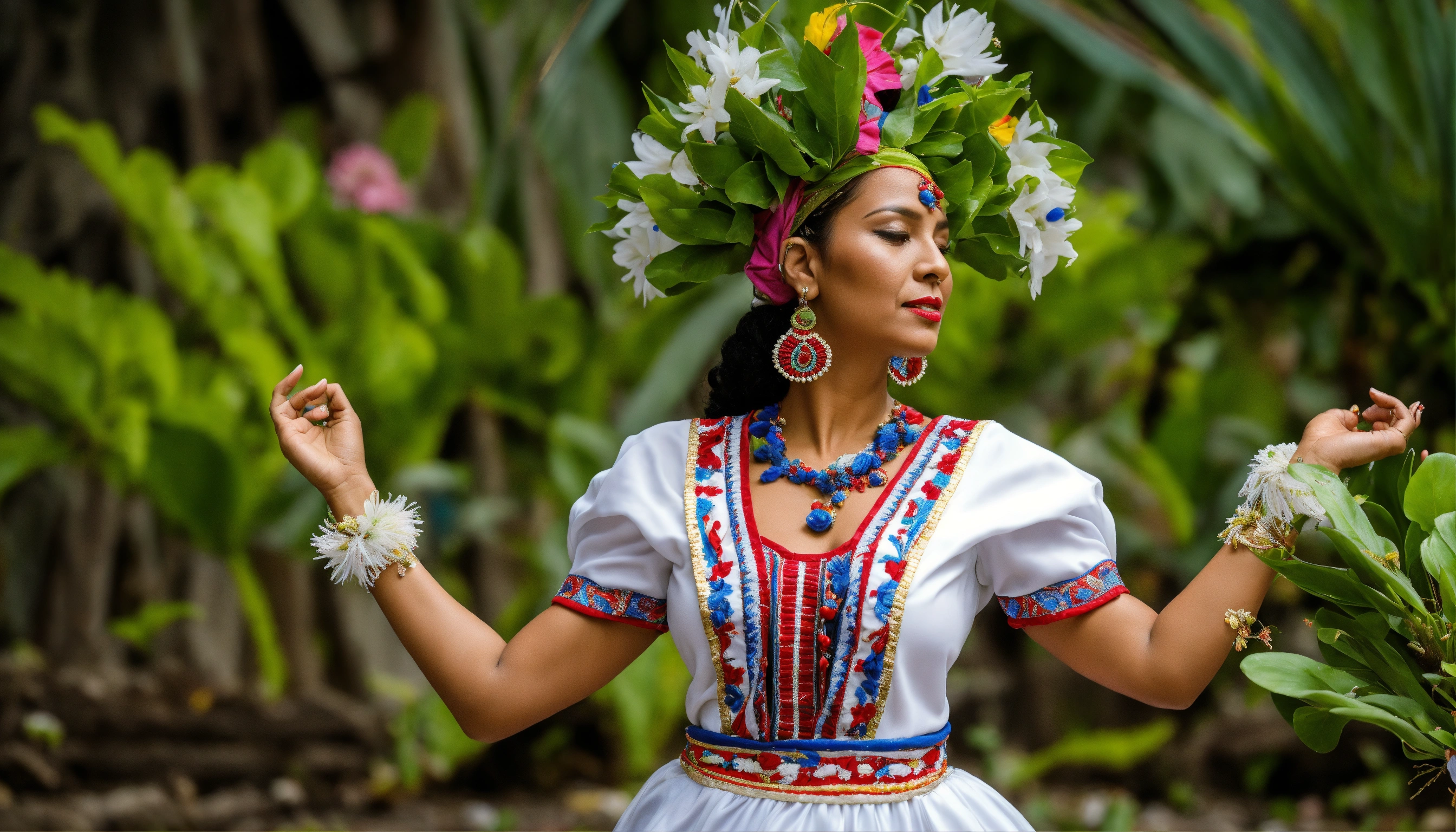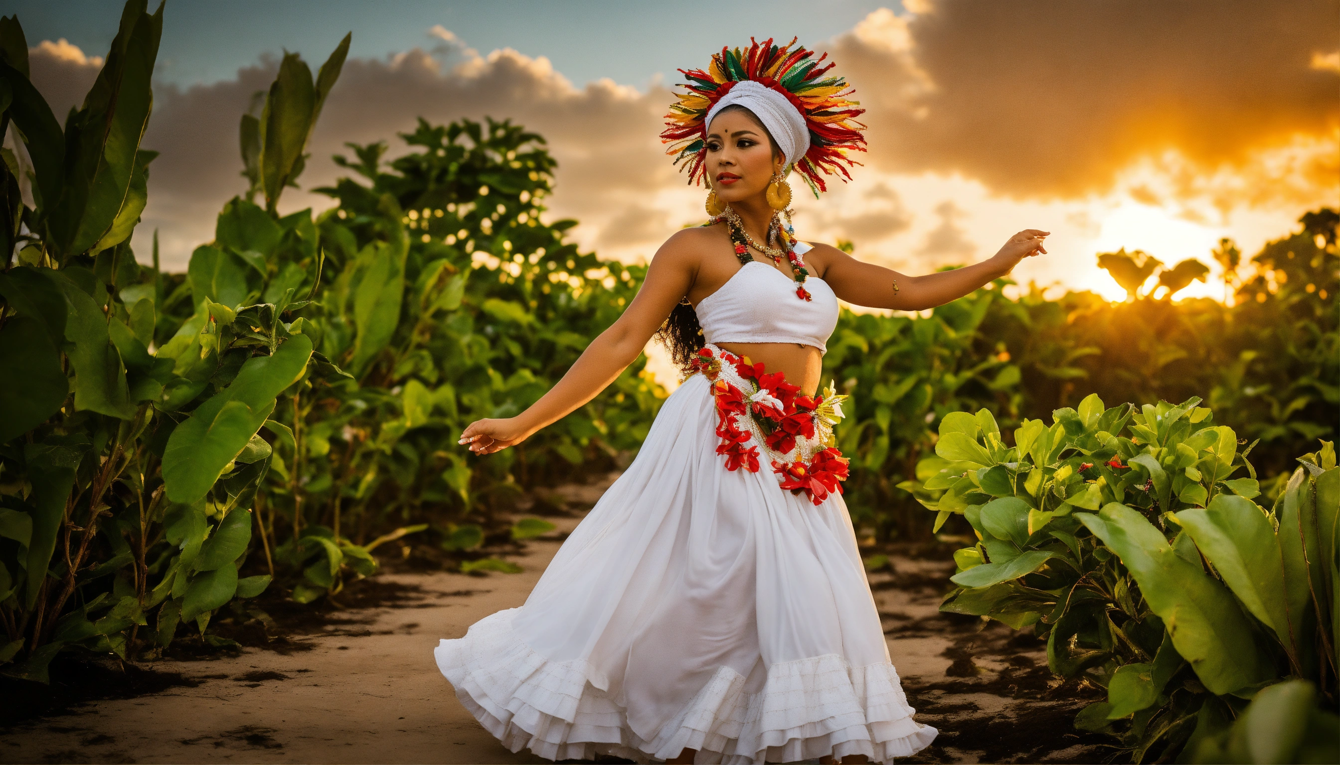 Traditional bomba y plena dancer from puerto rico, she is wearing traditional white bomba dress and head wrap, shes giving life to the plants around her as she’s dancing, keep the design simple