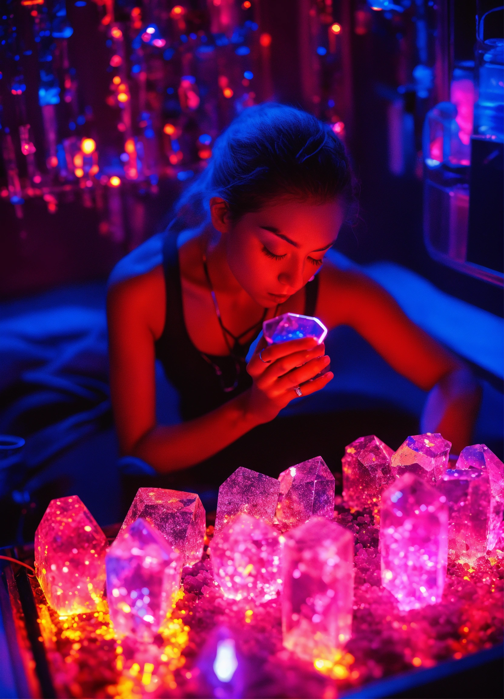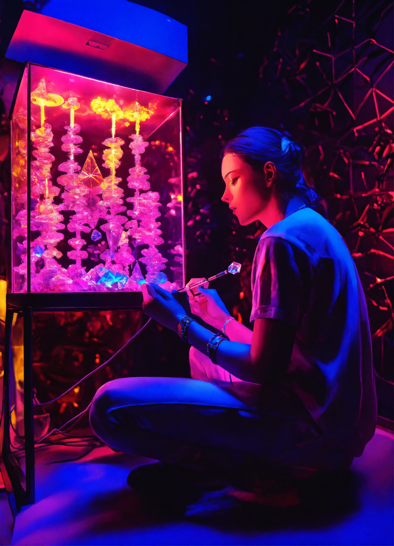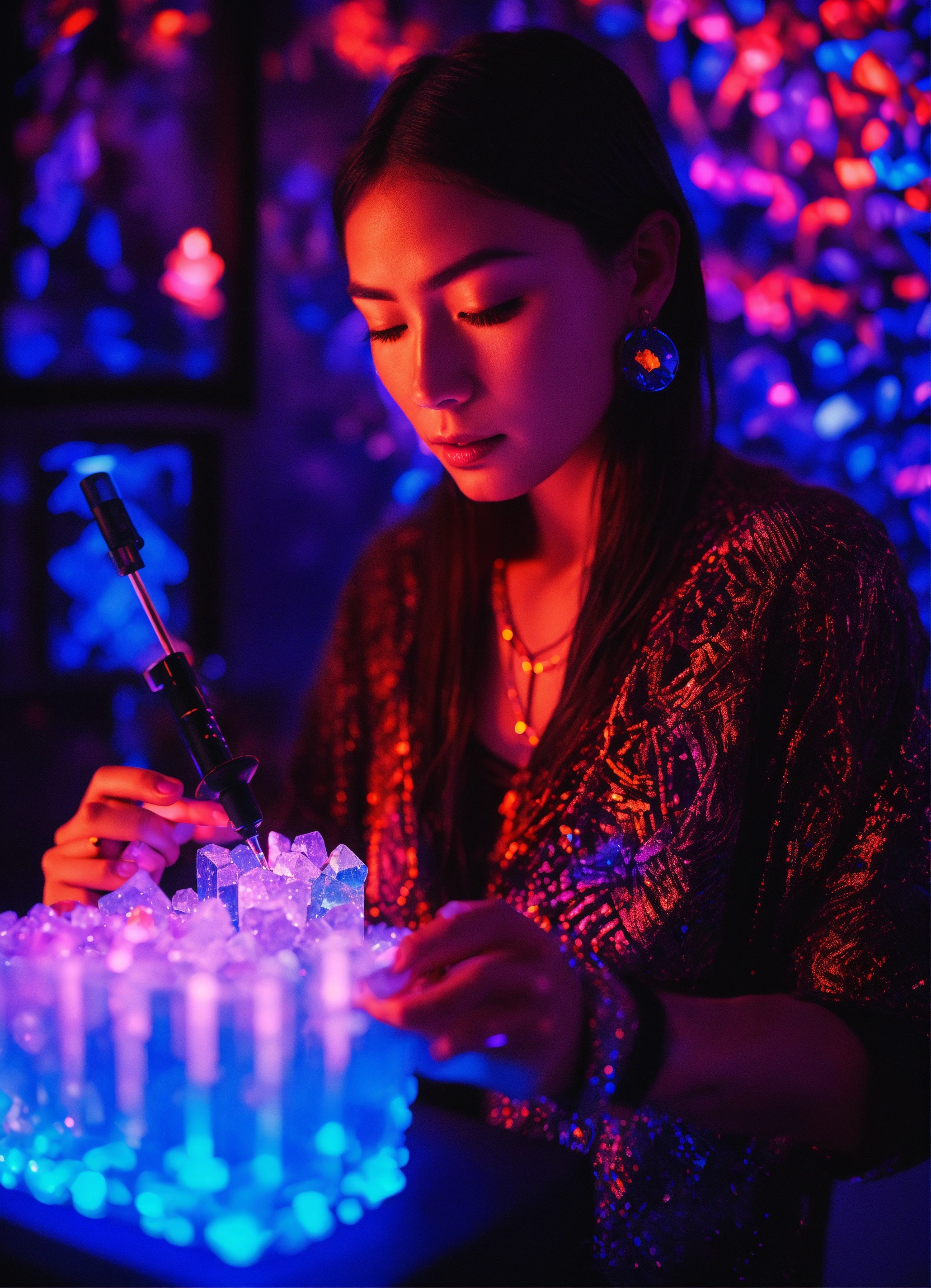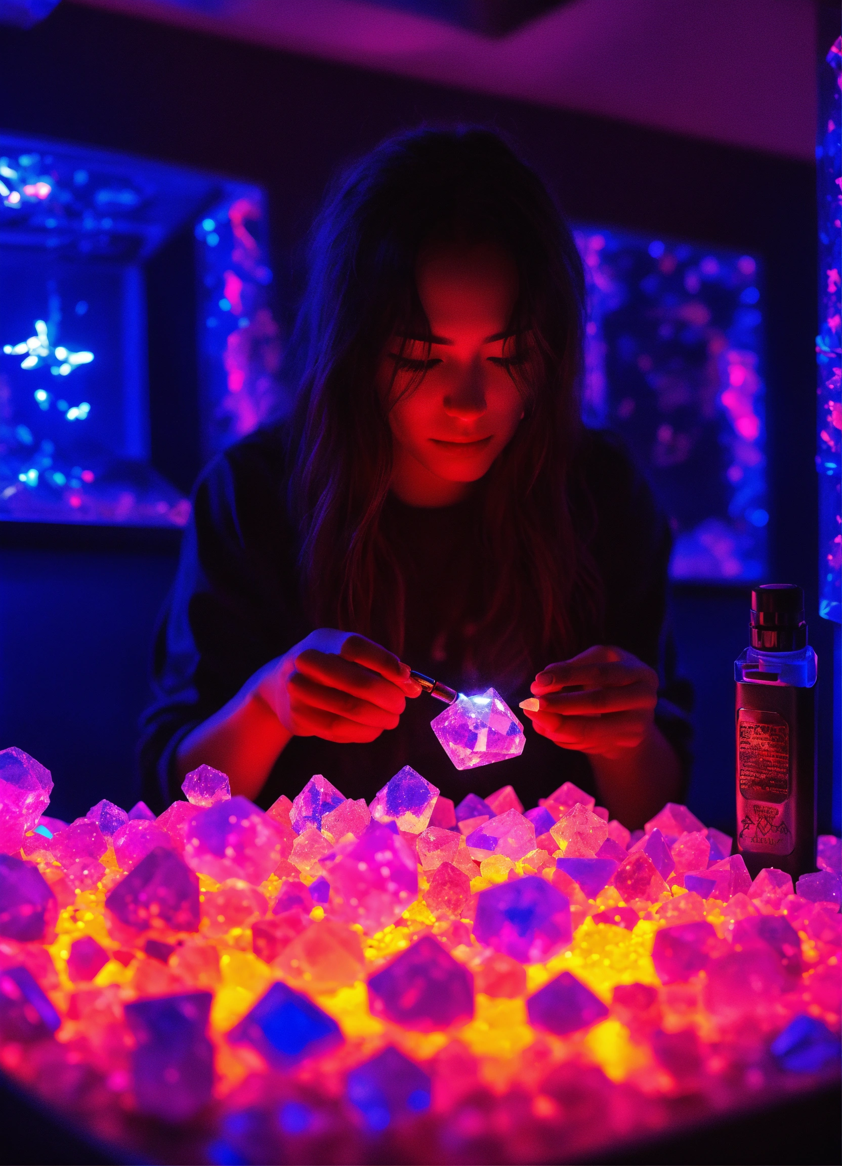 A sapphire individual consuming dmt crystals in a metal vaporizer in a dmt black light neon room experiencing crystal dmt neon ascension