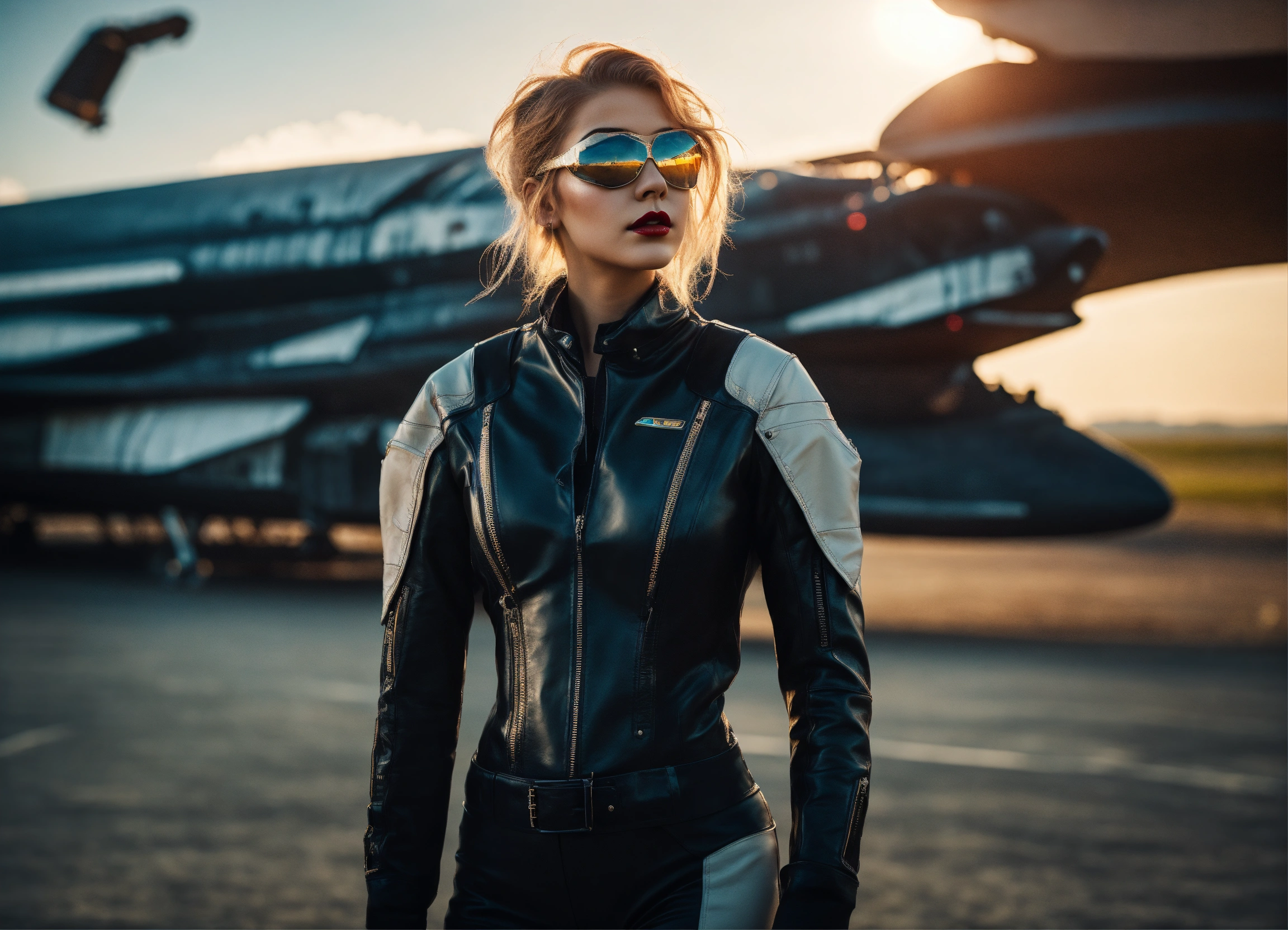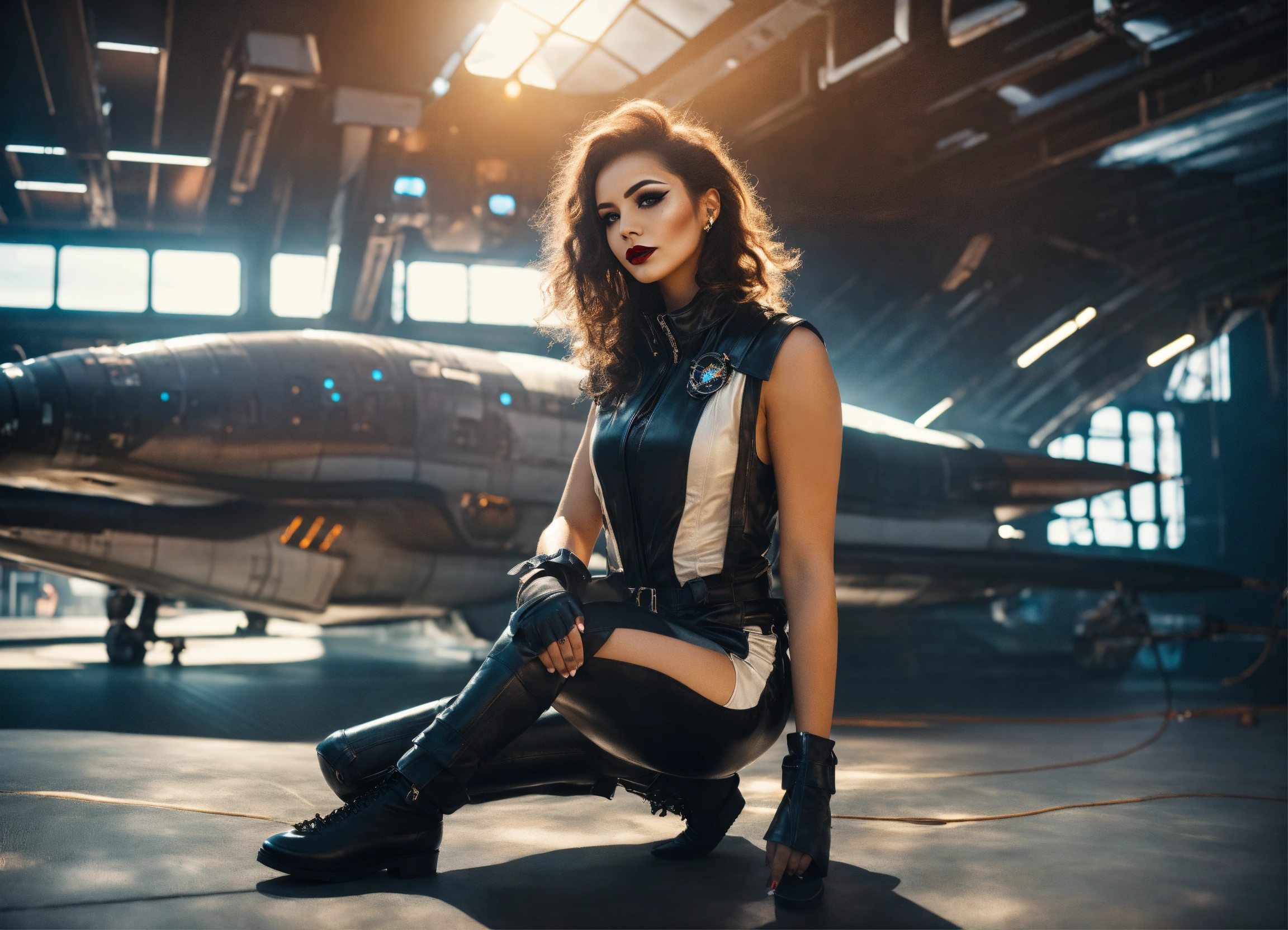 Full body, photo, sci-fi dream girl, futuristic, sunny weather, open shirt, wearing black leather, 8k, extreme make-up, space shuttle