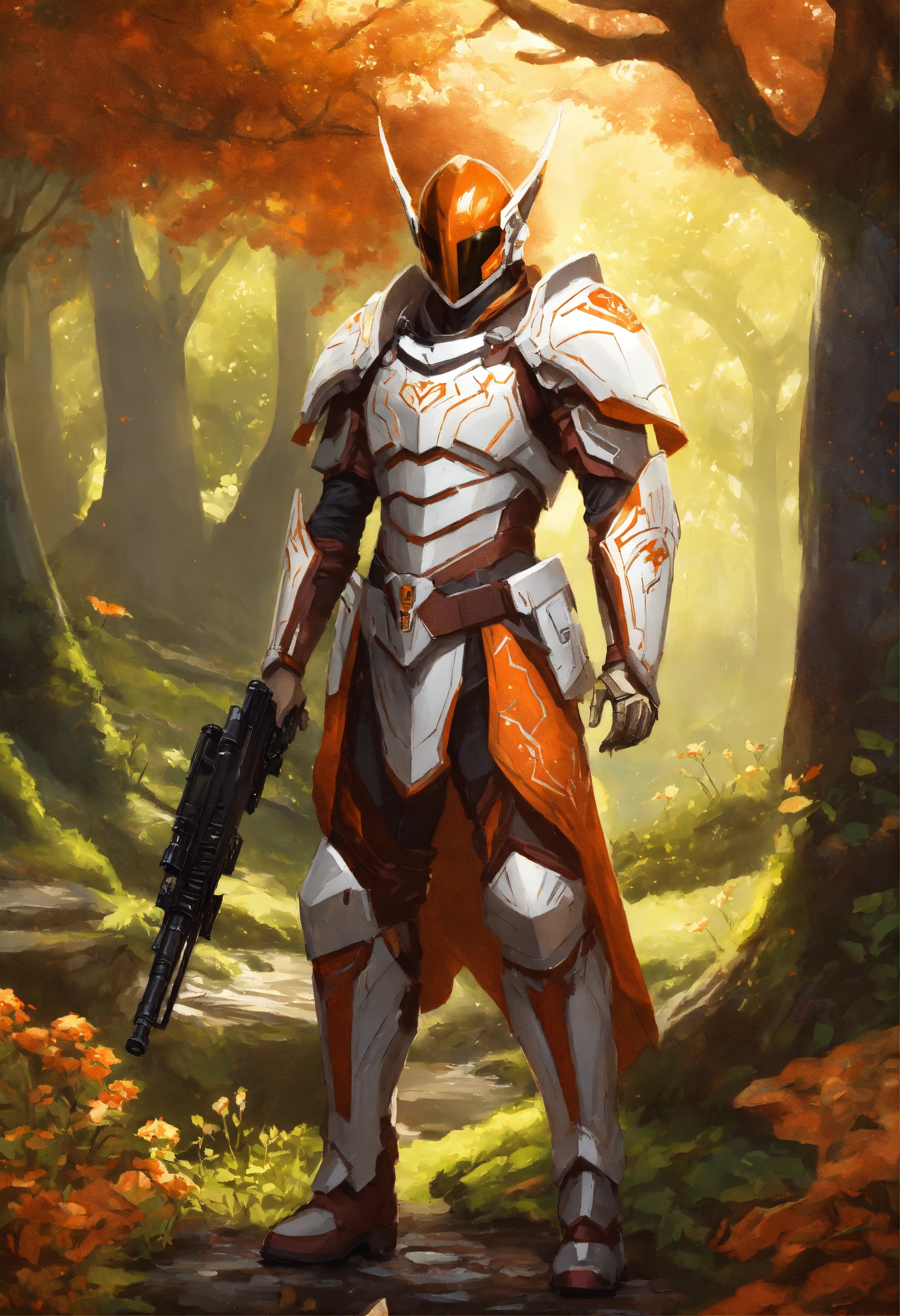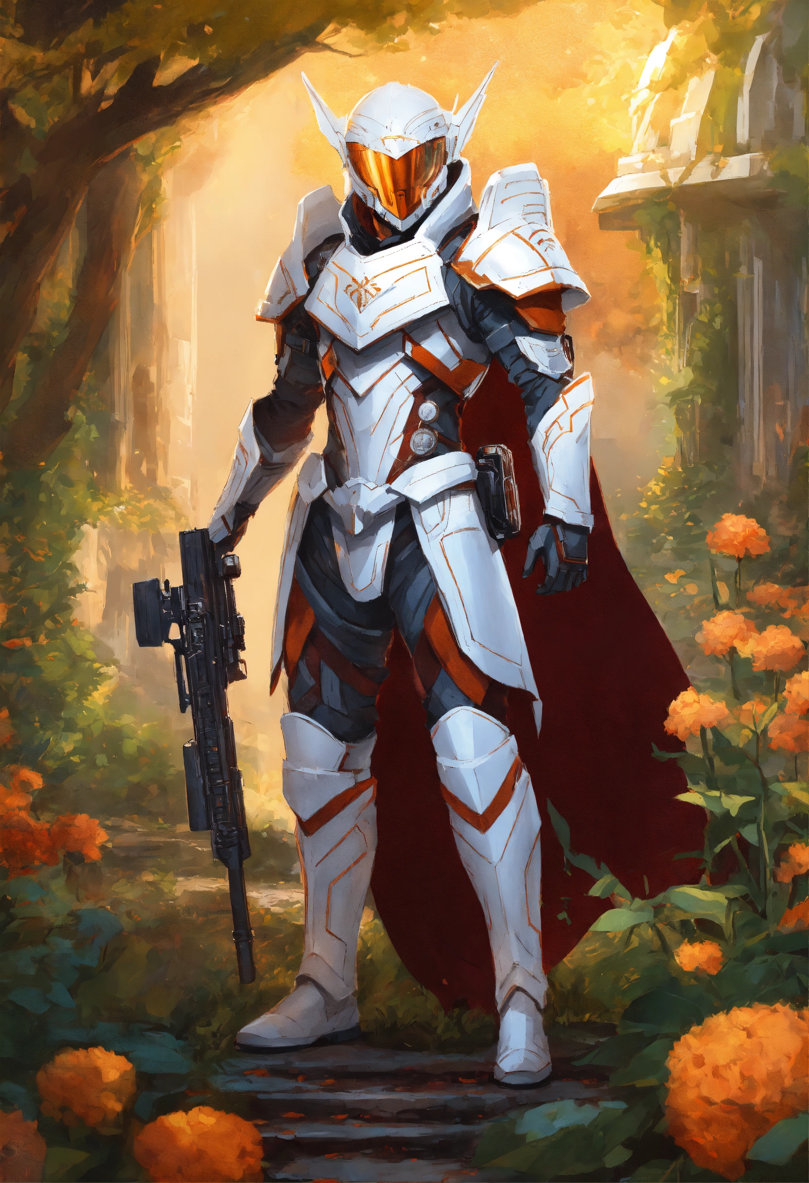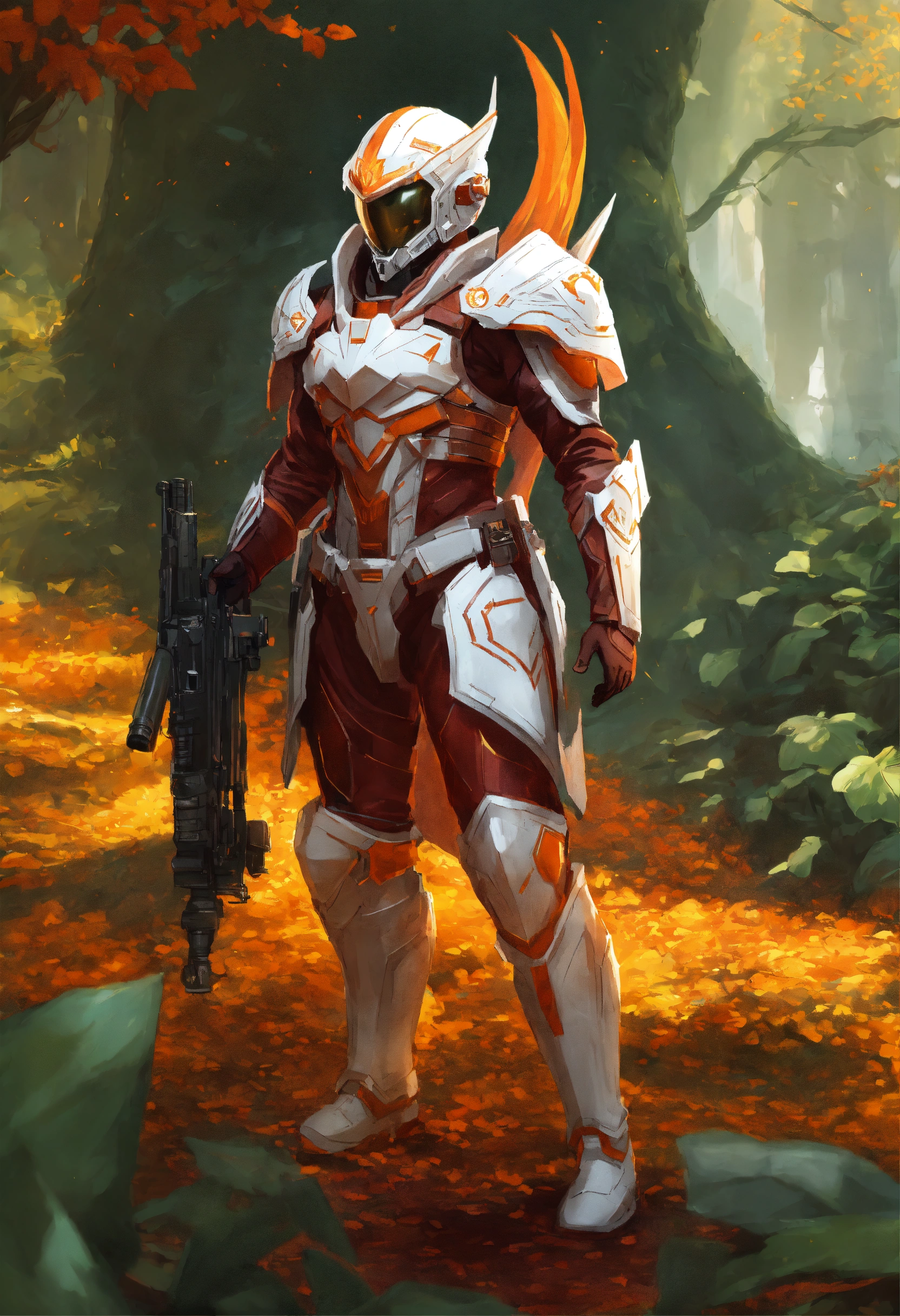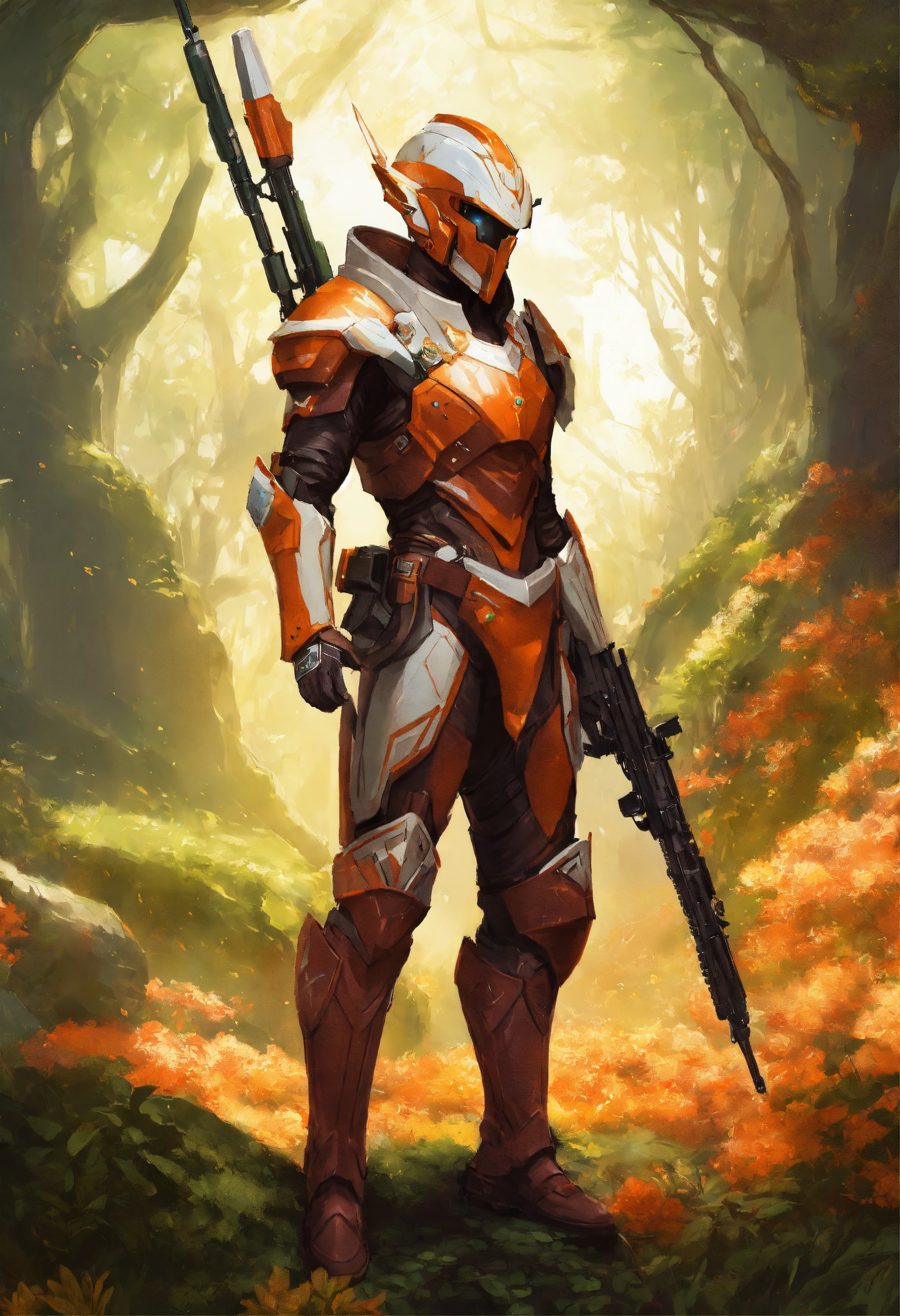 Epic drawing of a full body of a high elf sci fi soldier wearing sci fi armor, white and maroon and orange sci fi armor and helmet, boots, male, holding a machine gun, standing in an elven garden