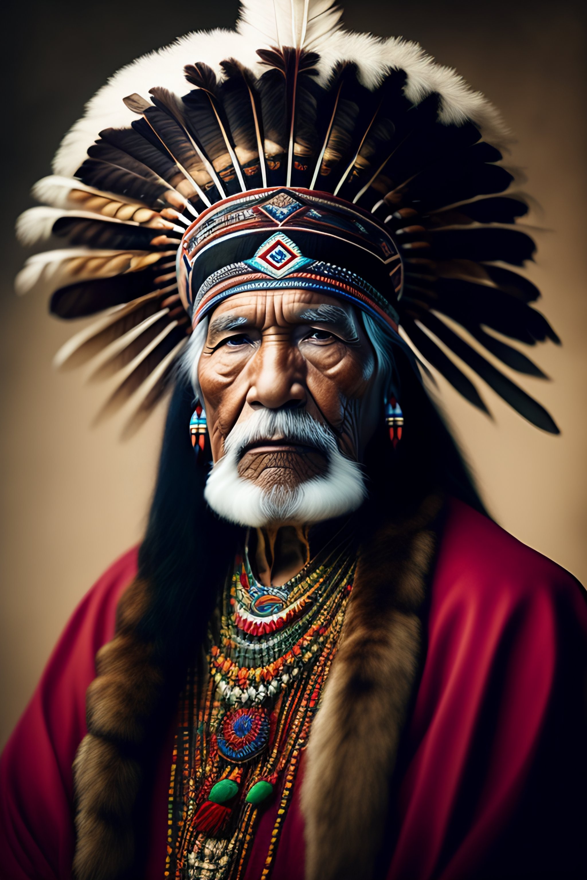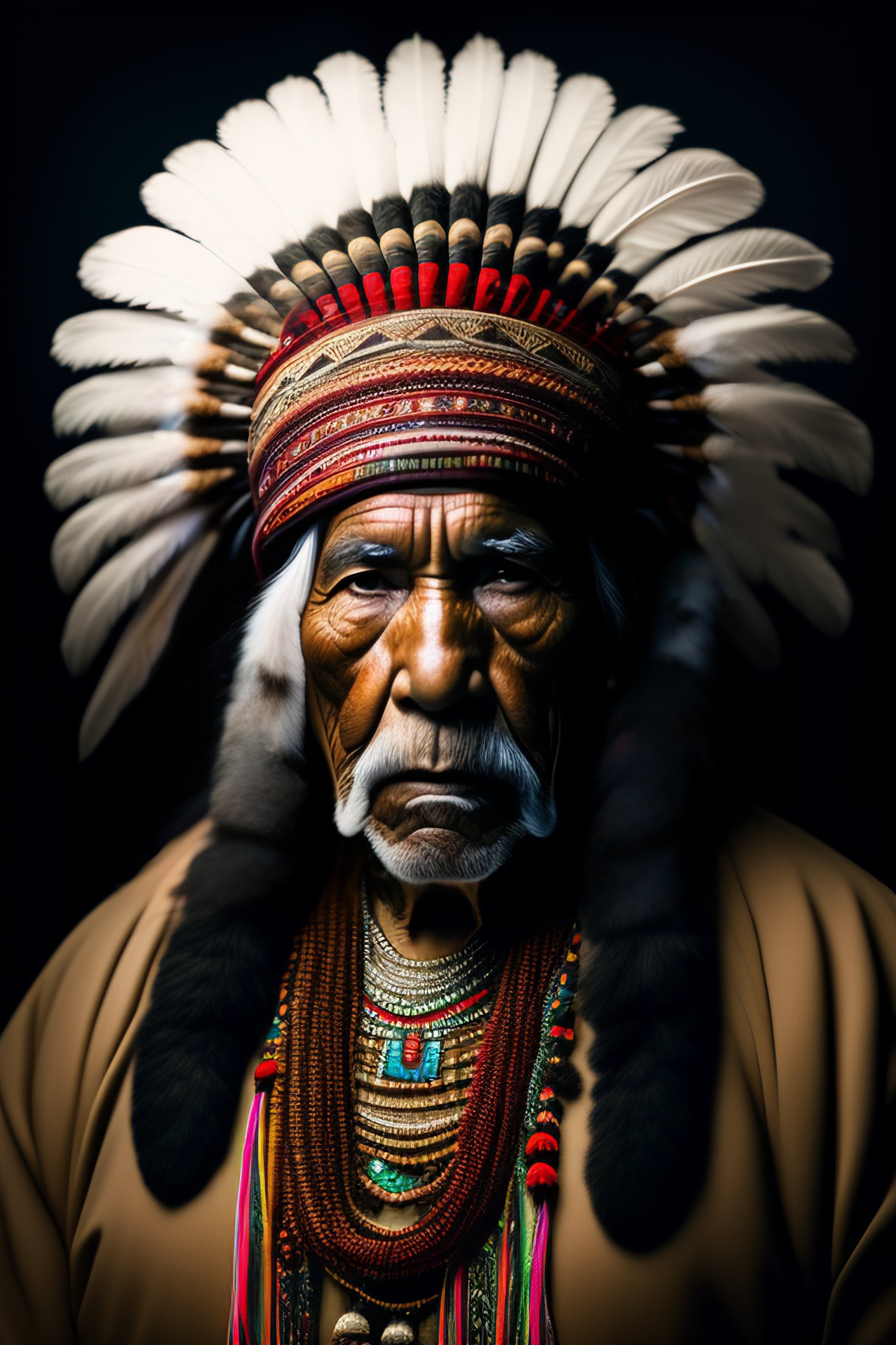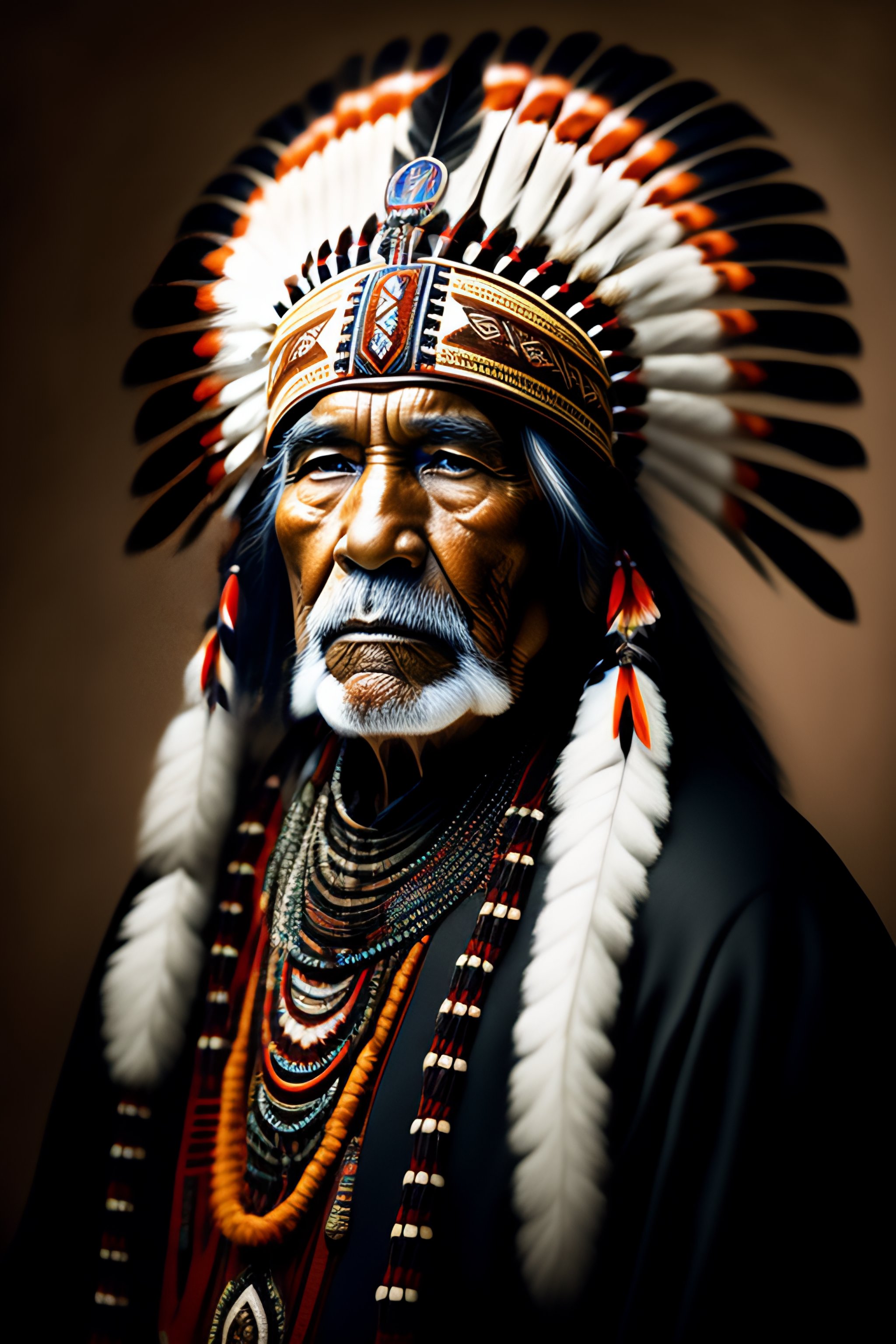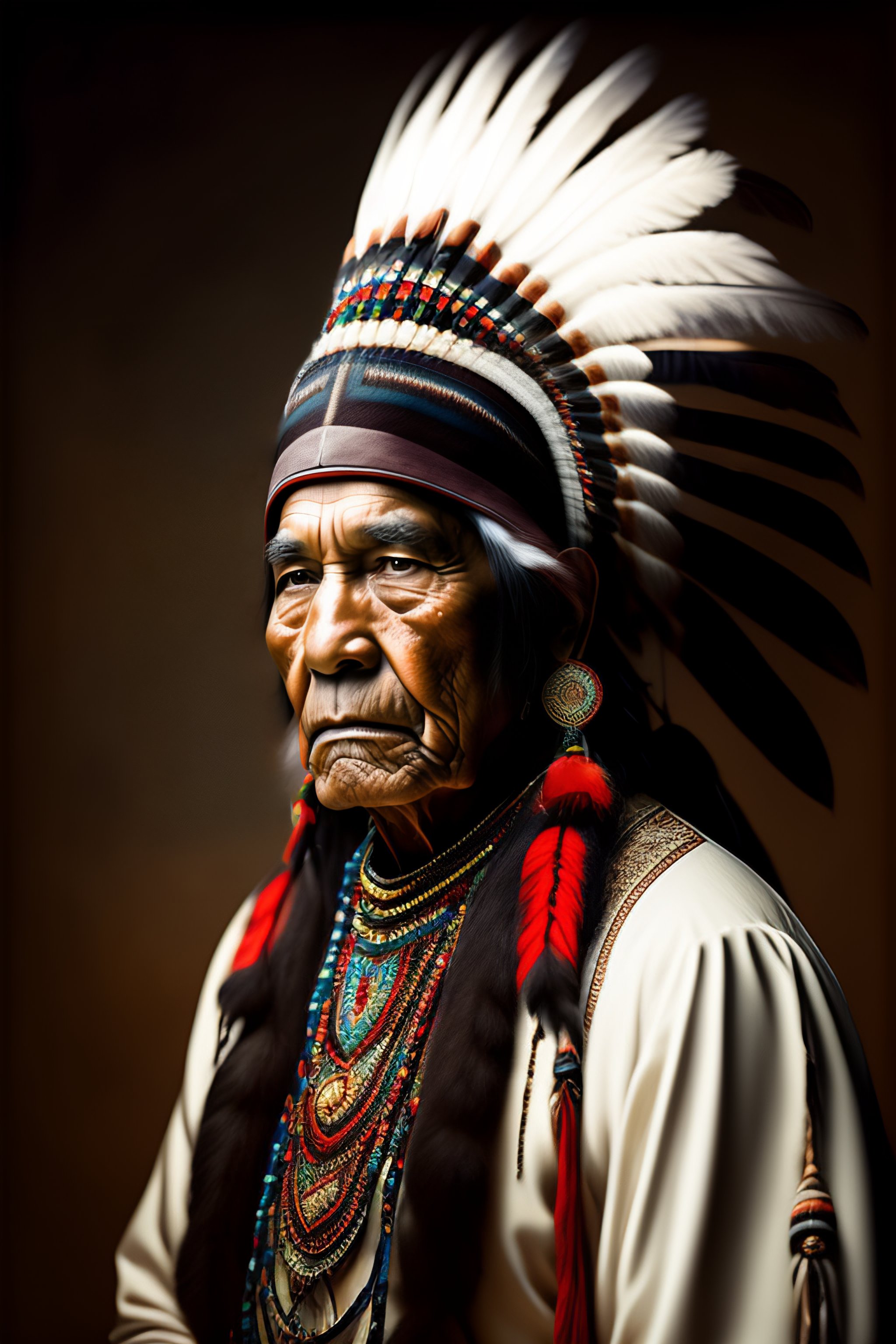 Masculine native american elder in a rembrandt style with traditional native american clothing and big headdress, black and white, key light