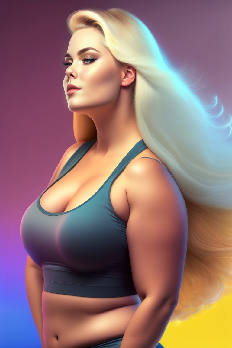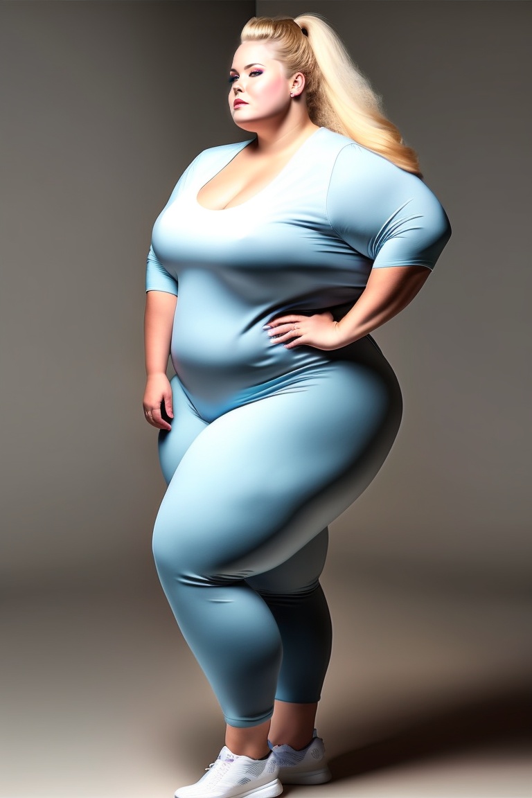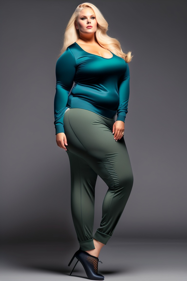 Swedish plus size model with huge hips, blonde hair, big thighs, wearing sweatpants, viewed from the side